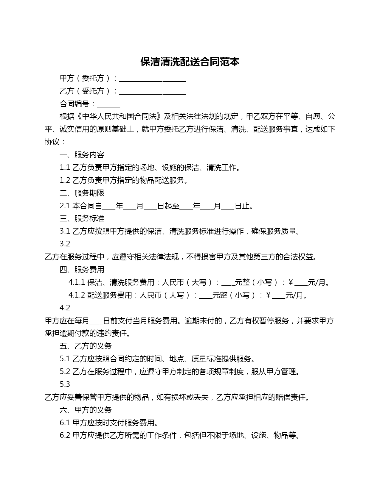保洁清洗配送合同范本甲方(委托方):____________________乙方(受托方):____________________合同编号:_______根据《中华人民共和国合同法》及相关法律法规的规定,甲乙双方在平等、自愿、公平、诚实信用的原则基础上,就甲方委托乙方进行保洁、清洗、配送服务事宜,达成如下协议:一、服务内容1.1乙方负责甲方指定的场地、设施的保洁、清洗工作。1.2乙方负责甲方指定的物品配送服务。二、服务期限2.1本合同自____年____月____日起至____年____月____日止。三、服务标准3.1乙方应按照甲方提供的保洁、清洗服务标准进行操作,确保服务质量。3.2乙方在服务过程中,应遵守相关法律法规,不得损害甲方及其他第三方的合法权益。四、服务费用4.1.1保洁、清洗服务费用:人民币(大写):____元整(小写):¥____元/月。4.1.2配送服务费用:人民币(大写):____元整(小写):¥____元/月。4.2甲方应在每月____日前支付当月服务费用。逾期未付的,乙方有权暂停服务,并要求甲方承担逾期付款的违约责任。五、乙方的义务5.1乙方应按照合同约定的时间、地点、质量标准提供服务。5.2乙方在服务过程中,应遵守甲方制定的各项规章制度,服从甲方管理。5.3乙方应妥善保管甲方提供的物品,如有损坏或丢失,乙方应承担相应的赔偿责任。六、甲方的义务6.1甲方应按时支付服务费用。6.2甲方应提供乙方所需的工作条件,包括但不限于场地、设施、物品等。6.3甲方应协助乙方解决服务过程中遇到的问题,确保服务顺利进行。七、违约责任7.1乙方未能按照约定提供服务的,甲方有权要求乙方支付违约金,违约金为当月服务费用的____%。7.2甲方未能按时支付服务费用的,乙方有权要求甲方支付逾期付款的违约金,违约金为逾期付款金额的____%。八、合同的变更、解除和终止8.1甲乙双方协商一致,可以变更或解除本合同。8.2在合同期限内,如甲方未按约定支付服务费用超过____天,乙方有权解除本合同。8.3合同期满,双方不再续约的,本合同自动终止。九、争议解决9.1本合同在履行过程中,如发生争议,双方应友好协商解决。协商不成的,任何一方均有权向合同签订地人民法院提起诉讼。十、其他约定10.1本合同一式两份,甲乙双方各执一份。10.2本合同自双方签字(或盖章)之日起生效。甲方(盖章):____________________乙方(盖章):____________________签订日期:____年____月____日