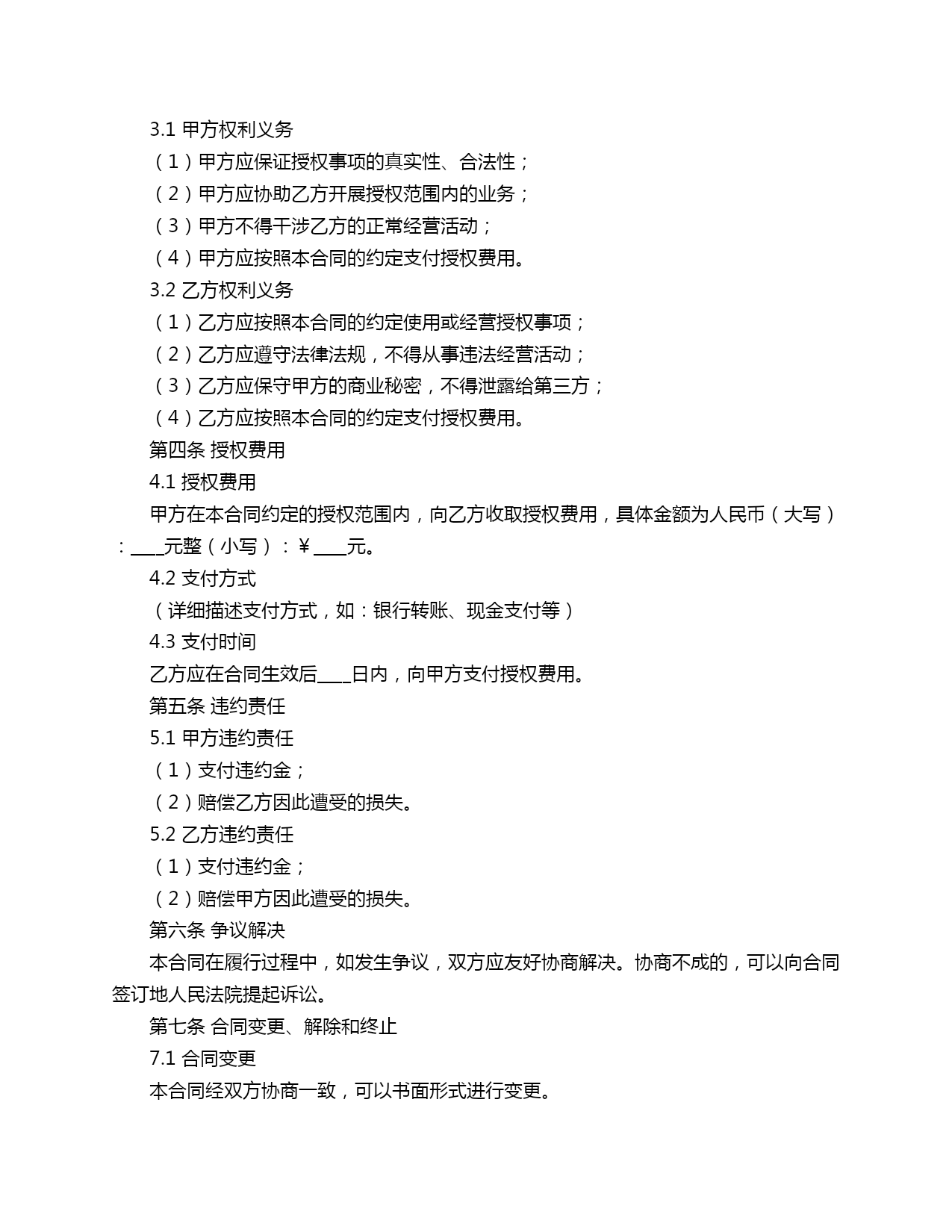 合同范本格式找法网合同范本格式找法网合同编号:_______甲方(授权方):____________________乙方(被授权方):____________________鉴于甲方拥有某项特定的权利、资产或业务,愿意授权乙方在一定的范围内使用或经营,为确保双方的合法权益,经甲乙双方友好协商,特订立本合同,以便共同遵守。第一条合同主体1.1甲方甲方名称:____________________甲方地址:____________________甲方法定代表人:_____________甲方营业执照号:____________1.2乙方乙方名称:____________________乙方地址:____________________乙方法定代表人:_____________乙方营业执照号:____________第二条授权事项2.1授权范围(详细描述授权范围,如:产品销售、技术服务、市场推广等)2.2授权期限本合同自双方签署之日起生效,有效期为____年,自合同生效之日起计算。2.3授权终止(1)乙方未按照本合同的约定履行义务;(2)乙方违反法律法规,受到行政处罚或刑事处罚;(3)乙方破产、被吊销营业执照或丧失经营资格;(4)双方协商一致。第三条权利义务3.1甲方权利义务(1)甲方应保证授权事项的真实性、合法性;(2)甲方应协助乙方开展授权范围内的业务;(3)甲方不得干涉乙方的正常经营活动;(4)甲方应按照本合同的约定支付授权费用。3.2乙方权利义务(1)乙方应按照本合同的约定使用或经营授权事项;(2)乙方应遵守法律法规,不得从事违法经营活动;(3)乙方应保守甲方的商业秘密,不得泄露给第三方;(4)乙方应按照本合同的约定支付授权费用。第四条授权费用4.1授权费用甲方在本合同约定的授权范围内,向乙方收取授权费用,具体金额为人民币(大写):____元整(小写):¥____元。4.2支付方式(详细描述支付方式,如:银行转账、现金支付等)4.3支付时间乙方应在合同生效后____日内,向甲方支付授权费用。第五条违约责任5.1甲方违约责任(1)支付违约金;(2)赔偿乙方因此遭受的损失。5.2乙方违约责任(1)支付违约金;(2)赔偿甲方因此遭受的损失。第六条争议解决本合同在履行过程中,如发生争议,双方应友好协商解决。协商不成的,可以向合同签订地人民法院提起诉讼。第七条合同变更、解除和终止7.1合同变更本合同经双方协商一致,可以书面形式进行变更。7.2合同解除(1)一方未按照本合同的约定履行义务;(2)一方破产、被吊销营业执照或丧失经营资格;(3)法律法规规定的其他解除情形。7.3合同终止(1)授权期限届满;(2)双方协商一致;(3)法律法规规定的其他终止情形。第八条其他约定8.1合同的备案本合同自双方签署之日起生效,甲方应将本合同报有关政府部门备案。8.2合同的副本本合同一式两份,甲乙双方各执一份。甲方(盖章):____________________乙方(盖章):____________________签订日期:____________________