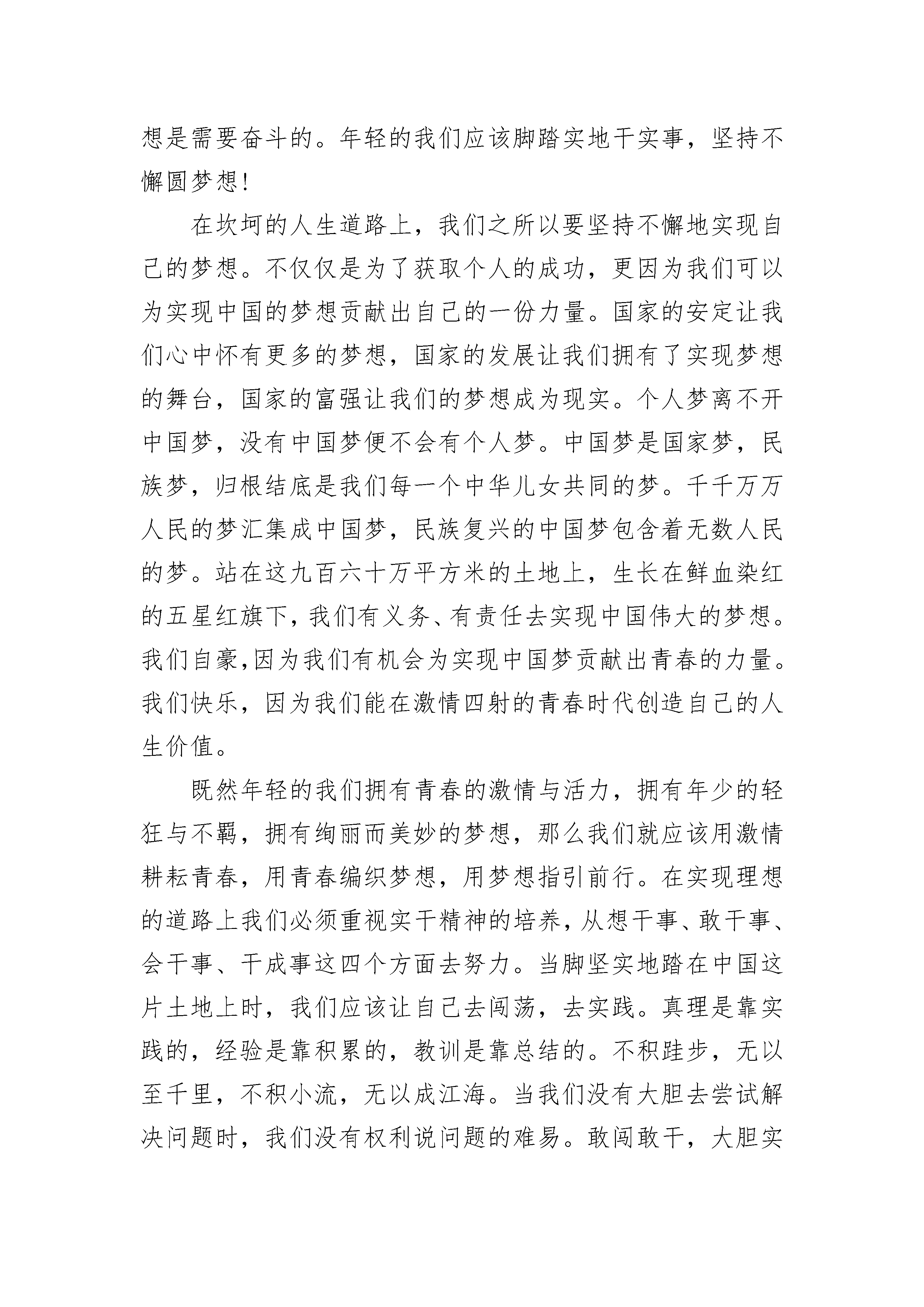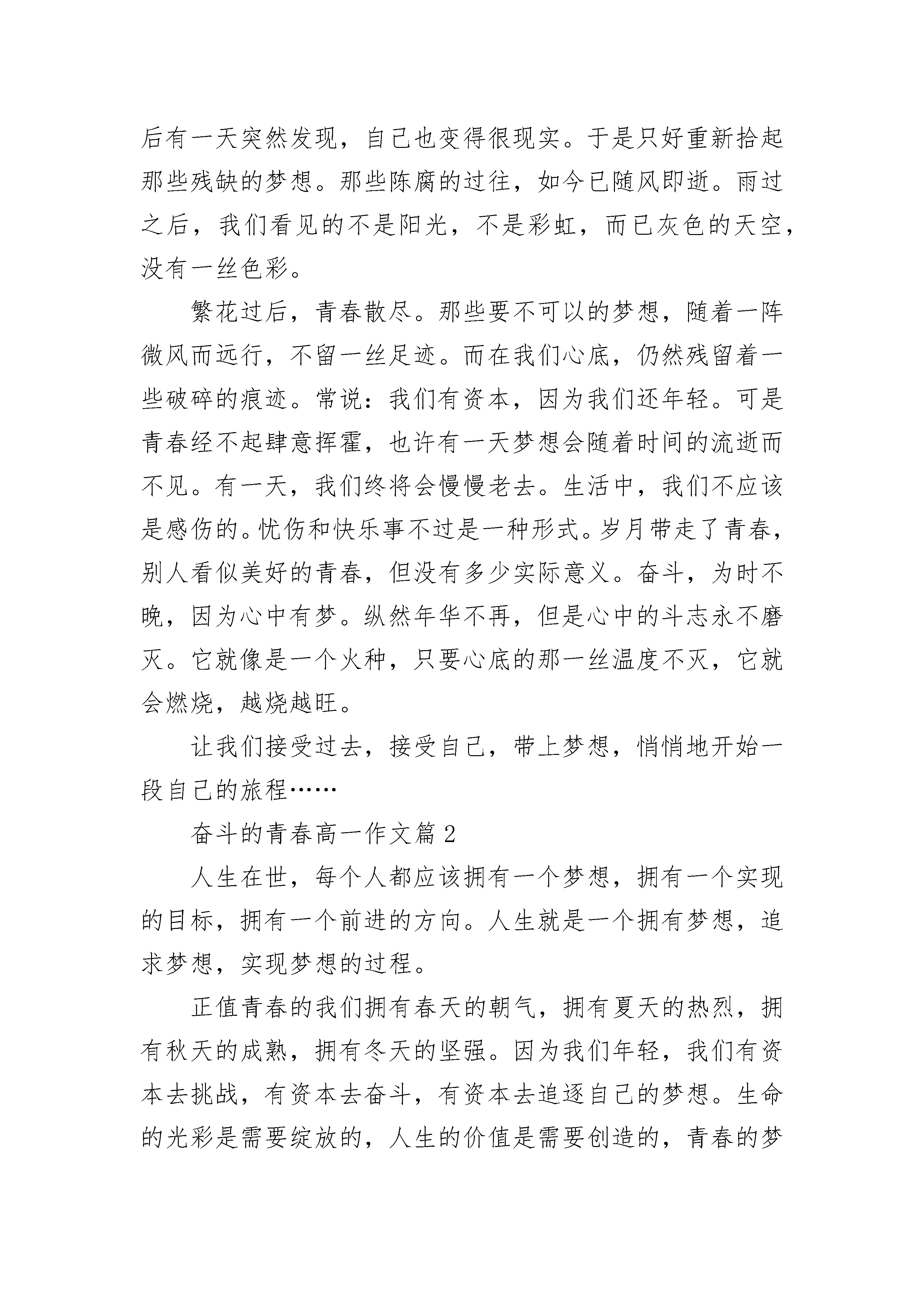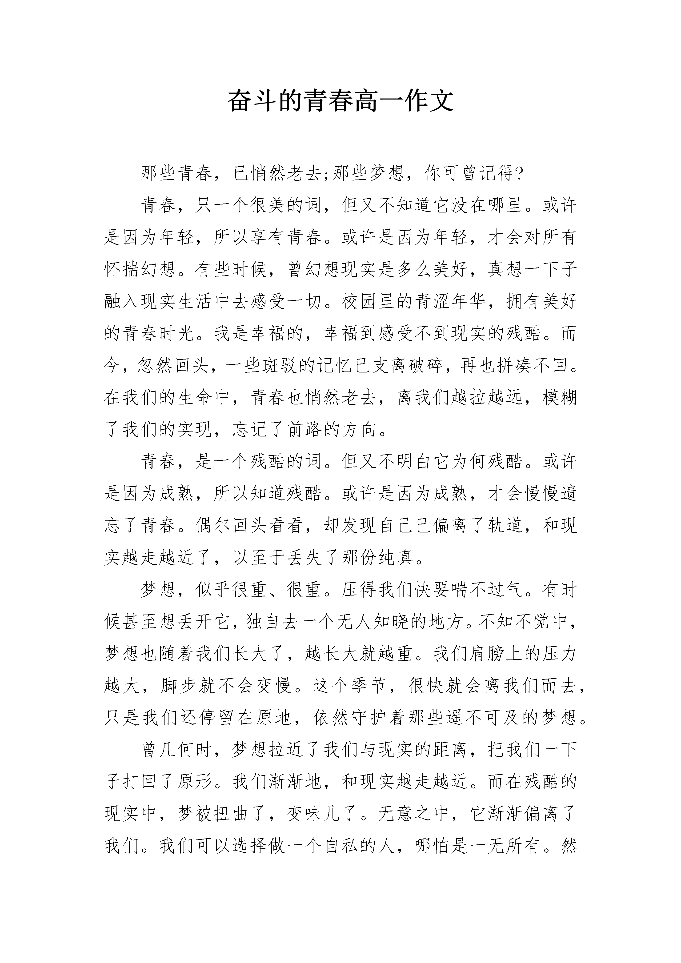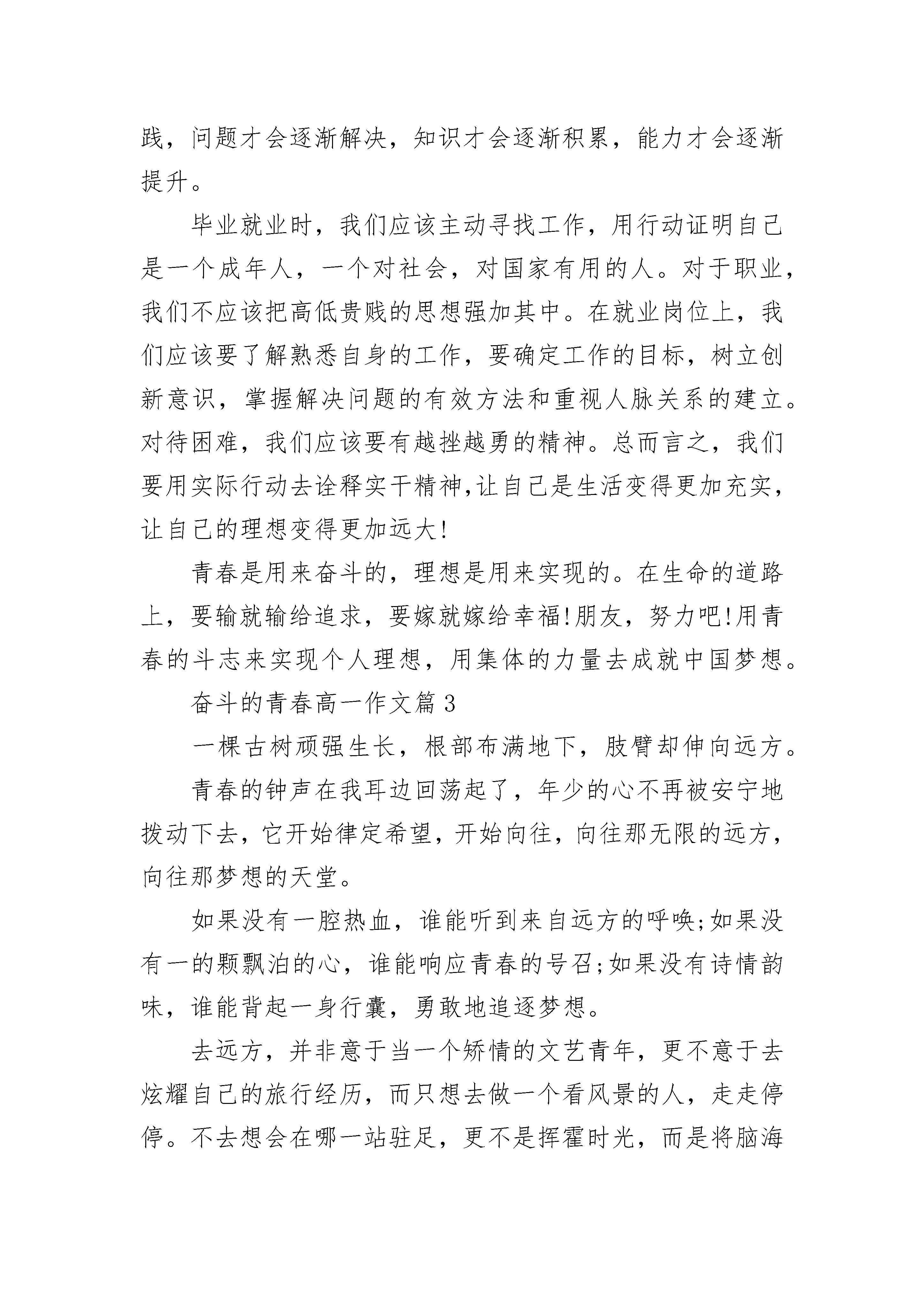 奋斗的青春高一作文那些青春,已悄然老去;那些梦想,你可曾记得?青春,只一个很美的词,但又不知道它没在哪里。或许是因为年轻,所以享有青春。或许是因为年轻,才会对所有怀揣幻想。有些时候,曾幻想现实是多么美好,真想一下子融入现实生活中去感受一切。校园里的青涩年华,拥有美好的青春时光。我是幸福的,幸福到感受不到现实的残酷。而今,忽然回头,一些斑驳的记忆已支离破碎,再也拼凑不回。在我们的生命中,青春也悄然老去,离我们越拉越远,模糊了我们的实现,忘记了前路的方向。青春,是一个残酷的词。但又不明白它为何残酷。或许是因为成熟,所以知道残酷。或许是因为成熟,才会慢慢遗忘了青春。偶尔回头看看,却发现自己已偏离了轨道,和现实越走越近了,以至于丢失了那份纯真。梦想,似乎很重、很重。压得我们快要喘不过气。有时候甚至想丢开它,独自去一个无人知晓的地方。不知不觉中,梦想也随着我们长大了,越长大就越重。我们肩膀上的压力越大,脚步就不会变慢。这个季节,很快就会离我们而去,只是我们还停留在原地,依然守护着那些遥不可及的梦想。曾几何时,梦想拉近了我们与现实的距离,把我们一下子打回了原形。我们渐渐地,和现实越走越近。而在残酷的现实中,梦被扭曲了,变味儿了。无意之中,它渐渐偏离了我们。我们可以选择做一个自私的人,哪怕是一无所有。然后有一天突然发现,自己也变得很现实。于是只好重新拾起那些残缺的梦想。那些陈腐的过往,如今已随风即逝。雨过之后,我们看见的不是阳光,不是彩虹,而已灰色的天空,没有一丝色彩。繁花过后,青春散尽。那些要不可以的梦想,随着一阵微风而远行,不留一丝足迹。而在我们心底,仍然残留着一些破碎的痕迹。常说:我们有资本,因为我们还年轻。可是青春经不起肆意挥霍,也许有一天梦想会随着时间的流逝而不见。有一天,我们终将会慢慢老去。生活中,我们不应该是感伤的。忧伤和快乐事不过是一种形式。岁月带走了青春,别人看似美好的青春,但没有多少实际意义。奋斗,为时不晚,因为心中有梦。纵然年华不再,但是心中的斗志永不磨灭。它就像是一个火种,只要心底的那一丝温度不灭,它就会燃烧,越烧越旺。让我们接受过去,接受自己,带上梦想,悄悄地开始一段自己的旅程……奋斗的青春高一作文篇2人生在世,每个人都应该拥有一个梦想,拥有一个实现的目标,拥有一个前进的方向。人生就是一个拥有梦想,追求梦想,实现梦想的过程。正值青春的我们拥有春天的朝气,拥有夏天的热烈,拥有秋天的成熟,拥有冬天的坚强。因为我们年轻,我们有资本去挑战,有资本去奋斗,有资本去追逐自己的梦想。生命的光彩是需要绽放的,人生的价值是需要创造的,青春的梦想是需要奋斗的。年轻的我们应该脚踏实地干实事,坚持不懈圆梦想!在坎坷的人生道路上,我们之所以要坚持不懈地实现自己的梦想。不仅仅是为了获取个人的成功,更因为我们可以为实现中国的梦想贡献出自己的一份力量。国家的安定让我们心中怀有更多的梦想,国家的发展让我们拥有了实现梦想的舞台,国家的富强让我们的梦想成为现实。个人梦离不开中国梦,没有中国梦便不会有个人梦。中国梦是国家梦,民族梦,归根结底是我们每一个中华儿女共同的梦。千千万万人民的梦汇集成中国梦,民族复兴的中国梦包含着无数人民的梦。站在这九百六十万平方米的土地上,生长在鲜血染红的五星红旗下,我们有义务、有责任去实现中国伟大的梦想。我们自豪,因为我们有机会为实现中国梦贡献出青春的力量。我们快乐,因为我们能在激情四射的青春时代创造自己的人生价值。既然年轻的我们拥有青春的激情与活力,拥有年少的轻狂与不羁,拥有绚丽而美妙的梦想,那么我们就应该用激情耕耘青春,用青春编织梦想,用梦想指引前行。在实现理想的道路上我们必须重视实干精神的培养,从想干事、敢干事、会干事、干成事这四个方面去努力。当脚坚实地踏在中国这片土地上时,我们应该让自己去闯荡,去实践。真理是靠实践的,经验是靠积累的,教训是靠总结的。不积跬步,无以至千里,不积小流,无以成江海。当我们没有大胆去尝试解决问题时,我们没有权利说问题的难易。敢闯敢干,大胆实践,问题才会逐渐解决,知识才会逐渐积累,能力才会逐渐提升。毕业就业时,我们应该主动寻找工作,用行动证明自己是一个成年人,一个对社会,对国家有用的人。对于职业,我们不应该把高低贵贱的思想强加其中。在就业岗位上,我们应该要了解熟悉自身的工作,要确定工作的目标,树立创新意识,掌握解决问题的有效方法和重视人脉关系的建立。对待困难,我们应该要有越挫越勇的精神。总而言之,我们要用实际行动去诠释实干精神,让自己是生活变得更加充实,让自己的理想变得更加远大!青春是用来奋斗的,理想是用来实现的。在生命的道路上,要输就输给追求,要嫁就嫁给幸福!朋友,努力吧!用青春的斗志来实现个人理想,用集体的力量去成就中国梦想。奋斗的青春高一作文篇3一棵古树顽强生长,根部布满地下,肢臂却伸