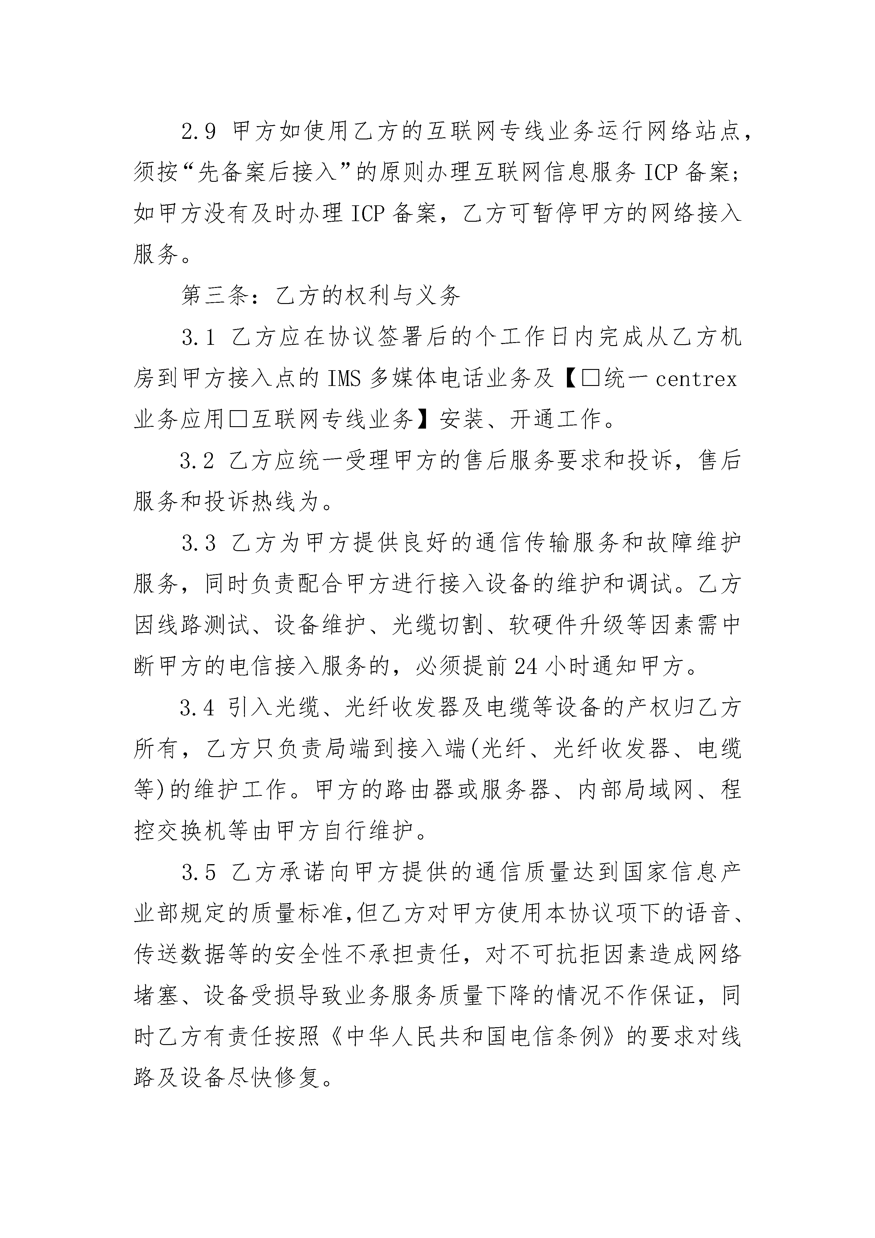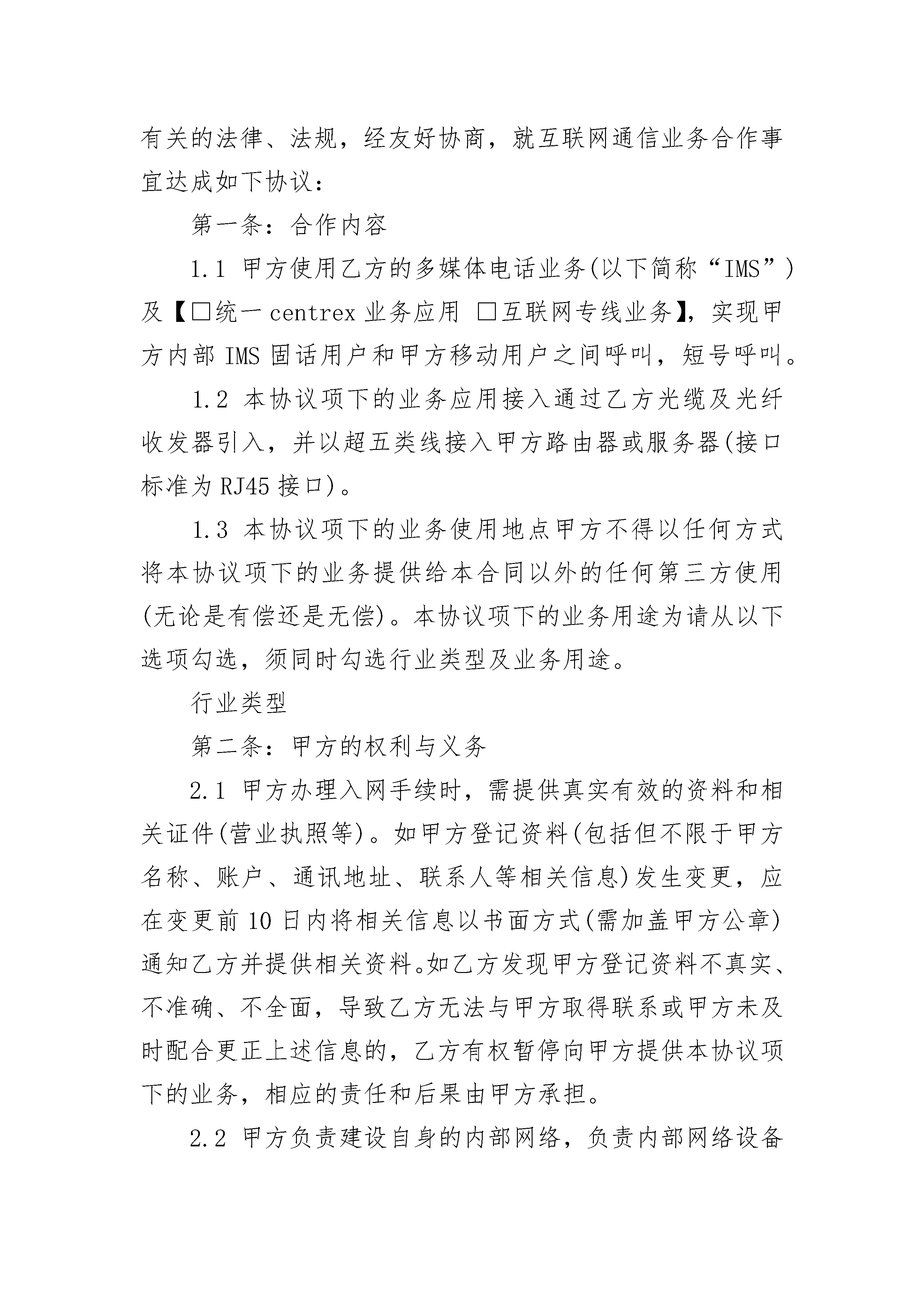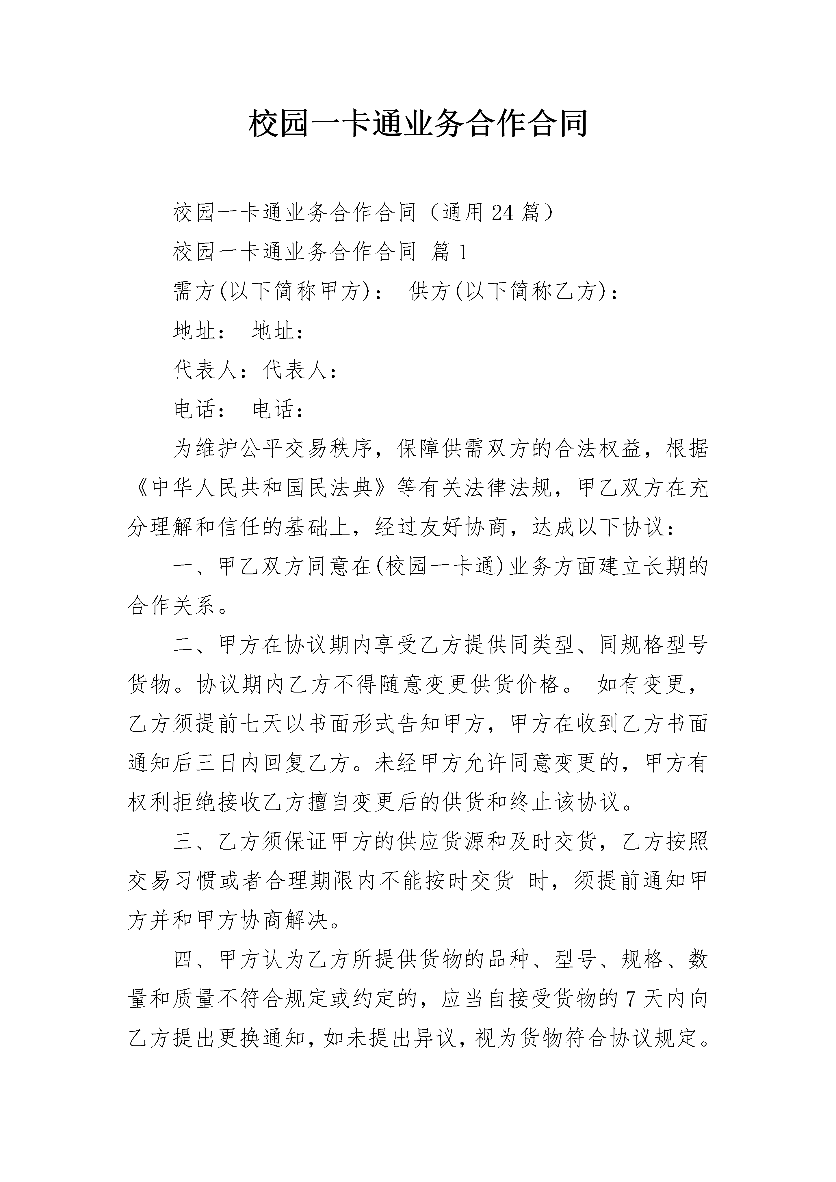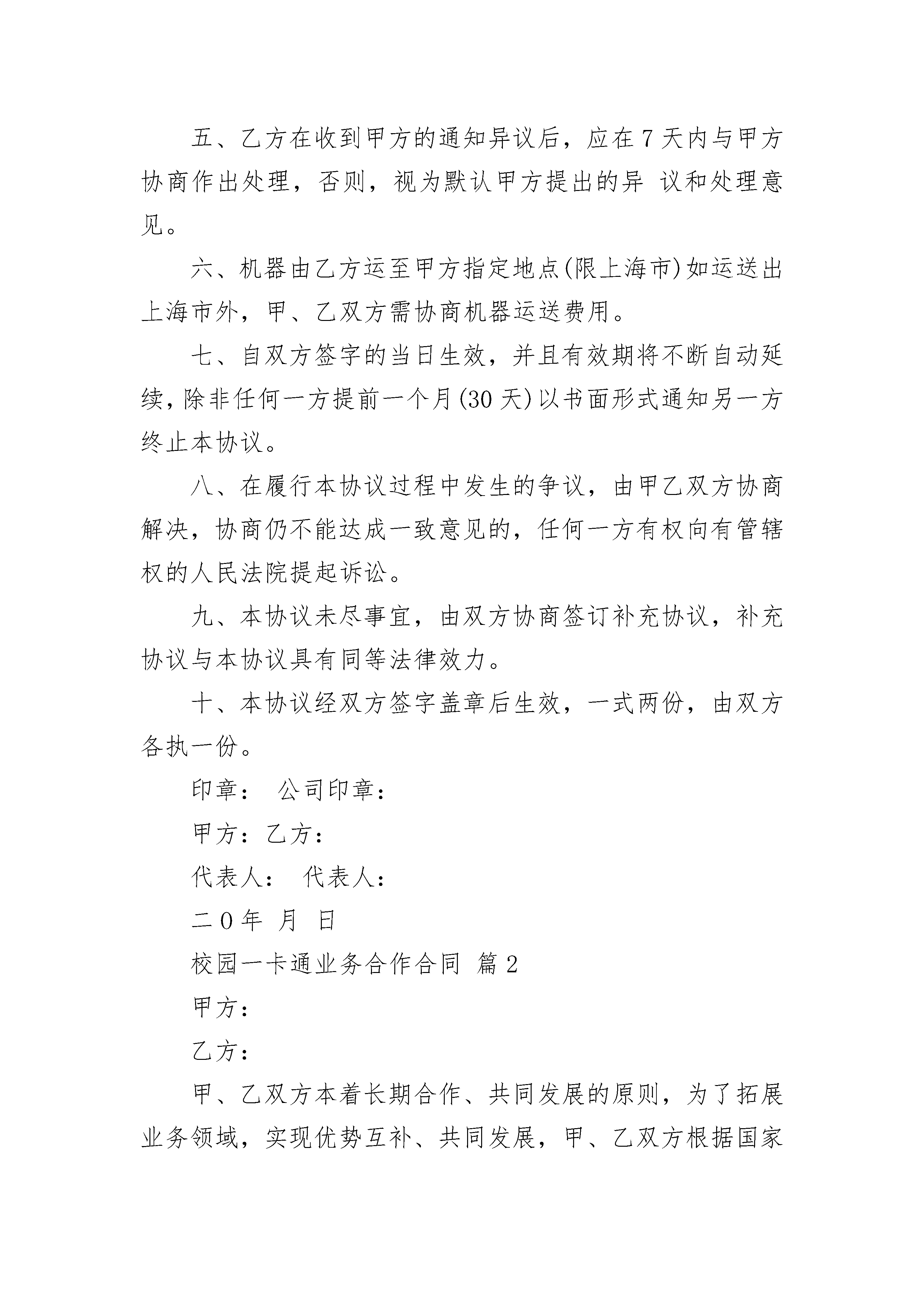 校园一卡通业务合作合同校园一卡通业务合作合同(通用24篇)校园一卡通业务合作合同篇1需方(以下简称甲方):供方(以下简称乙方):地址:地址:代表人:代表人:电话:电话:为维护公平交易秩序,保障供需双方的合法权益,根据《中华人民共和国民法典》等有关法律法规,甲乙双方在充分理解和信任的基础上,经过友好协商,达成以下协议:一、甲乙双方同意在(校园一卡通)业务方面建立长期的合作关系。二、甲方在协议期内享受乙方提供同类型、同规格型号货物。协议期内乙方不得随意变更供货价格。如有变更,乙方须提前七天以书面形式告知甲方,甲方在收到乙方书面通知后三日内回复乙方。未经甲方允许同意变更的,甲方有权利拒绝接收乙方擅自变更后的供货和终止该协议。三、乙方须保证甲方的供应货源和及时交货,乙方按照交易习惯或者合理期限内不能按时交货时,须提前通知甲方并和甲方协商解决。四、甲方认为乙方所提供货物的品种、型号、规格、数量和质量不符合规定或约定的,应当自接受货物的7天内向乙方提出更换通知,如未提出异议,视为货物符合协议规定。五、乙方在收到甲方的通知异议后,应在7天内与甲方协商作出处理,否则,视为默认甲方提出的异议和处理意见。六、机器由乙方运至甲方指定地点(限上海市)如运送出上海市外,甲、乙双方需协商机器运送费用。七、自双方签字的当日生效,并且有效期将不断自动延续,除非任何一方提前一个月(30天)以书面形式通知另一方终止本协议。八、在履行本协议过程中发生的争议,由甲乙双方协商解决,协商仍不能达成一致意见的,任何一方有权向有管辖权的人民法院提起诉讼。九、本协议未尽事宜,由双方协商签订补充协议,补充协议与本协议具有同等法律效力。十、本协议经双方签字盖章后生效,一式两份,由双方各执一份。印章:公司印章:甲方:乙方:代表人:代表人:二O年月日校园一卡通业务合作合同篇2甲方:乙方:甲、乙双方本着长期合作、共同发展的原则,为了拓展业务领域,实现优势互补、共同发展,甲、乙双方根据国家有关的法律、法规,经友好协商,就互联网通信业务合作事宜达成如下协议:第一条:合作内容1.1甲方使用乙方的多媒体电话业务(以下简称“IMS”)及【□统一centrex业务应用□互联网专线业务】,实现甲方内部IMS固话用户和甲方移动用户之间呼叫,短号呼叫。1.2本协议项下的业务应用接入通过乙方光缆及光纤收发器引入,并以超五类线接入甲方路由器或服务器(接口标准为RJ45接口)。1.3本协议项下的业务使用地点甲方不得以任何方式将本协议项下的业务提供给本合同以外的任何第三方使用(无论是有偿还是无偿)。本协议项下的业务用途为请从以下选项勾选,须同时勾选行业类型及业务用途。行业类型第二条:甲方的权利与义务2.1甲方办理入网手续时,需提供真实有效的资料和相关证件(营业执照等)。如甲方登记资料(包括但不限于甲方名称、账户、通讯地址、联系人等相关信息)发生变更,应在变更前10日内将相关信息以书面方式(需加盖甲方公章)通知乙方并提供相关资料。如乙方发现甲方登记资料不真实、不准确、不全面,导致乙方无法与甲方取得联系或甲方未及时配合更正上述信息的,乙方有权暂停向甲方提供本协议项下的业务,相应的责任和后果由甲方承担。2.2甲方负责建设自身的内部网络,负责内部网络设备至甲方本端宽带上网网关设备及线路的维护,甲方内部的安全保证工作由甲方负责。同时保证不损害乙方的系统安全、正常运行。2.3甲方以附件加盖公章形式向乙方提供IMS固定电话号码和甲方职工使用的广西移动本地手机号码,乙方以此组建立甲方统一centrex。所提供加入统一centrex的手机用户号码时须经用户本人同意,如需增减统一centrex网内成员,需联系人签字确认并书面通知乙方。否则引起的甲方成员与乙方的纠纷,由甲方负责协调解决。2.4甲方应按照乙方的相关规定按时向乙方交纳各项电信服务费用。在乙方所提供的服务没有质量问题的前提下,甲方应保证在网一年以上,否则应向乙方补交工料费差额。2.5甲方负责提供公司内用户分布情况等资料,并对乙方在本次合同项目中的接入施工和进入甲方机房给予协调配合,允许乙方免费使用甲方的楼道资源、传输管道、设备用电以及放置接入设备的空间。随着甲方公司业务的不断发展,当带宽需求加大时,优先采用乙方的宽带接入,并且依据实际需要,提供机房和相应的协助;2.7若甲方或其成员搬迁至乙方暂时无法提供服务的地区。乙方有权立即停止向甲方提供本协议规定的部分或全部服务。2.8如甲方使用后认为现有的电信服务不能满足其需求,可以书面的形式向乙方申请调整电信接入服务的项目和功能,所涉及到的使用费按乙方的相关资费标准调整。2.9甲方如使用乙方的互联网专线业务运行网络站点,须按“先备案后接入”的原则办理互联网信息服务ICP备案;如甲方没有及时办理ICP备案,乙方可暂停甲方的网络接