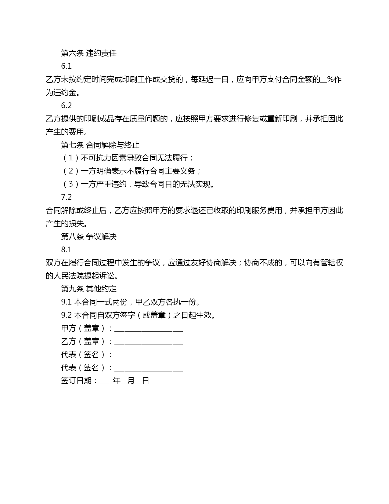 印刷中标后合同范本甲方(招标方):____________________乙方(中标方):____________________合同编号:_________ContractNo.合同签订日期:____年__月__日第一条合同标的1.1甲方委托乙方印刷的物品为:____________________(具体名称、数量、规格等详见附件一)。1.2乙方根据甲方提供的文件和要求完成印刷工作,保证印刷质量符合行业标准。第二条合同金额2.1乙方承担的印刷服务费用为人民币(大写):____元整(小写):¥____元。2.2乙方应在合同签订后__个工作日内向甲方提供正式发票。第三条交货时间及地点3.1乙方应按照甲方的要求,在____年__月__日前完成印刷工作,并按照甲方指定的地点交付印刷成品。3.2交货地点:____________________。第四条质量标准4.1乙方应保证印刷质量符合甲方的要求和行业标准,如出现质量问题,乙方应在__个工作日内免费进行修复或重新印刷。4.2甲方对印刷成品的质量有异议时,应在收货后__个工作日内提出,并提供书面材料。乙方应在收到甲方异议后__个工作日内进行核实,并根据核实结果承担相应责任。第五条保密条款5.1乙方应对在合同履行过程中获得的甲方商业秘密和机密信息予以保密,未经甲方同意不得向第三方披露。5.2保密期限自合同签订之日起至合同终止或履行完毕之日止。第六条违约责任6.1乙方未按约定时间完成印刷工作或交货的,每延迟一日,应向甲方支付合同金额的__%作为违约金。6.2乙方提供的印刷成品存在质量问题的,应按照甲方要求进行修复或重新印刷,并承担因此产生的费用。第七条合同解除与终止(1)不可抗力因素导致合同无法履行;(2)一方明确表示不履行合同主要义务;(3)一方严重违约,导致合同目的无法实现。7.2合同解除或终止后,乙方应按照甲方的要求退还已收取的印刷服务费用,并承担甲方因此产生的损失。第八条争议解决8.1双方在履行合同过程中发生的争议,应通过友好协商解决;协商不成的,可以向有管辖权的人民法院提起诉讼。第九条其他约定9.1本合同一式两份,甲乙双方各执一份。9.2本合同自双方签字(或盖章)之日起生效。甲方(盖章):____________________乙方(盖章):____________________代表(签名):____________________代表(签名):____________________签订日期:____年__月__日