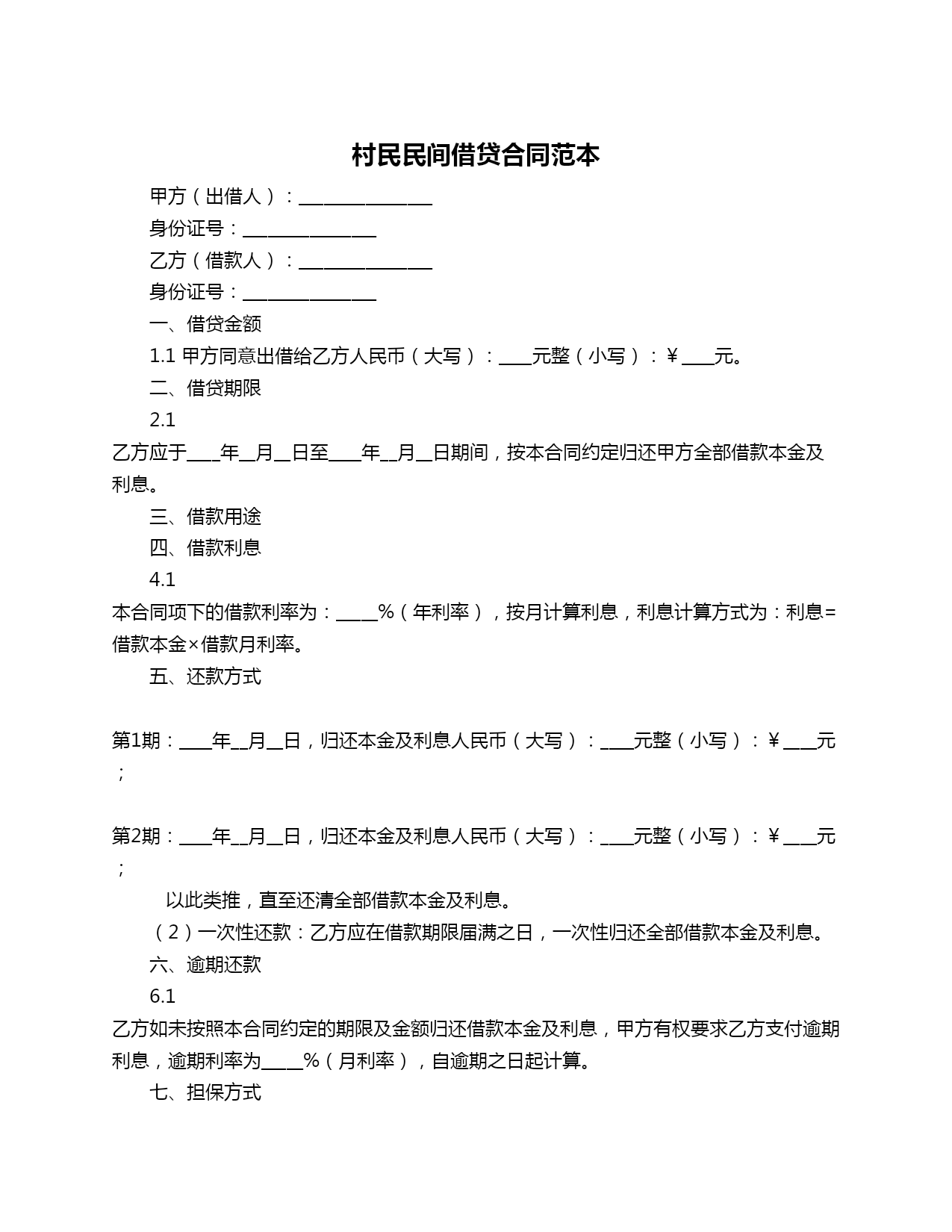 村民民间借贷合同范本甲方(出借人):________________身份证号:________________乙方(借款人):________________身份证号:________________一、借贷金额1.1甲方同意出借给乙方人民币(大写):____元整(小写):¥____元。二、借贷期限2.1乙方应于____年__月__日至____年__月__日期间,按本合同约定归还甲方全部借款本金及利息。三、借款用途四、借款利息4.1本合同项下的借款利率为:_____%(年利率),按月计算利息,利息计算方式为:利息=借款本金×借款月利率。五、还款方式第1期:____年__月__日,归还本金及利息人民币(大写):____元整(小写):¥____元;第2期:____年__月__日,归还本金及利息人民币(大写):____元整(小写):¥____元;以此类推,直至还清全部借款本金及利息。(2)一次性还款:乙方应在借款期限届满之日,一次性归还全部借款本金及利息。六、逾期还款6.1乙方如未按照本合同约定的期限及金额归还借款本金及利息,甲方有权要求乙方支付逾期利息,逾期利率为_____%(月利率),自逾期之日起计算。七、担保方式(1)保证担保:乙方提供担保人,担保人对乙方在本合同项下的债务承担连带保证责任。八、合同的变更、解除和终止8.1本合同经甲乙双方协商一致,可以变更或解除。8.2在履行本合同过程中,如发生不可抗力等因素导致合同无法履行,经甲乙双方协商一致,可以终止本合同。九、争议解决9.1本合同履行过程中发生的争议,甲乙双方应通过友好协商解决;协商不成的,任何一方均有权向合同签订地人民法院提起诉讼。十、其他约定10.1本合同一式两份,甲乙双方各执一份。10.2本合同自双方签字(或盖章)之日起生效。甲方(出借人):________________签字/盖章:________________签订日期:________________乙方(借款人):________________签字/盖章:________________签订日期:________________