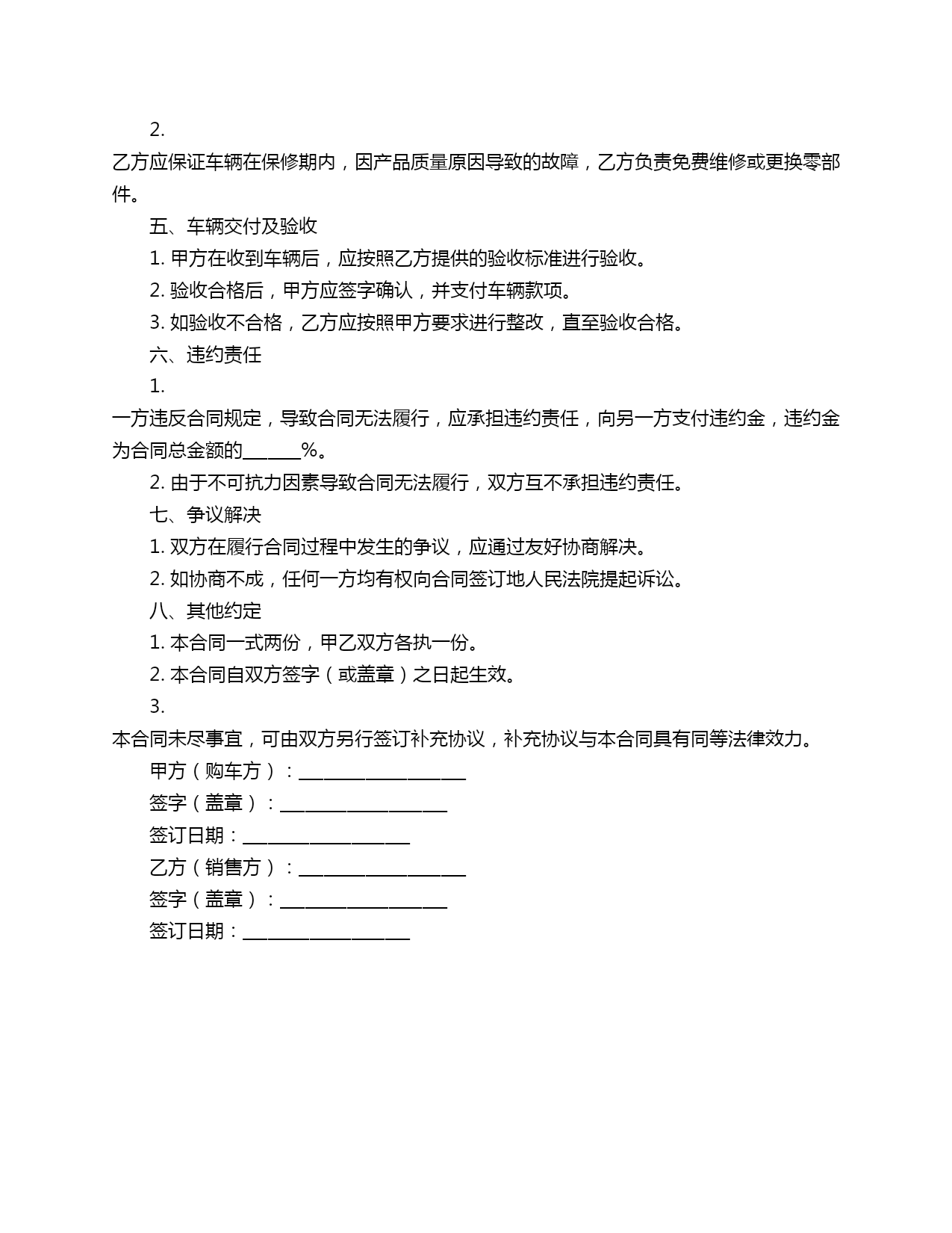 东方集团购车合同范本甲方(购车方):____________________乙方(销售方):____________________合同编号:_______一、车辆信息1.车辆品牌:____________________2.车辆型号:____________________3.车辆颜色:____________________4.车辆发动机号:____________________5.车辆车架号:____________________6.车辆合格证编号:____________________7.车辆出厂日期:____________________8.车辆里程表读数:____________________二、购车价格及支付方式1.车辆售价:人民币(大写):____________________元整(小写):____________________元。2.乙方提供购车发票,发票金额与实际支付金额一致。3.甲方支付方式:(1)现金支付;(2)银行转账;(3)信用卡支付。三、交车时间及地点1.交车时间:乙方应在合同签订后_______个工作日内,将车辆交付给甲方。2.交车地点:____________________。四、售后服务1.乙方应按照国家有关法律法规和车辆生产企业规定,为甲方提供相应的售后服务。2.乙方应保证车辆在保修期内,因产品质量原因导致的故障,乙方负责免费维修或更换零部件。五、车辆交付及验收1.甲方在收到车辆后,应按照乙方提供的验收标准进行验收。2.验收合格后,甲方应签字确认,并支付车辆款项。3.如验收不合格,乙方应按照甲方要求进行整改,直至验收合格。六、违约责任1.一方违反合同规定,导致合同无法履行,应承担违约责任,向另一方支付违约金,违约金为合同总金额的_______%。2.由于不可抗力因素导致合同无法履行,双方互不承担违约责任。七、争议解决1.双方在履行合同过程中发生的争议,应通过友好协商解决。2.如协商不成,任何一方均有权向合同签订地人民法院提起诉讼。八、其他约定1.本合同一式两份,甲乙双方各执一份。2.本合同自双方签字(或盖章)之日起生效。3.本合同未尽事宜,可由双方另行签订补充协议,补充协议与本合同具有同等法律效力。甲方(购车方):____________________签字(盖章):____________________签订日期:____________________乙方(销售方):____________________签字(盖章):____________________签订日期:____________________