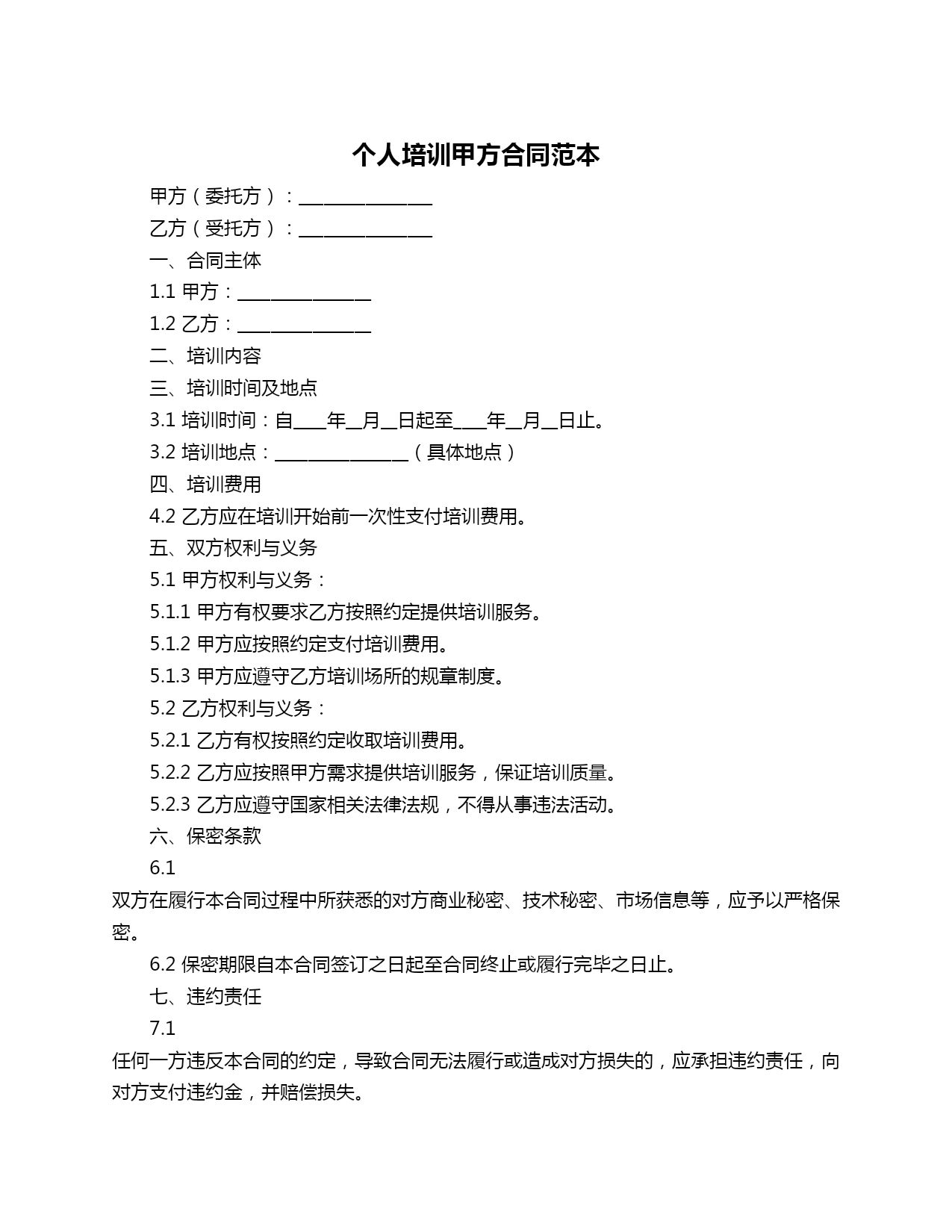 个人培训甲方合同范本甲方(委托方):________________乙方(受托方):________________一、合同主体1.1甲方:________________1.2乙方:________________二、培训内容三、培训时间及地点3.1培训时间:自____年__月__日起至____年__月__日止。3.2培训地点:________________(具体地点)四、培训费用4.2乙方应在培训开始前一次性支付培训费用。五、双方权利与义务5.1甲方权利与义务:5.1.1甲方有权要求乙方按照约定提供培训服务。5.1.2甲方应按照约定支付培训费用。5.1.3甲方应遵守乙方培训场所的规章制度。5.2乙方权利与义务:5.2.1乙方有权按照约定收取培训费用。5.2.2乙方应按照甲方需求提供培训服务,保证培训质量。5.2.3乙方应遵守国家相关法律法规,不得从事违法活动。六、保密条款6.1双方在履行本合同过程中所获悉的对方商业秘密、技术秘密、市场信息等,应予以严格保密。6.2保密期限自本合同签订之日起至合同终止或履行完毕之日止。七、违约责任7.1任何一方违反本合同的约定,导致合同无法履行或造成对方损失的,应承担违约责任,向对方支付违约金,并赔偿损失。八、争议解决8.1双方在履行本合同过程中发生的争议,应通过友好协商解决;协商不成的,可以向合同签订地人民法院提起诉讼。九、其他约定9.1本合同一式两份,甲乙双方各执一份。9.2本合同自双方签字(或盖章)之日起生效。甲方(签字/盖章):______________日期:____年__月__日乙方(签字/盖章):______________日期:____年__月__日