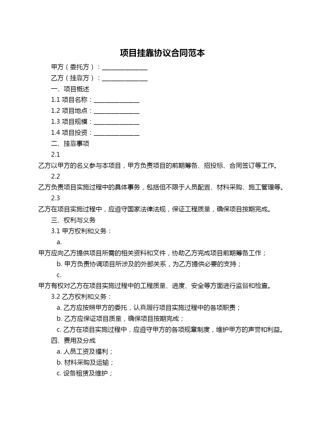 项目挂靠协议合同范本甲方(委托方):________________乙方(挂靠方):________________一、项目概述1.1项目名称:________________1.2项目地点:________________1.3项目规模:________________1.4项目投资:________________二、挂靠事项2.1乙方以甲方的名义参与本项目,甲方负责项目的前期筹备、招投标、合同签订等工作。2.2乙方负责项目实施过程中的具体事务,包括但不限于人员配置、材料采购、施工管理等。2.3乙方在项目实施过程中,应遵守国家法律法规,保证工程质量,确保项目按期完成。三、权利与义务3.1甲方权利和义务:a.甲方应向乙方提供项目所需的相关资料和文件,协助乙方完成项目前期筹备工作;b.甲方负责协调项目所涉及的外部关系,为乙方提供必要的支持;c.甲方有权对乙方在项目实施过程中的工程质量、进度、安全等方面进行监督和检查。3.2乙方权利和义务:a.乙方应按照甲方的委托,认真履行项目实施过程中的各项职责;b.乙方应保证项目质量,确保项目按期完成;c.乙方在项目实施过程中,应遵守甲方的各项规章制度,维护甲方的声誉和利益。四、费用及分成a.人员工资及福利;b.材料采购及运输;c.设备租赁及维护;d.项目管理费用等。4.2甲方按照项目实际完成产值的一定比例支付乙方分成,具体比例为_____%。五、违约责任5.1双方应严格按照本协议的约定履行各自的权利和义务,如一方违约,应承担相应的法律责任。5.2甲方未能按照约定提供项目所需资料和文件,导致乙方无法正常开展项目,甲方应承担违约责任。5.3乙方未能按照约定完成项目,或项目质量不符合要求,乙方应承担违约责任。六、争议解决6.1双方在履行本协议过程中发生的争议,应通过友好协商解决;协商不成的,任何一方均有权向合同签订地人民法院提起诉讼。七、附则7.1本协议一式两份,甲乙双方各执一份。7.2本协议自双方签字(或盖章)之日起生效,有效期为____年,自项目完工之日起终止。7.3本协议未尽事宜,双方可另行签订补充协议,补充协议与本协议具有同等法律效力。甲方(盖章):________________乙方(盖章):________________签订日期:________________