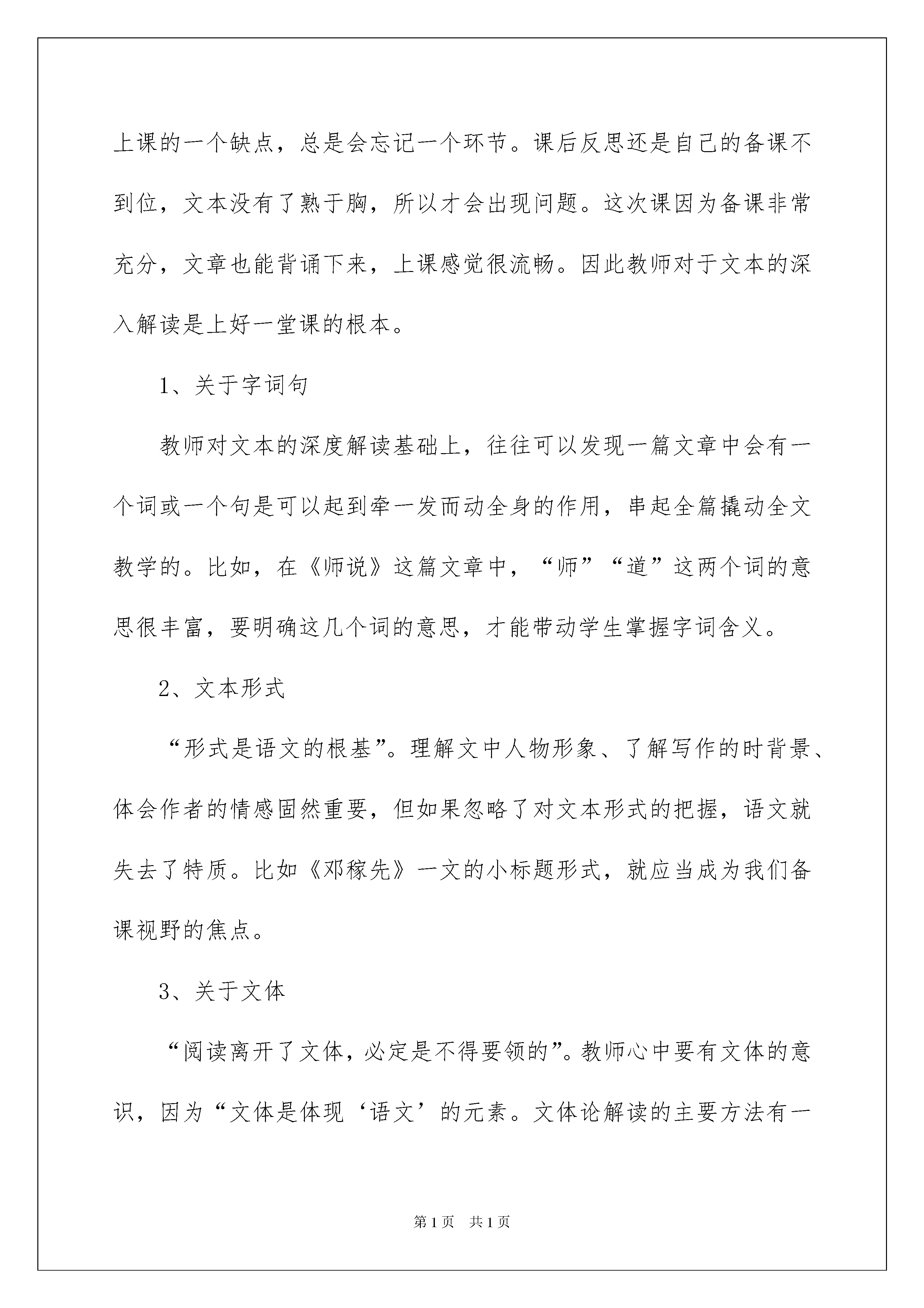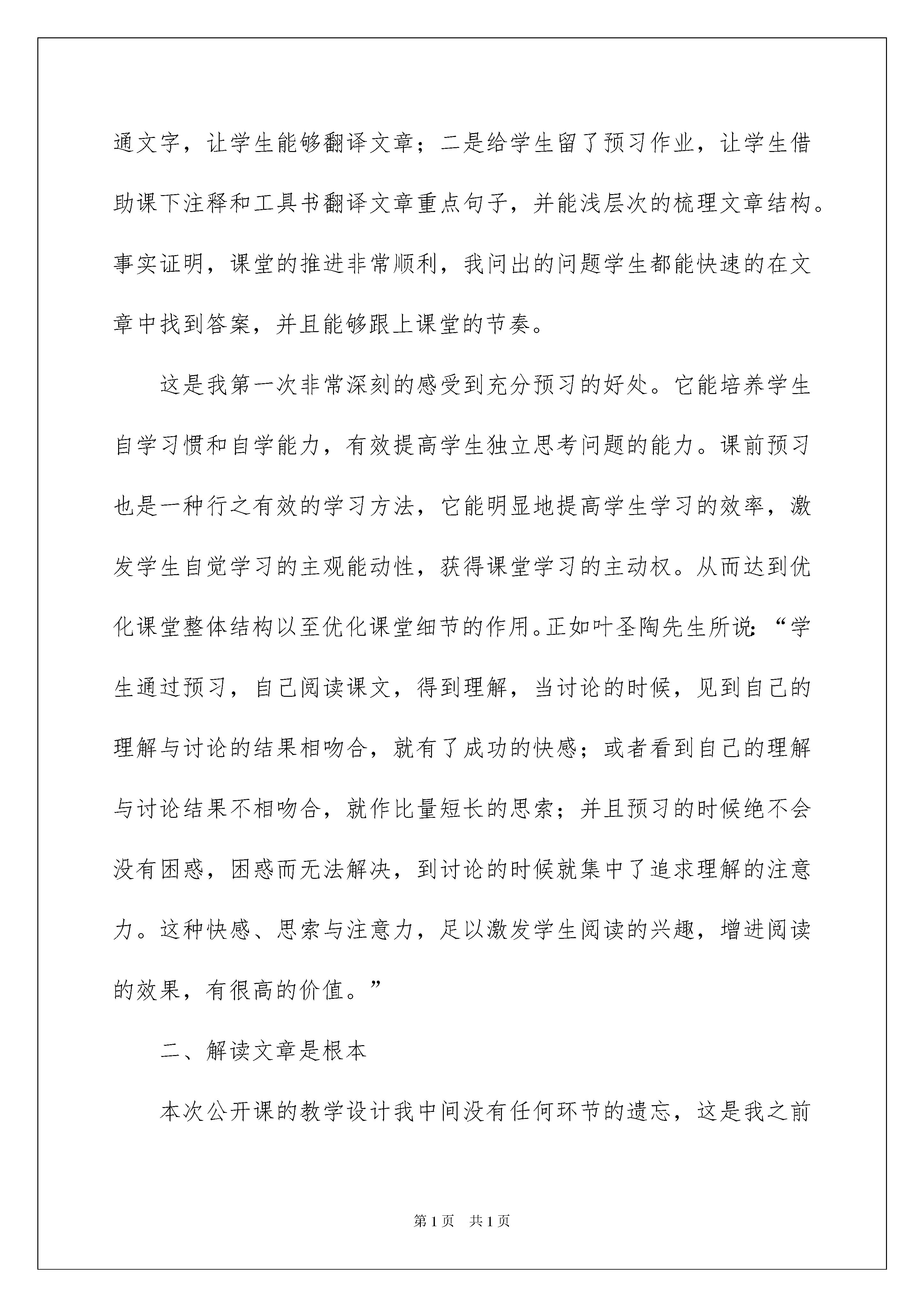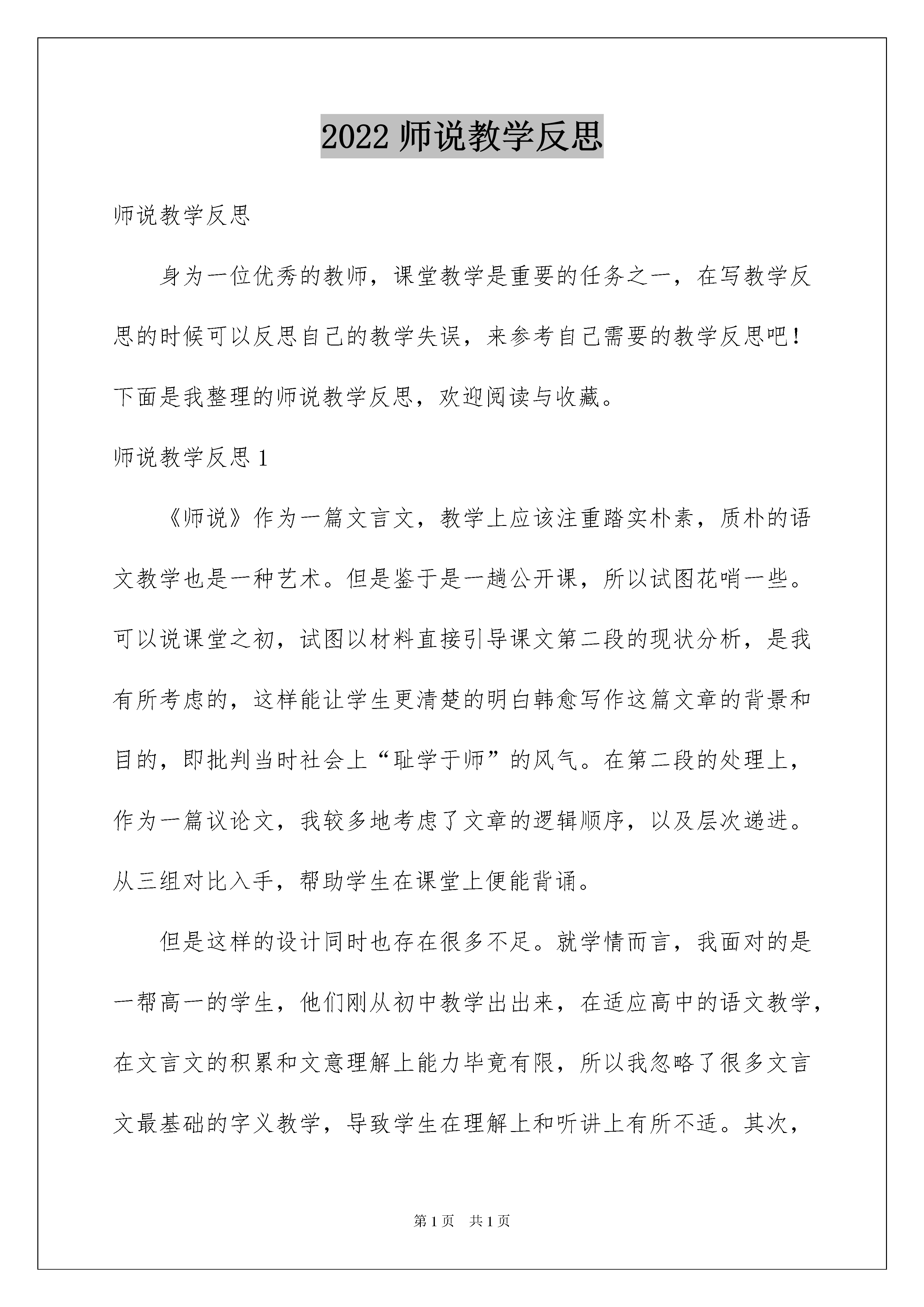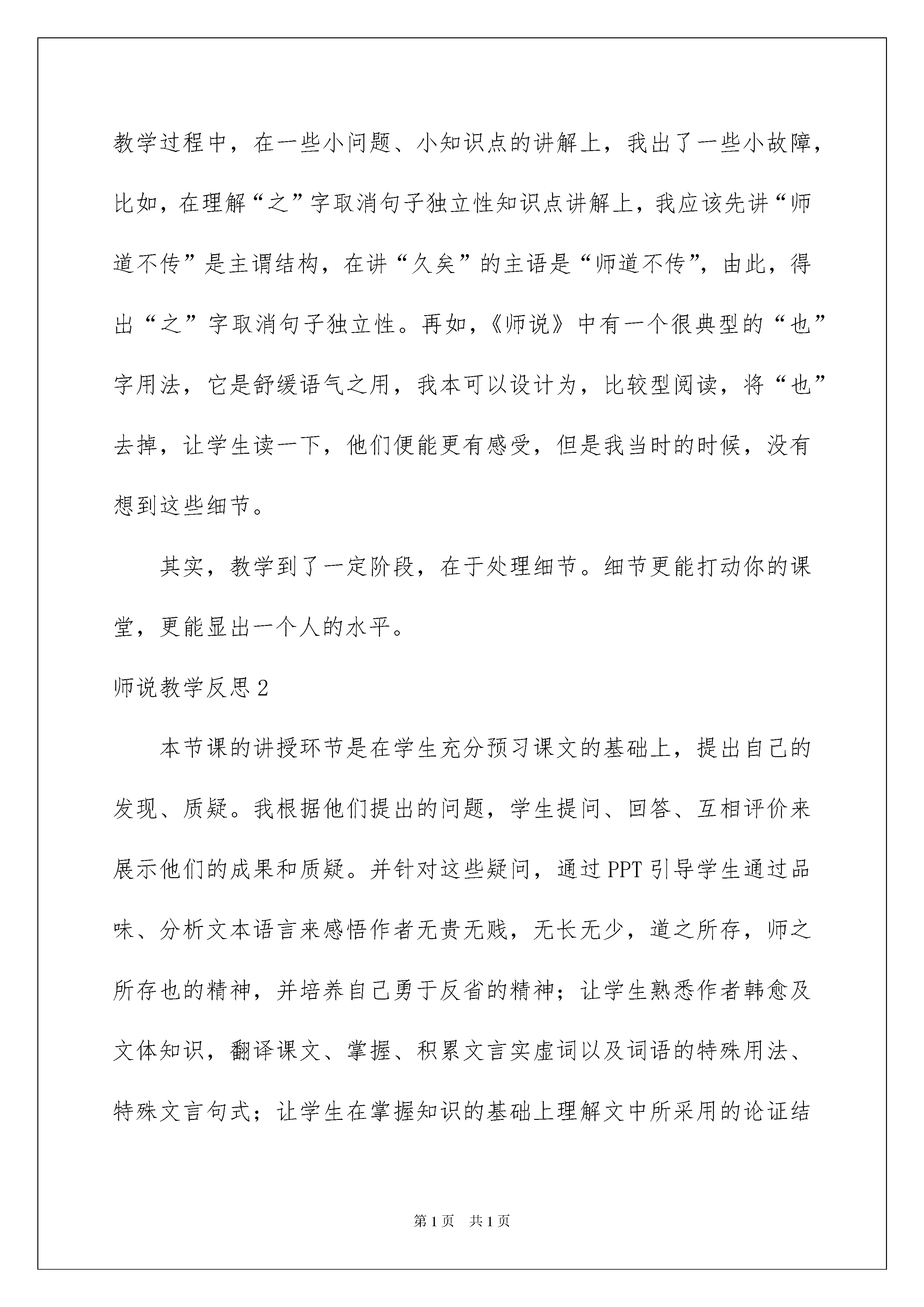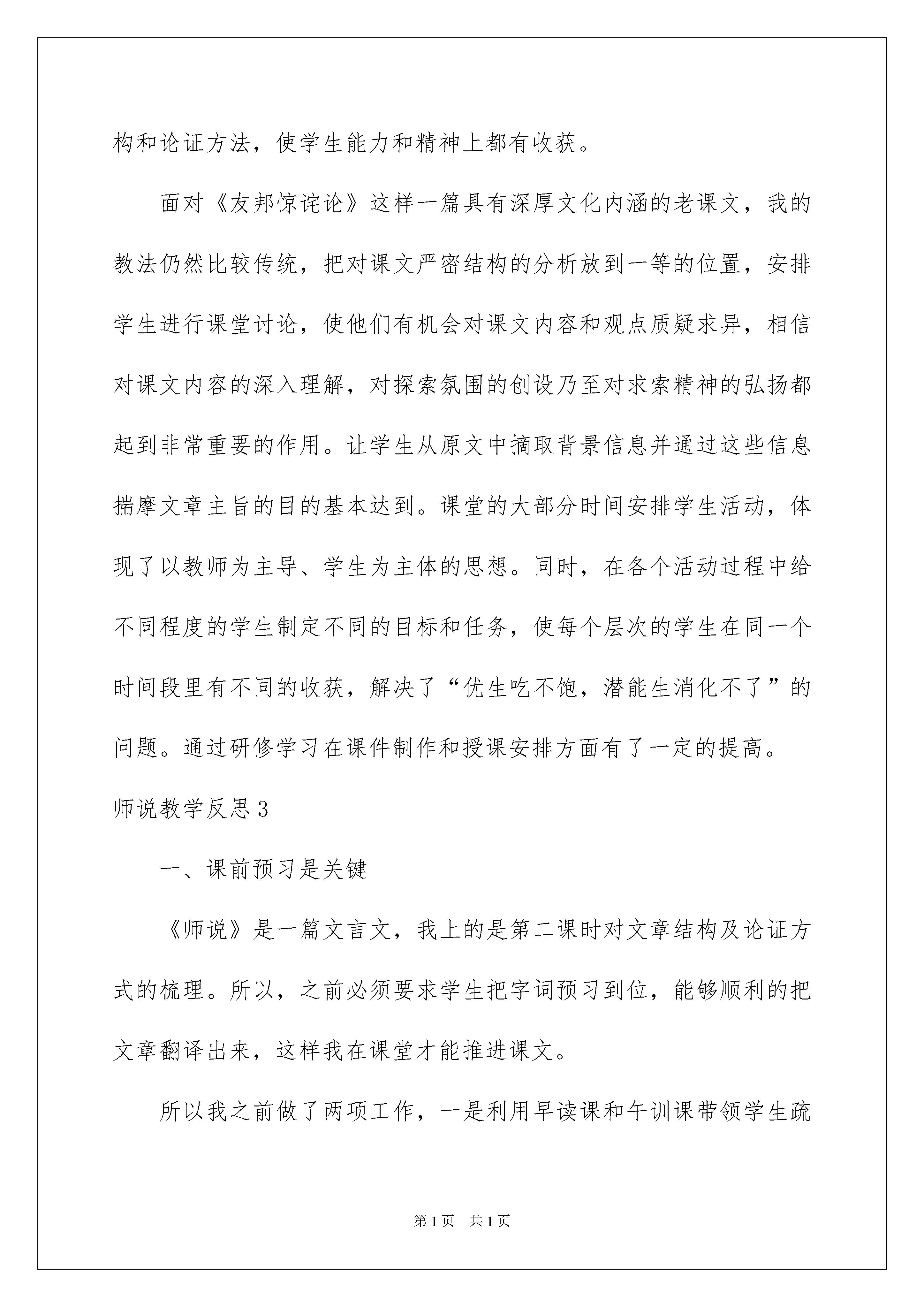 2022师说教学反思师说教学反思身为一位优秀的教师,课堂教学是重要的任务之一,在写教学反思的时候可以反思自己的教学失误,来参考自己需要的教学反思吧!下面是我整理的师说教学反思,欢迎阅读与收藏。师说教学反思1《师说》作为一篇文言文,教学上应该注重踏实朴素,质朴的语文教学也是一种艺术。但是鉴于是一趟公开课,所以试图花哨一些。可以说课堂之初,试图以材料直接引导课文第二段的现状分析,是我有所考虑的,这样能让学生更清楚的明白韩愈写作这篇文章的背景和目的,即批判当时社会上“耻学于师”的风气。在第二段的处理上,作为一篇议论文,我较多地考虑了文章的逻辑顺序,以及层次递进。从三组对比入手,帮助学生在课堂上便能背诵。但是这样的设计同时也存在很多不足。就学情而言,我面对的是一帮高一的学生,他们刚从初中教学出出来,在适应高中的语文教学,在文言文的积累和文意理解上能力毕竟有限,所以我忽略了很多文言文最基础的字义教学,导致学生在理解上和听讲上有所不适。其次,教学过程中,在一些小问题、小知识点的讲解上,我出了一些小故障,比如,在理解“之”字取消句子独立性知识点讲解上,我应该先讲“师道不传”是主谓结构,在讲“久矣”的主语是“师道不传”,由此,得出“之”字取消句子独立性。再如,《师说》中有一个很典型的“也”字用法,它是舒缓语气之用,我本可以设计为,比较型阅读,将“也”去掉,让学生读一下,他们便能更有感受,但是我当时的时候,没有想到这些细节。其实,教学到了一定阶段,在于处理细节。细节更能打动你的课堂,更能显出一个人的水平。师说教学反思2本节课的讲授环节是在学生充分预习课文的基础上,提出自己的发现、质疑。我根据他们提出的问题,学生提问、回答、互相评价来展示他们的成果和质疑。并针对这些疑问,通过PPT引导学生通过品味、分析文本语言来感悟作者无贵无贱,无长无少,道之所存,师之所存也的精神,并培养自己勇于反省的精神;让学生熟悉作者韩愈及文体知识,翻译课文、掌握、积累文言实虚词以及词语的特殊用法、特殊文言句式;让学生在掌握知识的基础上理解文中所采用的论证结构和论证方法,使学生能力和精神上都有收获。面对《友邦惊诧论》这样一篇具有深厚文化内涵的老课文,我的教法仍然比较传统,把对课文严密结构的分析放到一等的位置,安排学生进行课堂讨论,使他们有机会对课文内容和观点质疑求异,相信对课文内容的深入理解,对探索氛围的创设乃至对求索精神的弘扬都起到非常重要的作用。让学生从原文中摘取背景信息并通过这些信息揣摩文章主旨的目的基本达到。课堂的大部分时间安排学生活动,体现了以教师为主导、学生为主体的思想。同时,在各个活动过程中给不同程度的学生制定不同的目标和任务,使每个层次的学生在同一个时间段里有不同的收获,解决了“优生吃不饱,潜能生消化不了”的问题。通过研修学习在课件制作和授课安排方面有了一定的提高。师说教学反思3一、课前预习是关键《师说》是一篇文言文,我上的是第二课时对文章结构及论证方式的梳理。所以,之前必须要求学生把字词预习到位,能够顺利的把文章翻译出来,这样我在课堂才能推进课文。所以我之前做了两项工作,一是利用早读课和午训课带领学生疏通文字,让学生能够翻译文章;二是给学生留了预习作业,让学生借助课下注释和工具书翻译文章重点句子,并能浅层次的梳理文章结构。事实证明,课堂的推进非常顺利,我问出的问题学生都能快速的在文章中找到答案,并且能够跟上课堂的节奏。这是我第一次非常深刻的感受到充分预习的好处。它能培养学生自学习惯和自学能力,有效提高学生独立思考问题的能力。课前预习也是一种行之有效的学习方法,它能明显地提高学生学习的效率,激发学生自觉学习的主观能动性,获得课堂学习的主动权。从而达到优化课堂整体结构以至优化课堂细节的作用。正如叶圣陶先生所说:“学生通过预习,自己阅读课文,得到理解,当讨论的时候,见到自己的理解与讨论的结果相吻合,就有了成功的快感;或者看到自己的理解与讨论结果不相吻合,就作比量短长的思索;并且预习的时候绝不会没有困惑,困惑而无法解决,到讨论的时候就集中了追求理解的注意力。这种快感、思索与注意力,足以激发学生阅读的兴趣,增进阅读的效果,有很高的价值。”二、解读文章是根本本次公开课的教学设计我中间没有任何环节的遗忘,这是我之前上课的一个缺点,总是会忘记一个环节。课后反思还是自己的备课不到位,文本没有了熟于胸,所以才会出现问题。这次课因为备课非常充分,文章也能背诵下来,上课感觉很流畅。因此教师对于文本的深入解读是上好一堂课的根本。1、关于字词句教师对文本的深度解读基础上,往往可以发现一篇文章中会有一个词或一个句是可以起到牵一发而