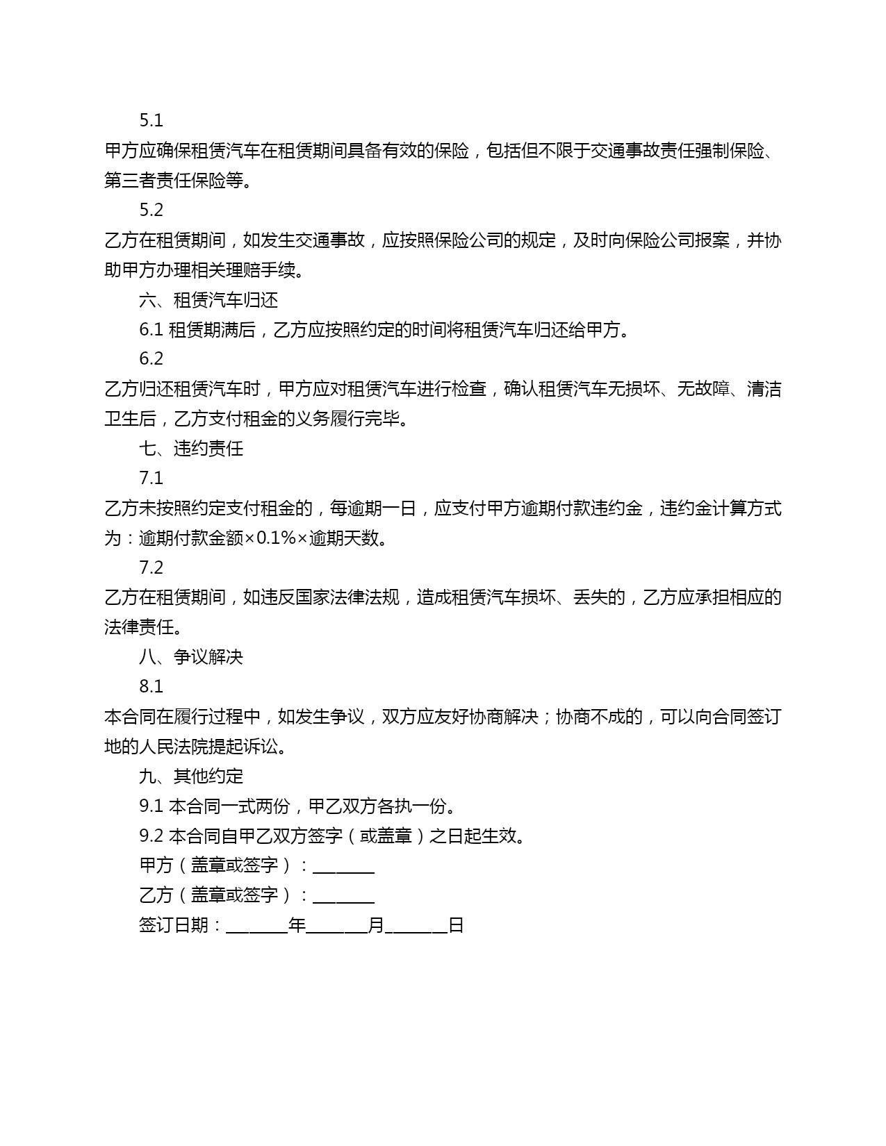 汽车租车合同范本合同编号:________甲方(出租方):________乙方(承租方):________一、租赁汽车基本情况1.1汽车品牌及型号:________1.2汽车车牌号码:________1.3汽车发动机号:________1.4汽车车架号:________1.5汽车行驶证号:________1.6汽车颜色:________1.7汽车里程表读数:________公里(千米)二、租赁期限2.1租赁期限:自________年________月________日至________年________月________日,共计________天。三、租赁费用及支付方式3.1租金:乙方应支付甲方租金人民币(大写):________元整(小写):________元。3.2支付方式:乙方应在租赁期限开始前一次性支付甲方租金。四、租赁汽车使用及保养4.1乙方在使用租赁汽车期间,应遵守国家交通法规,安全驾驶,不得酒后驾车、疲劳驾驶、超速行驶等违法行为。4.2乙方应按照甲方的要求,定期对租赁汽车进行保养和维护,确保租赁汽车的良好性能。4.3乙方在租赁期间,如租赁汽车出现故障,应及时通知甲方,并按照甲方的安排进行维修。五、租赁汽车保险5.1甲方应确保租赁汽车在租赁期间具备有效的保险,包括但不限于交通事故责任强制保险、第三者责任保险等。5.2乙方在租赁期间,如发生交通事故,应按照保险公司的规定,及时向保险公司报案,并协助甲方办理相关理赔手续。六、租赁汽车归还6.1租赁期满后,乙方应按照约定的时间将租赁汽车归还给甲方。6.2乙方归还租赁汽车时,甲方应对租赁汽车进行检查,确认租赁汽车无损坏、无故障、清洁卫生后,乙方支付租金的义务履行完毕。七、违约责任7.1乙方未按照约定支付租金的,每逾期一日,应支付甲方逾期付款违约金,违约金计算方式为:逾期付款金额×0.1%×逾期天数。7.2乙方在租赁期间,如违反国家法律法规,造成租赁汽车损坏、丢失的,乙方应承担相应的法律责任。八、争议解决8.1本合同在履行过程中,如发生争议,双方应友好协商解决;协商不成的,可以向合同签订地的人民法院提起诉讼。九、其他约定9.1本合同一式两份,甲乙双方各执一份。9.2本合同自甲乙双方签字(或盖章)之日起生效。甲方(盖章或签字):________乙方(盖章或签字):________签订日期:________年________月________日