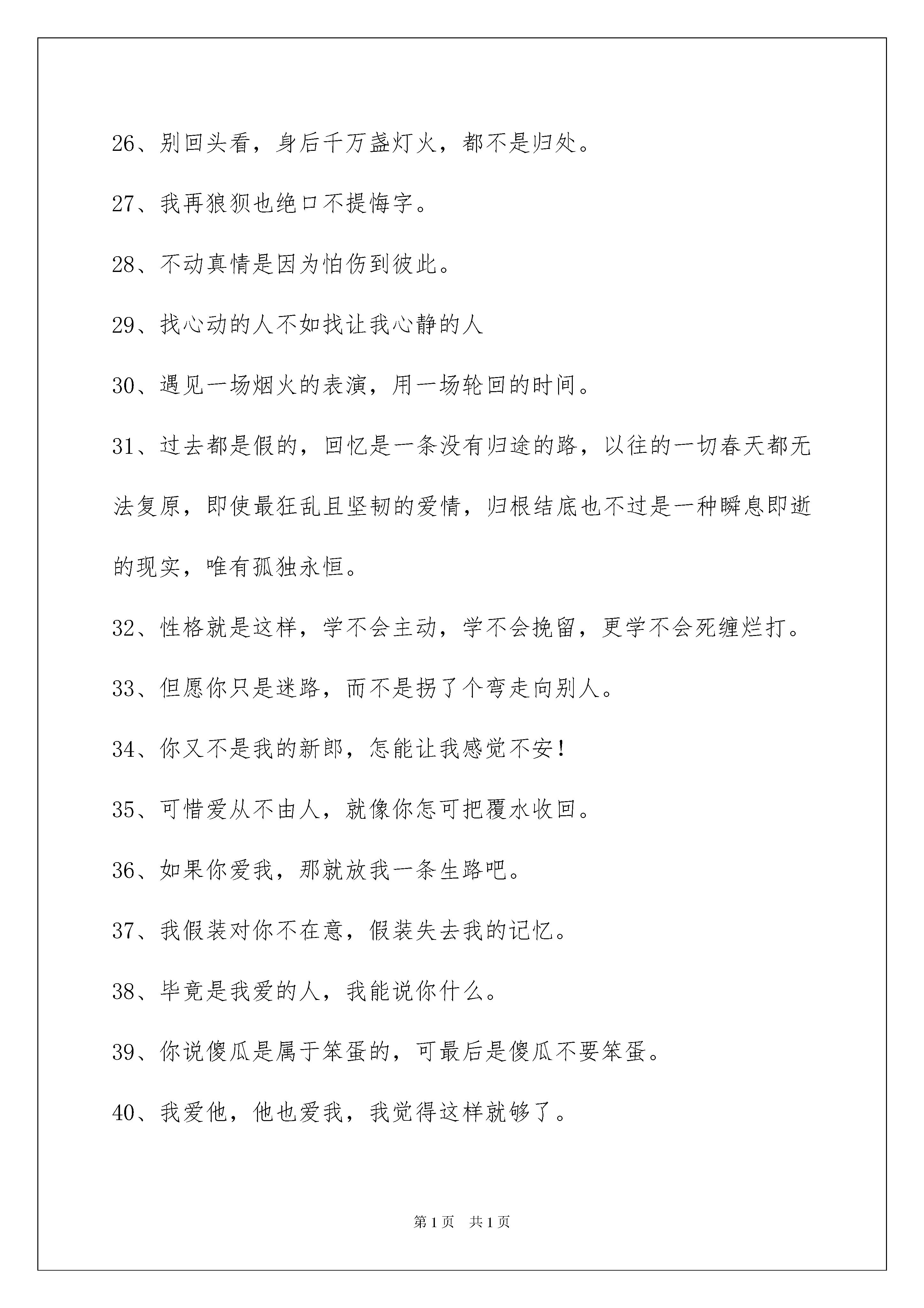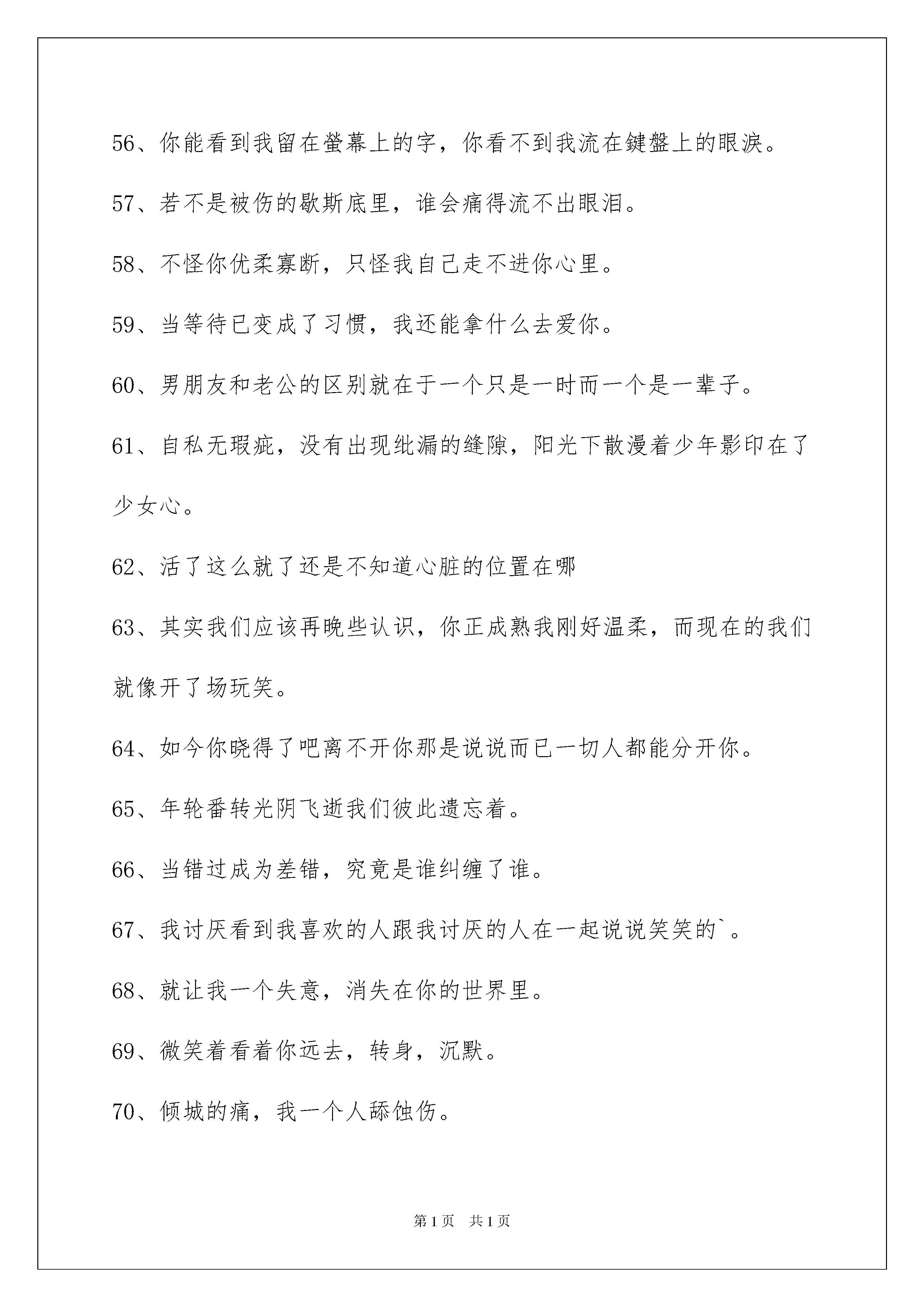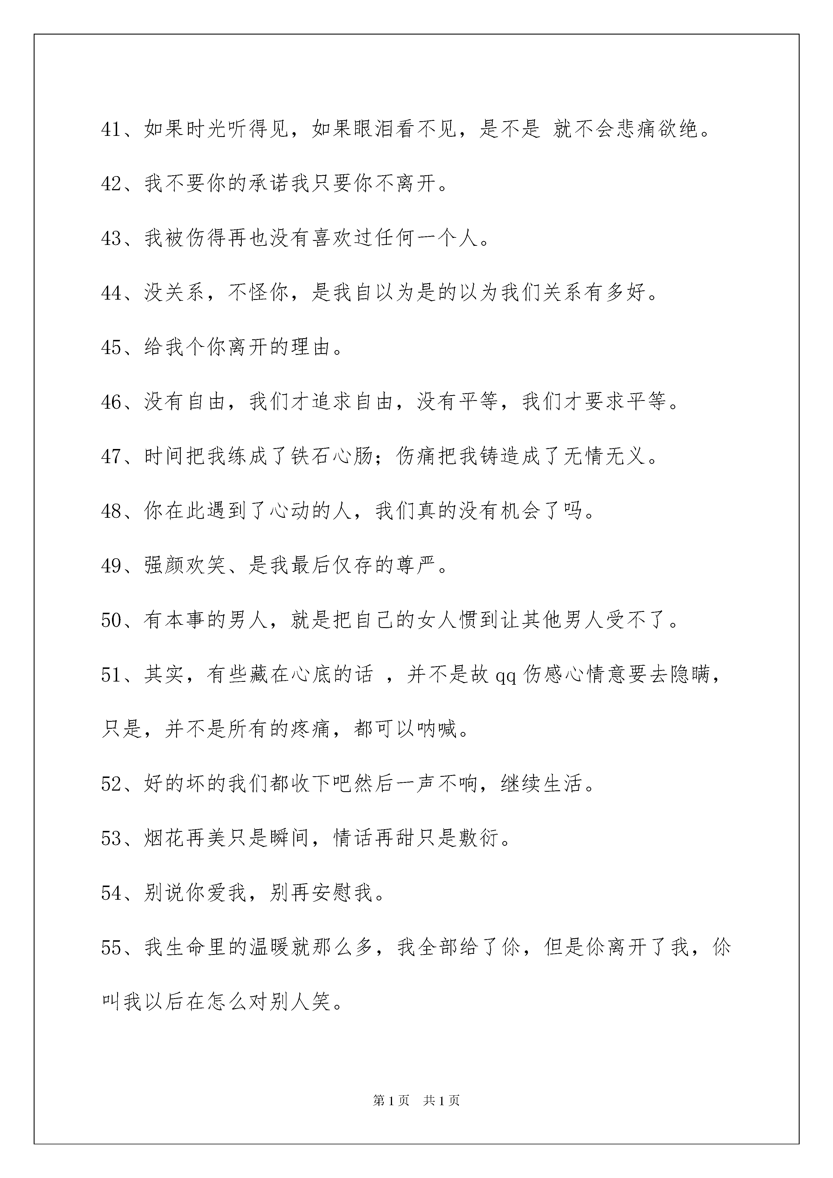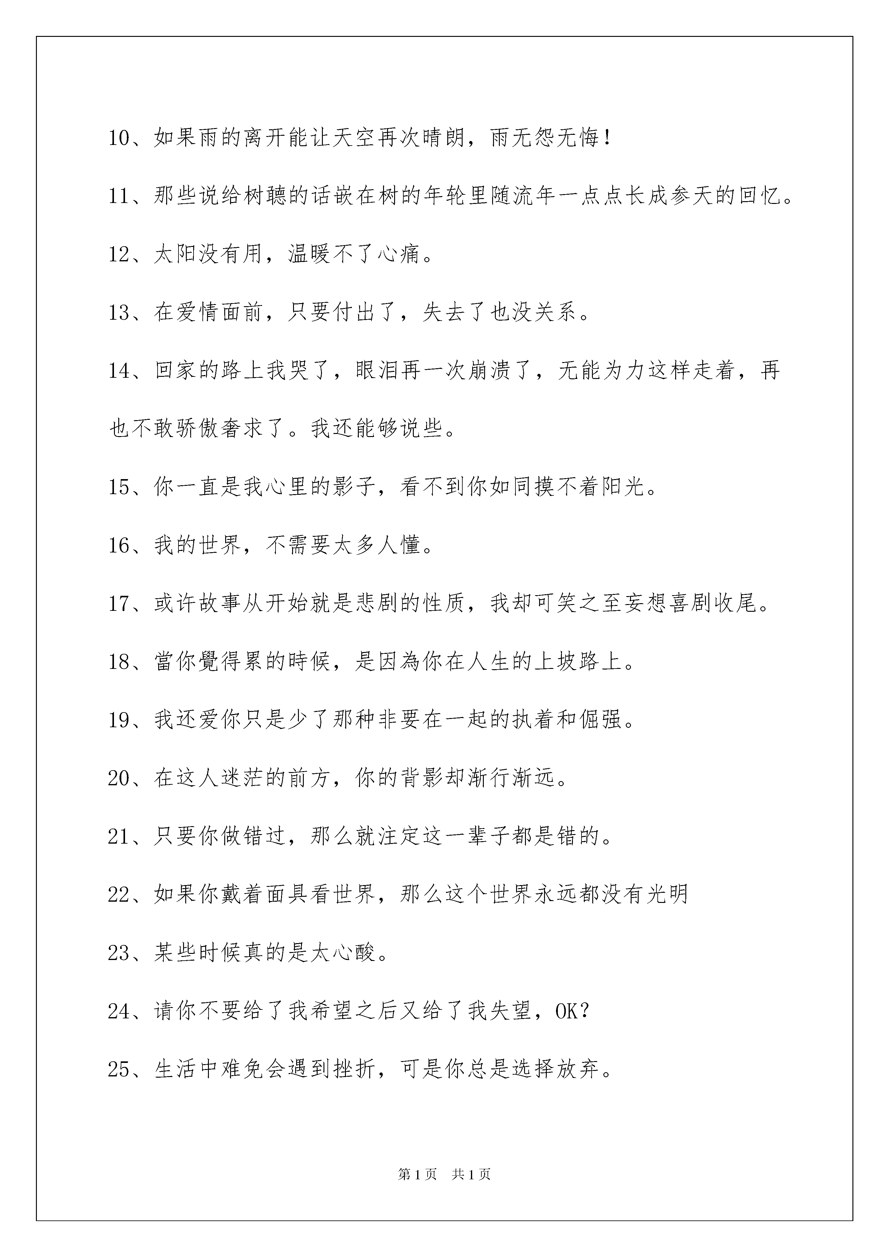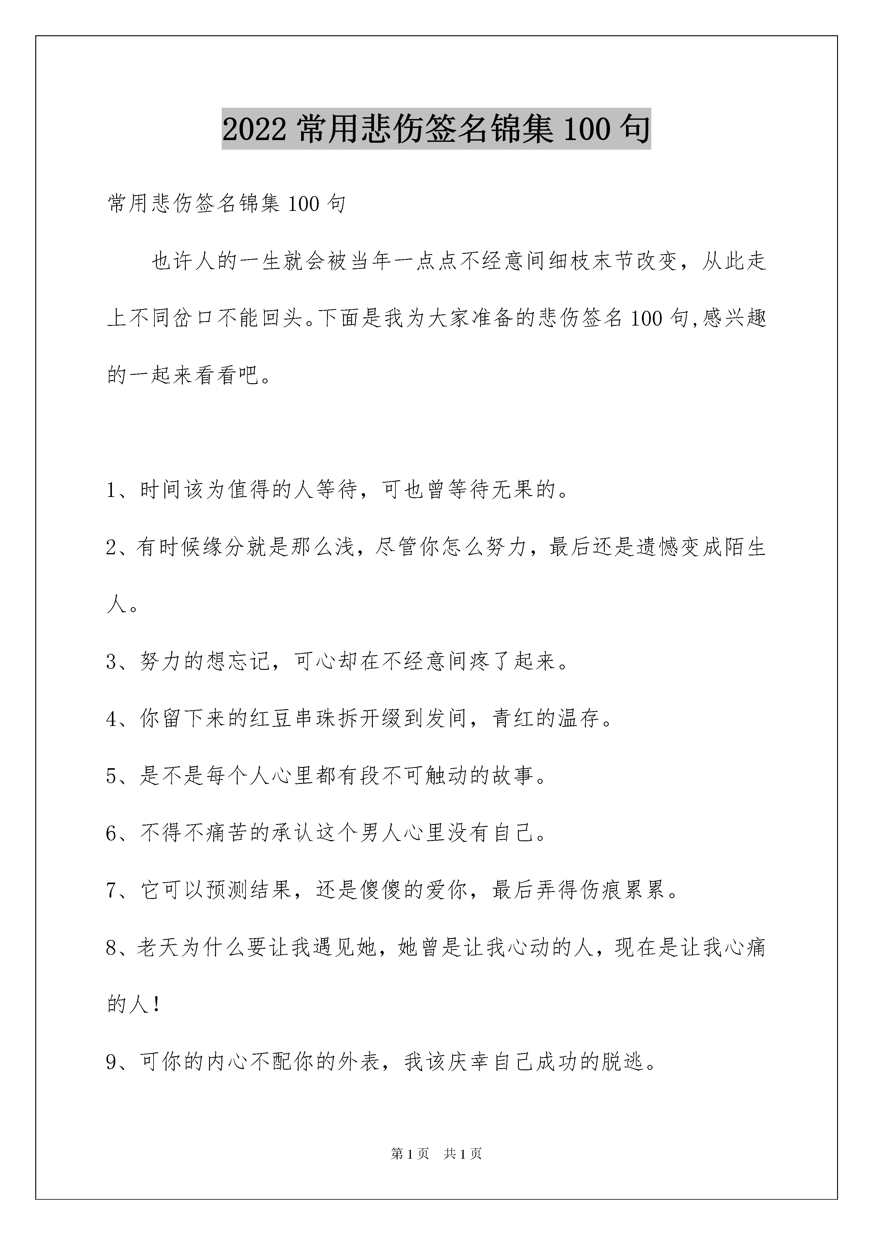 2022常用悲伤签名锦集100句常用悲伤签名锦集100句也许人的一生就会被当年一点点不经意间细枝末节改变,从此走上不同岔口不能回头。下面是我为大家准备的悲伤签名100句,感兴趣的一起来看看吧。1、时间该为值得的人等待,可也曾等待无果的。2、有时候缘分就是那么浅,尽管你怎么努力,最后还是遗憾变成陌生人。3、努力的想忘记,可心却在不经意间疼了起来。4、你留下来的红豆串珠拆开缀到发间,青红的温存。5、是不是每个人心里都有段不可触动的故事。6、不得不痛苦的承认这个男人心里没有自己。7、它可以预测结果,还是傻傻的爱你,最后弄得伤痕累累。8、老天为什么要让我遇见她,她曾是让我心动的人,现在是让我心痛的人!9、可你的内心不配你的外表,我该庆幸自己成功的脱逃。10、如果雨的离开能让天空再次晴朗,雨无怨无悔!11、那些说给树聼的话嵌在树的年轮里随流年一点点长成参天的回忆。12、太阳没有用,温暖不了心痛。13、在爱情面前,只要付出了,失去了也没关系。14、回家的路上我哭了,眼泪再一次崩溃了,无能为力这样走着,再也不敢骄傲奢求了。我还能够说些。15、你一直是我心里的影子,看不到你如同摸不着阳光。16、我的世界,不需要太多人懂。17、或许故事从开始就是悲剧的性质,我却可笑之至妄想喜剧收尾。18、當你覺得累的時候,是因為你在人生的上坡路上。19、我还爱你只是少了那种非要在一起的执着和倔强。20、在这人迷茫的前方,你的背影却渐行渐远。21、只要你做错过,那么就注定这一辈子都是错的。22、如果你戴着面具看世界,那么这个世界永远都没有光明23、某些时候真的是太心酸。24、请你不要给了我希望之后又给了我失望,OK?25、生活中难免会遇到挫折,可是你总是选择放弃。26、别回头看,身后千万盏灯火,都不是归处。27、我再狼狈也绝口不提悔字。28、不动真情是因为怕伤到彼此。29、找心动的人不如找让我心静的人30、遇见一场烟火的表演,用一场轮回的时间。31、过去都是假的,回忆是一条没有归途的路,以往的一切春天都无法复原,即使最狂乱且坚韧的爱情,归根结底也不过是一种瞬息即逝的现实,唯有孤独永恒。32、性格就是这样,学不会主动,学不会挽留,更学不会死缠烂打。33、但愿你只是迷路,而不是拐了个弯走向别人。34、你又不是我的新郎,怎能让我感觉不安!35、可惜爱从不由人,就像你怎可把覆水收回。36、如果你爱我,那就放我一条生路吧。37、我假装对你不在意,假装失去我的记忆。38、毕竟是我爱的人,我能说你什么。39、你说傻瓜是属于笨蛋的,可最后是傻瓜不要笨蛋。40、我爱他,他也爱我,我觉得这样就够了。41、如果时光听得见,如果眼泪看不见,是不是就不会悲痛欲绝。42、我不要你的承诺我只要你不离开。43、我被伤得再也没有喜欢过任何一个人。44、没关系,不怪你,是我自以为是的以为我们关系有多好。45、给我个你离开的理由。46、没有自由,我们才追求自由,没有平等,我们才要求平等。47、时间把我练成了铁石心肠;伤痛把我铸造成了无情无义。48、你在此遇到了心动的人,我们真的没有机会了吗。49、强颜欢笑、是我最后仅存的尊严。50、有本事的男人,就是把自己的女人惯到让其他男人受不了。51、其实,有些藏在心底的话,并不是故qq伤感心情意要去隐瞒,只是,并不是所有的疼痛,都可以呐喊。52、好的坏的我们都收下吧然后一声不响,继续生活。53、烟花再美只是瞬间,情话再甜只是敷衍。54、别说你爱我,别再安慰我。55、我生命里的温暖就那么多,我全部给了伱,但是伱离开了我,伱叫我以后在怎么对别人笑。56、你能看到我留在螢幕上的字,你看不到我流在鍵盤上的眼淚。57、若不是被伤的歇斯底里,谁会痛得流不出眼泪。58、不怪你优柔寡断,只怪我自己走不进你心里。59、当等待已变成了习惯,我还能拿什么去爱你。60、男朋友和老公的区别就在于一个只是一时而一个是一辈子。61、自私无瑕疵,没有出现纰漏的缝隙,阳光下散漫着少年影印在了少女心。62、活了这么就了还是不知道心脏的位置在哪63、其实我们应该再晚些认识,你正成熟我刚好温柔,而现在的我们就像开了场玩笑。64、如今你晓得了吧离不开你那是说说而已一切人都能分开你。65、年轮番转光阴飞逝我们彼此遗忘着。66、当错过成为差错,究竟是谁纠缠了谁。67、我讨厌看到我喜欢的人跟我讨厌的人在一起说说笑笑的`。68、就让我一个失意,消失在你的世界里。69、微笑着看着你远去,转身,沉默。70、倾城的痛,我一个人舔蚀伤。71、那些令我歇斯底里的感動,如今卻是我歇斯底里的痛。72、他如今只活在我的记忆里。73、爱从未辜负过什么,只是蹉跎了时光。74