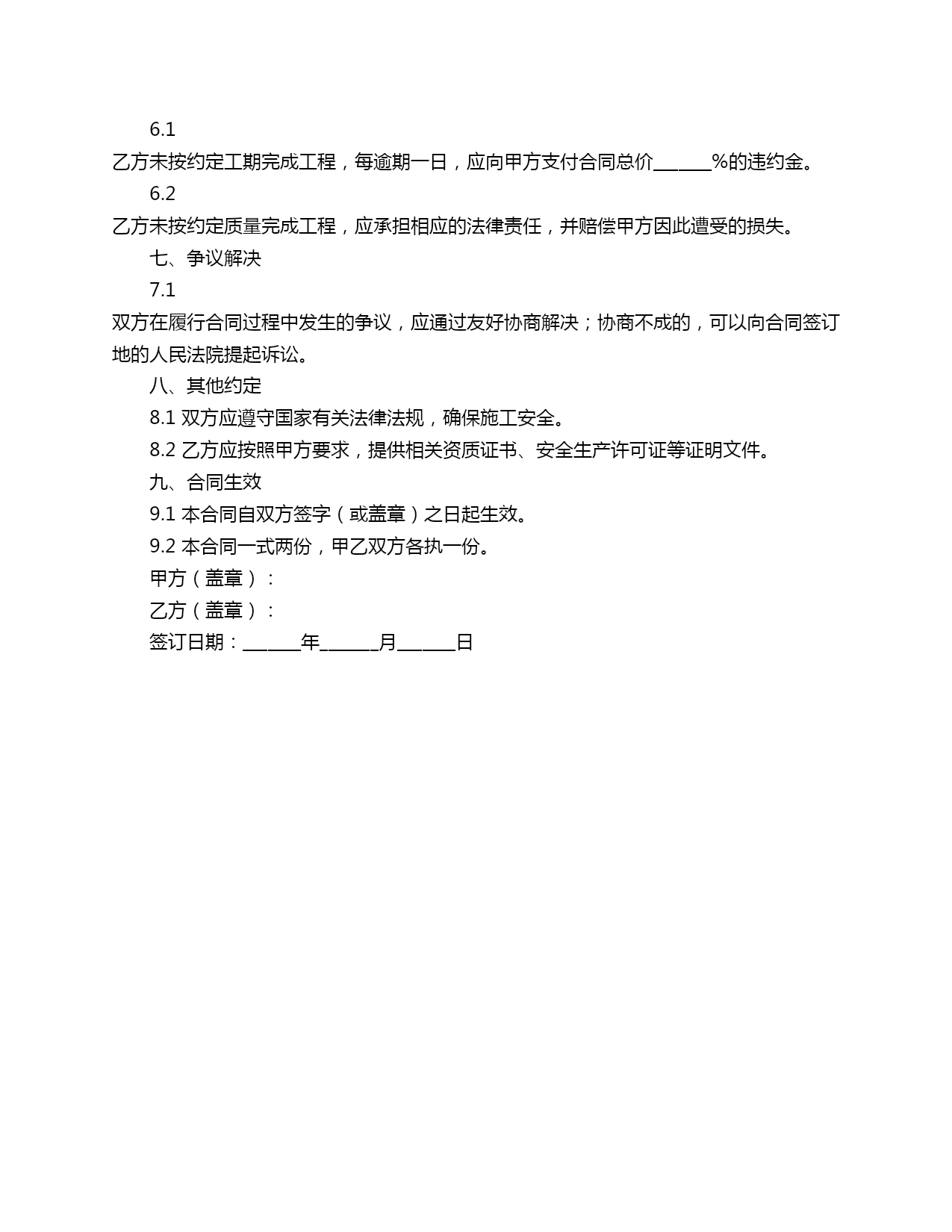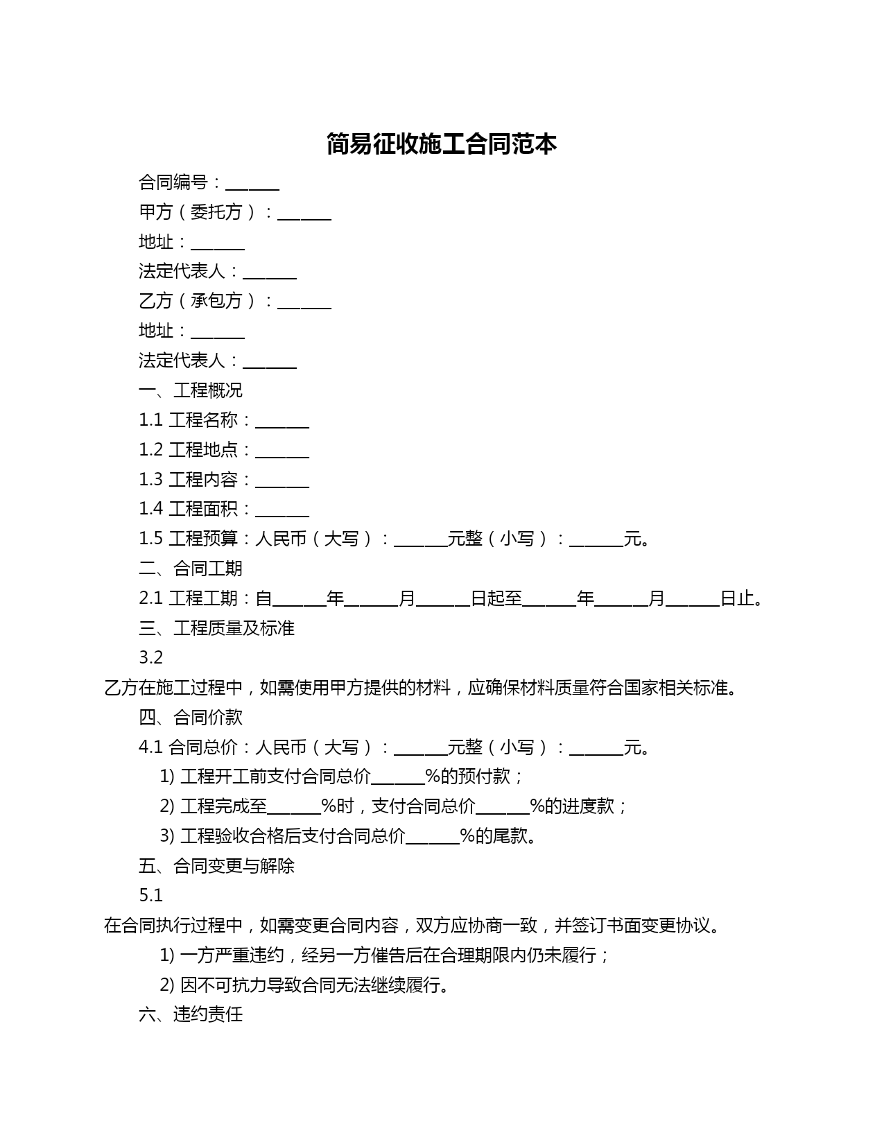 简易征收施工合同范本合同编号:_______甲方(委托方):_______地址:_______法定代表人:_______乙方(承包方):_______地址:_______法定代表人:_______一、工程概况1.1工程名称:_______1.2工程地点:_______1.3工程内容:_______1.4工程面积:_______1.5工程预算:人民币(大写):_______元整(小写):_______元。二、合同工期2.1工程工期:自_______年_______月_______日起至_______年_______月_______日止。三、工程质量及标准3.2乙方在施工过程中,如需使用甲方提供的材料,应确保材料质量符合国家相关标准。四、合同价款4.1合同总价:人民币(大写):_______元整(小写):_______元。1)工程开工前支付合同总价_______%的预付款;2)工程完成至_______%时,支付合同总价_______%的进度款;3)工程验收合格后支付合同总价_______%的尾款。五、合同变更与解除5.1在合同执行过程中,如需变更合同内容,双方应协商一致,并签订书面变更协议。1)一方严重违约,经另一方催告后在合理期限内仍未履行;2)因不可抗力导致合同无法继续履行。六、违约责任6.1乙方未按约定工期完成工程,每逾期一日,应向甲方支付合同总价_______%的违约金。6.2乙方未按约定质量完成工程,应承担相应的法律责任,并赔偿甲方因此遭受的损失。七、争议解决7.1双方在履行合同过程中发生的争议,应通过友好协商解决;协商不成的,可以向合同签订地的人民法院提起诉讼。八、其他约定8.1双方应遵守国家有关法律法规,确保施工安全。8.2乙方应按照甲方要求,提供相关资质证书、安全生产许可证等证明文件。九、合同生效9.1本合同自双方签字(或盖章)之日起生效。9.2本合同一式两份,甲乙双方各执一份。甲方(盖章):乙方(盖章):签订日期:_______年_______月_______日
