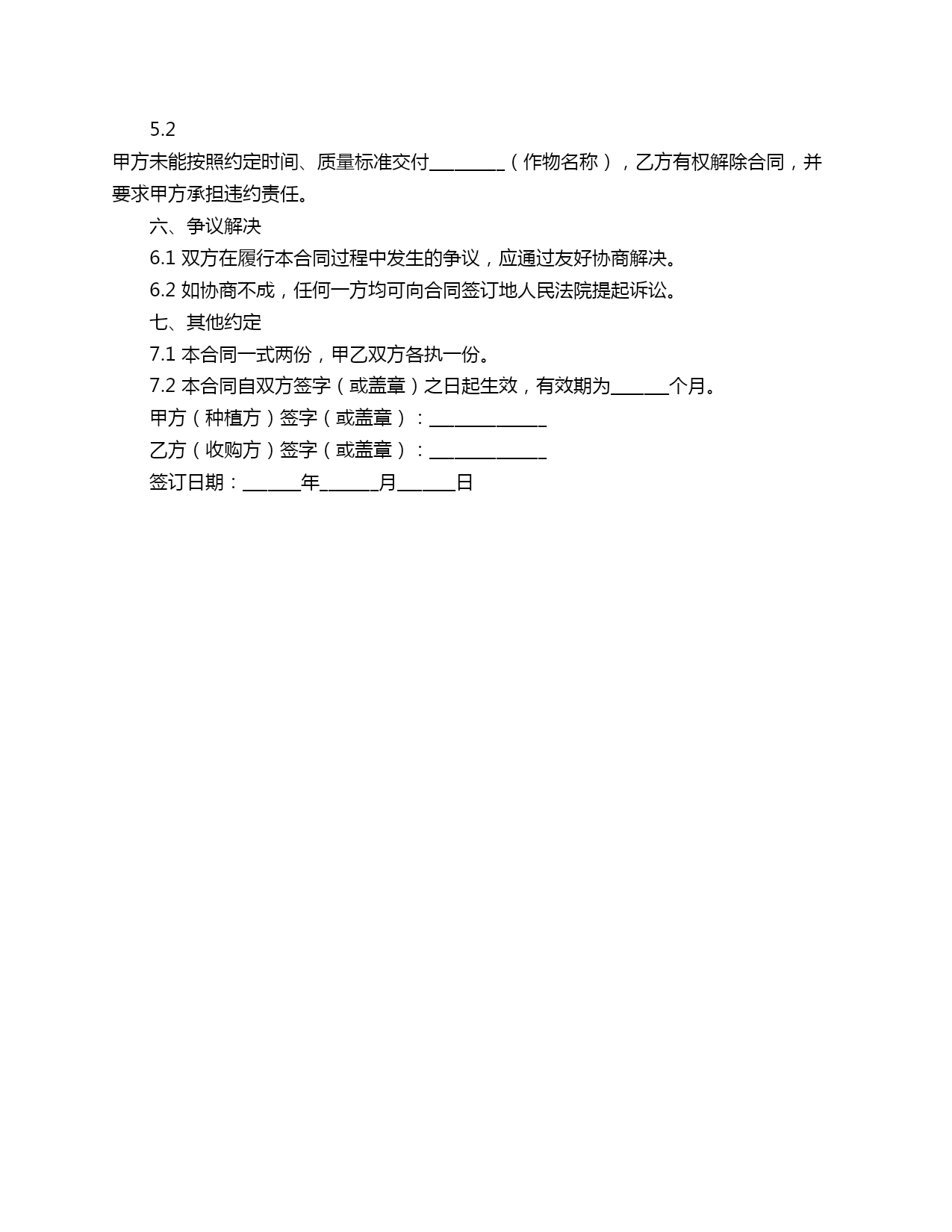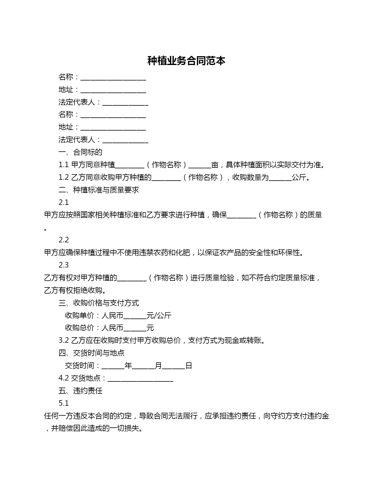 种植业务合同范本名称:____________________地址:____________________法定代表人:______________名称:____________________地址:____________________法定代表人:______________一、合同标的1.1甲方同意种植_________(作物名称)_______亩,具体种植面积以实际交付为准。1.2乙方同意收购甲方种植的_________(作物名称),收购数量为_______公斤。二、种植标准与质量要求2.1甲方应按照国家相关种植标准和乙方要求进行种植,确保_________(作物名称)的质量。2.2甲方应确保种植过程中不使用违禁农药和化肥,以保证农产品的安全性和环保性。2.3乙方有权对甲方种植的_________(作物名称)进行质量检验,如不符合约定质量标准,乙方有权拒绝收购。三、收购价格与支付方式收购单价:人民币_______元/公斤收购总价:人民币_______元3.2乙方应在收购时支付甲方收购总价,支付方式为现金或转账。四、交货时间与地点交货时间:_______年_______月_______日4.2交货地点:____________________五、违约责任5.1任何一方违反本合同的约定,导致合同无法履行,应承担违约责任,向守约方支付违约金,并赔偿因此造成的一切损失。5.2甲方未能按照约定时间、质量标准交付_________(作物名称),乙方有权解除合同,并要求甲方承担违约责任。六、争议解决6.1双方在履行本合同过程中发生的争议,应通过友好协商解决。6.2如协商不成,任何一方均可向合同签订地人民法院提起诉讼。七、其他约定7.1本合同一式两份,甲乙双方各执一份。7.2本合同自双方签字(或盖章)之日起生效,有效期为_______个月。甲方(种植方)签字(或盖章):______________乙方(收购方)签字(或盖章):______________签订日期:_______年_______月_______日