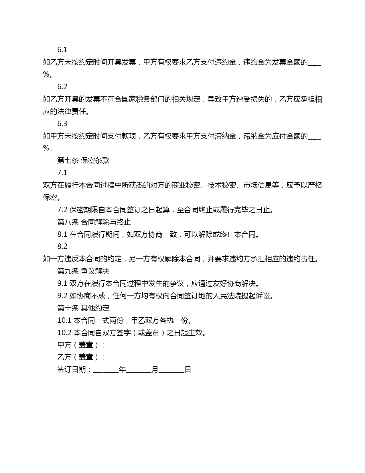 简单的开票合同范本甲方(付款方):________乙方(收款方):________合同编号:________鉴于甲乙双方因业务往来需要,甲方委托乙方开具发票,为确保双方的权益,经甲乙双方友好协商,特订立本合同,以便共同遵守。第一条合同主体1.1甲方为具有独立法人资格的合法企业,具备开具发票的资格和条件。1.2乙方为具有合法经营资格的企业,具备开具发票的资格和条件。第二条开票项目2.1乙方根据甲方提供的开票信息,为甲方开具如下发票:项目名称:________项目金额:人民币(大写):________元整(小写):________元发票类型:________税率:________2.2乙方开具的发票必须真实、合法、有效,符合国家税务部门的相关规定。第三条开票时间3.1乙方应在合同签订后____个工作日内,按照甲方要求开具发票。3.2如甲方有特殊要求,乙方应在接到甲方通知后____个工作日内开具发票。第四条发票交付及验收4.1乙方开具的发票应通过快递或现场交付给甲方。4.2甲方收到发票后,应在____个工作日内进行验收,确认发票的真实性、合法性。4.3如甲方对发票有异议,应在验收期内提出,乙方应在____个工作日内进行核实并重新开具。第五条付款方式5.1甲方应在收到乙方开具的发票后____个工作日内,按照合同约定的金额支付给乙方。5.2付款方式为:现金、转账、、等(具体付款方式双方协商确定)。第六条违约责任6.1如乙方未按约定时间开具发票,甲方有权要求乙方支付违约金,违约金为发票金额的____%。6.2如乙方开具的发票不符合国家税务部门的相关规定,导致甲方遭受损失的,乙方应承担相应的法律责任。6.3如甲方未按约定时间支付款项,乙方有权要求甲方支付滞纳金,滞纳金为应付金额的____%。第七条保密条款7.1双方在履行本合同过程中所获悉的对方的商业秘密、技术秘密、市场信息等,应予以严格保密。7.2保密期限自本合同签订之日起算,至合同终止或履行完毕之日止。第八条合同解除与终止8.1在合同履行期间,如双方协商一致,可以解除或终止本合同。8.2如一方违反本合同的约定,另一方有权解除本合同,并要求违约方承担相应的违约责任。第九条争议解决9.1双方在履行本合同过程中发生的争议,应通过友好协商解决。9.2如协商不成,任何一方均有权向合同签订地的人民法院提起诉讼。第十条其他约定10.1本合同一式两份,甲乙双方各执一份。10.2本合同自双方签字(或盖章)之日起生效。甲方(盖章):乙方(盖章):签订日期:________年________月________日