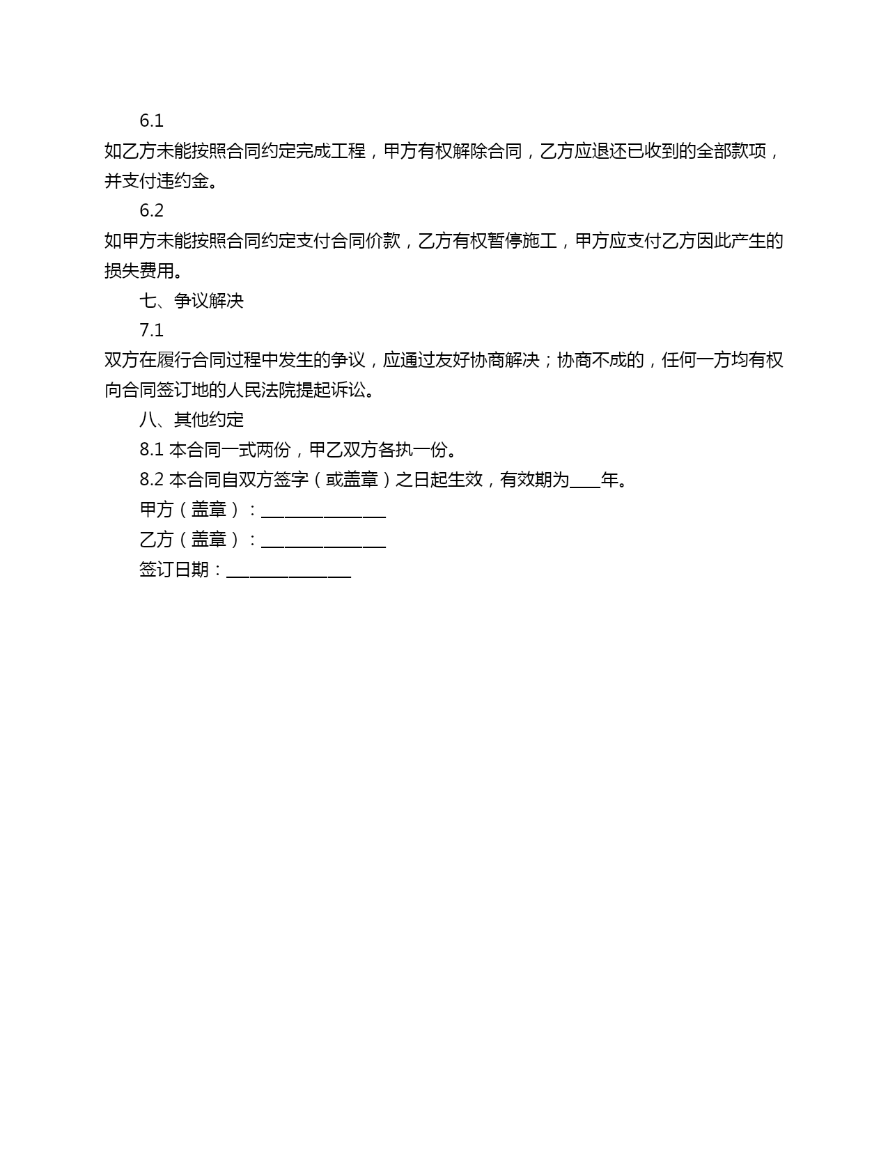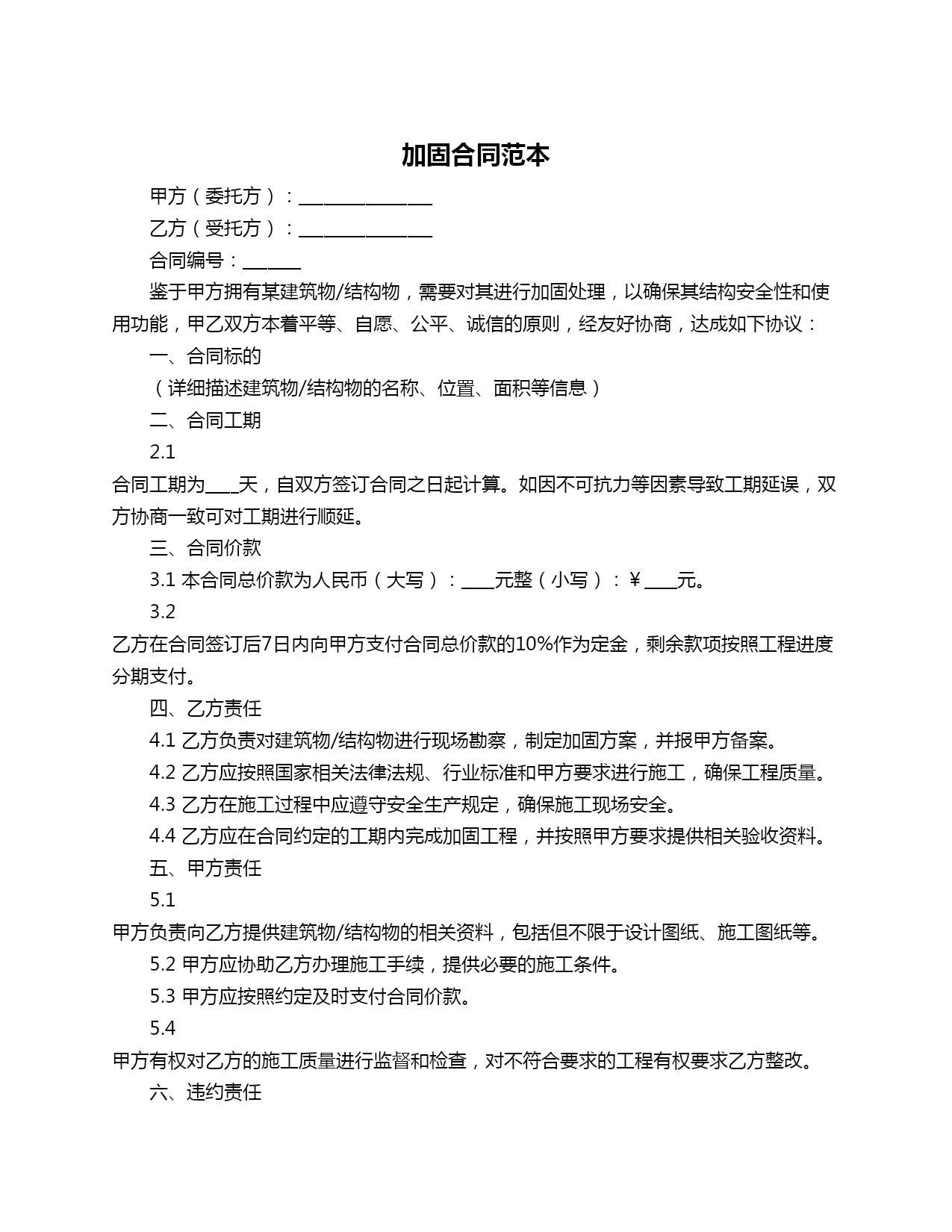 加固合同范本甲方(委托方):________________乙方(受托方):________________合同编号:_______鉴于甲方拥有某建筑物/结构物,需要对其进行加固处理,以确保其结构安全性和使用功能,甲乙双方本着平等、自愿、公平、诚信的原则,经友好协商,达成如下协议:一、合同标的(详细描述建筑物/结构物的名称、位置、面积等信息)二、合同工期2.1合同工期为____天,自双方签订合同之日起计算。如因不可抗力等因素导致工期延误,双方协商一致可对工期进行顺延。三、合同价款3.1本合同总价款为人民币(大写):____元整(小写):¥____元。3.2乙方在合同签订后7日内向甲方支付合同总价款的10%作为定金,剩余款项按照工程进度分期支付。四、乙方责任4.1乙方负责对建筑物/结构物进行现场勘察,制定加固方案,并报甲方备案。4.2乙方应按照国家相关法律法规、行业标准和甲方要求进行施工,确保工程质量。4.3乙方在施工过程中应遵守安全生产规定,确保施工现场安全。4.4乙方应在合同约定的工期内完成加固工程,并按照甲方要求提供相关验收资料。五、甲方责任5.1甲方负责向乙方提供建筑物/结构物的相关资料,包括但不限于设计图纸、施工图纸等。5.2甲方应协助乙方办理施工手续,提供必要的施工条件。5.3甲方应按照约定及时支付合同价款。5.4甲方有权对乙方的施工质量进行监督和检查,对不符合要求的工程有权要求乙方整改。六、违约责任6.1如乙方未能按照合同约定完成工程,甲方有权解除合同,乙方应退还已收到的全部款项,并支付违约金。6.2如甲方未能按照合同约定支付合同价款,乙方有权暂停施工,甲方应支付乙方因此产生的损失费用。七、争议解决7.1双方在履行合同过程中发生的争议,应通过友好协商解决;协商不成的,任何一方均有权向合同签订地的人民法院提起诉讼。八、其他约定8.1本合同一式两份,甲乙双方各执一份。8.2本合同自双方签字(或盖章)之日起生效,有效期为____年。甲方(盖章):________________乙方(盖章):________________签订日期:________________