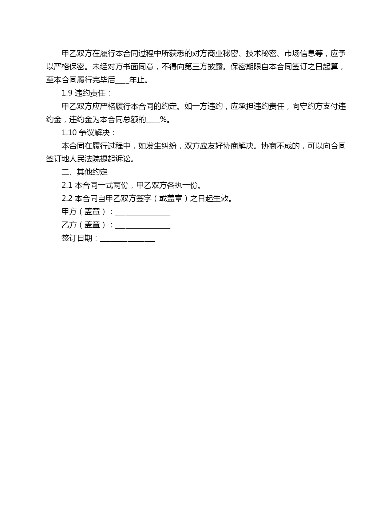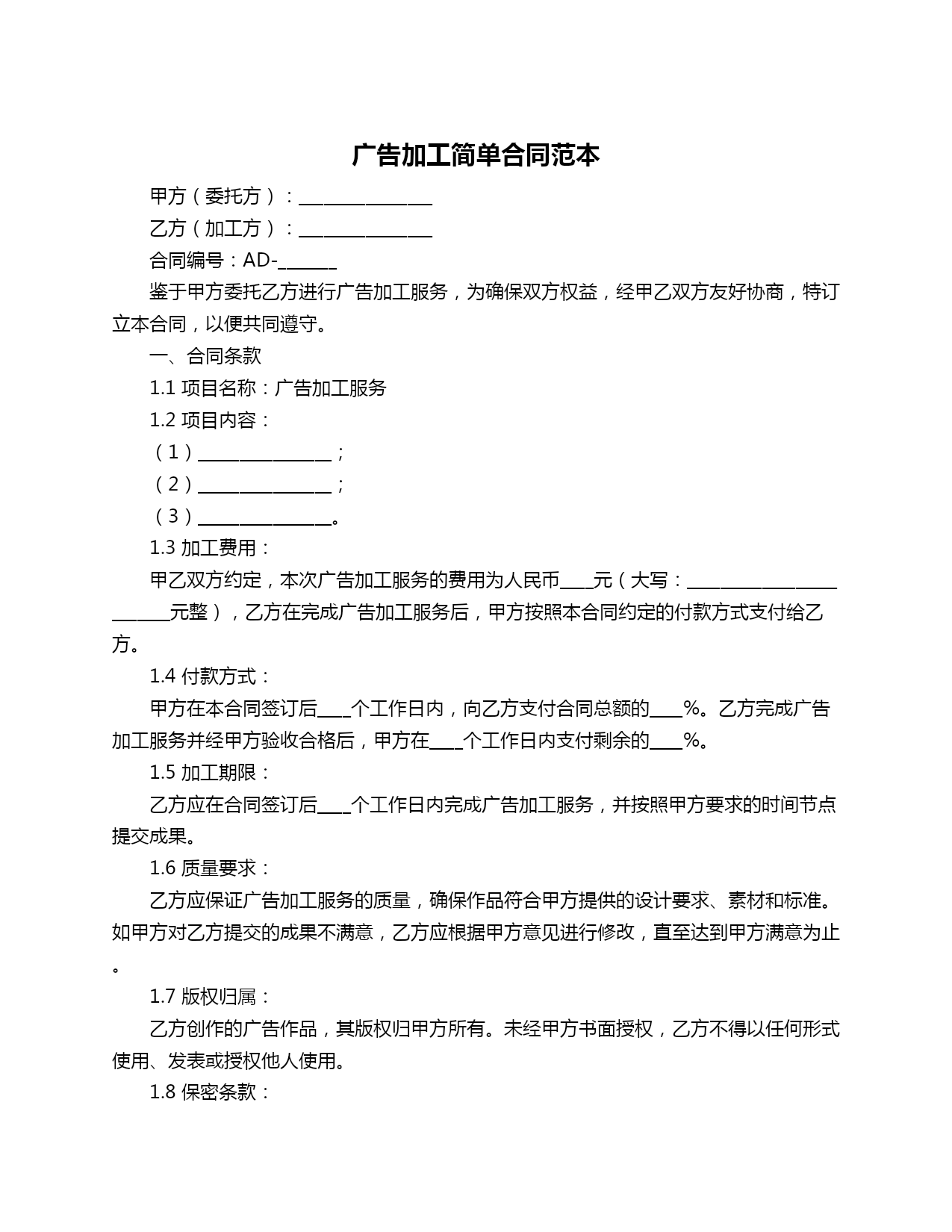 广告加工简单合同范本甲方(委托方):________________乙方(加工方):________________合同编号:AD-_______鉴于甲方委托乙方进行广告加工服务,为确保双方权益,经甲乙双方友好协商,特订立本合同,以便共同遵守。一、合同条款1.1项目名称:广告加工服务1.2项目内容:(1)________________;(2)________________;(3)________________。1.3加工费用:甲乙双方约定,本次广告加工服务的费用为人民币____元(大写:_________________________元整),乙方在完成广告加工服务后,甲方按照本合同约定的付款方式支付给乙方。1.4付款方式:甲方在本合同签订后____个工作日内,向乙方支付合同总额的____%。乙方完成广告加工服务并经甲方验收合格后,甲方在____个工作日内支付剩余的____%。1.5加工期限:乙方应在合同签订后____个工作日内完成广告加工服务,并按照甲方要求的时间节点提交成果。1.6质量要求:乙方应保证广告加工服务的质量,确保作品符合甲方提供的设计要求、素材和标准。如甲方对乙方提交的成果不满意,乙方应根据甲方意见进行修改,直至达到甲方满意为止。1.7版权归属:乙方创作的广告作品,其版权归甲方所有。未经甲方书面授权,乙方不得以任何形式使用、发表或授权他人使用。1.8保密条款:甲乙双方在履行本合同过程中所获悉的对方商业秘密、技术秘密、市场信息等,应予以严格保密。未经对方书面同意,不得向第三方披露。保密期限自本合同签订之日起算,至本合同履行完毕后____年止。1.9违约责任:甲乙双方应严格履行本合同的约定。如一方违约,应承担违约责任,向守约方支付违约金,违约金为本合同总额的____%。1.10争议解决:本合同在履行过程中,如发生纠纷,双方应友好协商解决。协商不成的,可以向合同签订地人民法院提起诉讼。二、其他约定2.1本合同一式两份,甲乙双方各执一份。2.2本合同自甲乙双方签字(或盖章)之日起生效。甲方(盖章):________________乙方(盖章):________________签订日期:________________