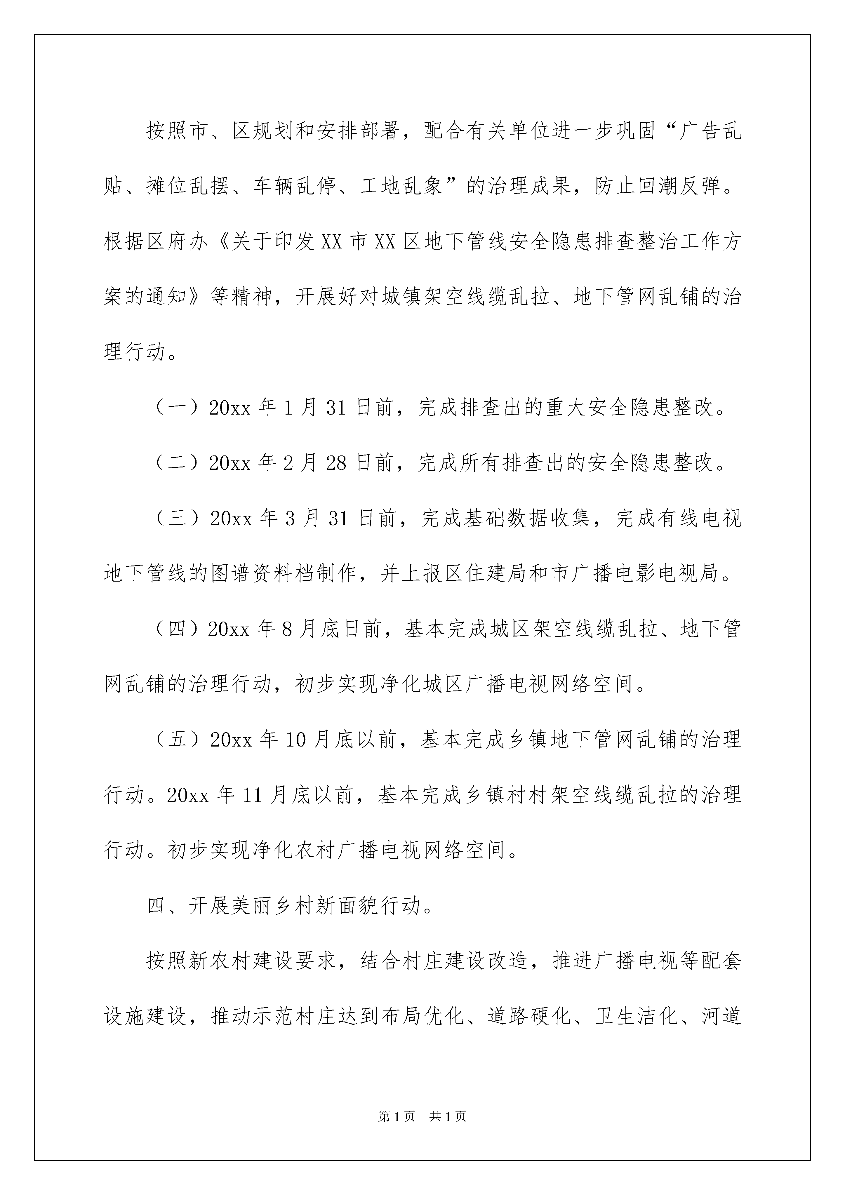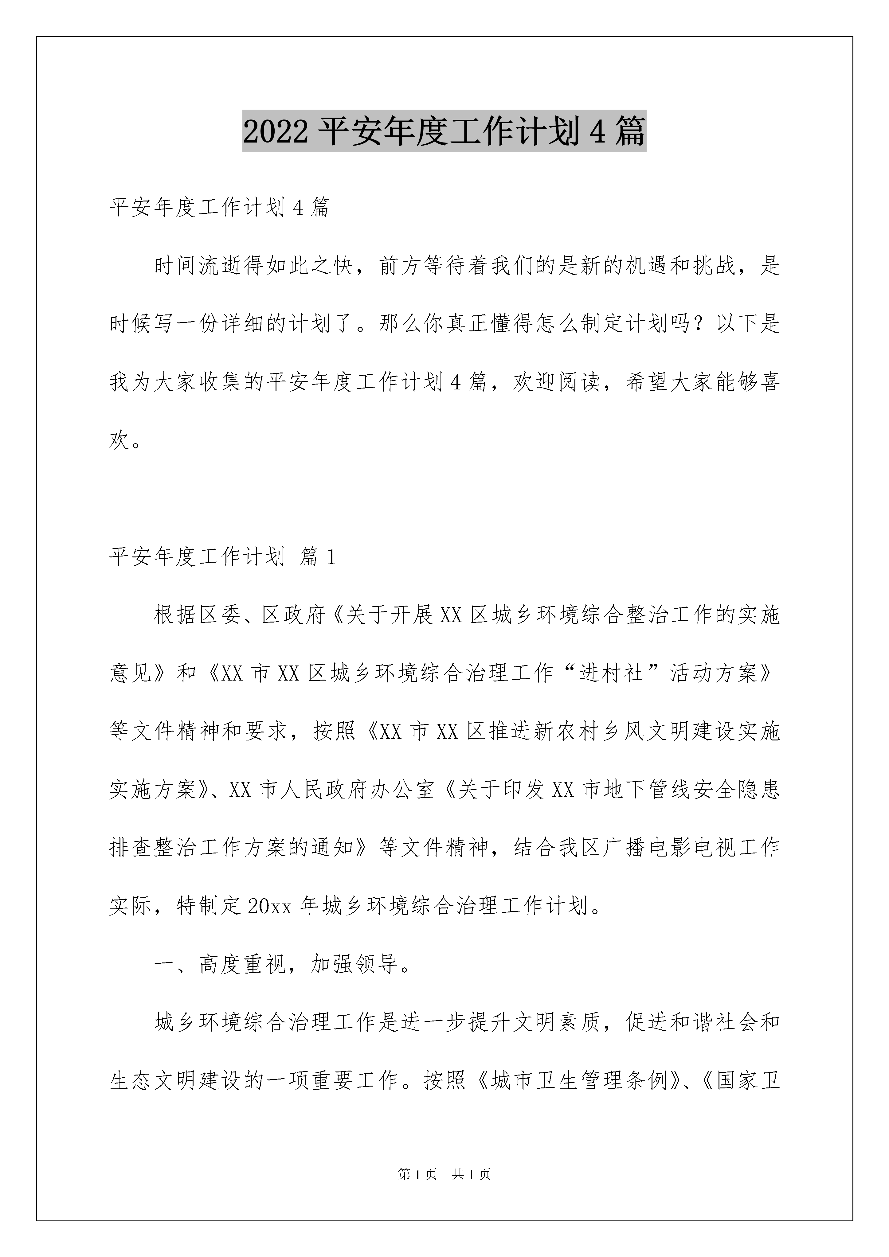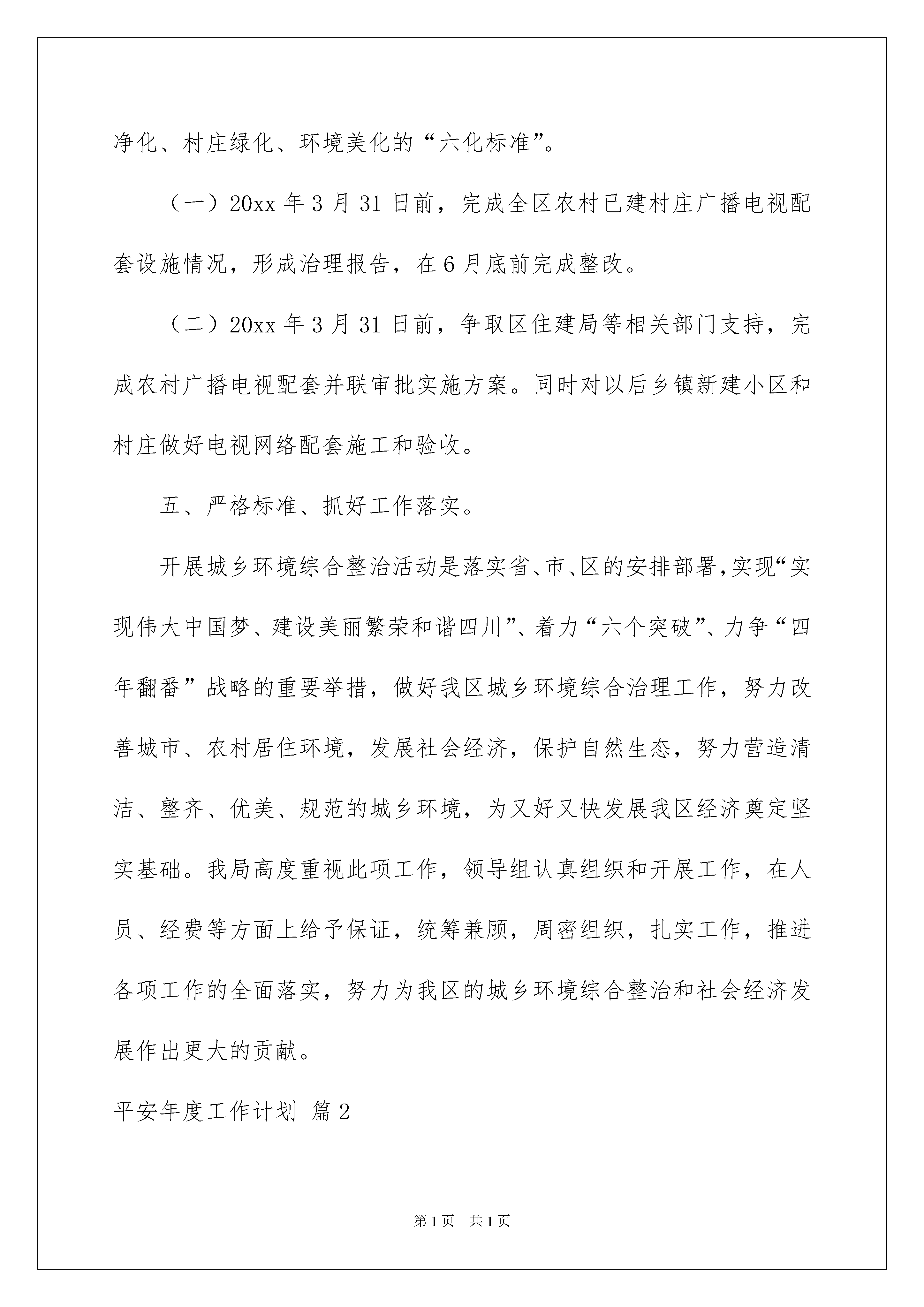 2022平安年度工作计划4篇平安年度工作计划4篇时间流逝得如此之快,前方等待着我们的是新的机遇和挑战,是时候写一份详细的计划了。那么你真正懂得怎么制定计划吗?以下是我为大家收集的平安年度工作计划4篇,欢迎阅读,希望大家能够喜欢。平安年度工作计划篇1根据区委、区政府《关于开展XX区城乡环境综合整治工作的实施意见》和《XX市XX区城乡环境综合治理工作“进村社”活动方案》等文件精神和要求,按照《XX市XX区推进新农村乡风文明建设实施实施方案》、XX市人民政府办公室《关于印发XX市地下管线安全隐患排查整治工作方案的通知》等文件精神,结合我区广播电影电视工作实际,特制定20xx年城乡环境综合治理工作计划。一、高度重视,加强领导。城乡环境综合治理工作是进一步提升文明素质,促进和谐社会和生态文明建设的一项重要工作。按照《城市卫生管理条例》、《国家卫生城市标准》、《关于全面开展城乡环境综合治理的决定》等相关要求,“开展爱国卫生运动,提高全民族的卫生素质”。“城乡环境综合整治,保护群众身体健康”。成立以局长为组长的局爱国卫生领导小组要充分发挥其职能作用,做到领导重视,分工明确,工作落实,加强督促检查,认真组织和开展好我局的爱国城乡环境整治工作。二、加强教育,提高卫生文明素质。一是局要利用职工大会、职工学习等时机,加强《城市卫生管理条例》、《关于全面开展城乡环境综合治理的决定》等法规知识的学习。二是要以爱国卫生月等活动为契机,通过印发资料、黑板报等各种形式对职工进行卫生、健康教育,进一步树立干部职工卫生观念,增强卫生意识,提高全局干部职工卫生知识和自我保健能力。三是区、乡镇广播电视站要利用广播电视媒体,广泛开展健康宣传和教育,认真开展好“亿万农民健康教育行动”活动等宣传报道,普及群众的卫生意识,改善人居环境,除害治病,提高人民群众的生活质量和健康水平,认真做好“新农合”、城乡环境整治、爱国卫生等工作的宣传和教育,促进新农村建设和和谐社会建设。三、开展容貌秩序新气象行动。按照市、区规划和安排部署,配合有关单位进一步巩固“广告乱贴、摊位乱摆、车辆乱停、工地乱象”的治理成果,防止回潮反弹。根据区府办《关于印发XX市XX区地下管线安全隐患排查整治工作方案的通知》等精神,开展好对城镇架空线缆乱拉、地下管网乱铺的治理行动。(一)20xx年1月31日前,完成排查出的重大安全隐患整改。(二)20xx年2月28日前,完成所有排查出的安全隐患整改。(三)20xx年3月31日前,完成基础数据收集,完成有线电视地下管线的图谱资料档制作,并上报区住建局和市广播电影电视局。(四)20xx年8月底日前,基本完成城区架空线缆乱拉、地下管网乱铺的治理行动,初步实现净化城区广播电视网络空间。(五)20xx年10月底以前,基本完成乡镇地下管网乱铺的治理行动。20xx年11月底以前,基本完成乡镇村村架空线缆乱拉的治理行动。初步实现净化农村广播电视网络空间。四、开展美丽乡村新面貌行动。按照新农村建设要求,结合村庄建设改造,推进广播电视等配套设施建设,推动示范村庄达到布局优化、道路硬化、卫生洁化、河道净化、村庄绿化、环境美化的“六化标准”。(一)20xx年3月31日前,完成全区农村已建村庄广播电视配套设施情况,形成治理报告,在6月底前完成整改。(二)20xx年3月31日前,争取区住建局等相关部门支持,完成农村广播电视配套并联审批实施方案。同时对以后乡镇新建小区和村庄做好电视网络配套施工和验收。五、严格标准、抓好工作落实。开展城乡环境综合整治活动是落实省、市、区的安排部署,实现“实现伟大中国梦、建设美丽繁荣和谐四川”、着力“六个突破”、力争“四年翻番”战略的重要举措,做好我区城乡环境综合治理工作,努力改善城市、农村居住环境,发展社会经济,保护自然生态,努力营造清洁、整齐、优美、规范的城乡环境,为又好又快发展我区经济奠定坚实基础。我局高度重视此项工作,领导组认真组织和开展工作,在人员、经费等方面上给予保证,统筹兼顾,周密组织,扎实工作,推进各项工作的全面落实,努力为我区的城乡环境综合整治和社会经济发展作出更大的贡献。平安年度工作计划篇2按照街道办事处综治委创建平安社区的统一布署,环城社区将充分发挥社区居委会的积极能动性,广泛动员居民群众,防范和打击各种违法犯罪活动,推进依法治区,维护社会公平正义,建立“创平安、保稳定、促发展”的长效工作机制,创建和谐社会,把“平安社区”创建活动转化为提升环城社区形象的`品牌优势,现将今年的创建平安社区工作计划如下:一、建立健全长效工作机制,成立以社区居委会主任为组长的创建“平安社区”工作小组,广泛动员广大
