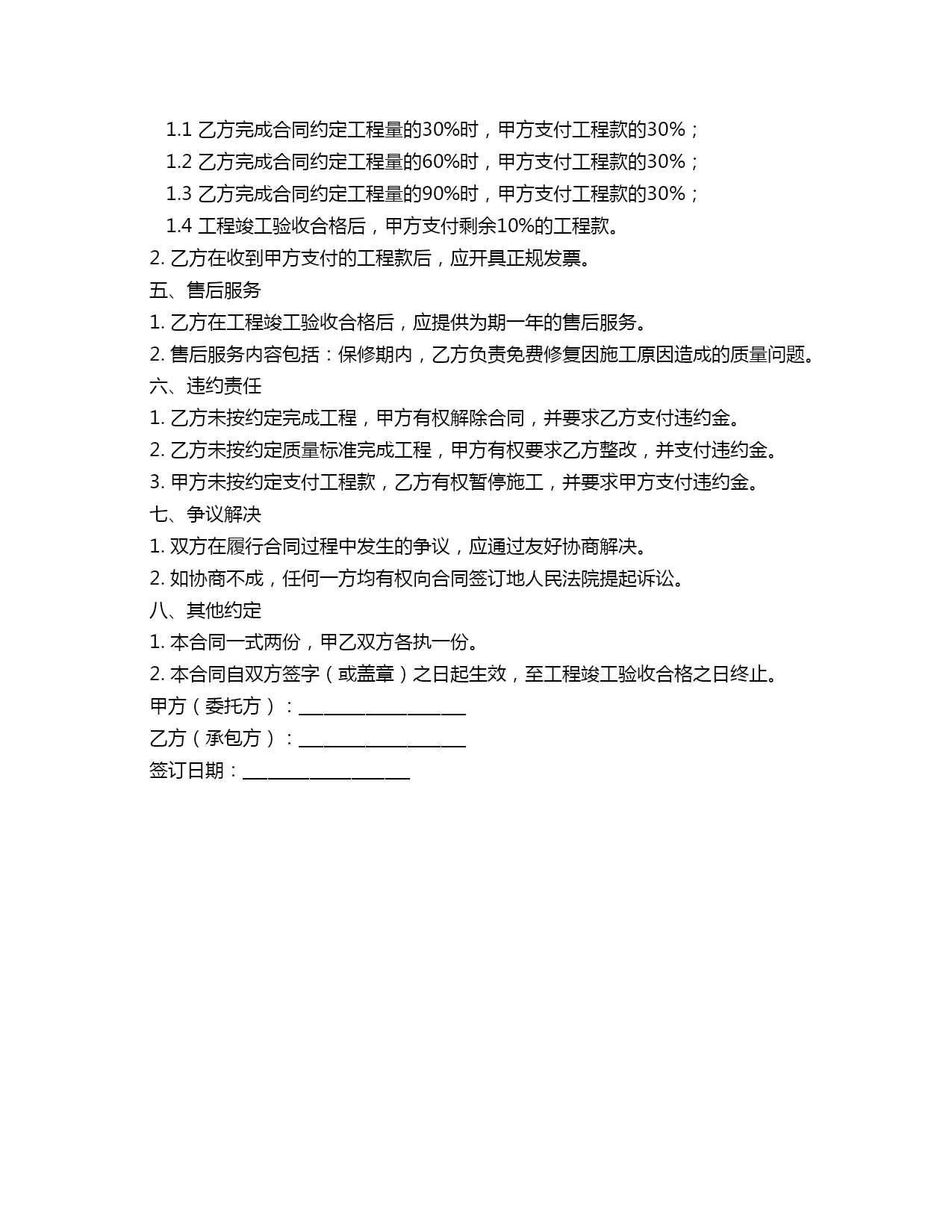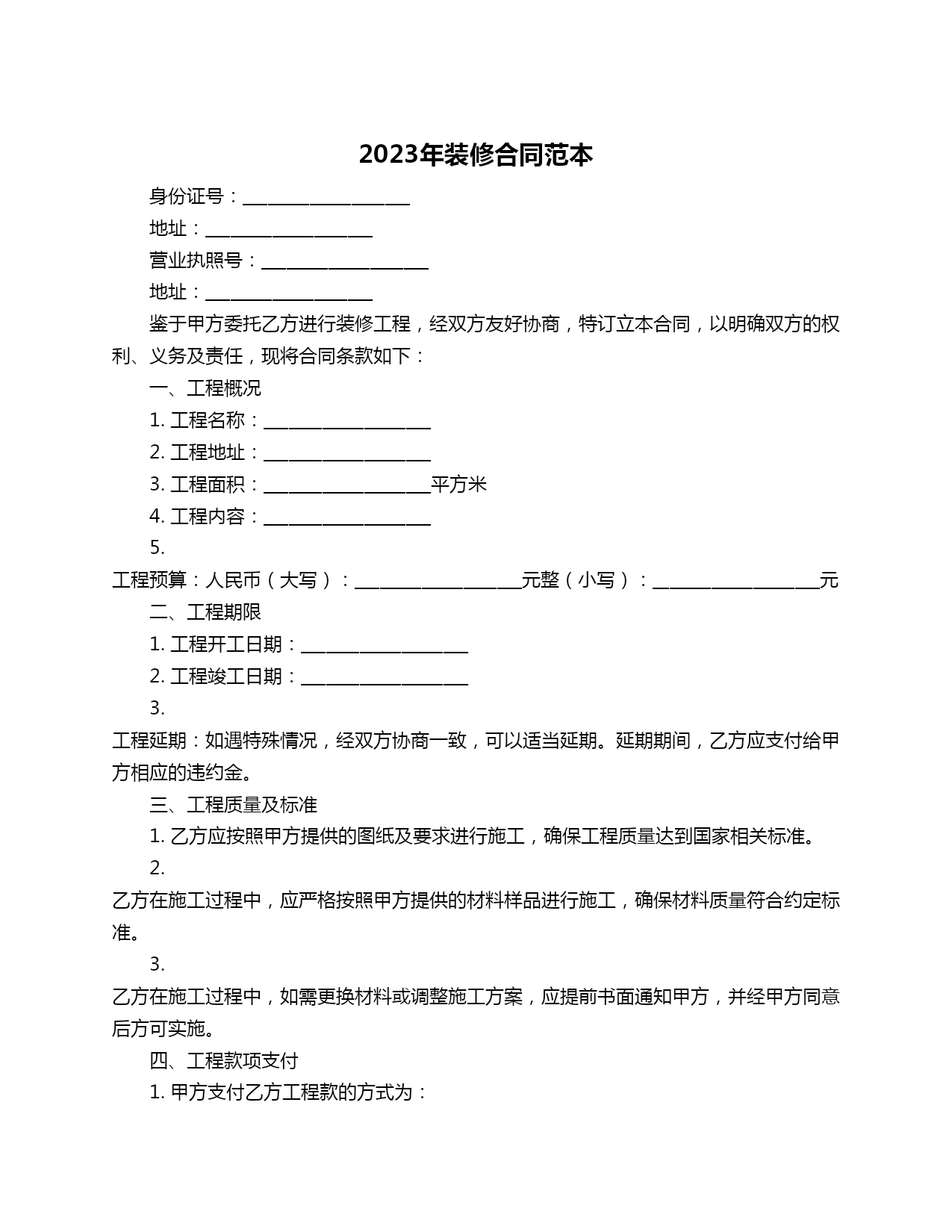 2023年装修合同范本身份证号:____________________地址:____________________营业执照号:____________________地址:____________________鉴于甲方委托乙方进行装修工程,经双方友好协商,特订立本合同,以明确双方的权利、义务及责任,现将合同条款如下:一、工程概况1.工程名称:____________________2.工程地址:____________________3.工程面积:____________________平方米4.工程内容:____________________5.工程预算:人民币(大写):____________________元整(小写):____________________元二、工程期限1.工程开工日期:____________________2.工程竣工日期:____________________3.工程延期:如遇特殊情况,经双方协商一致,可以适当延期。延期期间,乙方应支付给甲方相应的违约金。三、工程质量及标准1.乙方应按照甲方提供的图纸及要求进行施工,确保工程质量达到国家相关标准。2.乙方在施工过程中,应严格按照甲方提供的材料样品进行施工,确保材料质量符合约定标准。3.乙方在施工过程中,如需更换材料或调整施工方案,应提前书面通知甲方,并经甲方同意后方可实施。四、工程款项支付1.甲方支付乙方工程款的方式为:1.1乙方完成合同约定工程量的30%时,甲方支付工程款的30%;1.2乙方完成合同约定工程量的60%时,甲方支付工程款的30%;1.3乙方完成合同约定工程量的90%时,甲方支付工程款的30%;1.4工程竣工验收合格后,甲方支付剩余10%的工程款。2.乙方在收到甲方支付的工程款后,应开具正规发票。五、售后服务1.乙方在工程竣工验收合格后,应提供为期一年的售后服务。2.售后服务内容包括:保修期内,乙方负责免费修复因施工原因造成的质量问题。六、违约责任1.乙方未按约定完成工程,甲方有权解除合同,并要求乙方支付违约金。2.乙方未按约定质量标准完成工程,甲方有权要求乙方整改,并支付违约金。3.甲方未按约定支付工程款,乙方有权暂停施工,并要求甲方支付违约金。七、争议解决1.双方在履行合同过程中发生的争议,应通过友好协商解决。2.如协商不成,任何一方均有权向合同签订地人民法院提起诉讼。八、其他约定1.本合同一式两份,甲乙双方各执一份。2.本合同自双方签字(或盖章)之日起生效,至工程竣工验收合格之日终止。甲方(委托方):____________________乙方(承包方):____________________签订日期:____________________