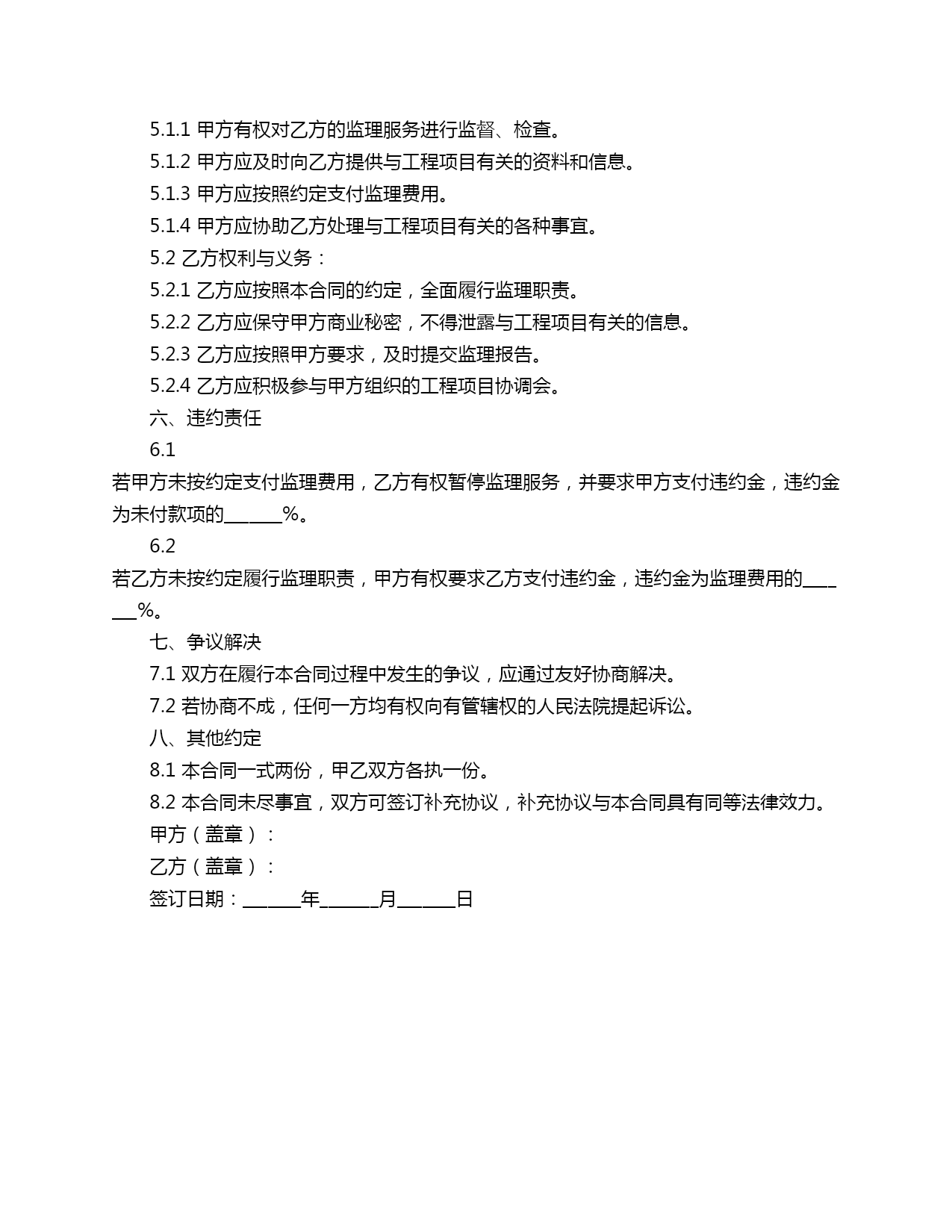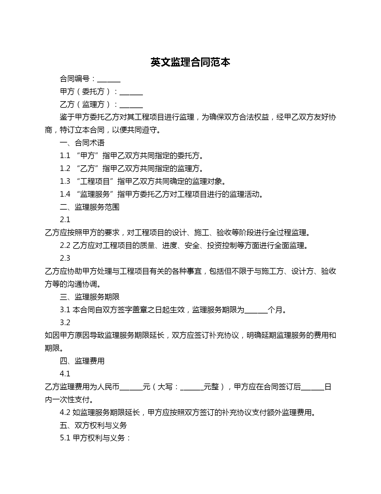 英文监理合同范本合同编号:_______甲方(委托方):_______乙方(监理方):_______鉴于甲方委托乙方对其工程项目进行监理,为确保双方合法权益,经甲乙双方友好协商,特订立本合同,以便共同遵守。一、合同术语1.1“甲方”指甲乙双方共同指定的委托方。1.2“乙方”指甲乙双方共同指定的监理方。1.3“工程项目”指甲乙双方共同确定的监理对象。1.4“监理服务”指甲方委托乙方对工程项目进行的监理活动。二、监理服务范围2.1乙方应按照甲方的要求,对工程项目的设计、施工、验收等阶段进行全过程监理。2.2乙方应对工程项目的质量、进度、安全、投资控制等方面进行全面监理。2.3乙方应协助甲方处理与工程项目有关的各种事宜,包括但不限于与施工方、设计方、验收方等的沟通协调。三、监理服务期限3.1本合同自双方签字盖章之日起生效,监理服务期限为_______个月。3.2如因甲方原因导致监理服务期限延长,双方应签订补充协议,明确延期监理服务的费用和期限。四、监理费用4.1乙方监理费用为人民币_______元(大写:_______元整),甲方应在合同签订后_______日内一次性支付。4.2如监理服务期限延长,甲方应按照双方签订的补充协议支付额外监理费用。五、双方权利与义务5.1甲方权利与义务:5.1.1甲方有权对乙方的监理服务进行监督、检查。5.1.2甲方应及时向乙方提供与工程项目有关的资料和信息。5.1.3甲方应按照约定支付监理费用。5.1.4甲方应协助乙方处理与工程项目有关的各种事宜。5.2乙方权利与义务:5.2.1乙方应按照本合同的约定,全面履行监理职责。5.2.2乙方应保守甲方商业秘密,不得泄露与工程项目有关的信息。5.2.3乙方应按照甲方要求,及时提交监理报告。5.2.4乙方应积极参与甲方组织的工程项目协调会。六、违约责任6.1若甲方未按约定支付监理费用,乙方有权暂停监理服务,并要求甲方支付违约金,违约金为未付款项的_______%。6.2若乙方未按约定履行监理职责,甲方有权要求乙方支付违约金,违约金为监理费用的_______%。七、争议解决7.1双方在履行本合同过程中发生的争议,应通过友好协商解决。7.2若协商不成,任何一方均有权向有管辖权的人民法院提起诉讼。八、其他约定8.1本合同一式两份,甲乙双方各执一份。8.2本合同未尽事宜,双方可签订补充协议,补充协议与本合同具有同等法律效力。甲方(盖章):乙方(盖章):签订日期:_______年_______月_______日
