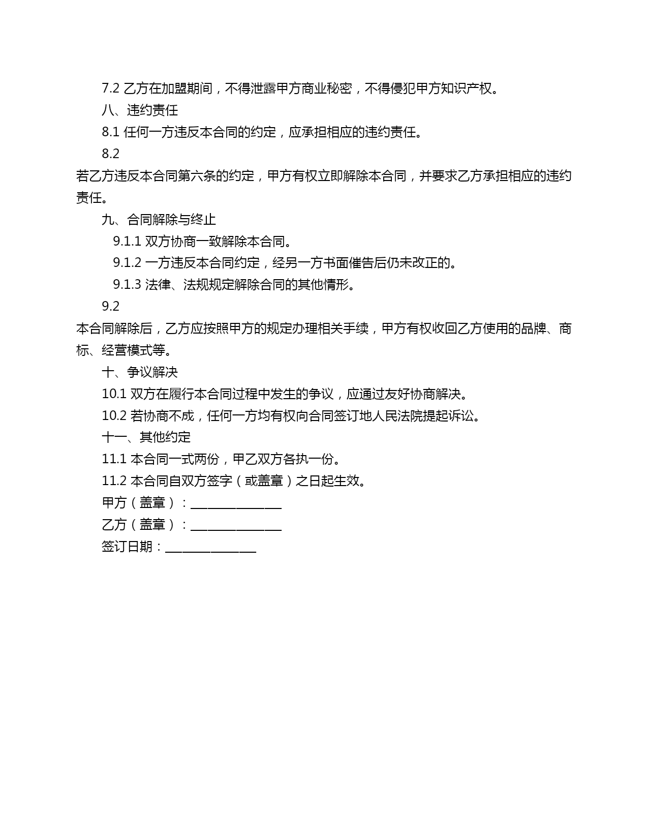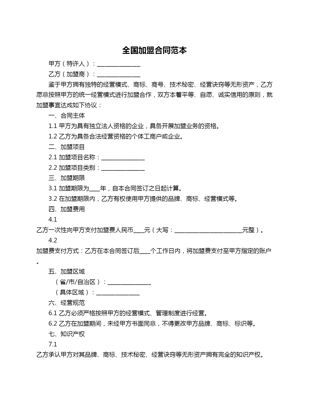 全国加盟合同范本甲方(特许人):________________乙方(加盟商):________________鉴于甲方拥有独特的经营模式、商标、商号、技术秘密、经营诀窍等无形资产,乙方愿意按照甲方的统一经营模式进行加盟合作,双方本着平等、自愿、诚实信用的原则,就加盟事宜达成如下协议:一、合同主体1.1甲方为具有独立法人资格的企业,具备开展加盟业务的资格。1.2乙方为具备合法经营资格的个体工商户或企业。二、加盟项目2.1加盟项目名称:________________2.2加盟项目类别:________________三、加盟期限3.1加盟期限为____年,自本合同签订之日起计算。3.2在加盟期限内,乙方有权使用甲方提供的品牌、商标、经营模式等。四、加盟费用4.1乙方一次性向甲方支付加盟费人民币____元(大写:_________________________元整)。4.2加盟费支付方式:乙方在本合同签订后____个工作日内,将加盟费支付至甲方指定的账户。五、加盟区域(省/市/自治区):________________(具体区域):________________六、经营规范6.1乙方必须严格按照甲方的经营模式、管理制度进行经营。6.2乙方在加盟期间,未经甲方书面同意,不得更改甲方品牌、商标、标识等。七、知识产权7.1乙方承认甲方对其品牌、商标、技术秘密、经营诀窍等无形资产拥有完全的知识产权。7.2乙方在加盟期间,不得泄露甲方商业秘密,不得侵犯甲方知识产权。八、违约责任8.1任何一方违反本合同的约定,应承担相应的违约责任。8.2若乙方违反本合同第六条的约定,甲方有权立即解除本合同,并要求乙方承担相应的违约责任。九、合同解除与终止9.1.1双方协商一致解除本合同。9.1.2一方违反本合同约定,经另一方书面催告后仍未改正的。9.1.3法律、法规规定解除合同的其他情形。9.2本合同解除后,乙方应按照甲方的规定办理相关手续,甲方有权收回乙方使用的品牌、商标、经营模式等。十、争议解决10.1双方在履行本合同过程中发生的争议,应通过友好协商解决。10.2若协商不成,任何一方均有权向合同签订地人民法院提起诉讼。十一、其他约定11.1本合同一式两份,甲乙双方各执一份。11.2本合同自双方签字(或盖章)之日起生效。甲方(盖章):________________乙方(盖章):________________签订日期:________________