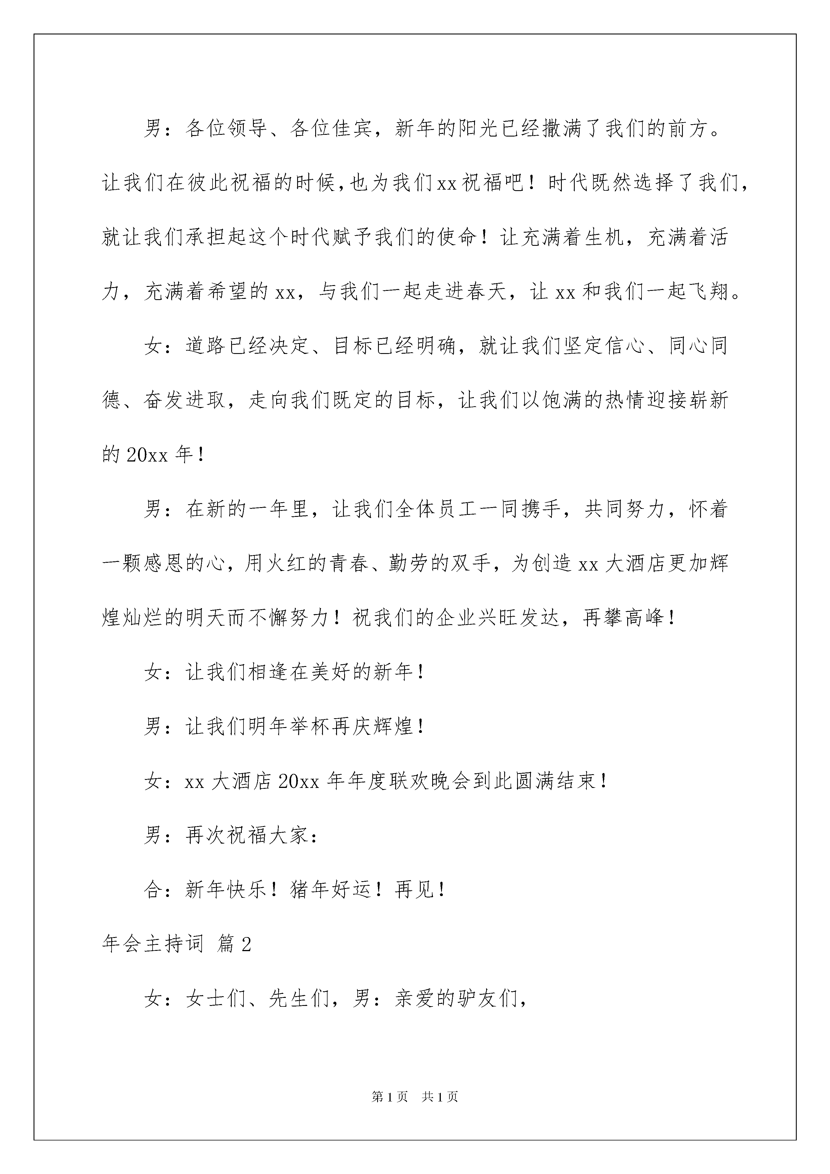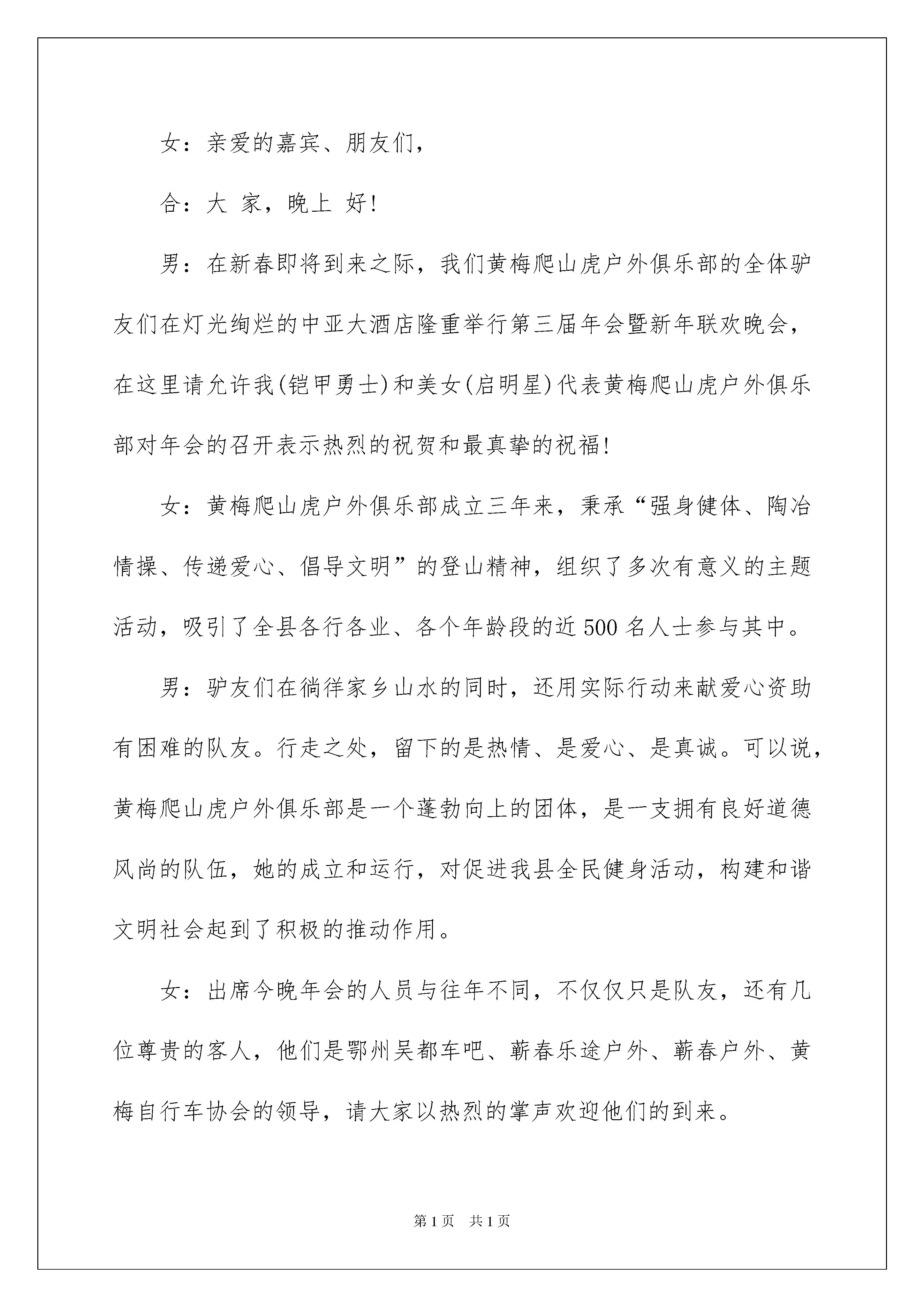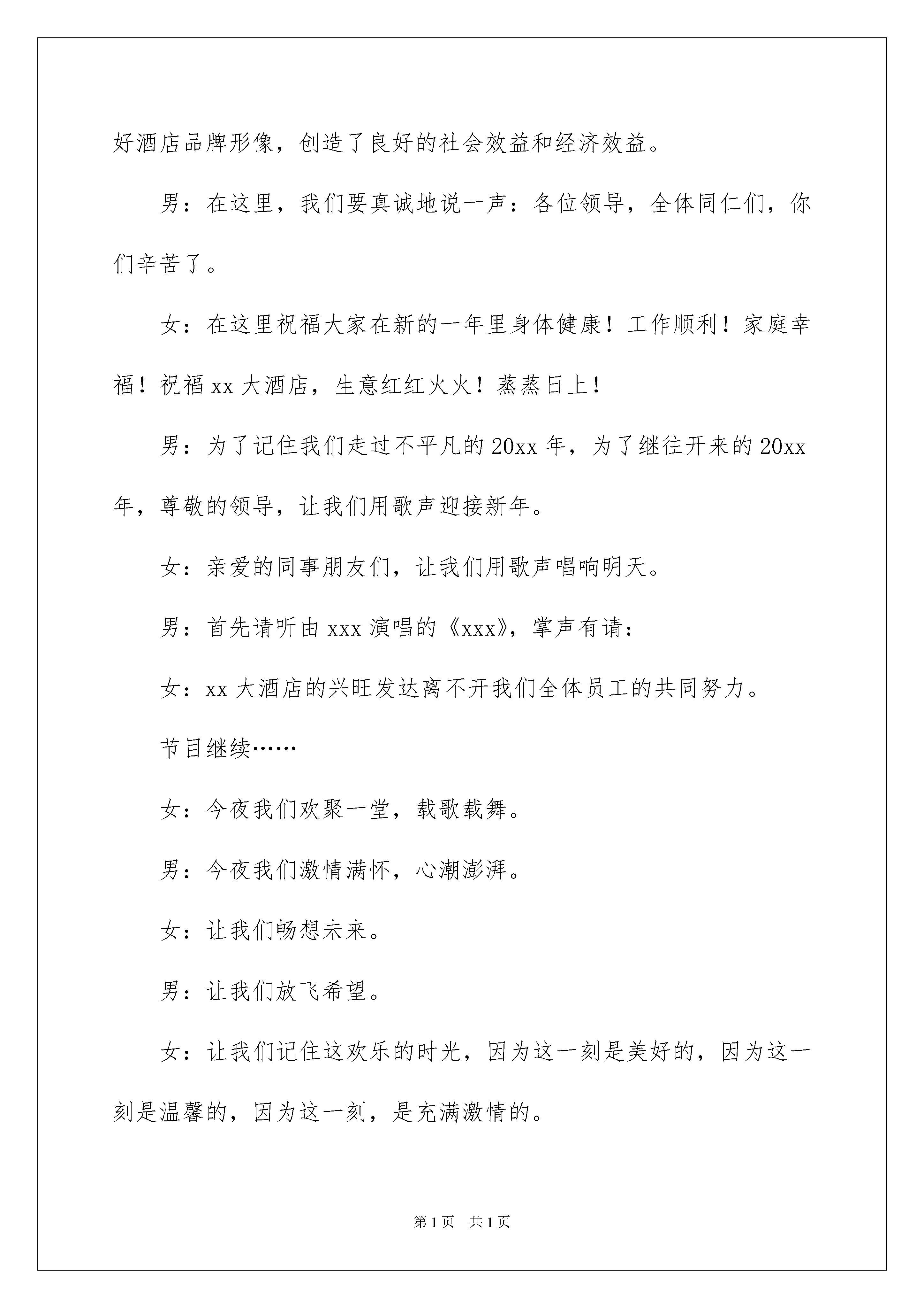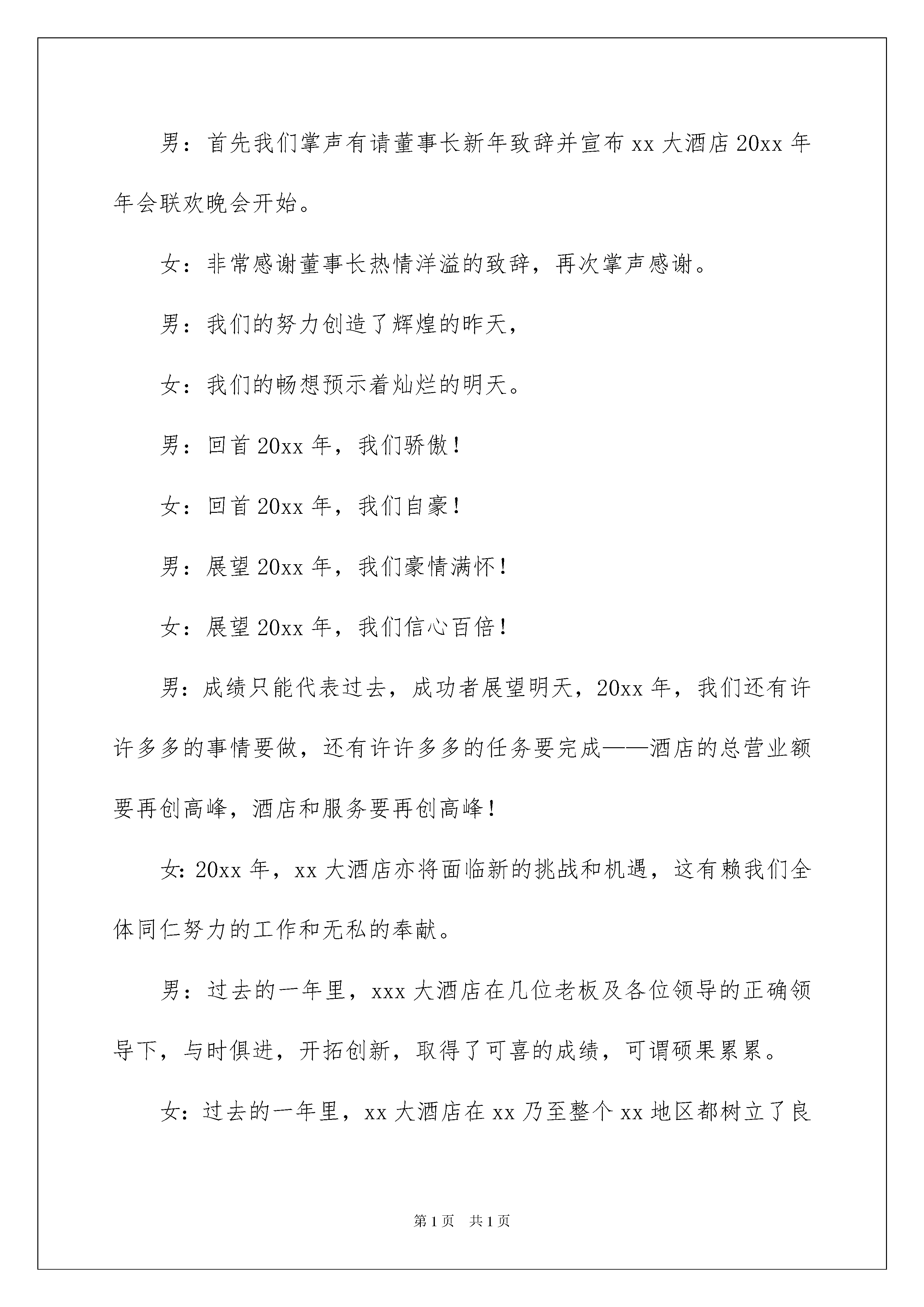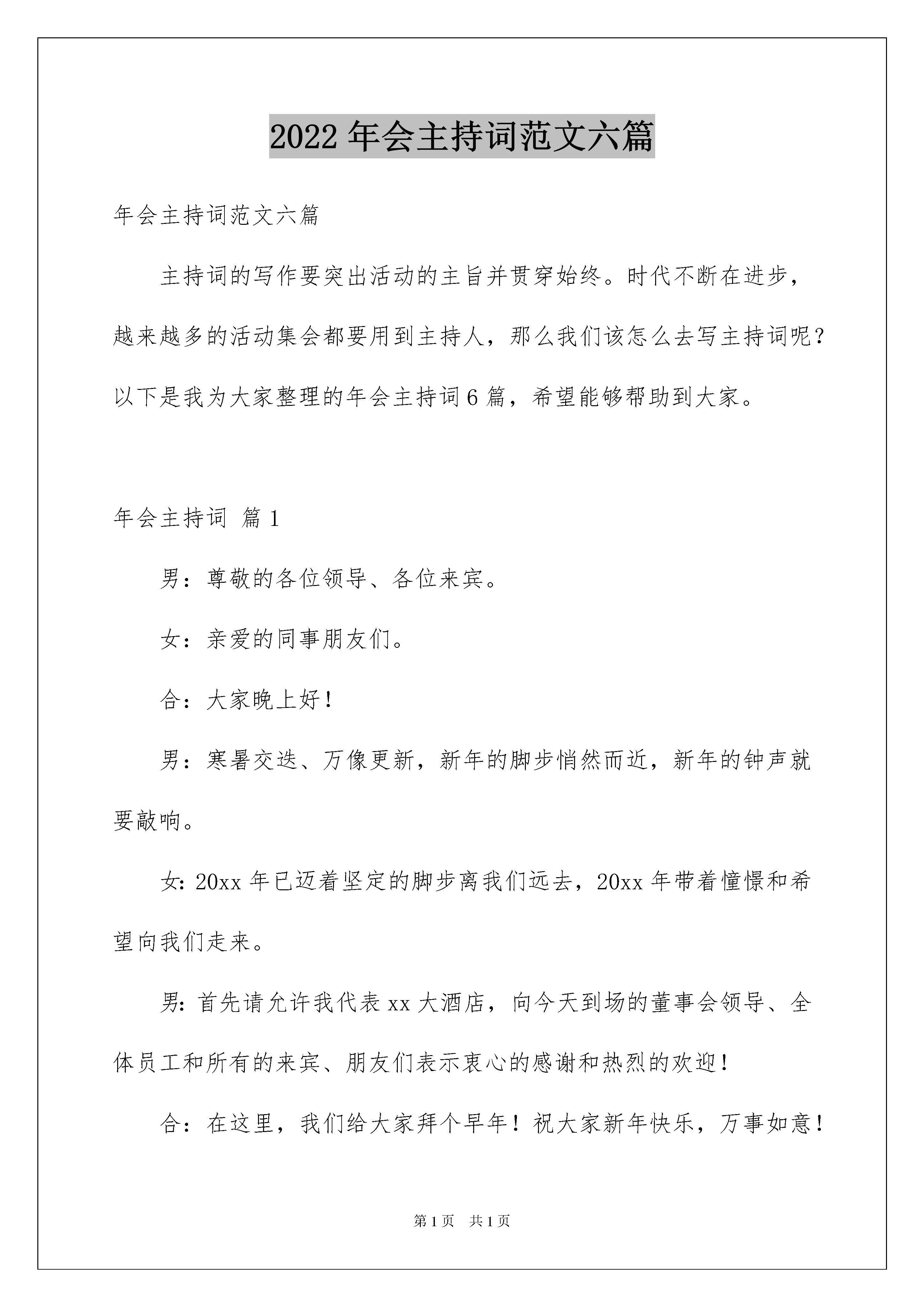2022年会主持词范文六篇年会主持词范文六篇主持词的写作要突出活动的主旨并贯穿始终。时代不断在进步,越来越多的活动集会都要用到主持人,那么我们该怎么去写主持词呢?以下是我为大家整理的年会主持词6篇,希望能够帮助到大家。年会主持词篇1男:尊敬的各位领导、各位来宾。女:亲爱的同事朋友们。合:大家晚上好!男:寒暑交迭、万像更新,新年的脚步悄然而近,新年的钟声就要敲响。女:20xx年已迈着坚定的脚步离我们远去,20xx年带着憧憬和希望向我们走来。男:首先请允许我代表xx大酒店,向今天到场的董事会领导、全体员工和所有的来宾、朋友们表示衷心的感谢和热烈的欢迎!合:在这里,我们给大家拜个早年!祝大家新年快乐,万事如意!男:首先我们掌声有请董事长新年致辞并宣布xx大酒店20xx年年会联欢晚会开始。女:非常感谢董事长热情洋溢的致辞,再次掌声感谢。男:我们的努力创造了辉煌的昨天,女:我们的畅想预示着灿烂的明天。男:回首20xx年,我们骄傲!女:回首20xx年,我们自豪!男:展望20xx年,我们豪情满怀!女:展望20xx年,我们信心百倍!男:成绩只能代表过去,成功者展望明天,20xx年,我们还有许许多多的事情要做,还有许许多多的任务要完成——酒店的总营业额要再创高峰,酒店和服务要再创高峰!女:20xx年,xx大酒店亦将面临新的挑战和机遇,这有赖我们全体同仁努力的工作和无私的奉献。男:过去的一年里,xxx大酒店在几位老板及各位领导的正确领导下,与时俱进,开拓创新,取得了可喜的成绩,可谓硕果累累。女:过去的一年里,xx大酒店在xx乃至整个xx地区都树立了良好酒店品牌形像,创造了良好的社会效益和经济效益。男:在这里,我们要真诚地说一声:各位领导,全体同仁们,你们辛苦了。女:在这里祝福大家在新的一年里身体健康!工作顺利!家庭幸福!祝福xx大酒店,生意红红火火!蒸蒸日上!男:为了记住我们走过不平凡的20xx年,为了继往开来的20xx年,尊敬的领导,让我们用歌声迎接新年。女:亲爱的同事朋友们,让我们用歌声唱响明天。男:首先请听由xxx演唱的《xxx》,掌声有请:女:xx大酒店的兴旺发达离不开我们全体员工的共同努力。节目继续……女:今夜我们欢聚一堂,载歌载舞。男:今夜我们激情满怀,心潮澎湃。女:让我们畅想未来。男:让我们放飞希望。女:让我们记住这欢乐的时光,因为这一刻是美好的,因为这一刻是温馨的,因为这一刻,是充满激情的。男:各位领导、各位佳宾,新年的阳光已经撒满了我们的前方。让我们在彼此祝福的时候,也为我们xx祝福吧!时代既然选择了我们,就让我们承担起这个时代赋予我们的使命!让充满着生机,充满着活力,充满着希望的xx,与我们一起走进春天,让xx和我们一起飞翔。女:道路已经决定、目标已经明确,就让我们坚定信心、同心同德、奋发进取,走向我们既定的目标,让我们以饱满的热情迎接崭新的20xx年!男:在新的一年里,让我们全体员工一同携手,共同努力,怀着一颗感恩的心,用火红的青春、勤劳的双手,为创造xx大酒店更加辉煌灿烂的明天而不懈努力!祝我们的企业兴旺发达,再攀高峰!女:让我们相逢在美好的新年!男:让我们明年举杯再庆辉煌!女:xx大酒店20xx年年度联欢晚会到此圆满结束!男:再次祝福大家:合:新年快乐!猪年好运!再见!年会主持词篇2女:女士们、先生们,男:亲爱的驴友们,女:亲爱的嘉宾、朋友们,合:大家,晚上好!男:在新春即将到来之际,我们黄梅爬山虎户外俱乐部的全体驴友们在灯光绚烂的中亚大酒店隆重举行第三届年会暨新年联欢晚会,在这里请允许我(铠甲勇士)和美女(启明星)代表黄梅爬山虎户外俱乐部对年会的召开表示热烈的祝贺和最真挚的祝福!女:黄梅爬山虎户外俱乐部成立三年来,秉承“强身健体、陶冶情操、传递爱心、倡导文明”的登山精神,组织了多次有意义的主题活动,吸引了全县各行各业、各个年龄段的近500名人士参与其中。男:驴友们在徜徉家乡山水的同时,还用实际行动来献爱心资助有困难的队友。行走之处,留下的是热情、是爱心、是真诚。可以说,黄梅爬山虎户外俱乐部是一个蓬勃向上的团体,是一支拥有良好道德风尚的队伍,她的成立和运行,对促进我县全民健身活动,构建和谐文明社会起到了积极的推动作用。女:出席今晚年会的人员与往年不同,不仅仅只是队友,还有几位尊贵的客人,他们是鄂州吴都车吧、蕲春乐途户外、蕲春户外、黄梅自行车协会的领导,请大家以热烈的掌声欢迎他们的到来。男:在过去的一年里,我们登青山,趟碧水,陶醉在大自然。女:在过去的一年里,我们群聊天,网交友,相聚在小天地。男:五祖寺、黄龙潭、白崖寨、庐山,留下了我们爬山虎户外人的足迹。女:多云山、