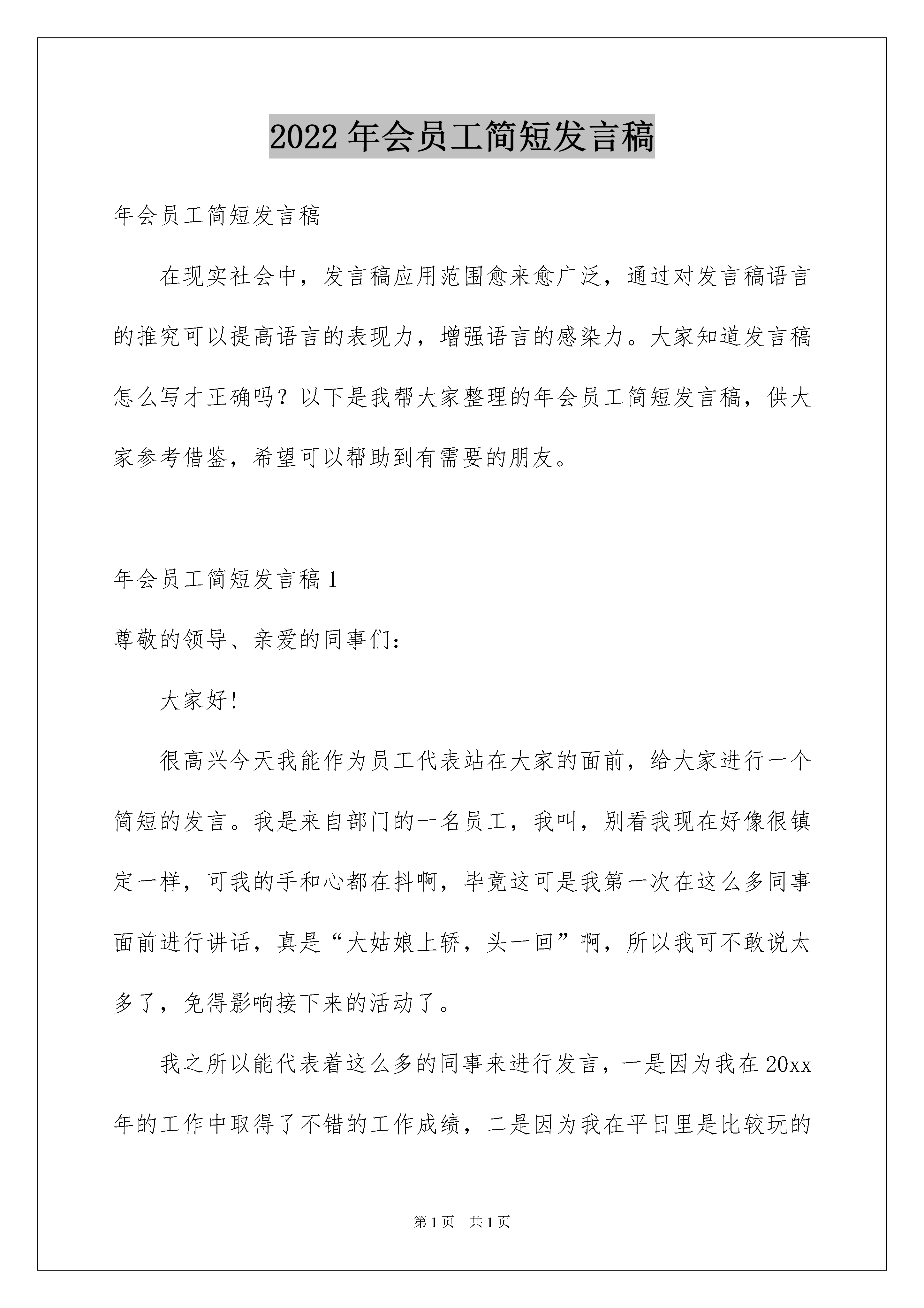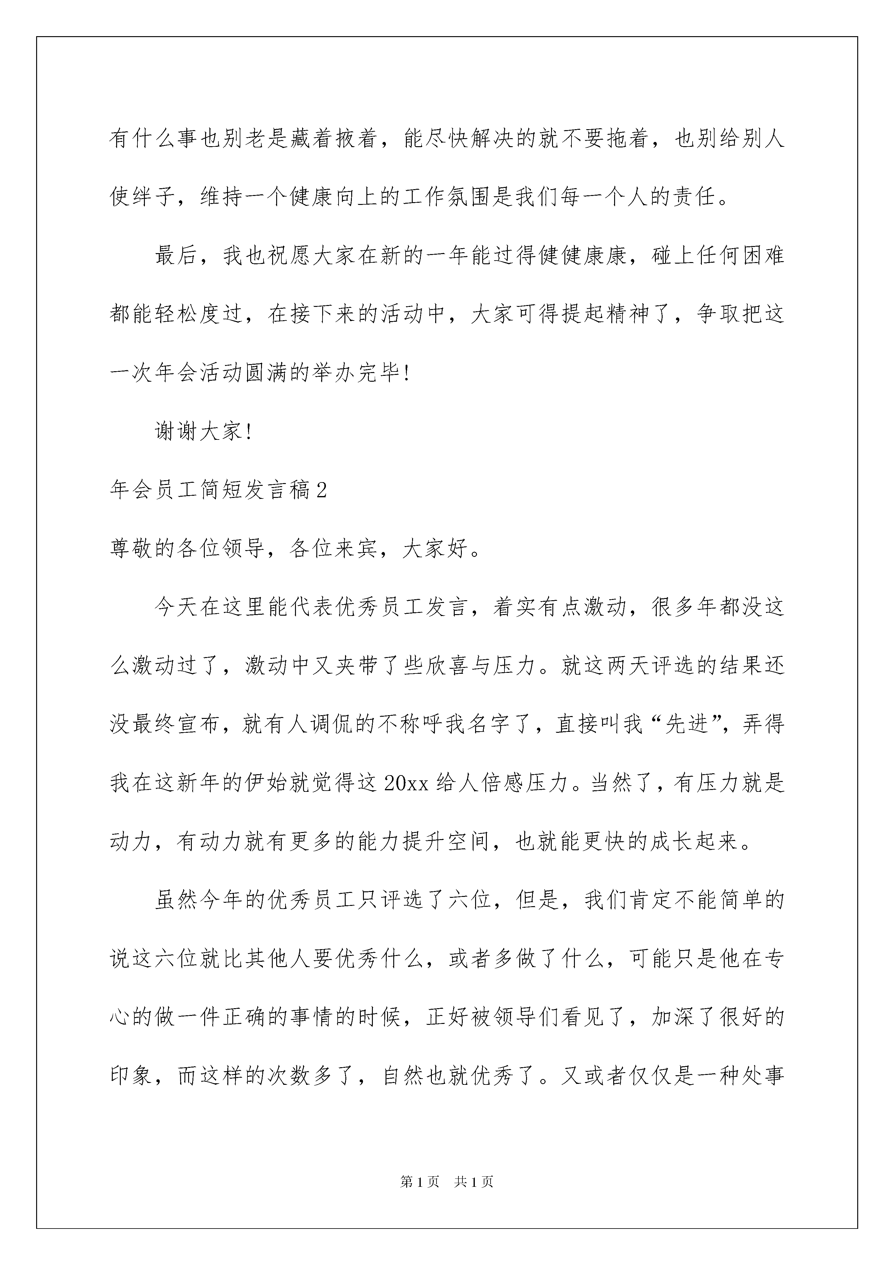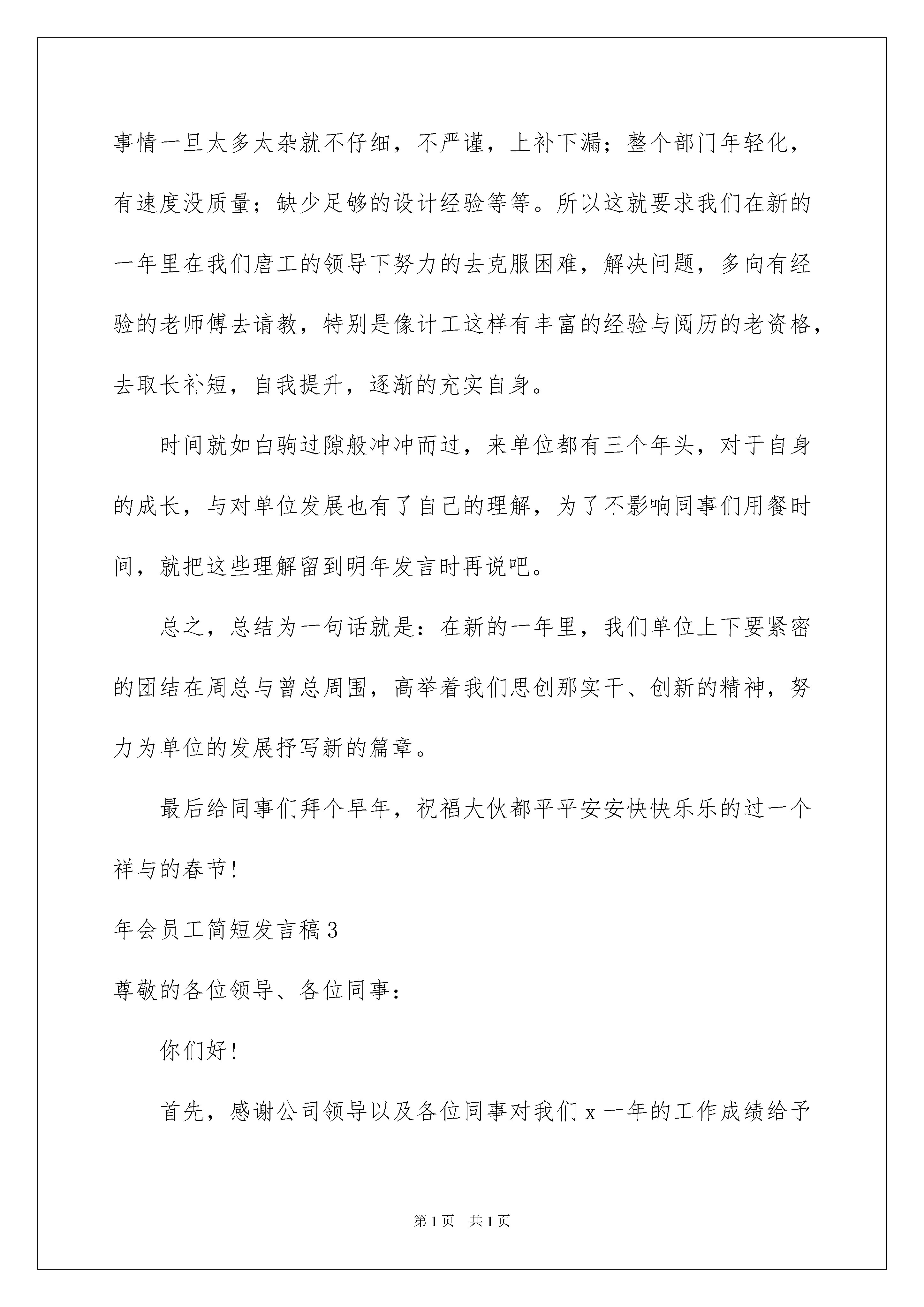 2022年会员工简短发言稿年会员工简短发言稿在现实社会中,发言稿应用范围愈来愈广泛,通过对发言稿语言的推究可以提高语言的表现力,增强语言的感染力。大家知道发言稿怎么写才正确吗?以下是我帮大家整理的年会员工简短发言稿,供大家参考借鉴,希望可以帮助到有需要的朋友。年会员工简短发言稿1尊敬的领导、亲爱的同事们:大家好!很高兴今天我能作为员工代表站在大家的面前,给大家进行一个简短的发言。我是来自部门的一名员工,我叫,别看我现在好像很镇定一样,可我的手和心都在抖啊,毕竟这可是我第一次在这么多同事面前进行讲话,真是“大姑娘上轿,头一回”啊,所以我可不敢说太多了,免得影响接下来的活动了。我之所以能代表着这么多的同事来进行发言,一是因为我在20xx年的工作中取得了不错的工作成绩,二是因为我在平日里是比较玩的开的,所以大家要是调侃我的话,我心里自然也是不会有什么不畅快的。既然大家都看得起我,那我就先来谈一谈我在20xx年里到底干了些什么事以及对于工作有着什么样的心得体会吧。首先,我在上班的时候是很少出现迟到缺勤的情况的,因为我生活作息比较规律,每天起床坐车的时间都比较固定,其次就是在工作的时候,我保持了较好的精神面貌,在处理工作业务的时候不含糊也不偷懒,该怎么做就怎么做,虽然不能做到面面俱到,但也力求问心无愧,说起来我在自己的岗位上算是尽责尽责了,也算是给大家做了一个良好的表率。在这一年里,我认真听从了领导的工作要求和指示,严格按照了操作规范和流程,使得自己出现错误的概率大幅度的降低了,另外为了追求更高的目标,也为了让自己绩效再提高几个档次,我在下班之后,会抽出一部分时间去学习和咱们工作有关系的知识,通过自学以及听从前辈们的讲座,让我在这一段时间内的工作能力有了不小的提升。除了要把工作给弄好外,我们也应该处理好与周围同事的关系,毕竟大家可是天天都要见面的,要是彼此之间产生了什么误会和不愉快,不仅对自己的身心健康不利,还会影响到周围同事的工作氛围,这可不符合我们公司的发展要求,所以大家在平日里应该和睦相处,有什么事也别老是藏着掖着,能尽快解决的就不要拖着,也别给别人使绊子,维持一个健康向上的工作氛围是我们每一个人的责任。最后,我也祝愿大家在新的一年能过得健健康康,碰上任何困难都能轻松度过,在接下来的活动中,大家可得提起精神了,争取把这一次年会活动圆满的举办完毕!谢谢大家!年会员工简短发言稿2尊敬的各位领导,各位来宾,大家好。今天在这里能代表优秀员工发言,着实有点激动,很多年都没这么激动过了,激动中又夹带了些欣喜与压力。就这两天评选的结果还没最终宣布,就有人调侃的不称呼我名字了,直接叫我“先进”,弄得我在这新年的伊始就觉得这20xx给人倍感压力。当然了,有压力就是动力,有动力就有更多的能力提升空间,也就能更快的成长起来。虽然今年的优秀员工只评选了六位,但是,我们肯定不能简单的说这六位就比其他人要优秀什么,或者多做了什么,可能只是他在专心的做一件正确的事情的时候,正好被领导们看见了,加深了很好的印象,而这样的次数多了,自然也就优秀了。又或者仅仅是一种处事态度与方式得到了广泛的肯定。所以那些低调勤劳,埋头苦干,把单位当家的同事们,在这里更需要我们向他们看齐,就比如高工从早上一上班就开始奋笔疾书,不知疲倦一直写到下班,有时候还会因为工作而累倒;我们潘总把车间当办公室,每天督战在生产第一线,遇到重点难点问题都是亲自指挥战斗;我们强哥每天都是忙里忙外的,把车子当床铺,把泡面做三餐,不管大事小事,事事亲力亲为;我们计工也是忙上忙下,保质保量,严把着单位质量关;还有我们车间主任张师傅,技术部唐工,朱工,各班班长等等,都是为工作殚精竭虑。当然如果这些中层领导不在优秀员工的评选之列,那么来年是不是应该增加一项优秀干部的评选?领导中也有竞争,那样会有一个更好的良性循环。我们部门被评选为“先进集体”,确实是让人有点受宠若惊,其实质检部,各个班组都应该比我们有资格,因为我们清楚的知道在过去一年里我们有过多少错误与种种不足之处。上次去升华拜克的路上,计工说我们技术部下发的十套图纸,九套有问题,还有一套也不能说是没问题,只是他还没找到,没看过也就不知道有没有问题。虽然我们知道计工是在开玩笑,但是我们可不能就认为这是在开玩笑,比如事情一旦太多太杂就不仔细,不严谨,上补下漏;整个部门年轻化,有速度没质量;缺少足够的设计经验等等。所以这就要求我们在新的一年里在我们唐工的领导下努力的去克服困难,解决问题,多向有经验的老师傅去请教,特别是像计工这样有丰富的经验与阅历的老资格,去取长补短,自我提升,逐渐的充实自身。时间就如白驹过隙般