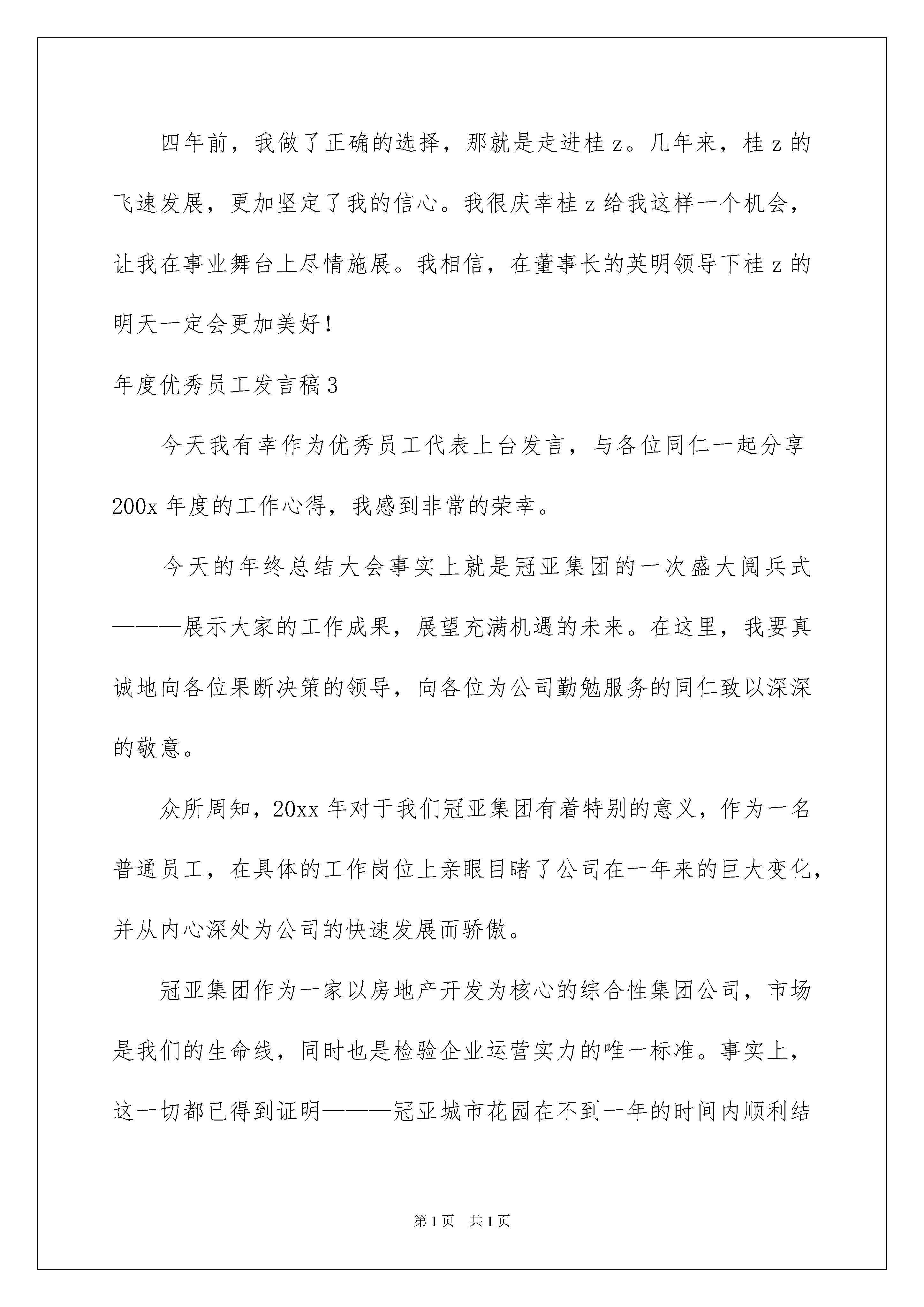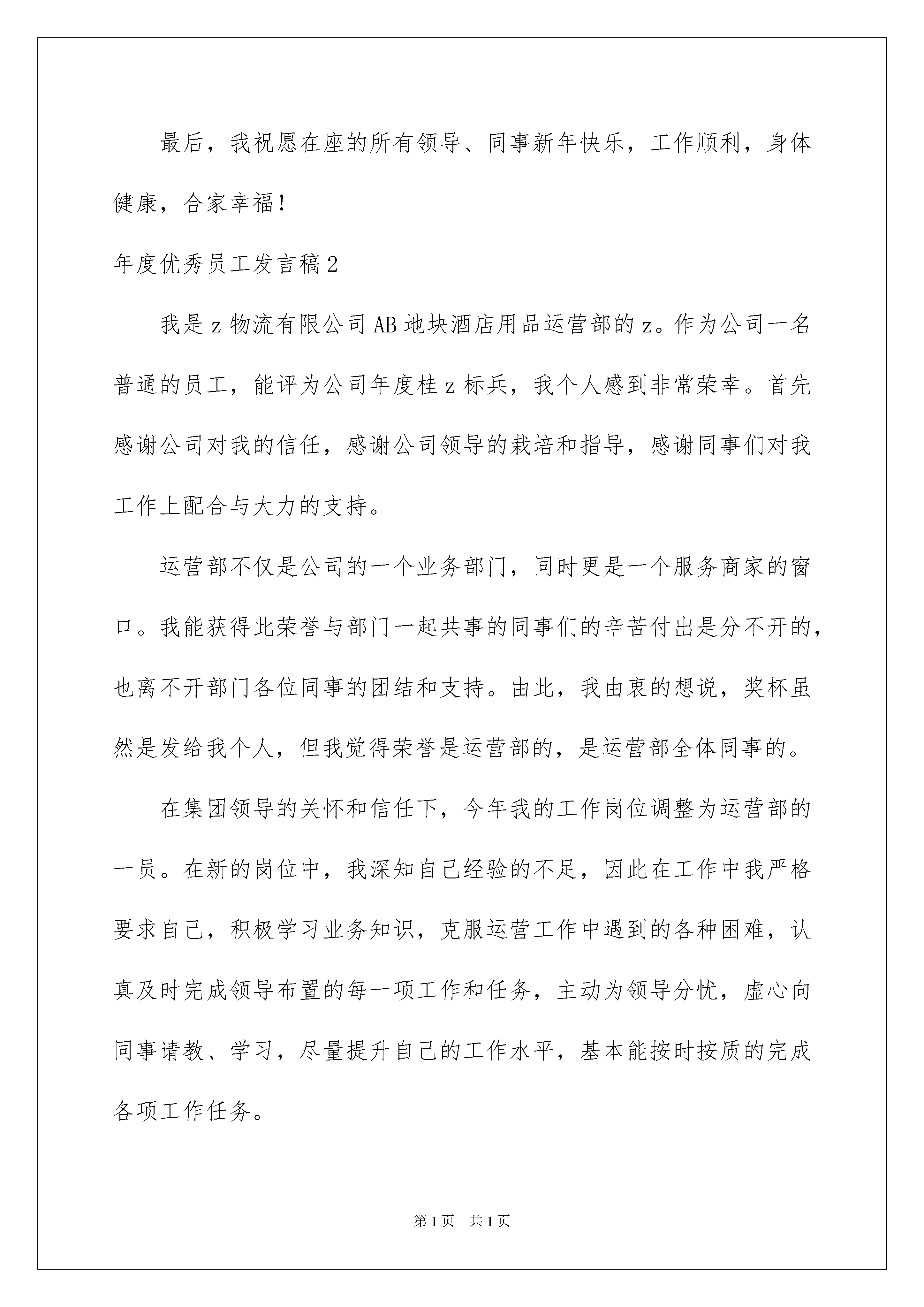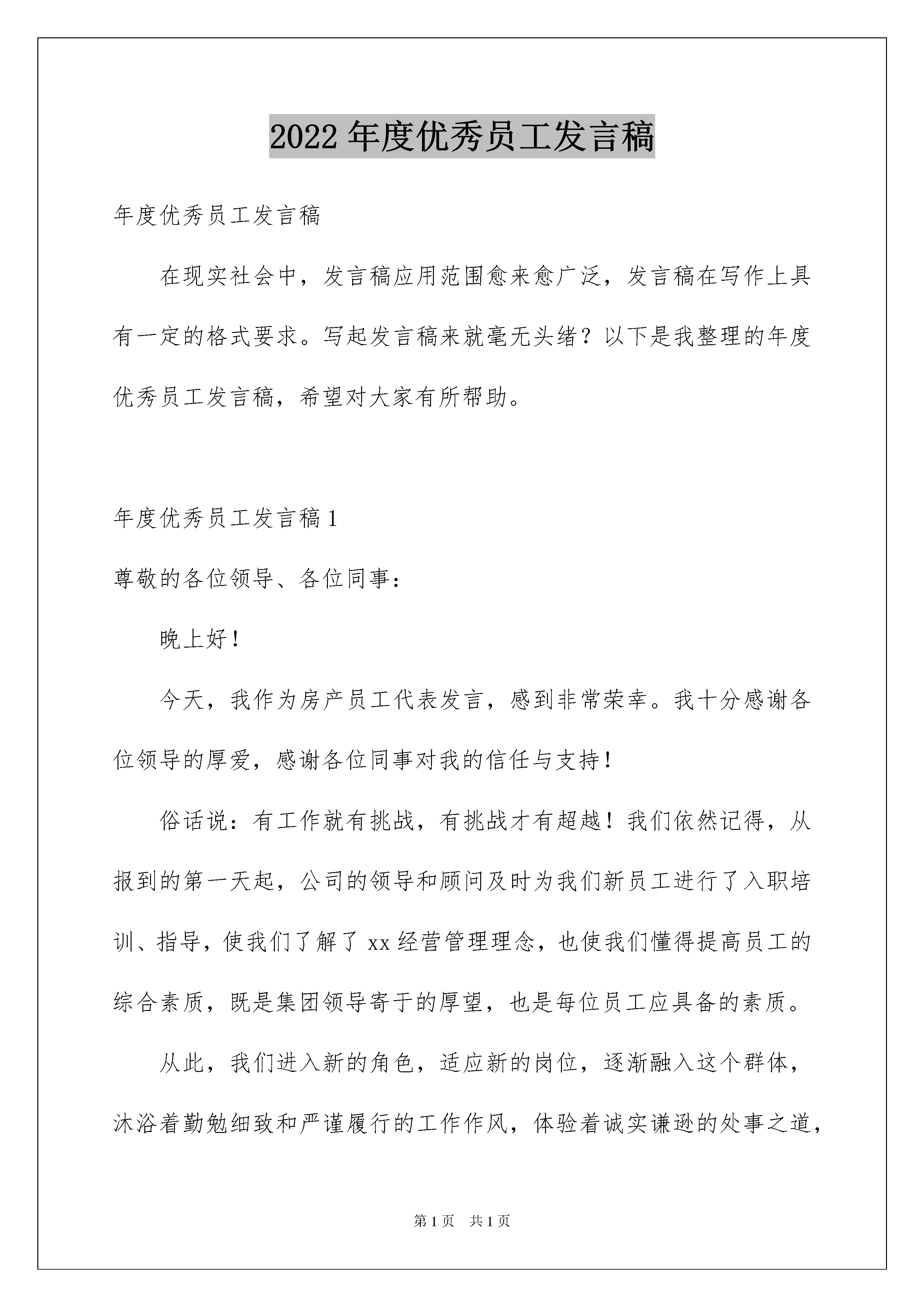 2022年度优秀员工发言稿年度优秀员工发言稿在现实社会中,发言稿应用范围愈来愈广泛,发言稿在写作上具有一定的格式要求。写起发言稿来就毫无头绪?以下是我整理的年度优秀员工发言稿,希望对大家有所帮助。年度优秀员工发言稿1尊敬的各位领导、各位同事:晚上好!今天,我作为房产员工代表发言,感到非常荣幸。我十分感谢各位领导的厚爱,感谢各位同事对我的信任与支持!俗话说:有工作就有挑战,有挑战才有超越!我们依然记得,从报到的第一天起,公司的领导和顾问及时为我们新员工进行了入职培训、指导,使我们了解了xx经营管理理念,也使我们懂得提高员工的综合素质,既是集团领导寄于的厚望,也是每位员工应具备的素质。从此,我们进入新的角色,适应新的岗位,逐渐融入这个群体,沐浴着勤勉细致和严谨履行的工作作风,体验着诚实谦逊的处事之道,感受着“不经风雨,怎见彩虹”的豪迈激情。通过xx这个崭新的舞台逐步实现我们的远大理想。在这个过程中,我们已经从最初的激动和兴奋中冷静下来,开始以主人翁的心态,定位自己的目标,挖掘个人的潜力。作为xx一员的我们,对自己的未来充满信心!我们会继续努力学习专业知识,提高个人综合素质,同时,也期待发挥自己的专业特长和个人价值,为公司的发展和个人境界的提升而不懈努力!一年来的所见所闻所获,让我们的心得以沉静,也让我们的心灵变得明净。我们在工作中学习,在学习中反思,在反思中,在总结中提升。我认为,作为一名xx员工应该做到:一、踏实做事。作为企业的员工,首先学好企业,做好本职工作。在日常工作实践中只有“责任在心,品质在行”的理念,才能保证工程质量。在今后的日子里,只有不断提高自己的综合素质,才能充分地把自身原有的理论知识与现场实际结合起来。要学会分解工作任务,确定责任主体,明确工作要求,密切配合协调,以求真务实的作风,精益求精的态度,做好各项工作。二、开拓创新。我们年轻人应在工作中懂得应用特有的冲劲、敏锐的头脑和接受新鲜事物快等优点去开拓创新。创新来源于主动的思考、用心的琢磨、对工作认真负责的态度,创新要求我们对待工作要高度负责,要用心用脑去对待工作,只有这样,才能保证在激烈的市场竞争中立于不败之地。三、学习进取。目前,我们所面临的是知识日益更新的时代,仅仅靠现有的知识,不能解决新出现的问题。我们不仅要向书本学,更重要的是,要在工作实践中不断总结经验,采用直接和间接的方式,掌握各种本领,争做企业精英,为各级领导献计献策。在工作中,要注重三个结合:所学知识和工作实际相结合;坚持继承传统和开拓创新相结合;岗位竞争和团队协作相结合。虽然工作有困难也有艰苦,但它却能段练我们的意志和耐力。只要我们同心同德、全力以赴,以主人翁的心态来认真做好该做的每一件工作,以迎接明天挑战的心态来努力学好该学的知识,我坚信,我们xx房产一定能够劈风破浪顺利到达理想的彼岸!最后,我祝愿在座的所有领导、同事新年快乐,工作顺利,身体健康,合家幸福!年度优秀员工发言稿2我是z物流有限公司AB地块酒店用品运营部的z。作为公司一名普通的员工,能评为公司年度桂z标兵,我个人感到非常荣幸。首先感谢公司对我的信任,感谢公司领导的栽培和指导,感谢同事们对我工作上配合与大力的支持。运营部不仅是公司的一个业务部门,同时更是一个服务商家的窗口。我能获得此荣誉与部门一起共事的同事们的辛苦付出是分不开的,也离不开部门各位同事的团结和支持。由此,我由衷的想说,奖杯虽然是发给我个人,但我觉得荣誉是运营部的,是运营部全体同事的。在集团领导的关怀和信任下,今年我的工作岗位调整为运营部的一员。在新的岗位中,我深知自己经验的不足,因此在工作中我严格要求自己,积极学习业务知识,克服运营工作中遇到的各种困难,认真及时完成领导布置的每一项工作和任务,主动为领导分忧,虚心向同事请教、学习,尽量提升自己的工作水平,基本能按时按质的完成各项工作任务。四年前,我做了正确的选择,那就是走进桂z。几年来,桂z的飞速发展,更加坚定了我的信心。我很庆幸桂z给我这样一个机会,让我在事业舞台上尽情施展。我相信,在董事长的英明领导下桂z的明天一定会更加美好!年度优秀员工发言稿3今天我有幸作为优秀员工代表上台发言,与各位同仁一起分享200x年度的工作心得,我感到非常的荣幸。今天的年终总结大会事实上就是冠亚集团的一次盛大阅兵式———展示大家的工作成果,展望充满机遇的未来。在这里,我要真诚地向各位果断决策的领导,向各位为公司勤勉服务的同仁致以深深的敬意。众所周知,20xx年对于我们冠亚集团有着特别的意义,作为一名普通员工,在具体的工作岗位上亲眼目睹了公司在一年来的巨大变化,并从内心深处为公司的快