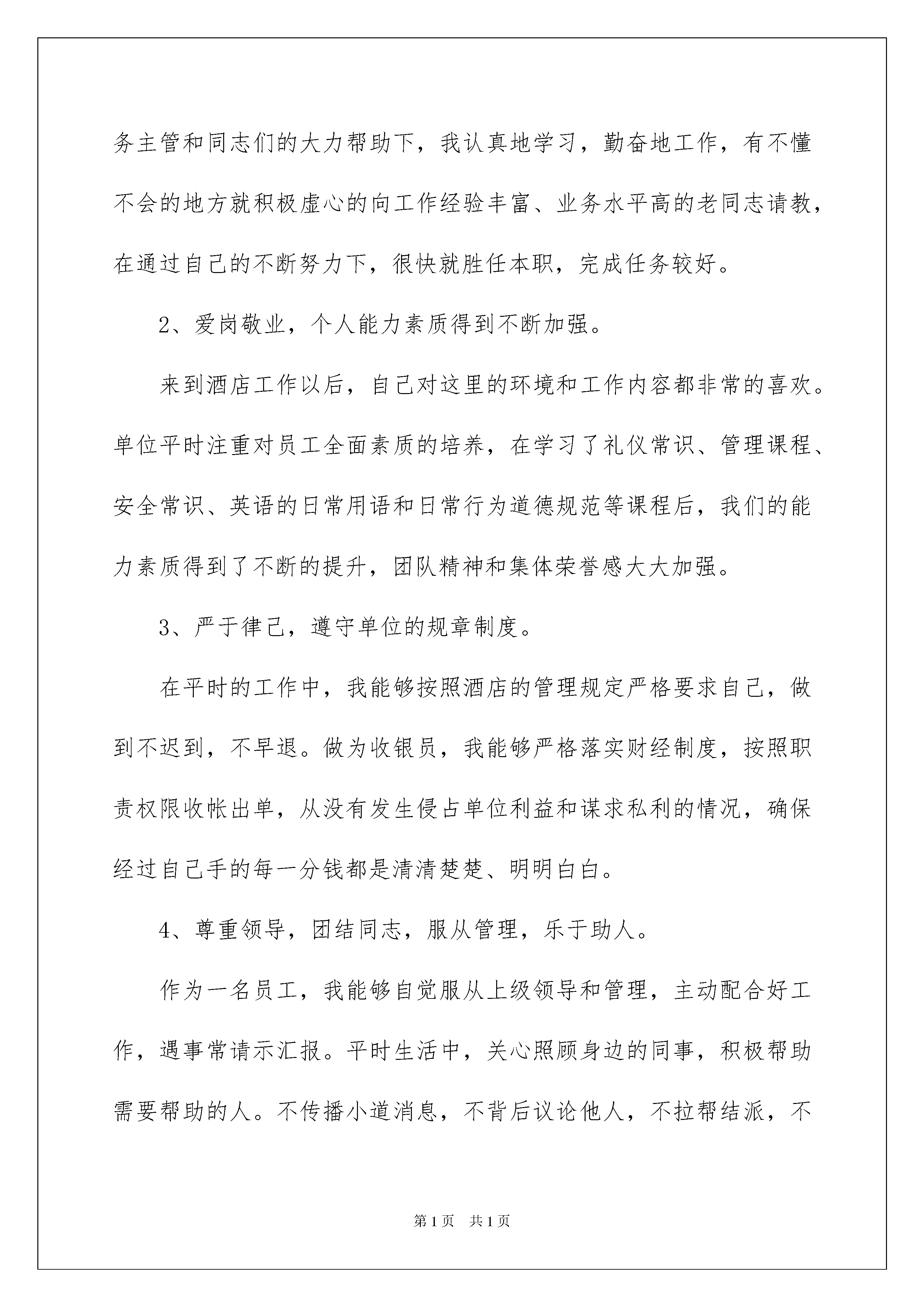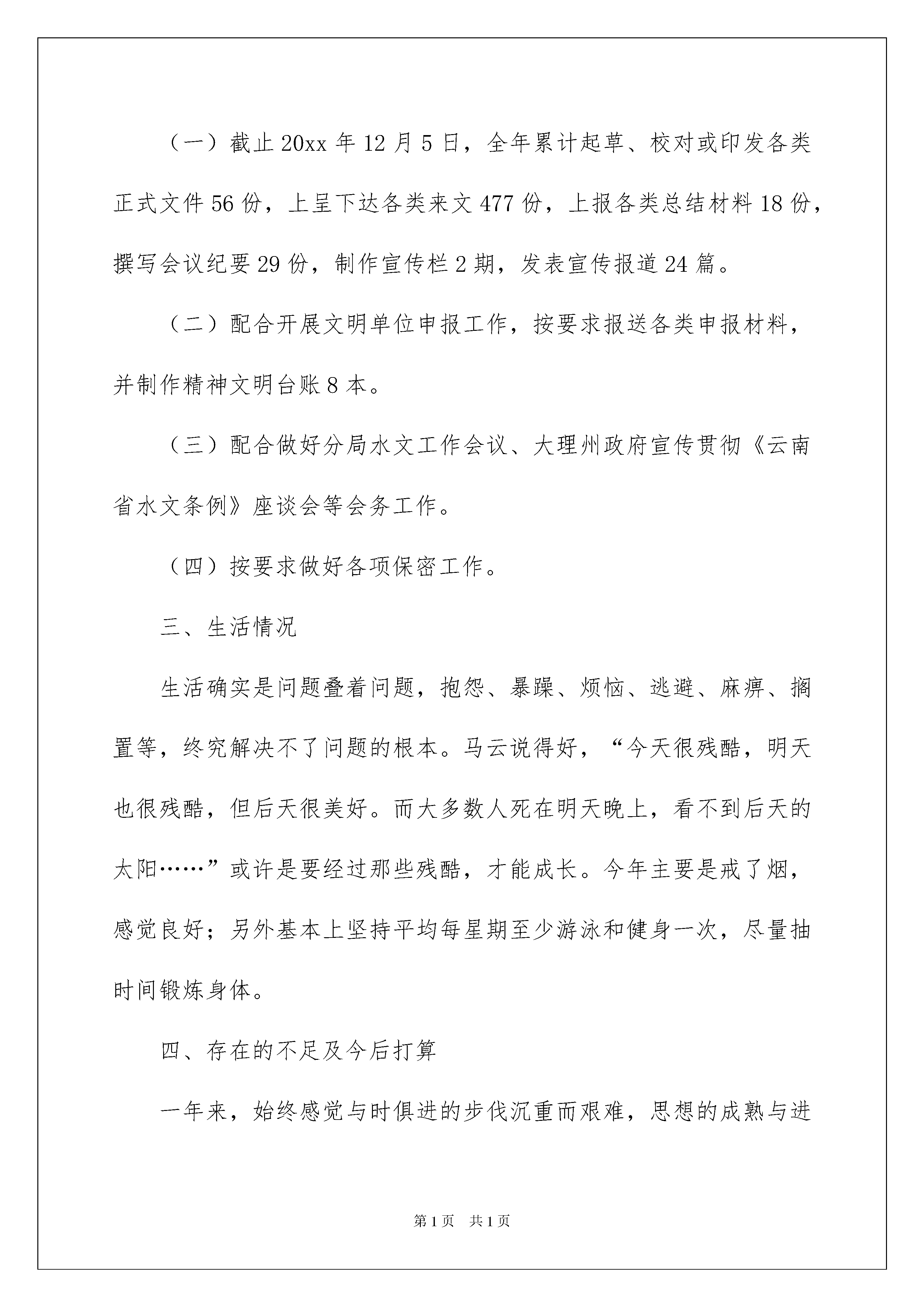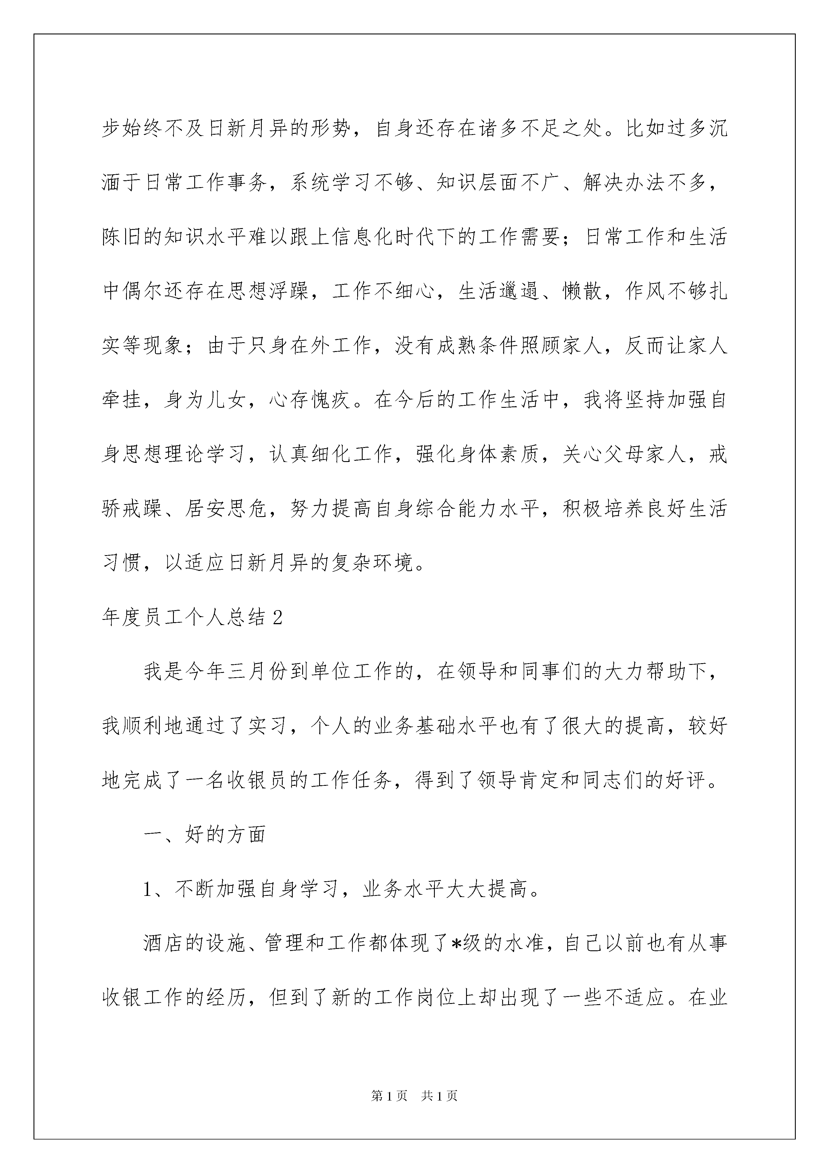 2022年度员工个人总结年度员工个人总结总结是把一定阶段内的有关情况分析研究,做出有指导性结论的书面材料,它可以帮助我们有寻找学习和工作中的规律,让我们一起认真地写一份总结吧。总结怎么写才是正确的呢?下面是我精心整理的年度员工个人总结,仅供参考,大家一起来看看吧。年度员工个人总结1回眸过去的一年,在家人和领导的关心指导下、在朋友和同事的帮助支持下,思想、工作和生活上都有一定进步,现将一年来的情况简要总结如下:一、学习情况当今社会,学习已经成为决定一个人生存发展的至关重要因素。知识爆炸,科技日新。有人说,在农耕时代,读几年的书,可以管用一辈子;到了工业经济时代,读十几年的书才能够用一辈子;到了经济信息化时代,只有终身学习,才能够用一辈子。学习是个人成长进步的基础,学习能力直接关系到工作能力的高低。一年来,一是注重自身思想政治学习。勤于思考,认真学习了部分《##语录》,结合实际工作,积极梳理知识、理念、思路、方法等,促使自己树立正确的人生观和价值观。二是注重业务学习。在日常工作中实事求是,不断提高自己,发现问题及时解决处理,不留疑问;多渠道收集资料,分析总结,积累经验;另外有针对性地学习了部分保密政策法规、单位规章制度及《云南省水文条例》。三是注重向各层面人员交往学习。深刻树立“两人行,必有我师”的观念,坚持用时代发展的要求审视自己,加强完善自己,永不自满、永不懈怠,不断以新的认识、新的思路、新的追求开创自己的未来。二、工作情况工作中历来树立“责任胜于能力”的思想,端正工作态度,立足自身本职工作,尽心尽力做好一点一滴。今年是“十一五”规划最后一年,又恰遇开展总支换届选举、申报文明单位及全省水文系统第三届“水文杯”职工运动会等,工作任务较重,且时间紧凑。面对困难,我积极调整心态,迎难而上,不浮躁、不放弃,坚持以高度负责的态度扎扎实实做好各项工作,加班加点毫无怨言。今年主要完成了以下几个方面的工作:(一)截止20xx年12月5日,全年累计起草、校对或印发各类正式文件56份,上呈下达各类来文477份,上报各类总结材料18份,撰写会议纪要29份,制作宣传栏2期,发表宣传报道24篇。(二)配合开展文明单位申报工作,按要求报送各类申报材料,并制作精神文明台账8本。(三)配合做好分局水文工作会议、大理州政府宣传贯彻《云南省水文条例》座谈会等会务工作。(四)按要求做好各项保密工作。三、生活情况生活确实是问题叠着问题,抱怨、暴躁、烦恼、逃避、麻痹、搁置等,终究解决不了问题的根本。马云说得好,“今天很残酷,明天也很残酷,但后天很美好。而大多数人死在明天晚上,看不到后天的太阳……”或许是要经过那些残酷,才能成长。今年主要是戒了烟,感觉良好;另外基本上坚持平均每星期至少游泳和健身一次,尽量抽时间锻炼身体。四、存在的不足及今后打算一年来,始终感觉与时俱进的步伐沉重而艰难,思想的成熟与进步始终不及日新月异的形势,自身还存在诸多不足之处。比如过多沉湎于日常工作事务,系统学习不够、知识层面不广、解决办法不多,陈旧的知识水平难以跟上信息化时代下的工作需要;日常工作和生活中偶尔还存在思想浮躁,工作不细心,生活邋遢、懒散,作风不够扎实等现象;由于只身在外工作,没有成熟条件照顾家人,反而让家人牵挂,身为儿女,心存愧疚。在今后的工作生活中,我将坚持加强自身思想理论学习,认真细化工作,强化身体素质,关心父母家人,戒骄戒躁、居安思危,努力提高自身综合能力水平,积极培养良好生活习惯,以适应日新月异的复杂环境。年度员工个人总结2我是今年三月份到单位工作的,在领导和同事们的大力帮助下,我顺利地通过了实习,个人的业务基础水平也有了很大的提高,较好地完成了一名收银员的工作任务,得到了领导肯定和同志们的好评。一、好的方面1、不断加强自身学习,业务水平大大提高。酒店的设施、管理和工作都体现了*级的水准,自己以前也有从事收银工作的经历,但到了新的工作岗位上却出现了一些不适应。在业务主管和同志们的大力帮助下,我认真地学习,勤奋地工作,有不懂不会的地方就积极虚心的向工作经验丰富、业务水平高的老同志请教,在通过自己的不断努力下,很快就胜任本职,完成任务较好。2、爱岗敬业,个人能力素质得到不断加强。来到酒店工作以后,自己对这里的环境和工作内容都非常的喜欢。单位平时注重对员工全面素质的培养,在学习了礼仪常识、管理课程、安全常识、英语的日常用语和日常行为道德规范等课程后,我们的能力素质得到了不断的提升,团队精神和集体荣誉感大大加强。3、严于律己,遵守单位的规章制度。在平时的工作中,我能够按照酒店的管理规定严格要求自己,做到不迟到,不早退。做为收银员