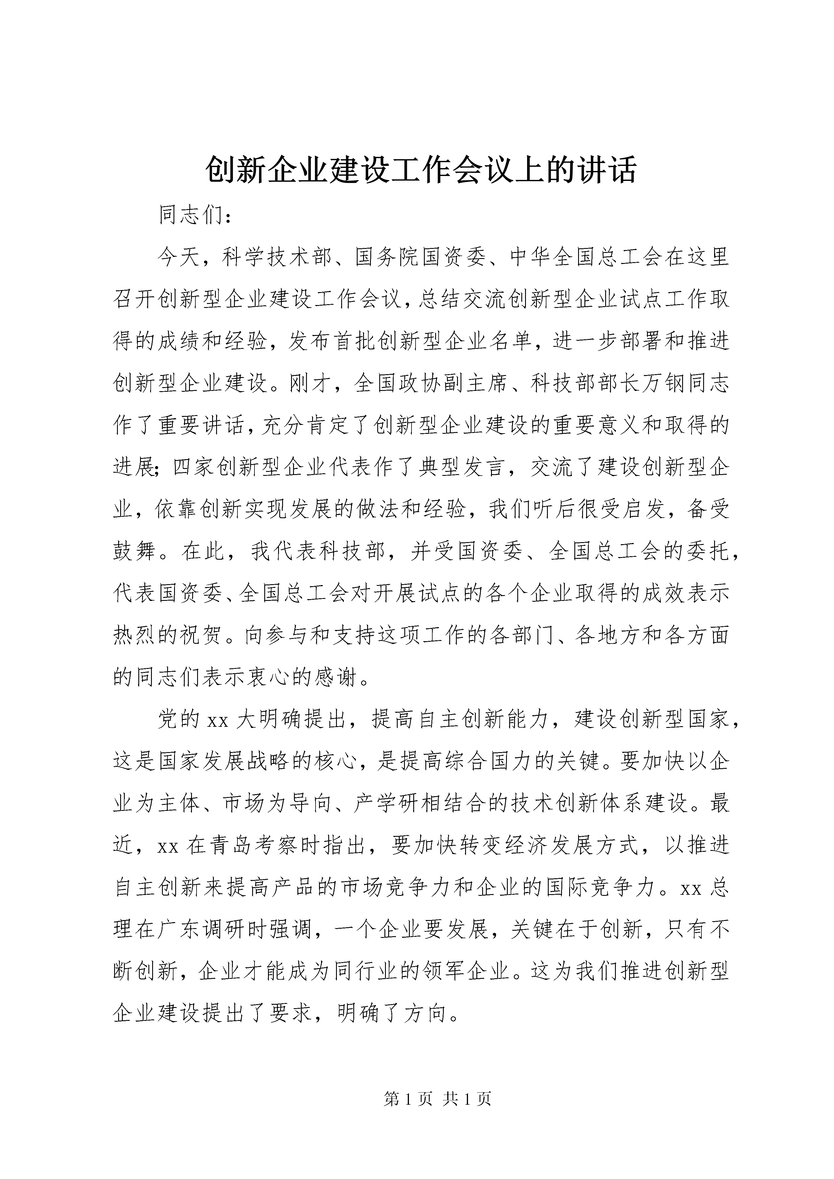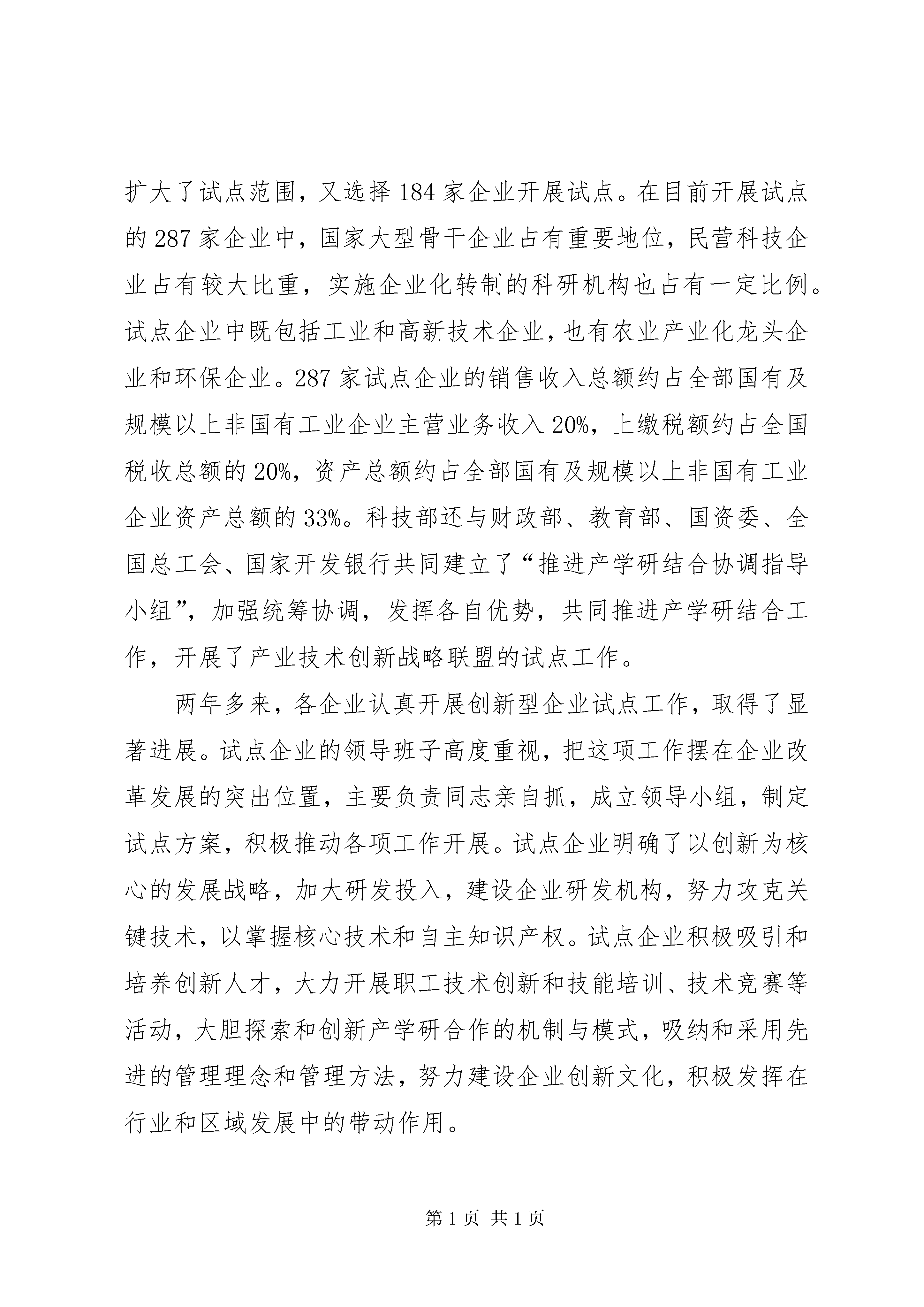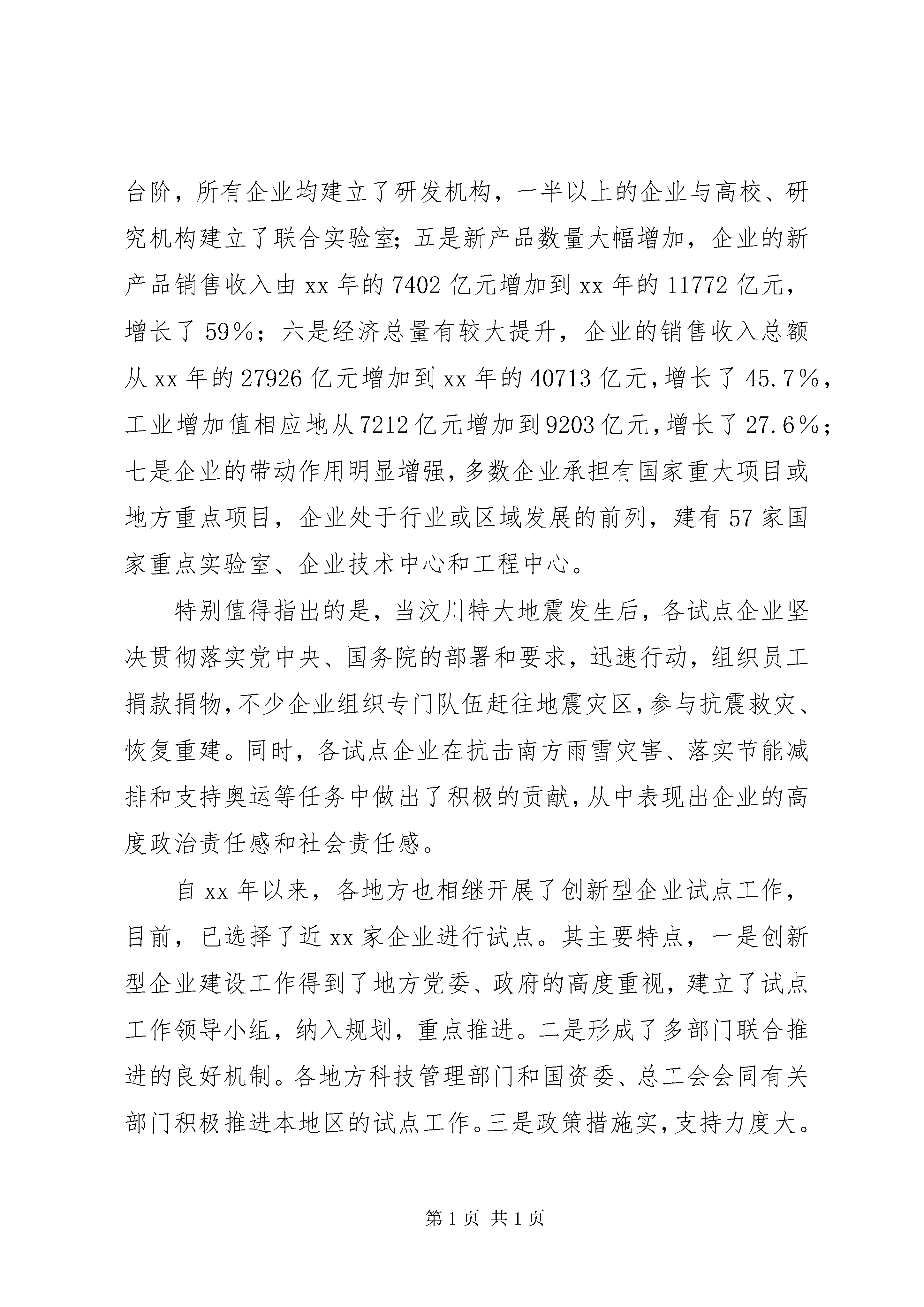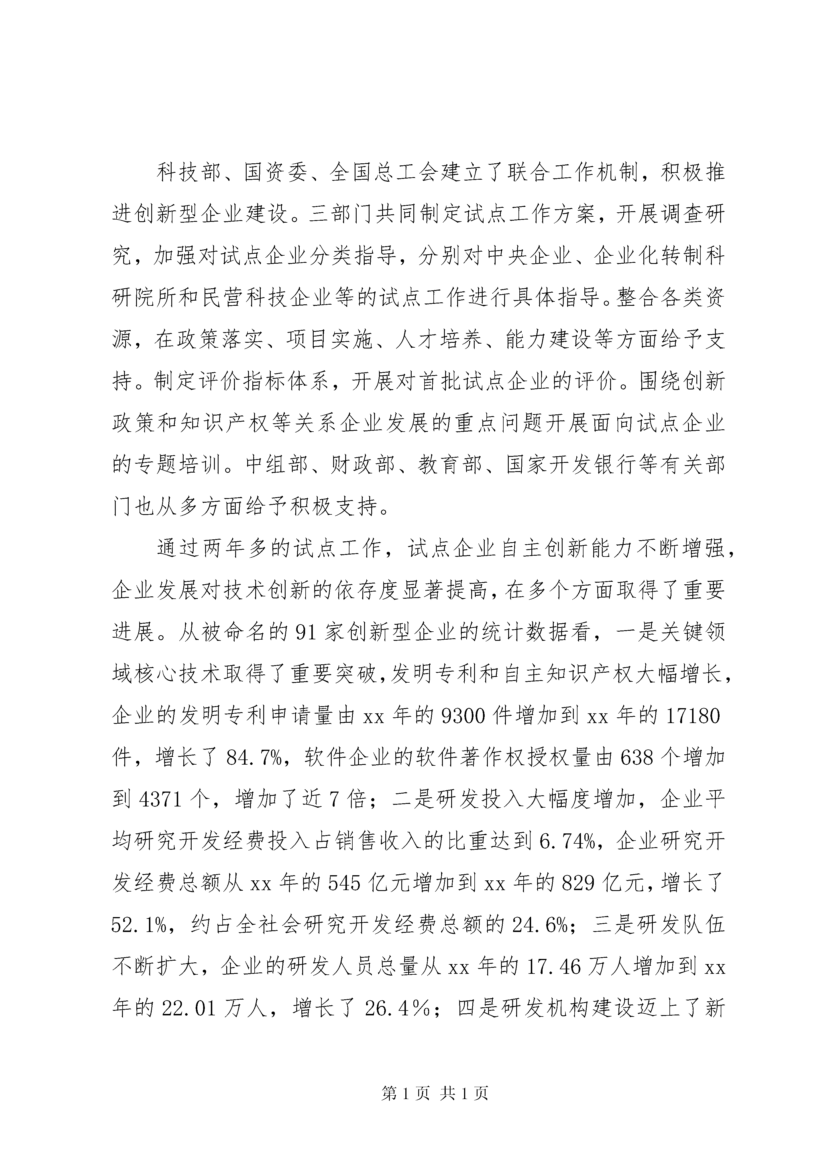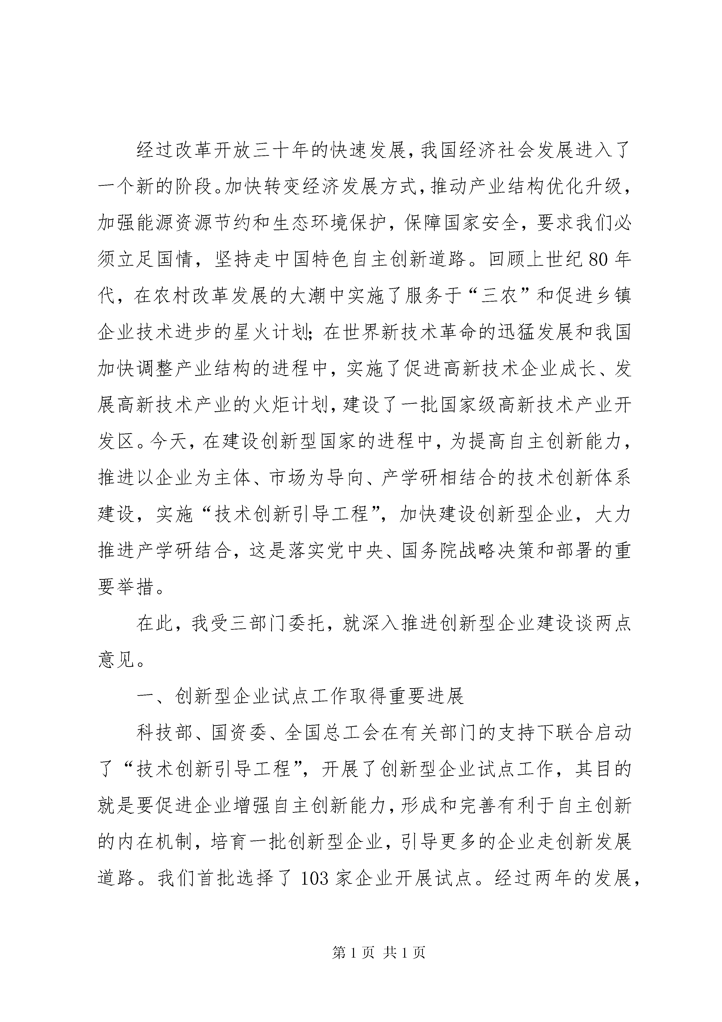 创新企业建设工作会议上的讲话同志们:今天,科学技术部、国务院国资委、中华全国总工会在这里召开创新型企业建设工作会议,总结交流创新型企业试点工作取得的成绩和经验,发布首批创新型企业名单,进一步部署和推进创新型企业建设。刚才,全国政协副主席、科技部部长万钢同志作了重要讲话,充分肯定了创新型企业建设的重要意义和取得的进展;四家创新型企业代表作了典型发言,交流了建设创新型企业,依靠创新实现发展的做法和经验,我们听后很受启发,备受鼓舞。在此,我代表科技部,并受国资委、全国总工会的委托,代表国资委、全国总工会对开展试点的各个企业取得的成效表示热烈的祝贺。向参与和支持这项工作的各部门、各地方和各方面的同志们表示衷心的感谢。党的xx大明确提出,提高自主创新能力,建设创新型国家,这是国家发展战略的核心,是提高综合国力的关键。要加快以企业为主体、市场为导向、产学研相结合的技术创新体系建设。最近,xx在青岛考察时指出,要加快转变经济发展方式,以推进自主创新来提高产品的市场竞争力和企业的国际竞争力。xx总理在广东调研时强调,一个企业要发展,关键在于创新,只有不断创新,企业才能成为同行业的领军企业。这为我们推进创新型企业建设提出了要求,明确了方向。经过改革开放三十年的快速发展,我国经济社会发展进入了一个新的阶段。加快转变经济发展方式,推动产业结构优化升级,加强能源资源节约和生态环境保护,保障国家安全,要求我们必须立足国情,坚持走中国特色自主创新道路。回顾上世纪80年代,在农村改革发展的大潮中实施了服务于“三农”和促进乡镇企业技术进步的星火计划;在世界新技术革命的迅猛发展和我国加快调整产业结构的进程中,实施了促进高新技术企业成长、发展高新技术产业的火炬计划,建设了一批国家级高新技术产业开发区。今天,在建设创新型国家的进程中,为提高自主创新能力,推进以企业为主体、市场为导向、产学研相结合的技术创新体系建设,实施“技术创新引导工程”,加快建设创新型企业,大力推进产学研结合,这是落实党中央、国务院战略决策和部署的重要举措。在此,我受三部门委托,就深入推进创新型企业建设谈两点意见。一、创新型企业试点工作取得重要进展科技部、国资委、全国总工会在有关部门的支持下联合启动了“技术创新引导工程”,开展了创新型企业试点工作,其目的就是要促进企业增强自主创新能力,形成和完善有利于自主创新的内在机制,培育一批创新型企业,引导更多的企业走创新发展道路。我们首批选择了103家企业开展试点。经过两年的发展,扩大了试点范围,又选择184家企业开展试点。在目前开展试点的287家企业中,国家大型骨干企业占有重要地位,民营科技企业占有较大比重,实施企业化转制的科研机构也占有一定比例。试点企业中既包括工业和高新技术企业,也有农业产业化龙头企业和环保企业。287家试点企业的销售收入总额约占全部国有及规模以上非国有工业企业主营业务收入20%,上缴税额约占全国税收总额的20%,资产总额约占全部国有及规模以上非国有工业企业资产总额的33%。科技部还与财政部、教育部、国资委、全国总工会、国家开发银行共同建立了“推进产学研结合协调指导小组”,加强统筹协调,发挥各自优势,共同推进产学研结合工作,开展了产业技术创新战略联盟的试点工作。两年多来,各企业认真开展创新型企业试点工作,取得了显著进展。试点企业的领导班子高度重视,把这项工作摆在企业改革发展的突出位置,主要负责同志亲自抓,成立领导小组,制定试点方案,积极推动各项工作开展。试点企业明确了以创新为核心的发展战略,加大研发投入,建设企业研发机构,努力攻克关键技术,以掌握核心技术和自主知识产权。试点企业积极吸引和培养创新人才,大力开展职工技术创新和技能培训、技术竞赛等活动,大胆探索和创新产学研合作的机制与模式,吸纳和采用先进的管理理念和管理方法,努力建设企业创新文化,积极发挥在行业和区域发展中的带动作用。科技部、国资委、全国总工会建立了联合工作机制,积极推进创新型企业建设。三部门共同制定试点工作方案,开展调查研究,加强对试点企业分类指导,分别对中央企业、企业化转制科研院所和民营科技企业等的试点工作进行具体指导。整合各类资源,在政策落实、项目实施、人才培养、能力建设等方面给予支持。制定评价指标体系,开展对首批试点企业的评价。围绕创新政策和知识产权等关系企业发展的重点问题开展面向试点企业的专题培训。中组部、财政部、教育部、国家开发银行等有关部门也从多方面给予积极支持。通过两年多的试点工作,试点企业自主创新能力不断增强,企业发展对技术创新的依存度显著提高,在多个方面取得了重要进展。从被命名的91家创新型企业的统计数据看,一是关键领域核心技术取得了重要突破,发明专利和自主知识产权大幅增长,企业的发明专利申请量由xx年的9300件增加到xx年的
