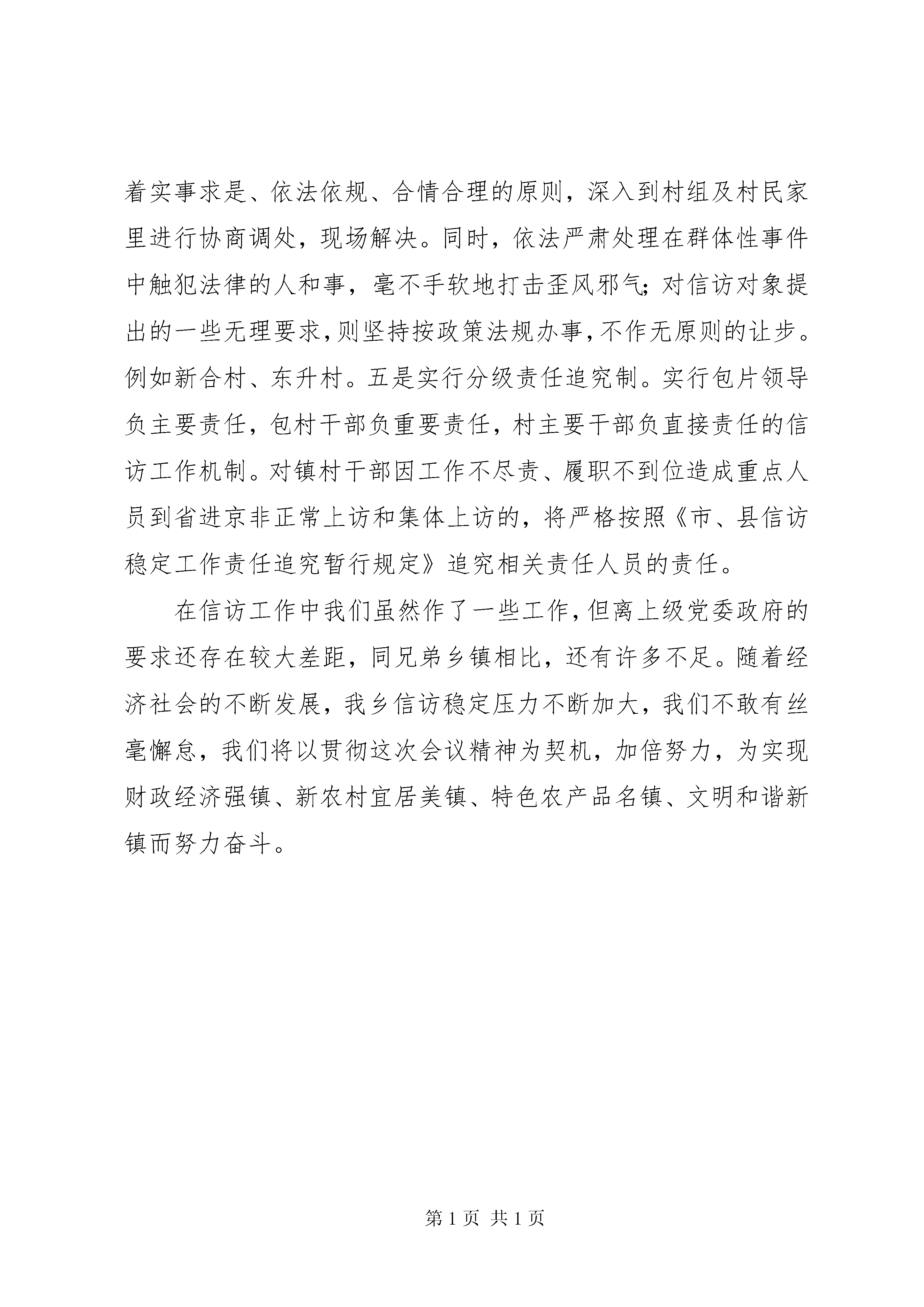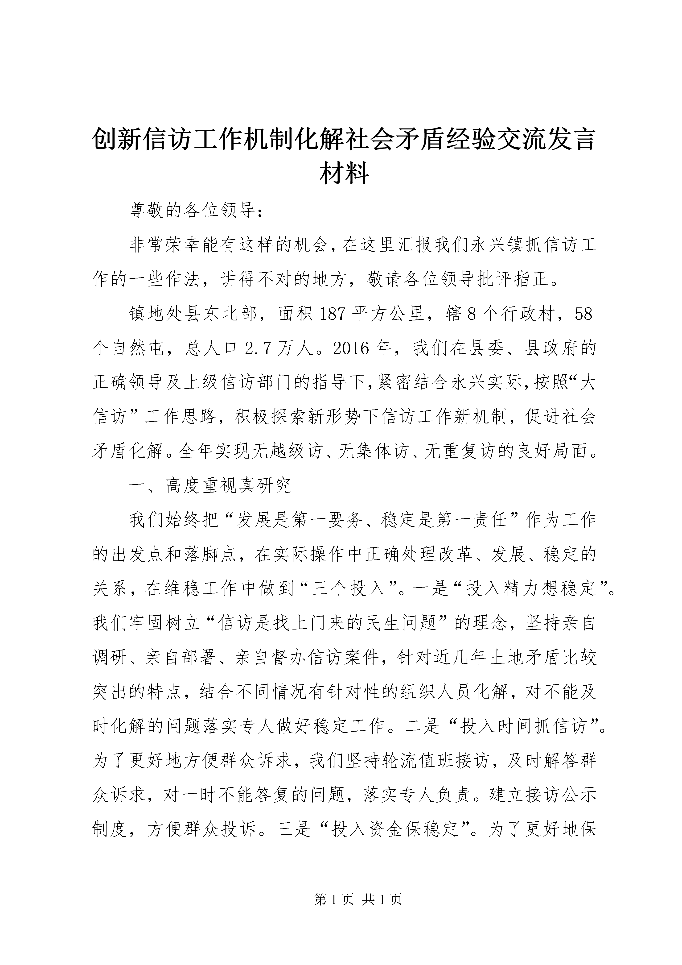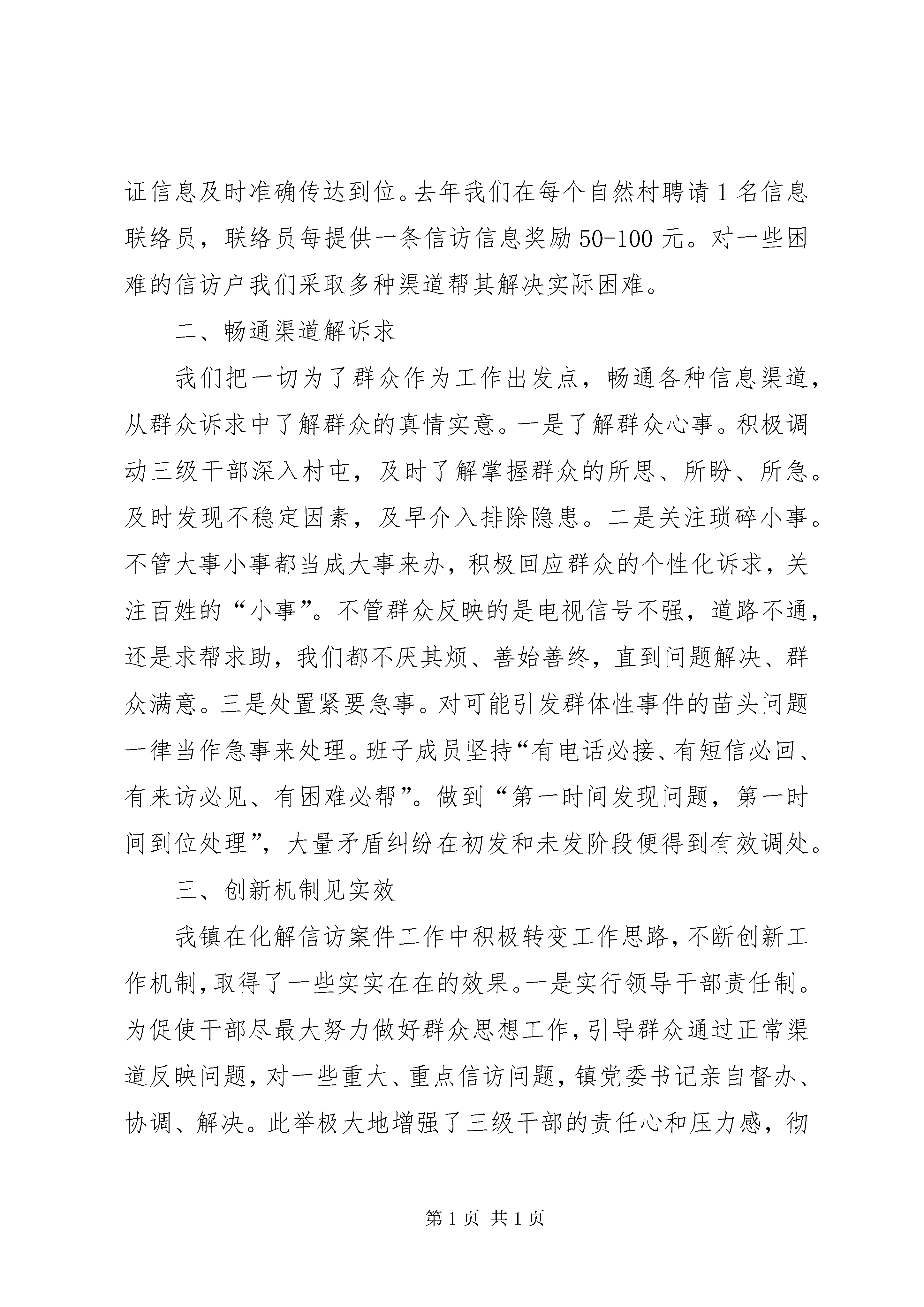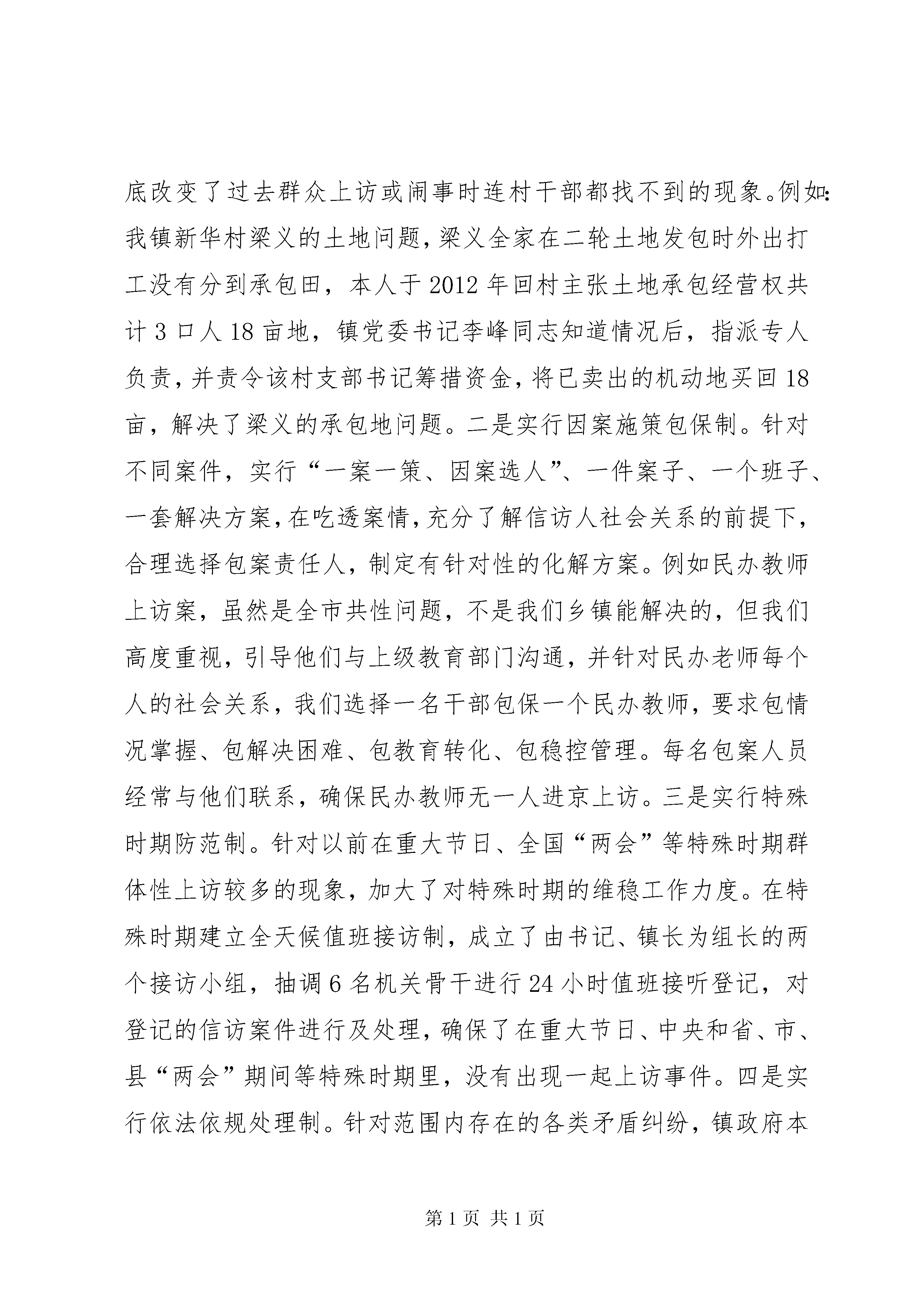 创新信访工作机制化解社会矛盾经验交流发言材料尊敬的各位领导:非常荣幸能有这样的机会,在这里汇报我们永兴镇抓信访工作的一些作法,讲得不对的地方,敬请各位领导批评指正。镇地处县东北部,面积187平方公里,辖8个行政村,58个自然屯,总人口2.7万人。2016年,我们在县委、县政府的正确领导及上级信访部门的指导下,紧密结合永兴实际,按照“大信访”工作思路,积极探索新形势下信访工作新机制,促进社会矛盾化解。全年实现无越级访、无集体访、无重复访的良好局面。一、高度重视真研究我们始终把“发展是第一要务、稳定是第一责任”作为工作的出发点和落脚点,在实际操作中正确处理改革、发展、稳定的关系,在维稳工作中做到“三个投入”。一是“投入精力想稳定”。我们牢固树立“信访是找上门来的民生问题”的理念,坚持亲自调研、亲自部署、亲自督办信访案件,针对近几年土地矛盾比较突出的特点,结合不同情况有针对性的组织人员化解,对不能及时化解的问题落实专人做好稳定工作。二是“投入时间抓信访”。为了更好地方便群众诉求,我们坚持轮流值班接访,及时解答群众诉求,对一时不能答复的问题,落实专人负责。建立接访公示制度,方便群众投诉。三是“投入资金保稳定”。为了更好地保证信息及时准确传达到位。去年我们在每个自然村聘请1名信息联络员,联络员每提供一条信访信息奖励50-100元。对一些困难的信访户我们采取多种渠道帮其解决实际困难。二、畅通渠道解诉求我们把一切为了群众作为工作出发点,畅通各种信息渠道,从群众诉求中了解群众的真情实意。一是了解群众心事。积极调动三级干部深入村屯,及时了解掌握群众的所思、所盼、所急。及时发现不稳定因素,及早介入排除隐患。二是关注琐碎小事。不管大事小事都当成大事来办,积极回应群众的个性化诉求,关注百姓的“小事”。不管群众反映的是电视信号不强,道路不通,还是求帮求助,我们都不厌其烦、善始善终,直到问题解决、群众满意。三是处置紧要急事。对可能引发群体性事件的苗头问题一律当作急事来处理。班子成员坚持“有电话必接、有短信必回、有来访必见、有困难必帮”。做到“第一时间发现问题,第一时间到位处理”,大量矛盾纠纷在初发和未发阶段便得到有效调处。三、创新机制见实效我镇在化解信访案件工作中积极转变工作思路,不断创新工作机制,取得了一些实实在在的效果。一是实行领导干部责任制。为促使干部尽最大努力做好群众思想工作,引导群众通过正常渠道反映问题,对一些重大、重点信访问题,镇党委书记亲自督办、协调、解决。此举极大地增强了三级干部的责任心和压力感,彻底改变了过去群众上访或闹事时连村干部都找不到的现象。例如:我镇新华村梁义的土地问题,梁义全家在二轮土地发包时外出打工没有分到承包田,本人于2012年回村主张土地承包经营权共计3口人18亩地,镇党委书记李峰同志知道情况后,指派专人负责,并责令该村支部书记筹措资金,将已卖出的机动地买回18亩,解决了梁义的承包地问题。二是实行因案施策包保制。针对不同案件,实行“一案一策、因案选人”、一件案子、一个班子、一套解决方案,在吃透案情,充分了解信访人社会关系的前提下,合理选择包案责任人,制定有针对性的化解方案。例如民办教师上访案,虽然是全市共性问题,不是我们乡镇能解决的,但我们高度重视,引导他们与上级教育部门沟通,并针对民办老师每个人的社会关系,我们选择一名干部包保一个民办教师,要求包情况掌握、包解决困难、包教育转化、包稳控管理。每名包案人员经常与他们联系,确保民办教师无一人进京上访。三是实行特殊时期防范制。针对以前在重大节日、全国“两会”等特殊时期群体性上访较多的现象,加大了对特殊时期的维稳工作力度。在特殊时期建立全天候值班接访制,成立了由书记、镇长为组长的两个接访小组,抽调6名机关骨干进行24小时值班接听登记,对登记的信访案件进行及处理,确保了在重大节日、中央和省、市、县“两会”期间等特殊时期里,没有出现一起上访事件。四是实行依法依规处理制。针对范围内存在的各类矛盾纠纷,镇政府本着实事求是、依法依规、合情合理的原则,深入到村组及村民家里进行协商调处,现场解决。同时,依法严肃处理在群体性事件中触犯法律的人和事,毫不手软地打击歪风邪气;对信访对象提出的一些无理要求,则坚持按政策法规办事,不作无原则的让步。例如新合村、东升村。五是实行分级责任追究制。实行包片领导负主要责任,包村干部负重要责任,村主要干部负直接责任的信访工作机制。对镇村干部因工作不尽责、履职不到位造成重点人员到省进京非正常上访和集体上访的,将严格按照《市、县信访稳定工作责任追究暂行规定》追究相关责任人员的责任。在信访工作中我们虽然作了一些工作,但离上级党委政府的要求还存在较大差距,同兄弟乡镇相比,还有许多不足。随着经济社会的不断发展,我乡信访稳定压力不断加大,我们不敢有