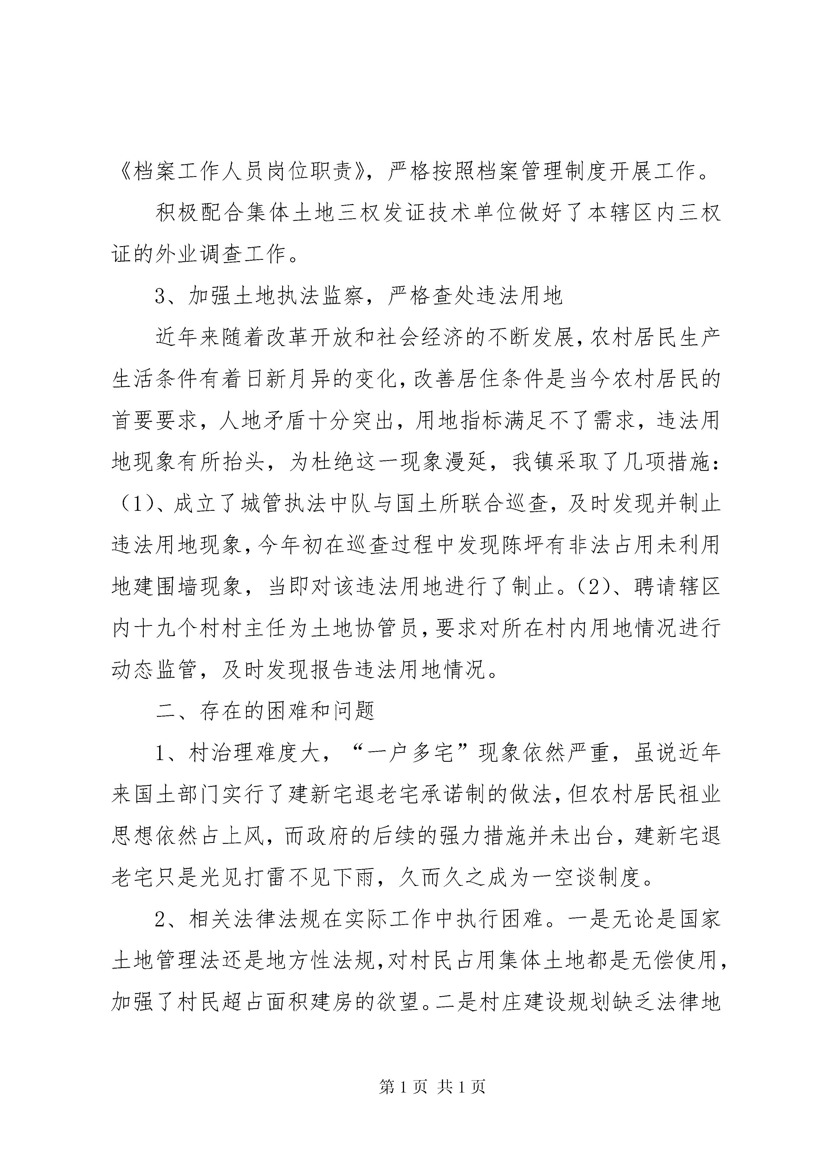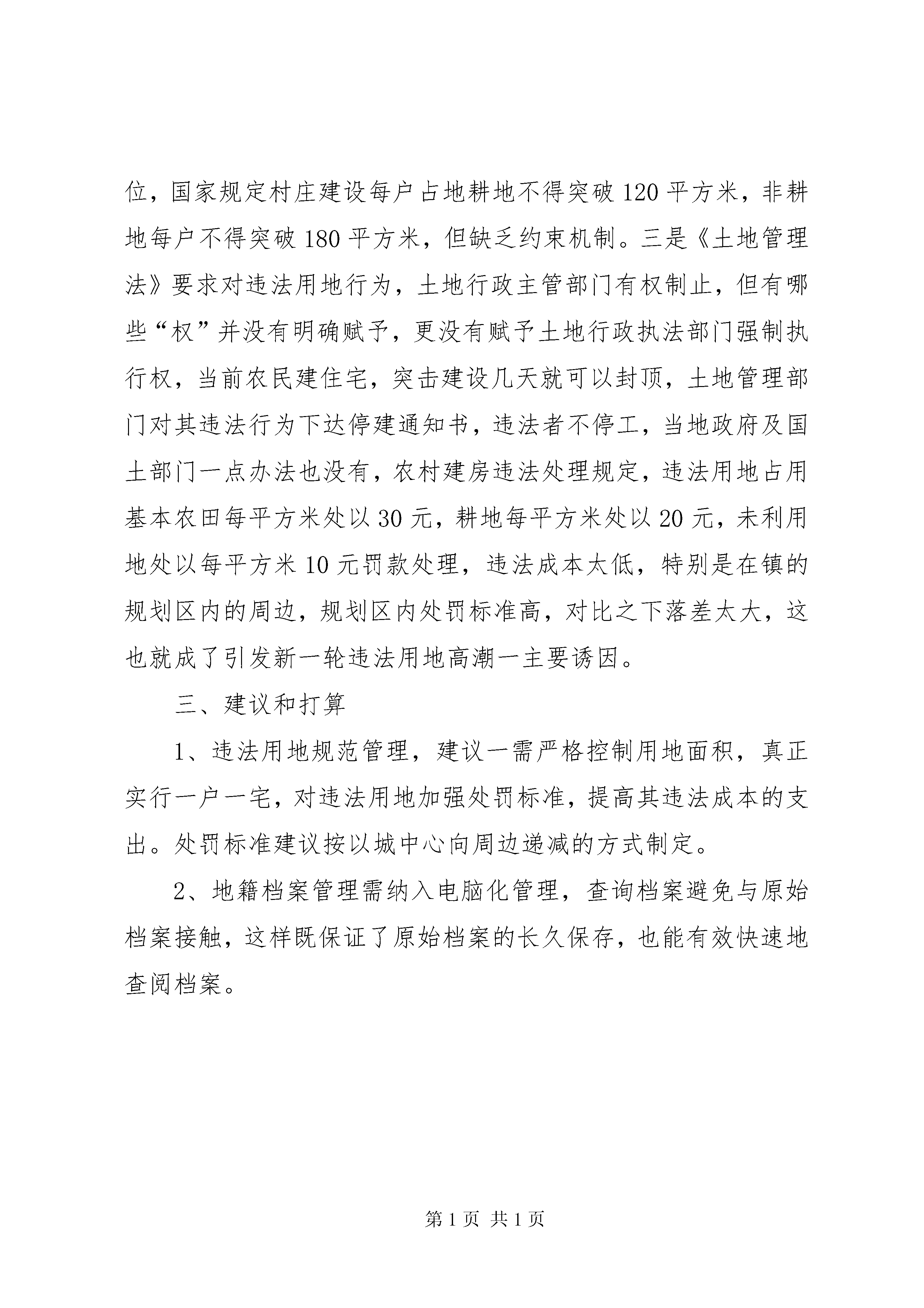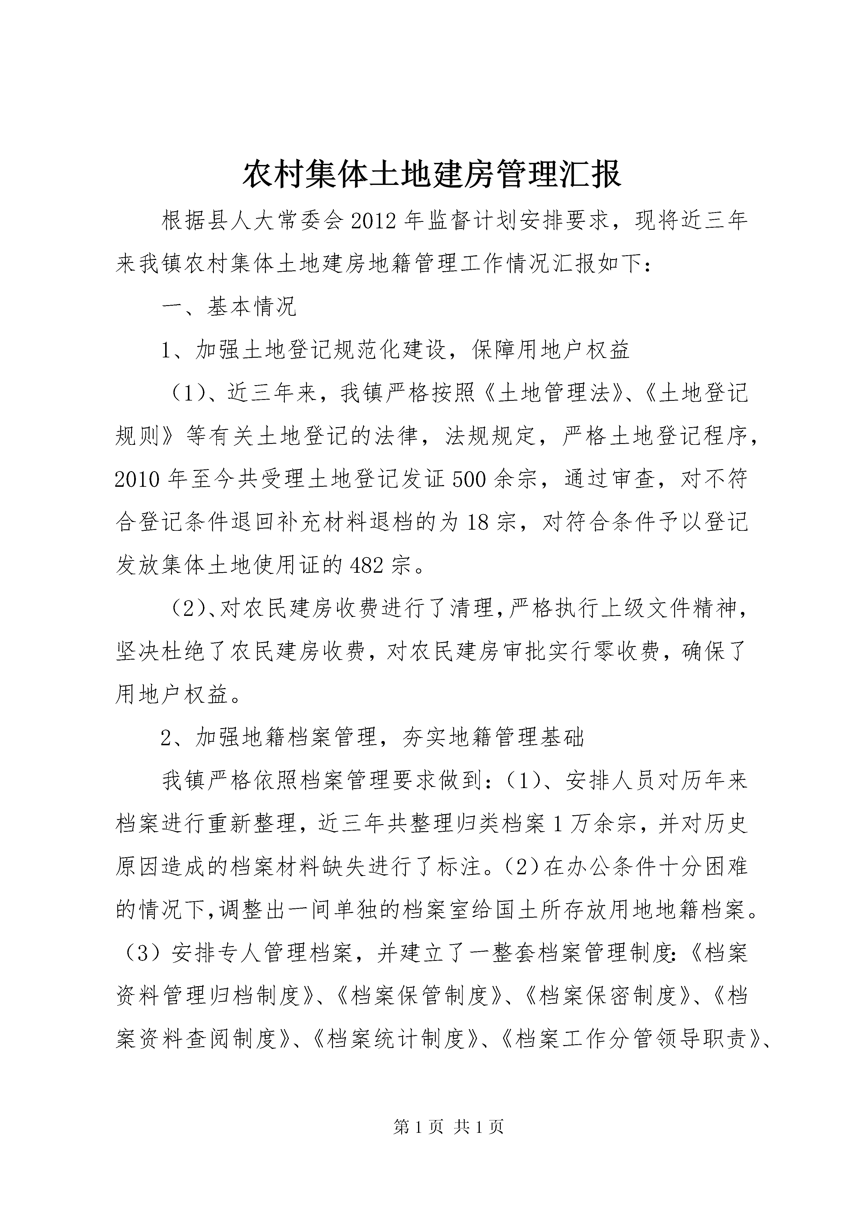 农村集体土地建房管理汇报根据县人大常委会2012年监督计划安排要求,现将近三年来我镇农村集体土地建房地籍管理工作情况汇报如下:一、基本情况1、加强土地登记规范化建设,保障用地户权益(1)、近三年来,我镇严格按照《土地管理法》、《土地登记规则》等有关土地登记的法律,法规规定,严格土地登记程序,2010年至今共受理土地登记发证500余宗,通过审查,对不符合登记条件退回补充材料退档的为18宗,对符合条件予以登记发放集体土地使用证的482宗。(2)、对农民建房收费进行了清理,严格执行上级文件精神,坚决杜绝了农民建房收费,对农民建房审批实行零收费,确保了用地户权益。2、加强地籍档案管理,夯实地籍管理基础我镇严格依照档案管理要求做到:(1)、安排人员对历年来档案进行重新整理,近三年共整理归类档案1万余宗,并对历史原因造成的档案材料缺失进行了标注。(2)在办公条件十分困难的情况下,调整出一间单独的档案室给国土所存放用地地籍档案。(3)安排专人管理档案,并建立了一整套档案管理制度:《档案资料管理归档制度》、《档案保管制度》、《档案保密制度》、《档案资料查阅制度》、《档案统计制度》、《档案工作分管领导职责》、《档案工作人员岗位职责》,严格按照档案管理制度开展工作。积极配合集体土地三权发证技术单位做好了本辖区内三权证的外业调查工作。3、加强土地执法监察,严格查处违法用地近年来随着改革开放和社会经济的不断发展,农村居民生产生活条件有着日新月异的变化,改善居住条件是当今农村居民的首要要求,人地矛盾十分突出,用地指标满足不了需求,违法用地现象有所抬头,为杜绝这一现象漫延,我镇采取了几项措施:(1)、成立了城管执法中队与国土所联合巡查,及时发现并制止违法用地现象,今年初在巡查过程中发现陈坪有非法占用未利用地建围墙现象,当即对该违法用地进行了制止。(2)、聘请辖区内十九个村村主任为土地协管员,要求对所在村内用地情况进行动态监管,及时发现报告违法用地情况。二、存在的困难和问题1、村治理难度大,“一户多宅”现象依然严重,虽说近年来国土部门实行了建新宅退老宅承诺制的做法,但农村居民祖业思想依然占上风,而政府的后续的强力措施并未出台,建新宅退老宅只是光见打雷不见下雨,久而久之成为一空谈制度。2、相关法律法规在实际工作中执行困难。一是无论是国家土地管理法还是地方性法规,对村民占用集体土地都是无偿使用,加强了村民超占面积建房的欲望。二是村庄建设规划缺乏法律地位,国家规定村庄建设每户占地耕地不得突破120平方米,非耕地每户不得突破180平方米,但缺乏约束机制。三是《土地管理法》要求对违法用地行为,土地行政主管部门有权制止,但有哪些“权”并没有明确赋予,更没有赋予土地行政执法部门强制执行权,当前农民建住宅,突击建设几天就可以封顶,土地管理部门对其违法行为下达停建通知书,违法者不停工,当地政府及国土部门一点办法也没有,农村建房违法处理规定,违法用地占用基本农田每平方米处以30元,耕地每平方米处以20元,未利用地处以每平方米10元罚款处理,违法成本太低,特别是在镇的规划区内的周边,规划区内处罚标准高,对比之下落差太大,这也就成了引发新一轮违法用地高潮一主要诱因。三、建议和打算1、违法用地规范管理,建议一需严格控制用地面积,真正实行一户一宅,对违法用地加强处罚标准,提高其违法成本的支出。处罚标准建议按以城中心向周边递减的方式制定。2、地籍档案管理需纳入电脑化管理,查询档案避免与原始档案接触,这样既保证了原始档案的长久保存,也能有效快速地查阅档案。