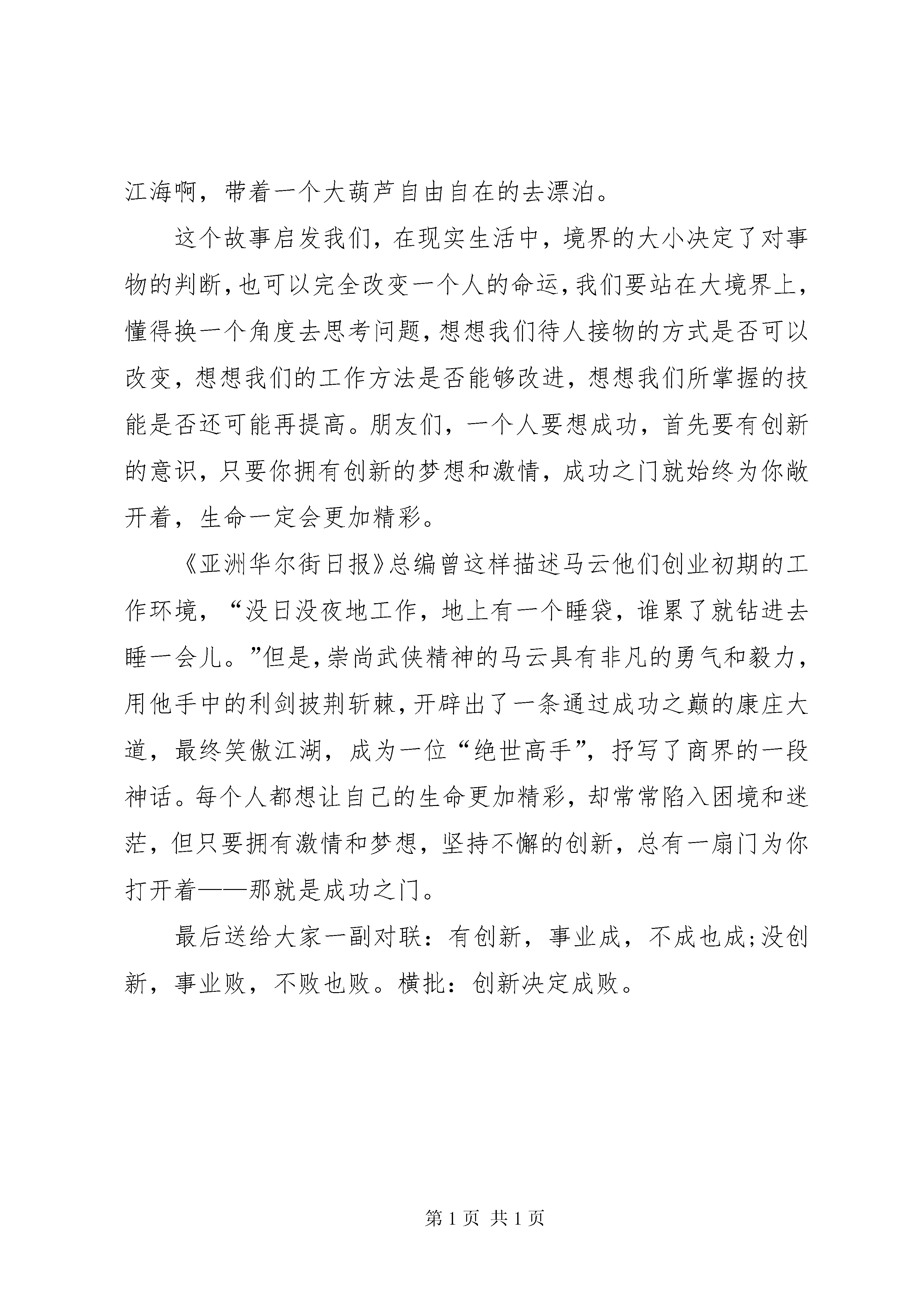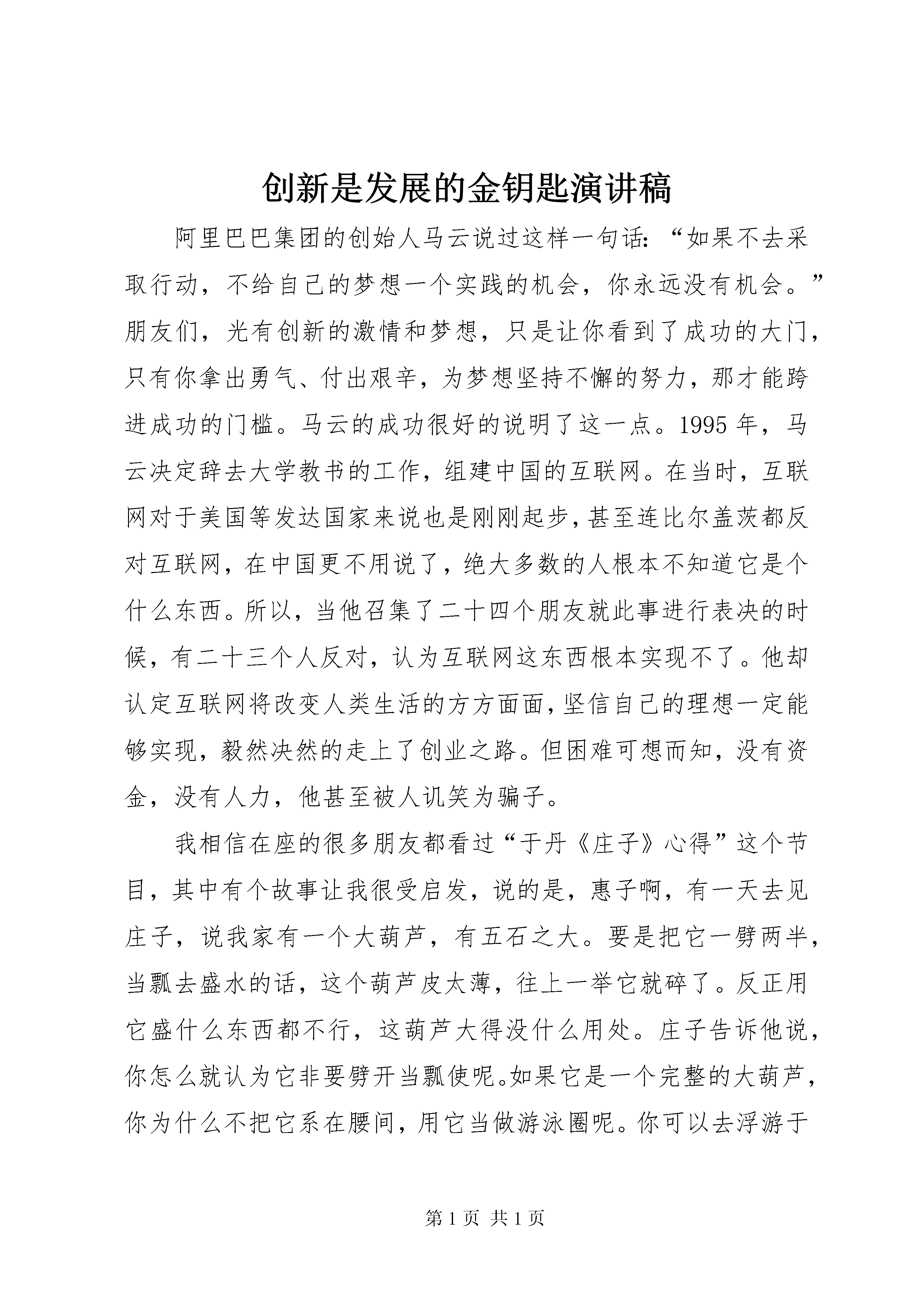 创新是发展的金钥匙演讲稿阿里巴巴集团的创始人马云说过这样一句话:“如果不去采取行动,不给自己的梦想一个实践的机会,你永远没有机会。”朋友们,光有创新的激情和梦想,只是让你看到了成功的大门,只有你拿出勇气、付出艰辛,为梦想坚持不懈的努力,那才能跨进成功的门槛。马云的成功很好的说明了这一点。1995年,马云决定辞去大学教书的工作,组建中国的互联网。在当时,互联网对于美国等发达国家来说也是刚刚起步,甚至连比尔盖茨都反对互联网,在中国更不用说了,绝大多数的人根本不知道它是个什么东西。所以,当他召集了二十四个朋友就此事进行表决的时候,有二十三个人反对,认为互联网这东西根本实现不了。他却认定互联网将改变人类生活的方方面面,坚信自己的理想一定能够实现,毅然决然的走上了创业之路。但困难可想而知,没有资金,没有人力,他甚至被人讥笑为骗子。我相信在座的很多朋友都看过“于丹《庄子》心得”这个节目,其中有个故事让我很受启发,说的是,惠子啊,有一天去见庄子,说我家有一个大葫芦,有五石之大。要是把它一劈两半,当瓢去盛水的话,这个葫芦皮太薄,往上一举它就碎了。反正用它盛什么东西都不行,这葫芦大得没什么用处。庄子告诉他说,你怎么就认为它非要劈开当瓢使呢。如果它是一个完整的大葫芦,你为什么不把它系在腰间,用它当做游泳圈呢。你可以去浮游于江海啊,带着一个大葫芦自由自在的去漂泊。这个故事启发我们,在现实生活中,境界的大小决定了对事物的判断,也可以完全改变一个人的命运,我们要站在大境界上,懂得换一个角度去思考问题,想想我们待人接物的方式是否可以改变,想想我们的工作方法是否能够改进,想想我们所掌握的技能是否还可能再提高。朋友们,一个人要想成功,首先要有创新的意识,只要你拥有创新的梦想和激情,成功之门就始终为你敞开着,生命一定会更加精彩。《亚洲华尔街日报》总编曾这样描述马云他们创业初期的工作环境,“没日没夜地工作,地上有一个睡袋,谁累了就钻进去睡一会儿。”但是,崇尚武侠精神的马云具有非凡的勇气和毅力,用他手中的利剑披荆斩棘,开辟出了一条通过成功之巅的康庄大道,最终笑傲江湖,成为一位“绝世高手”,抒写了商界的一段神话。每个人都想让自己的生命更加精彩,却常常陷入困境和迷茫,但只要拥有激情和梦想,坚持不懈的创新,总有一扇门为你打开着——那就是成功之门。最后送给大家一副对联:有创新,事业成,不成也成;没创新,事业败,不败也败。横批:创新决定成败。