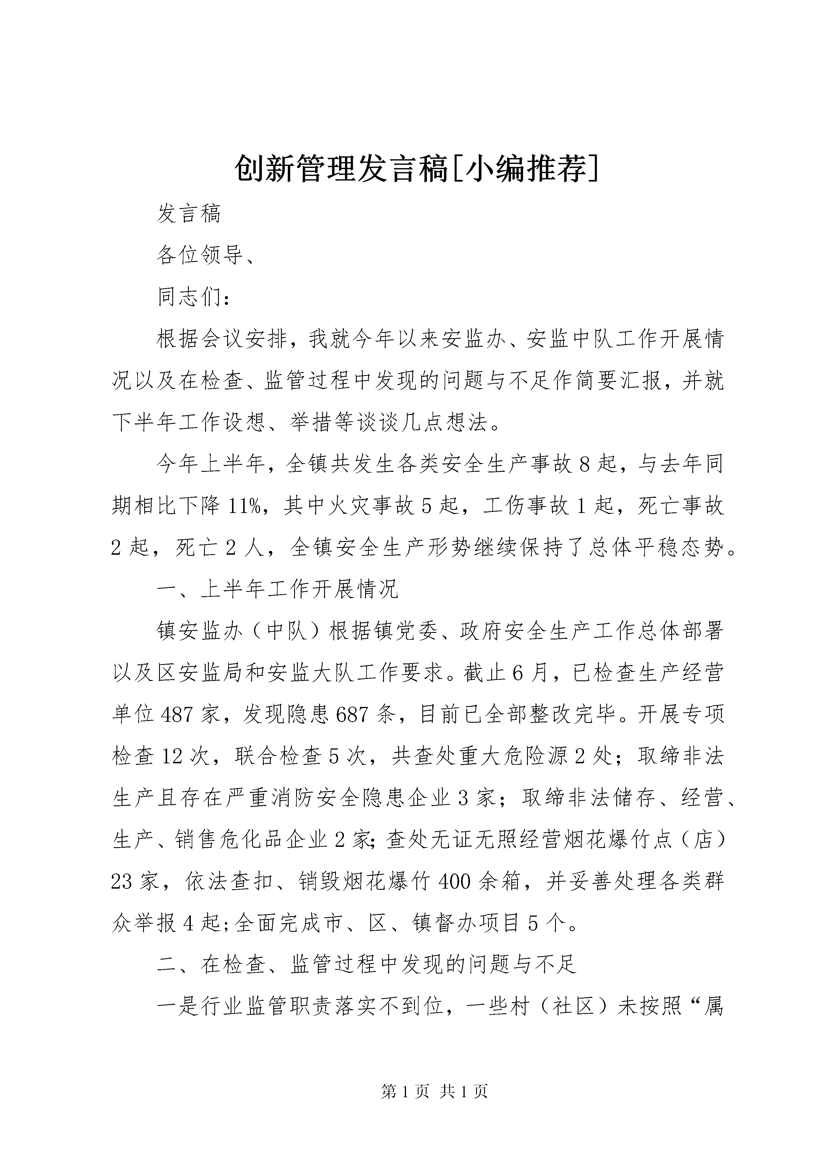 创新管理发言稿[小编推荐]发言稿各位领导、同志们:根据会议安排,我就今年以来安监办、安监中队工作开展情况以及在检查、监管过程中发现的问题与不足作简要汇报,并就下半年工作设想、举措等谈谈几点想法。今年上半年,全镇共发生各类安全生产事故8起,与去年同期相比下降11%,其中火灾事故5起,工伤事故1起,死亡事故2起,死亡2人,全镇安全生产形势继续保持了总体平稳态势。一、上半年工作开展情况镇安监办(中队)根据镇党委、政府安全生产工作总体部署以及区安监局和安监大队工作要求。截止6月,已检查生产经营单位487家,发现隐患687条,目前已全部整改完毕。开展专项检查12次,联合检查5次,共查处重大危险源2处;取缔非法生产且存在严重消防安全隐患企业3家;取缔非法储存、经营、生产、销售危化品企业2家;查处无证无照经营烟花爆竹点(店)23家,依法查扣、销毁烟花爆竹400余箱,并妥善处理各类群众举报4起;全面完成市、区、镇督办项目5个。二、在检查、监管过程中发现的问题与不足一是行业监管职责落实不到位,一些村(社区)未按照“属地管理”原则部署落实安全生产工作,有些单位和部门对发现的隐患和问题采取“能避则避”的态度。二是部分企业对安全生产工作的重要性认识不够,主体责任落实不到位,没把安全生产工作摆到议事日程,企业领导安全意识不强,管理混乱,管理和监督松懈,降低标准,缺少安全投入。三是培训教育不到位。部分企业对三新人员(即:新招收、新调入的职工、来厂实习的学生或其他人员)的三级安全教育(即:厂级安全教育,车间安全教育和班组安全教育)落实不到位,老员工麻痹大意,安全意识日益淡薄,新员工缺少培训,盲目跟风,导致事故发1生。三、下半年工作打算及措施(一)建立健全对安全隐患的抄告、通报制度。为及时解决存在的安全隐患,提高应急处置能力。安委会建立了对安全隐患抄告、通报制度,把安监办(中队)平时检查到的安全隐患抄告给相关主管部门和所在区域管理单位,并报分管领导。如抄告后相关单位未及时处置解决将在全镇进行通报。(二)加大检查力度,提高检查效果。由于全镇企业数量多,基础薄弱,安全隐患众多,仅依靠安监办(中队)难以对全镇的安全隐患进行全面的排查和整治。下阶段我们将借助综治办联合巡查小组的力量,增加专项检查次数,加大专项整治力度,提高检查效果。(三)进一步完善村级安全管理员队伍建设。突出“基层和基础”工作,进一步落实属地管理原则,各村(社区)要进一步完善安全管理员队伍建设,下一步将根据企业分布情况,在部分村(社区)建立专职安全监管队伍,来加强平时检查力度。安监办已印制了日常检查记录表,现已发放到各村(社区),要求各村(社区)每月检查企业不得少于15家,并将检查记录表报到安监办。(四)进一步加强安全生产培训和教育力度。继续加强安全培训教育工作,加大对企业主要负责人、安全管理人员、特种作业人员的培训力度,切实增强从业人员的安全意识和操作技能,逐步提高企业的安全管理水平,深入开展“三级”教育。(六)进一步加强重大隐患排查与治理工作。继续深入开展隐患排查治理工作,针对事故隐患多发单位和薄弱环节及重点部位,大力开展“高强度、有深度”的隐患排查工作。按照重点突出、覆盖全镇的原则,切实加强安全监管,确保隐患排查治理不留盲点、不存死角。突出重大危险源监控和重大事故隐患整改,着重抓好重大危险源监控管理体系和重大事故隐患单位排查及整改落实。甪直镇安监办