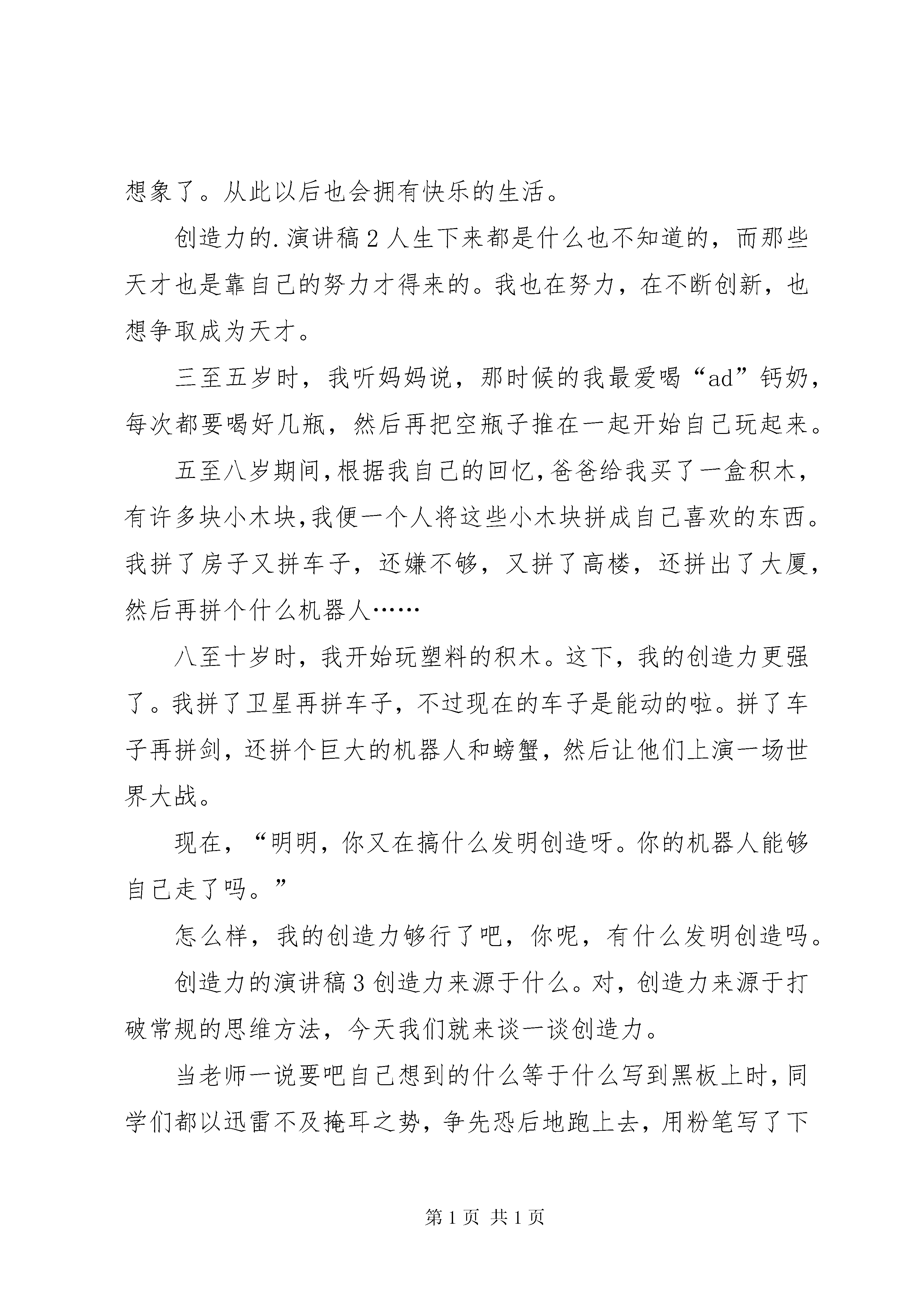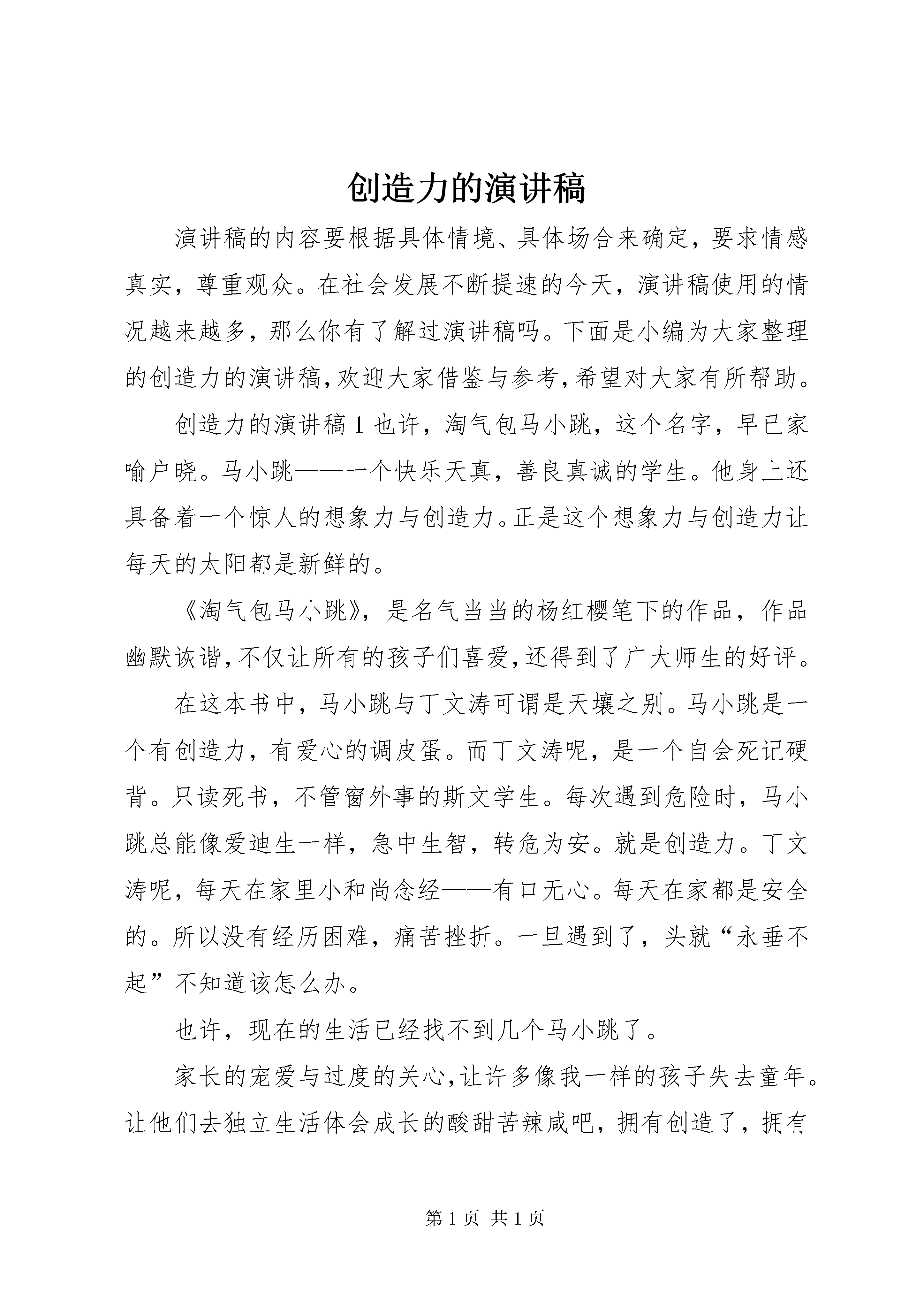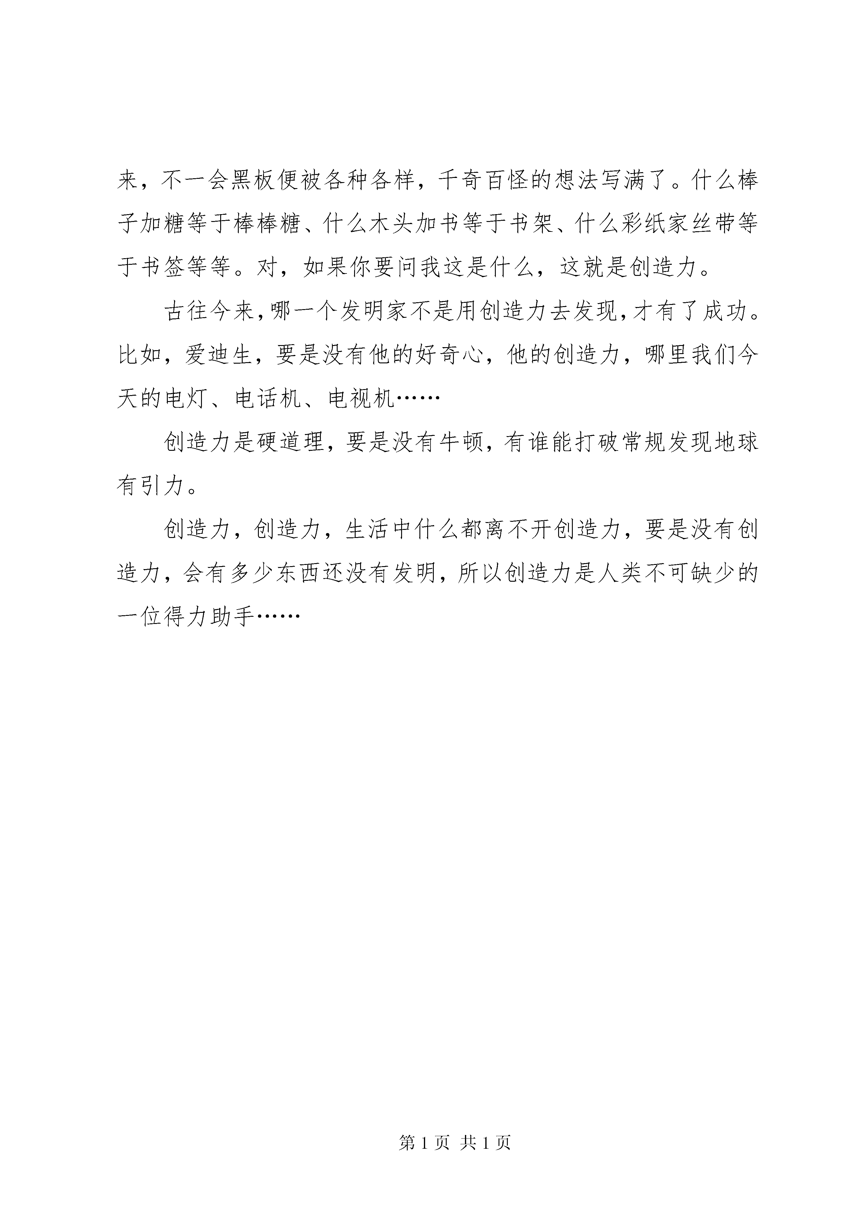 创造力的演讲稿演讲稿的内容要根据具体情境、具体场合来确定,要求情感真实,尊重观众。在社会发展不断提速的今天,演讲稿使用的情况越来越多,那么你有了解过演讲稿吗。下面是小编为大家整理的创造力的演讲稿,欢迎大家借鉴与参考,希望对大家有所帮助。创造力的演讲稿1也许,淘气包马小跳,这个名字,早已家喻户晓。马小跳——一个快乐天真,善良真诚的学生。他身上还具备着一个惊人的想象力与创造力。正是这个想象力与创造力让每天的太阳都是新鲜的。《淘气包马小跳》,是名气当当的杨红樱笔下的作品,作品幽默诙谐,不仅让所有的孩子们喜爱,还得到了广大师生的好评。在这本书中,马小跳与丁文涛可谓是天壤之别。马小跳是一个有创造力,有爱心的调皮蛋。而丁文涛呢,是一个自会死记硬背。只读死书,不管窗外事的斯文学生。每次遇到危险时,马小跳总能像爱迪生一样,急中生智,转危为安。就是创造力。丁文涛呢,每天在家里小和尚念经——有口无心。每天在家都是安全的。所以没有经历困难,痛苦挫折。一旦遇到了,头就“永垂不起”不知道该怎么办。也许,现在的生活已经找不到几个马小跳了。家长的宠爱与过度的关心,让许多像我一样的孩子失去童年。让他们去独立生活体会成长的酸甜苦辣咸吧,拥有创造了,拥有想象了。从此以后也会拥有快乐的生活。创造力的.演讲稿2人生下来都是什么也不知道的,而那些天才也是靠自己的努力才得来的。我也在努力,在不断创新,也想争取成为天才。三至五岁时,我听妈妈说,那时候的我最爱喝“ad”钙奶,每次都要喝好几瓶,然后再把空瓶子推在一起开始自己玩起来。五至八岁期间,根据我自己的回忆,爸爸给我买了一盒积木,有许多块小木块,我便一个人将这些小木块拼成自己喜欢的东西。我拼了房子又拼车子,还嫌不够,又拼了高楼,还拼出了大厦,然后再拼个什么机器人……八至十岁时,我开始玩塑料的积木。这下,我的创造力更强了。我拼了卫星再拼车子,不过现在的车子是能动的啦。拼了车子再拼剑,还拼个巨大的机器人和螃蟹,然后让他们上演一场世界大战。现在,“明明,你又在搞什么发明创造呀。你的机器人能够自己走了吗。”怎么样,我的创造力够行了吧,你呢,有什么发明创造吗。创造力的演讲稿3创造力来源于什么。对,创造力来源于打破常规的思维方法,今天我们就来谈一谈创造力。当老师一说要吧自己想到的什么等于什么写到黑板上时,同学们都以迅雷不及掩耳之势,争先恐后地跑上去,用粉笔写了下来,不一会黑板便被各种各样,千奇百怪的想法写满了。什么棒子加糖等于棒棒糖、什么木头加书等于书架、什么彩纸家丝带等于书签等等。对,如果你要问我这是什么,这就是创造力。古往今来,哪一个发明家不是用创造力去发现,才有了成功。比如,爱迪生,要是没有他的好奇心,他的创造力,哪里我们今天的电灯、电话机、电视机……创造力是硬道理,要是没有牛顿,有谁能打破常规发现地球有引力。创造力,创造力,生活中什么都离不开创造力,要是没有创造力,会有多少东西还没有发明,所以创造力是人类不可缺少的一位得力助手……