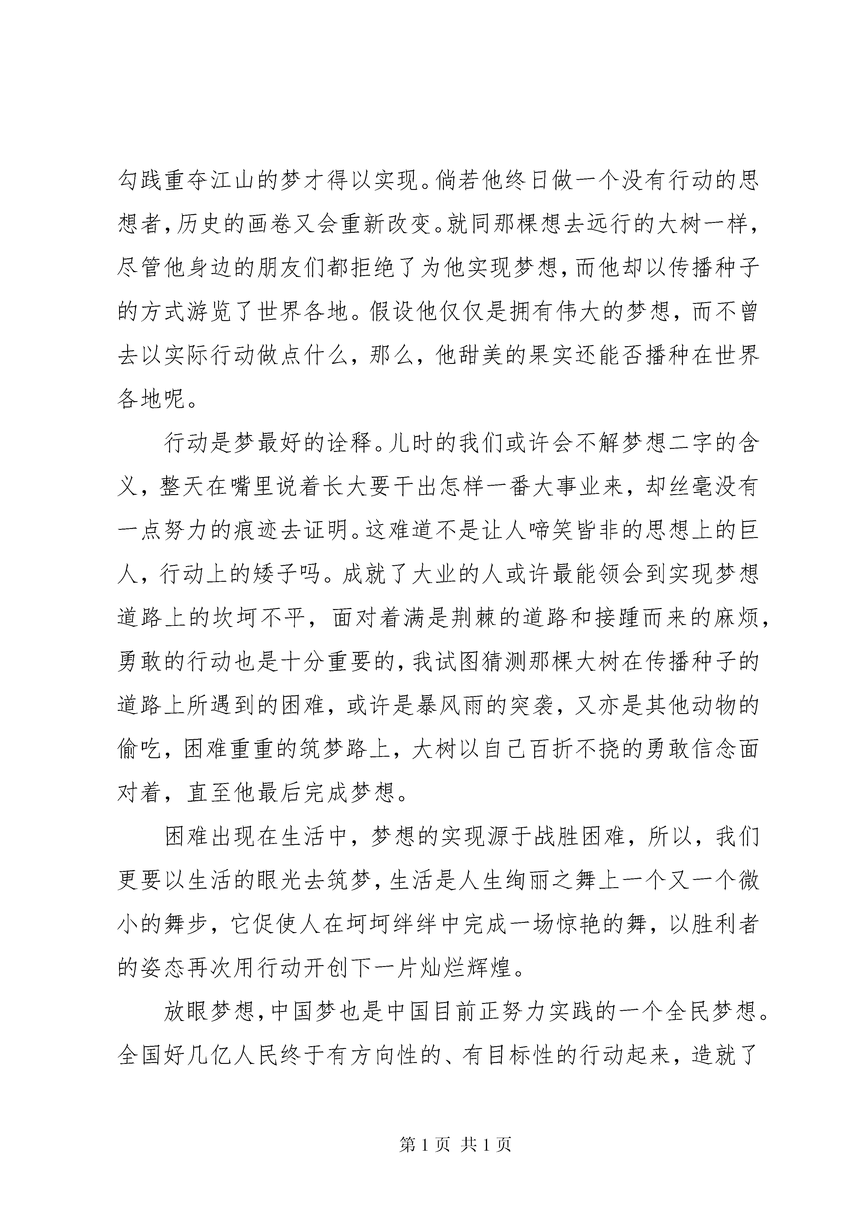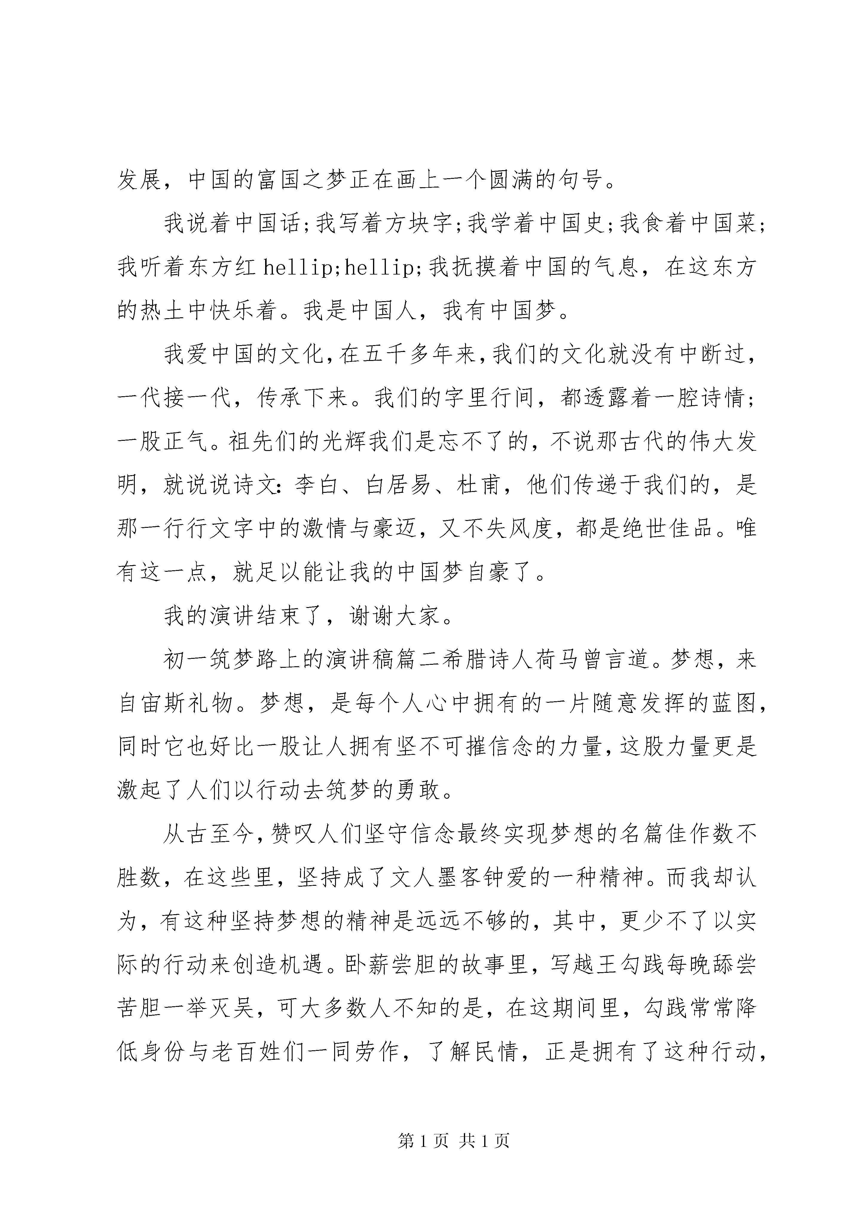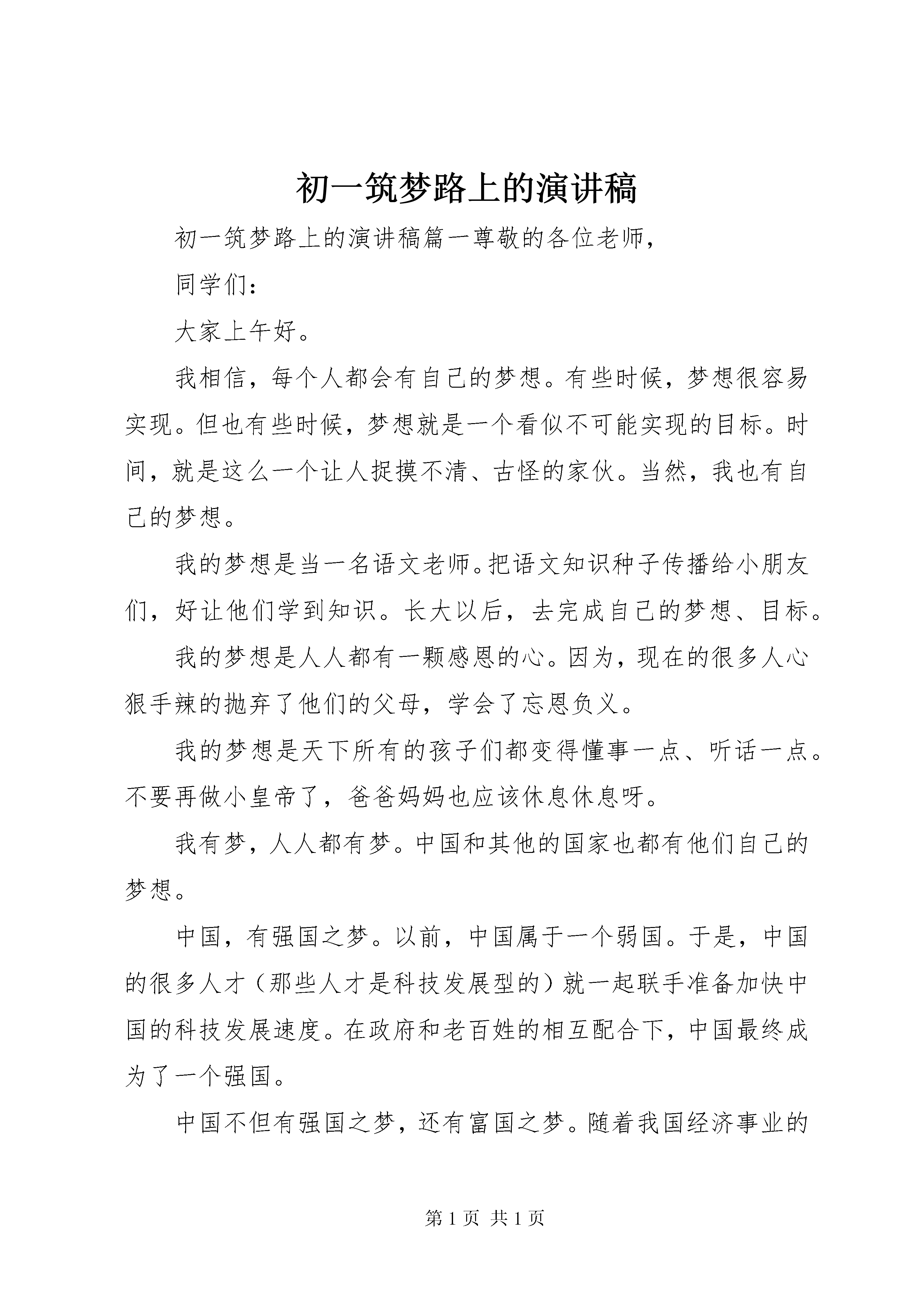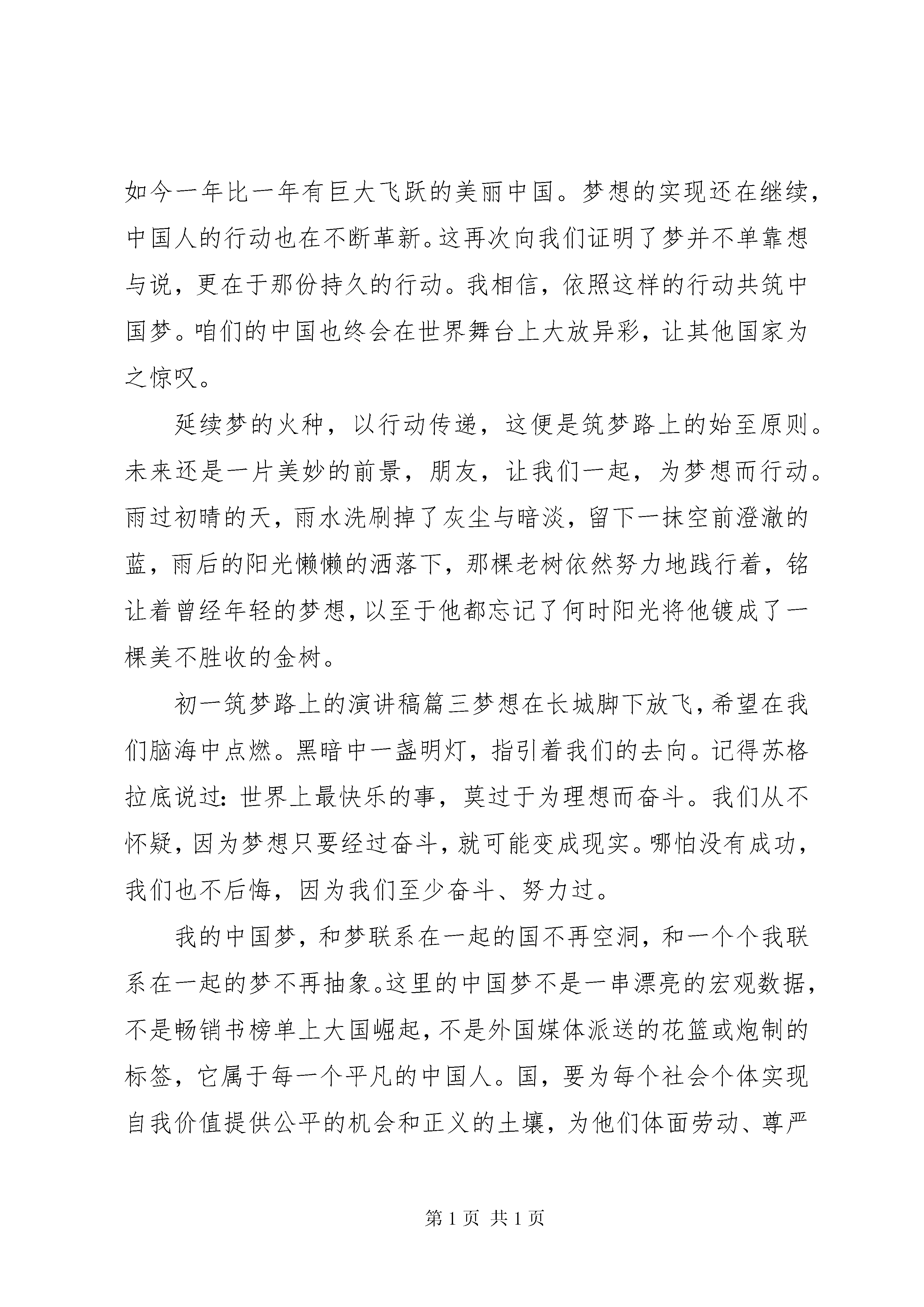初一筑梦路上的演讲稿初一筑梦路上的演讲稿篇一尊敬的各位老师,同学们:大家上午好。我相信,每个人都会有自己的梦想。有些时候,梦想很容易实现。但也有些时候,梦想就是一个看似不可能实现的目标。时间,就是这么一个让人捉摸不清、古怪的家伙。当然,我也有自己的梦想。我的梦想是当一名语文老师。把语文知识种子传播给小朋友们,好让他们学到知识。长大以后,去完成自己的梦想、目标。我的梦想是人人都有一颗感恩的心。因为,现在的很多人心狠手辣的抛弃了他们的父母,学会了忘恩负义。我的梦想是天下所有的孩子们都变得懂事一点、听话一点。不要再做小皇帝了,爸爸妈妈也应该休息休息呀。我有梦,人人都有梦。中国和其他的国家也都有他们自己的梦想。中国,有强国之梦。以前,中国属于一个弱国。于是,中国的很多人才(那些人才是科技发展型的)就一起联手准备加快中国的科技发展速度。在政府和老百姓的相互配合下,中国最终成为了一个强国。中国不但有强国之梦,还有富国之梦。随着我国经济事业的发展,中国的富国之梦正在画上一个圆满的句号。我说着中国话;我写着方块字;我学着中国史;我食着中国菜;我听着东方红hellip;hellip;我抚摸着中国的气息,在这东方的热土中快乐着。我是中国人,我有中国梦。我爱中国的文化,在五千多年来,我们的文化就没有中断过,一代接一代,传承下来。我们的字里行间,都透露着一腔诗情;一股正气。祖先们的光辉我们是忘不了的,不说那古代的伟大发明,就说说诗文:李白、白居易、杜甫,他们传递于我们的,是那一行行文字中的激情与豪迈,又不失风度,都是绝世佳品。唯有这一点,就足以能让我的中国梦自豪了。我的演讲结束了,谢谢大家。初一筑梦路上的演讲稿篇二希腊诗人荷马曾言道。梦想,来自宙斯礼物。梦想,是每个人心中拥有的一片随意发挥的蓝图,同时它也好比一股让人拥有坚不可摧信念的力量,这股力量更是激起了人们以行动去筑梦的勇敢。从古至今,赞叹人们坚守信念最终实现梦想的名篇佳作数不胜数,在这些里,坚持成了文人墨客钟爱的一种精神。而我却认为,有这种坚持梦想的精神是远远不够的,其中,更少不了以实际的行动来创造机遇。卧薪尝胆的故事里,写越王勾践每晚舔尝苦胆一举灭吴,可大多数人不知的是,在这期间里,勾践常常降低身份与老百姓们一同劳作,了解民情,正是拥有了这种行动,勾践重夺江山的梦才得以实现。倘若他终日做一个没有行动的思想者,历史的画卷又会重新改变。就同那棵想去远行的大树一样,尽管他身边的朋友们都拒绝了为他实现梦想,而他却以传播种子的方式游览了世界各地。假设他仅仅是拥有伟大的梦想,而不曾去以实际行动做点什么,那么,他甜美的果实还能否播种在世界各地呢。行动是梦最好的诠释。儿时的我们或许会不解梦想二字的含义,整天在嘴里说着长大要干出怎样一番大事业来,却丝毫没有一点努力的痕迹去证明。这难道不是让人啼笑皆非的思想上的巨人,行动上的矮子吗。成就了大业的人或许最能领会到实现梦想道路上的坎坷不平,面对着满是荆棘的道路和接踵而来的麻烦,勇敢的行动也是十分重要的,我试图猜测那棵大树在传播种子的道路上所遇到的困难,或许是暴风雨的突袭,又亦是其他动物的偷吃,困难重重的筑梦路上,大树以自己百折不挠的勇敢信念面对着,直至他最后完成梦想。困难出现在生活中,梦想的实现源于战胜困难,所以,我们更要以生活的眼光去筑梦,生活是人生绚丽之舞上一个又一个微小的舞步,它促使人在坷坷绊绊中完成一场惊艳的舞,以胜利者的姿态再次用行动开创下一片灿烂辉煌。放眼梦想,中国梦也是中国目前正努力实践的一个全民梦想。全国好几亿人民终于有方向性的、有目标性的行动起来,造就了如今一年比一年有巨大飞跃的美丽中国。梦想的实现还在继续,中国人的行动也在不断革新。这再次向我们证明了梦并不单靠想与说,更在于那份持久的行动。我相信,依照这样的行动共筑中国梦。咱们的中国也终会在世界舞台上大放异彩,让其他国家为之惊叹。延续梦的火种,以行动传递,这便是筑梦路上的始至原则。未来还是一片美妙的前景,朋友,让我们一起,为梦想而行动。雨过初晴的天,雨水洗刷掉了灰尘与暗淡,留下一抹空前澄澈的蓝,雨后的阳光懒懒的洒落下,那棵老树依然努力地践行着,铭让着曾经年轻的梦想,以至于他都忘记了何时阳光将他镀成了一棵美不胜收的金树。初一筑梦路上的演讲稿篇三梦想在长城脚下放飞,希望在我们脑海中点燃。黑暗中一盏明灯,指引着我们的去向。记得苏格拉底说过:世界上最快乐的事,莫过于为理想而奋斗。我们从不怀疑,因为梦想只要经过奋斗,就可能变成现实。哪怕没有成功,我们也不后悔,因为我们至少奋斗、努力过。我的中国梦,和梦联系在一起的国不再空洞,和一个个我联系在一起的梦不再抽象。这里的中国梦不是一串漂亮的宏观数据,不是畅销书榜单上大国崛起,不是外国媒体派送的花篮或炮制的标签,它属于每一个平凡的中国人。国