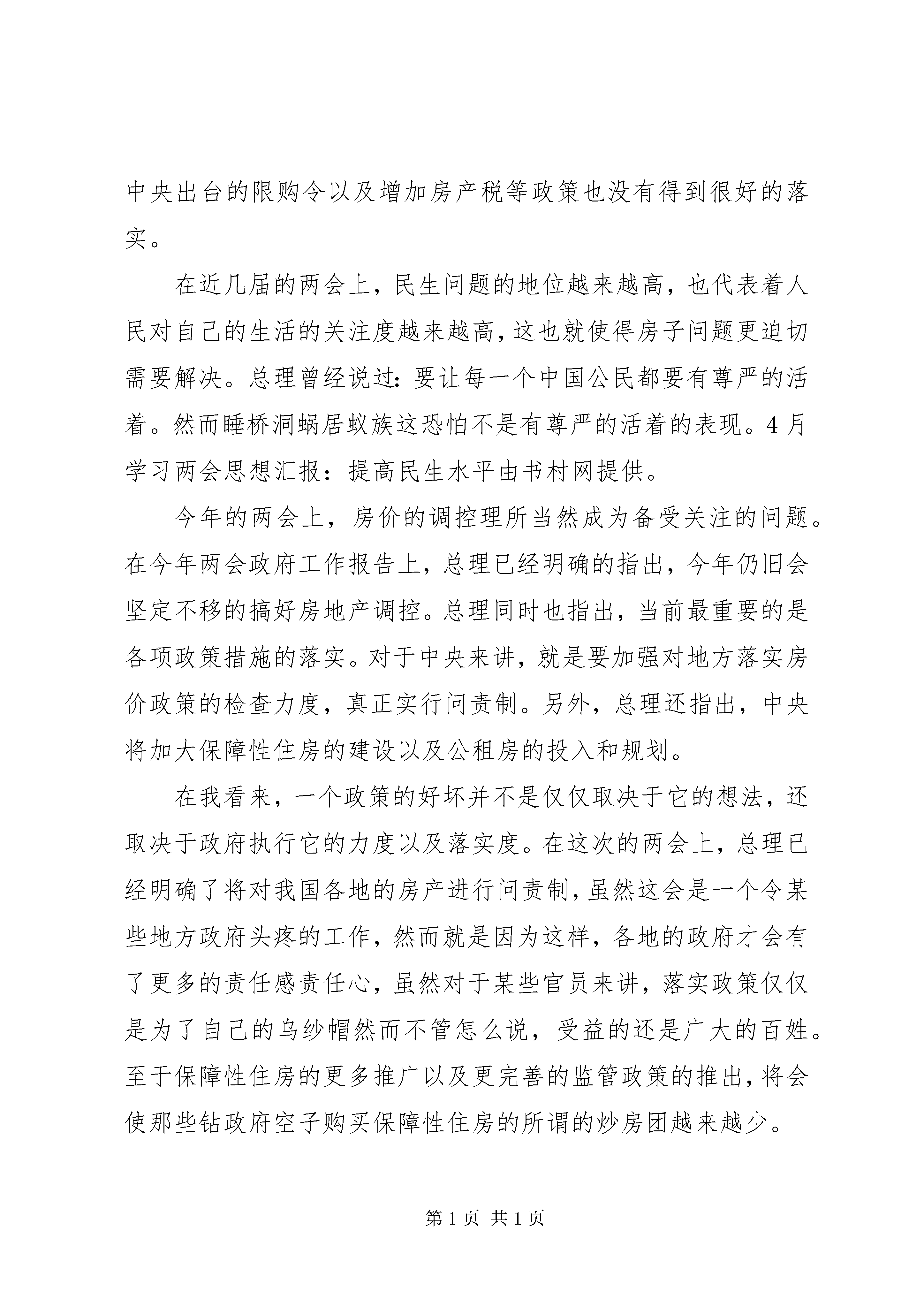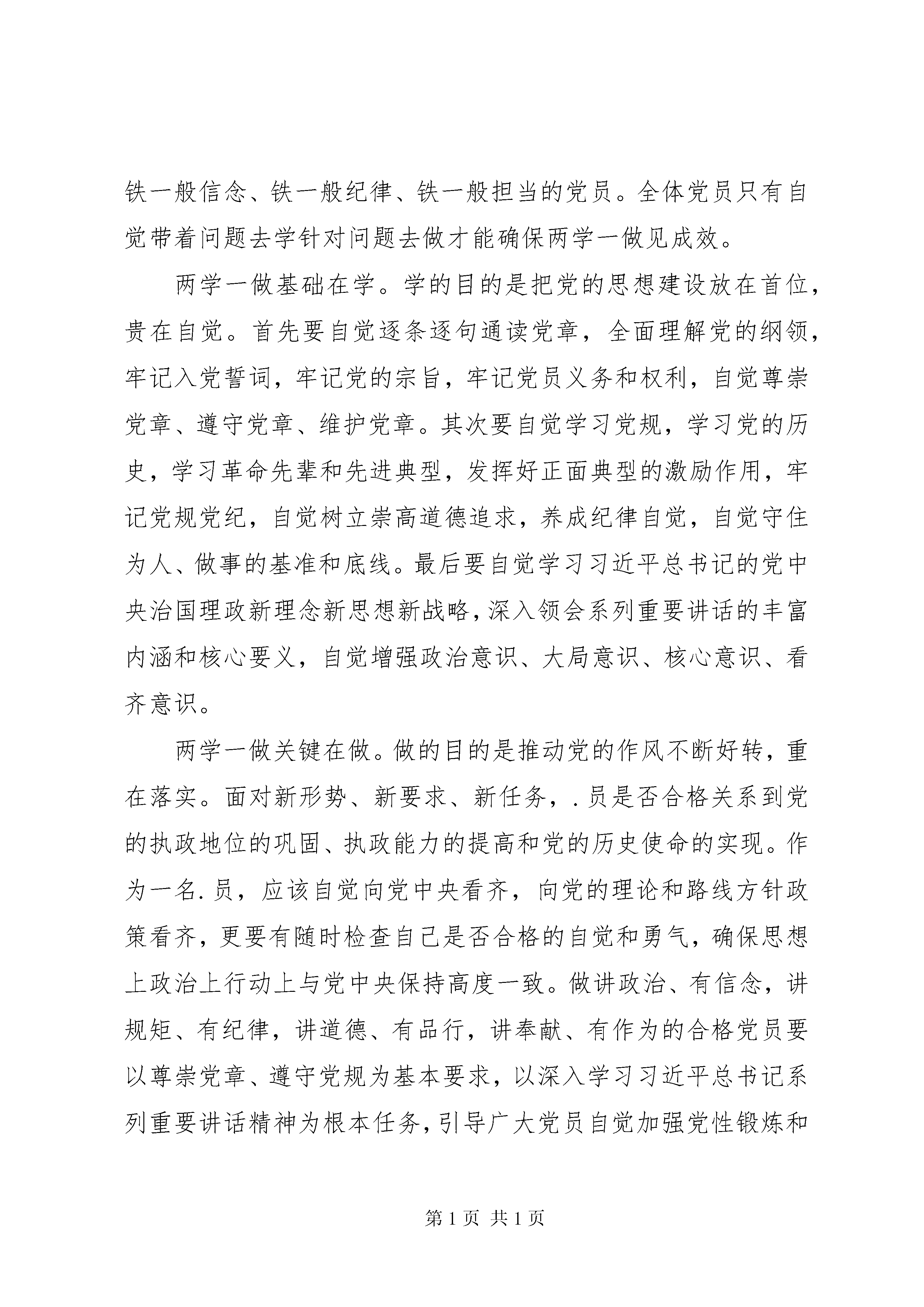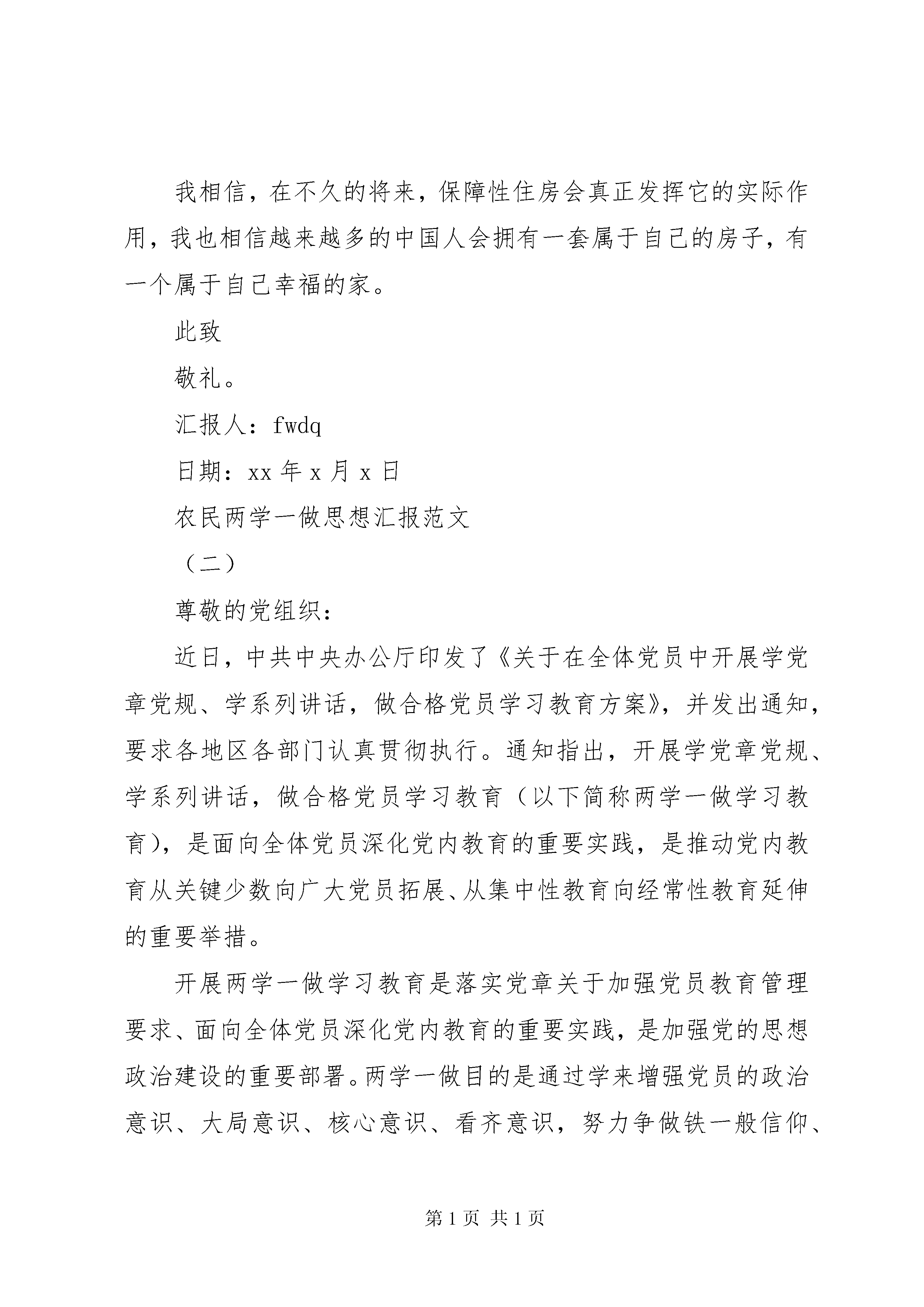 农民20XX年两学一做思想汇报作为一名员,应该自觉向党中央看齐,向党的理论和路线方针政策看齐,以下范文大全小编为大家提供两学一做思想汇报范文,供大家参考借鉴,希望可以帮助到大家。农民两学一做思想汇报范文(一)敬爱的党组织:自古以来,国人就对家土地看得很重,房子在国人眼中已经成为一个完整的家的代名词了。然而目前房价飞涨,即使有时房价下跌,开发商也打出了诸如房价不是在跳水,而是在做俯卧撑此类令人发笑却又让人深思的广告语。而网上盛行的说法是,想在北京买套百平米的房,农民需要从唐朝就开始存钱,还不能有灾年;工人月收入1500,要从鸦片战争开始存;白领年收入16万,要从1960年不吃不喝,才能如愿。你还笑得出来吗。房子思想根深蒂固,或许是房价飞涨的原因。然而面对不知何时开始飞涨的房价,国家屡次出台政策却又被投机的商家钻了空子。曾经在2006年,有消息称央行拟推新按揭政策以彻底打压房价,回首当时,不仅国家,连老百姓的信心都很足,因为这一政策的核心是将买房的首付提高到四到五成。这在当时看来是一剂有史以来调控房价最猛烈最有希望的药剂。然而这项政策是否得到真正的实施看现在的状况我想已经很明了吧。另外,即使中央出台的限购令以及增加房产税等政策也没有得到很好的落实。在近几届的两会上,民生问题的地位越来越高,也代表着人民对自己的生活的关注度越来越高,这也就使得房子问题更迫切需要解决。总理曾经说过:要让每一个中国公民都要有尊严的活着。然而睡桥洞蜗居蚁族这恐怕不是有尊严的活着的表现。4月学习两会思想汇报:提高民生水平由书村网提供。今年的两会上,房价的调控理所当然成为备受关注的问题。在今年两会政府工作报告上,总理已经明确的指出,今年仍旧会坚定不移的搞好房地产调控。总理同时也指出,当前最重要的是各项政策措施的落实。对于中央来讲,就是要加强对地方落实房价政策的检查力度,真正实行问责制。另外,总理还指出,中央将加大保障性住房的建设以及公租房的投入和规划。在我看来,一个政策的好坏并不是仅仅取决于它的想法,还取决于政府执行它的力度以及落实度。在这次的两会上,总理已经明确了将对我国各地的房产进行问责制,虽然这会是一个令某些地方政府头疼的工作,然而就是因为这样,各地的政府才会有了更多的责任感责任心,虽然对于某些官员来讲,落实政策仅仅是为了自己的乌纱帽然而不管怎么说,受益的还是广大的百姓。至于保障性住房的更多推广以及更完善的监管政策的推出,将会使那些钻政府空子购买保障性住房的所谓的炒房团越来越少。我相信,在不久的将来,保障性住房会真正发挥它的实际作用,我也相信越来越多的中国人会拥有一套属于自己的房子,有一个属于自己幸福的家。此致敬礼。汇报人:fwdq日期:xx年x月x日农民两学一做思想汇报范文(二)尊敬的党组织:近日,中共中央办公厅印发了《关于在全体党员中开展学党章党规、学系列讲话,做合格党员学习教育方案》,并发出通知,要求各地区各部门认真贯彻执行。通知指出,开展学党章党规、学系列讲话,做合格党员学习教育(以下简称两学一做学习教育),是面向全体党员深化党内教育的重要实践,是推动党内教育从关键少数向广大党员拓展、从集中性教育向经常性教育延伸的重要举措。开展两学一做学习教育是落实党章关于加强党员教育管理要求、面向全体党员深化党内教育的重要实践,是加强党的思想政治建设的重要部署。两学一做目的是通过学来增强党员的政治意识、大局意识、核心意识、看齐意识,努力争做铁一般信仰、铁一般信念、铁一般纪律、铁一般担当的党员。全体党员只有自觉带着问题去学针对问题去做才能确保两学一做见成效。两学一做基础在学。学的目的是把党的思想建设放在首位,贵在自觉。首先要自觉逐条逐句通读党章,全面理解党的纲领,牢记入党誓词,牢记党的宗旨,牢记党员义务和权利,自觉尊崇党章、遵守党章、维护党章。其次要自觉学习党规,学习党的历史,学习革命先辈和先进典型,发挥好正面典型的激励作用,牢记党规党纪,自觉树立崇高道德追求,养成纪律自觉,自觉守住为人、做事的基准和底线。最后要自觉学习习近平总书记的党中央治国理政新理念新思想新战略,深入领会系列重要讲话的丰富内涵和核心要义,自觉增强政治意识、大局意识、核心意识、看齐意识。两学一做关键在做。做的目的是推动党的作风不断好转,重在落实。面对新形势、新要求、新任务,.员是否合格关系到党的执政地位的巩固、执政能力的提高和党的历史使命的实现。作为一名.员,应该自觉向党中央看齐,向党的理论和路线方针政策看齐,更要有随时检查自己是否合格的自觉和勇气,确保思想上政治上行动上与党中央保持高度一致。做讲政治、有信念,讲规矩、有纪律,讲道德、有品行,讲奉献、有作为的合格党员要以尊崇党章、遵守党规为基本要求,以深入学习习近平总书记系列重要讲话精神为根本任务,引导广大党员自觉加强