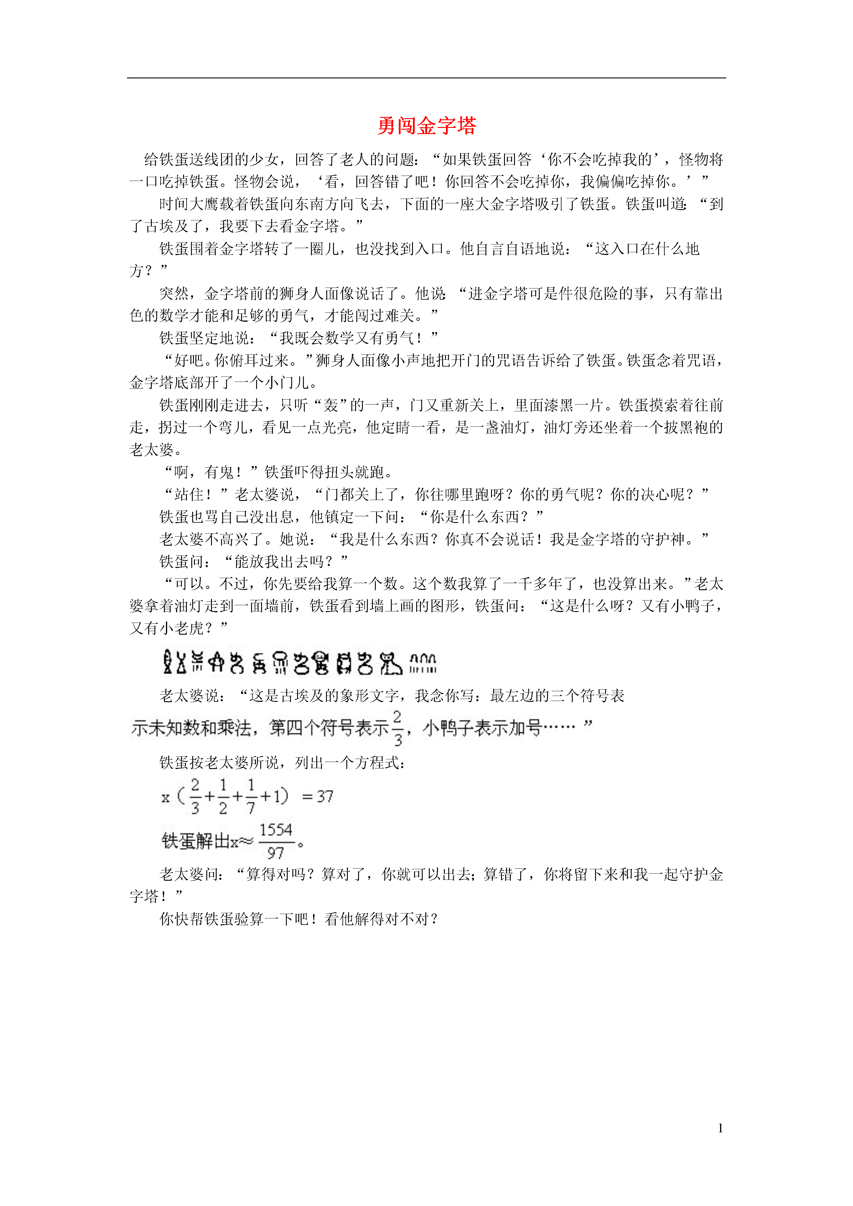 1勇闯金字塔给铁蛋送线团的少女,回答了老人的问题:“如果铁蛋回答‘你不会吃掉我的’,怪物将一口吃掉铁蛋。怪物会说,‘看,回答错了吧!你回答不会吃掉你,我偏偏吃掉你。’”时间大鹰载着铁蛋向东南方向飞去,下面的一座大金字塔吸引了铁蛋。铁蛋叫道:“到了古埃及了,我要下去看金字塔。”铁蛋围着金字塔转了一圈儿,也没找到入口。他自言自语地说:“这入口在什么地方?”突然,金字塔前的狮身人面像说话了。他说:“进金字塔可是件很危险的事,只有靠出色的数学才能和足够的勇气,才能闯过难关。”铁蛋坚定地说:“我既会数学又有勇气!”“好吧。你俯耳过来。”狮身人面像小声地把开门的咒语告诉给了铁蛋。铁蛋念着咒语,金字塔底部开了一个小门儿。铁蛋刚刚走进去,只听“轰”的一声,门又重新关上,里面漆黑一片。铁蛋摸索着往前走,拐过一个弯儿,看见一点光亮,他定睛一看,是一盏油灯,油灯旁还坐着一个披黑袍的老太婆。“啊,有鬼!”铁蛋吓得扭头就跑。“站住!”老太婆说,“门都关上了,你往哪里跑呀?你的勇气呢?你的决心呢?”铁蛋也骂自己没出息,他镇定一下问:“你是什么东西?”老太婆不高兴了。她说:“我是什么东西?你真不会说话!我是金字塔的守护神。”铁蛋问:“能放我出去吗?”“可以。不过,你先要给我算一个数。这个数我算了一千多年了,也没算出来。”老太婆拿着油灯走到一面墙前,铁蛋看到墙上画的图形,铁蛋问:“这是什么呀?又有小鸭子,又有小老虎?”老太婆说:“这是古埃及的象形文字,我念你写:最左边的三个符号表铁蛋按老太婆所说,列出一个方程式:老太婆问:“算得对吗?算对了,你就可以出去;算错了,你将留下来和我一起守护金字塔!”你快帮铁蛋验算一下吧!看他解得对不对?