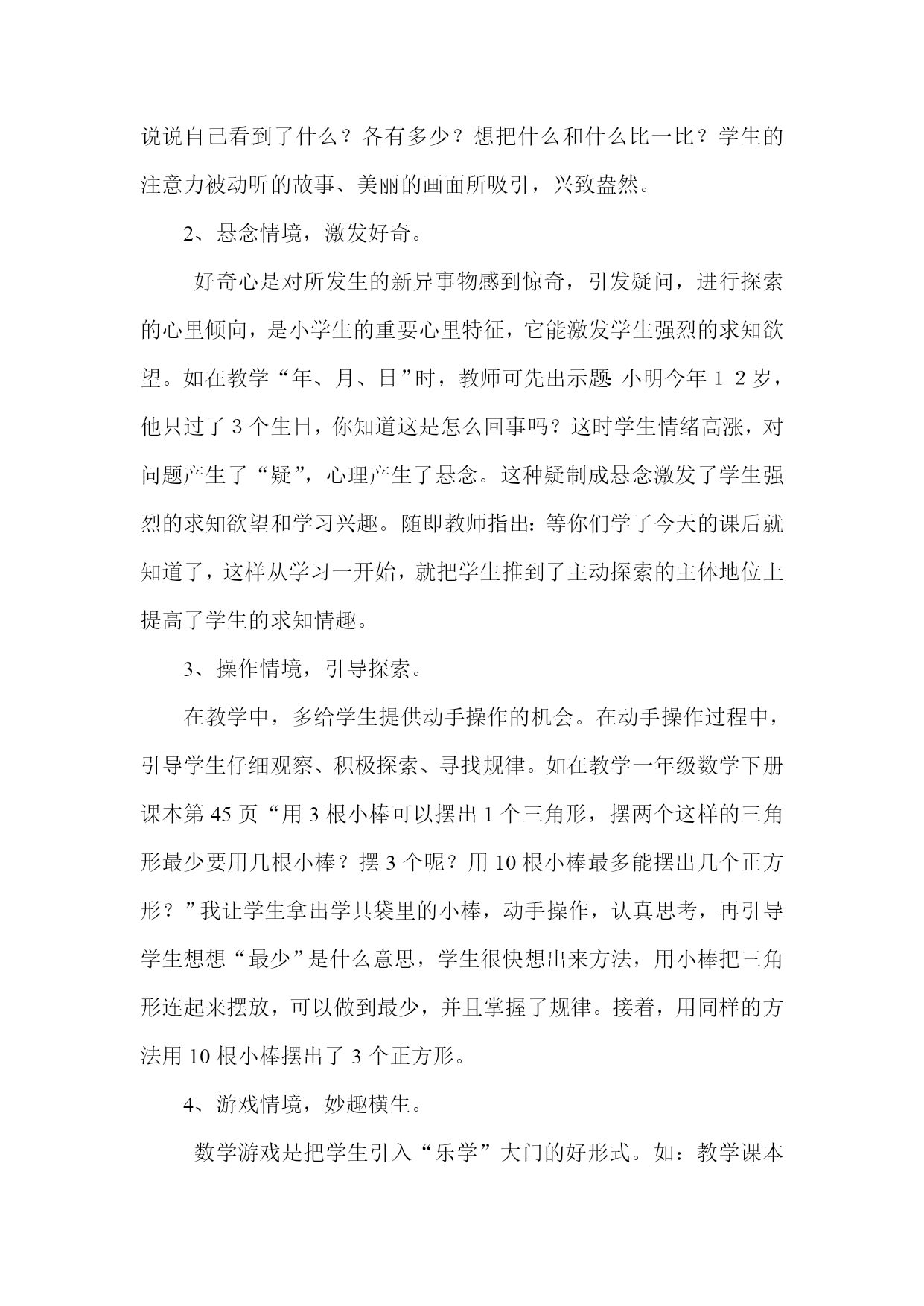 浅谈小学数学课堂教学中的情境创设新教材最大的特点之一就是许多知识的引入和问题的提出、解决都是在一定的情景中展开的,因此,精心创设情境是提高数学课堂教学有效性的一项重要策略。然而,新课程下的一些数学课,情境只是为创设而创设,只图表面热闹,有的甚至成了说话课,夹杂了太多的非数学信息,干扰和弱化了数学知识和技能的学习以及数学思维的发展,缺乏情境创设的有效性——为学生学习数学服务。我们的课堂教学情境要针对每节课的教学目标,以学生为出发点,创设出适合年龄心理发展特点,创设让孩子们都饶有兴趣,越战越勇的真实情境。结合自身的教学实践,就创设情境提高小学数学课堂教学效率谈几点认识。一、注意教学情境的特点。1、教学情境要有针对性。就数学学科而言,创设有针对性的情境,就是要紧扣有关数学学习内容设计问题情境。情境的设计的针对性来源于两个方面。一方面是教师对教材的认真钻研,把握教材内容的“数学内涵”及其相互关系,在此基础上,抓住其核心和关键提出有关的问题。另一方面,教师对学生一些数学知识的“原型”问题的把握,让学生经历将实际问题抽象为数学模型并进行解释与应用的过程。例如,可以根据生活的“合并”,“求剩余”的活动来设计一些问题,让学生在解决这些问题的过程中,体会并理解加、减运算的实际意义;教学加减法的计算法则时,也可以先设计有关的实际问题,引导学生通过学具操作解决问题,再根据操作过程抽象出有关的算法。这样,学生在解决问题并进行数学化的过程中,可以获得对数学知识的真正理解。2、教学情境要有目的性。在大家都投身于开展课堂教学研究,落实新理念的教学活动中,教师们都努力创设教学情境,课堂开始变得活泼,学生学习兴趣也有多提高。同时,也要冷静思考,分析,反思一下课堂教学情境是否与教学目标相吻合,对于目前课堂教学滥设情境这一现状,顾汝佐先生指出:情境设计要紧扣所要教学的数学知识或技能,离开了这一点就不是数学课。3、教学情境要有挑战性。教学的本质特征不在于“训练”,“强化”业已形成的内部心理技能,而在于技法,形成目前还不存在的心理技能,促进学生发展的“好的教学”应该走在“学生发展的前面”。从促进学生发展的角度看,问题必须有挑战性,教师要处理好问题的难易程度,要让让学生的思维经受来自问题的挑战。向学生提出由挑战性的问题,并不意味着要难倒学生,而是指应根据学生已有的知识经验和智能发展水平,尽可能在学生的“最近发展区”提出问题。要通过提出由挑战性的问题,刺激和激励学生积极探索,并让他们在解决问题的过程中体会到需要经过努力不断克服困难才能获得成功,既要让他们“跳一跳”才能摘到“果子”。4、教学情境要具有趣味性。我曾经上课就绘声绘色地说:“孩子们,今天聪聪、明明要和我们一起学习,你们愿意吗?”学生的兴趣一下子提了起来,可一节课下来,从兴高采烈到无精打采,课件呈现:首先是聪聪头像的复习题,其次是明明头像的例题,再次是聪聪头像的巩固练习,最后还是明明头像的总结。课堂上简单地附着个聪聪和明明的头像。学生对这样的情境十分“不买账”,这个情境脱离了数学课堂的实际需要,成了一种形式,它除了会分散学生的注意力,几乎没有什么价值,忽略了“情境”作为教学的有机组成因素,具有引导学生经历学习过程,发展学生数学素养的重要作用。5、教学情境要有真实性。用什么样的情境来呈现教学,要根据学生的年龄特点和心理特点做出适当的选择。对于小学生来说,虽然不同的个体,其认知发展,情感和意志要素不完全相同,但相同年龄段的学生却有着整体上的一致性。一般来说,小学低、中年级的学生,比较关注“有趣、好玩、新颖”的事物,而中、高年级的学生则开始对“有用、又挑战性”的任务更感兴趣。我们在设计问题情境时,应尽量于学生的上述心理特点相适应。另外,还应注意选材内容及呈现方式的多样性和趣味性。二、把握情境创设的方法。1、故事情境,引人入胜。小学生都是故事谜,把知识融入故事中,配上色彩鲜明,感染力强的多媒体课件,能激起学生浓厚的学习兴趣。比如教学一年级“比一比”时,可以这样设计:在音乐中讲故事,随着故事情节的发展,分别显示小兔、小猪盖房子的画面景物,然后请学生观察美丽的画面,说说自己看到了什么?各有多少?想把什么和什么比一比?学生的注意力被动听的故事、美丽的画面所吸引,兴致盎然。2、悬念情境,激发好奇。好奇心是对所发生的新异事物感到惊奇,引发疑问,进行探索的心里倾向,是小学生的重要心里特征,它能激发学生强烈的求知欲望。如在教学“年、月、日”时,教师可先出示题:小明今年12岁,他只过了3个生日,你知道这是怎么回事吗?这时学生情绪高涨,对问题产生了“疑”,心理产生了悬念。这种疑制成悬念激发了学生强烈的求知欲望和学习兴趣。随即教师指出:等你们学了今天的课后就知道了,这样从学习一开始,就把学生推到了主动探索的主体地位上提高了学生的求知情趣。3、