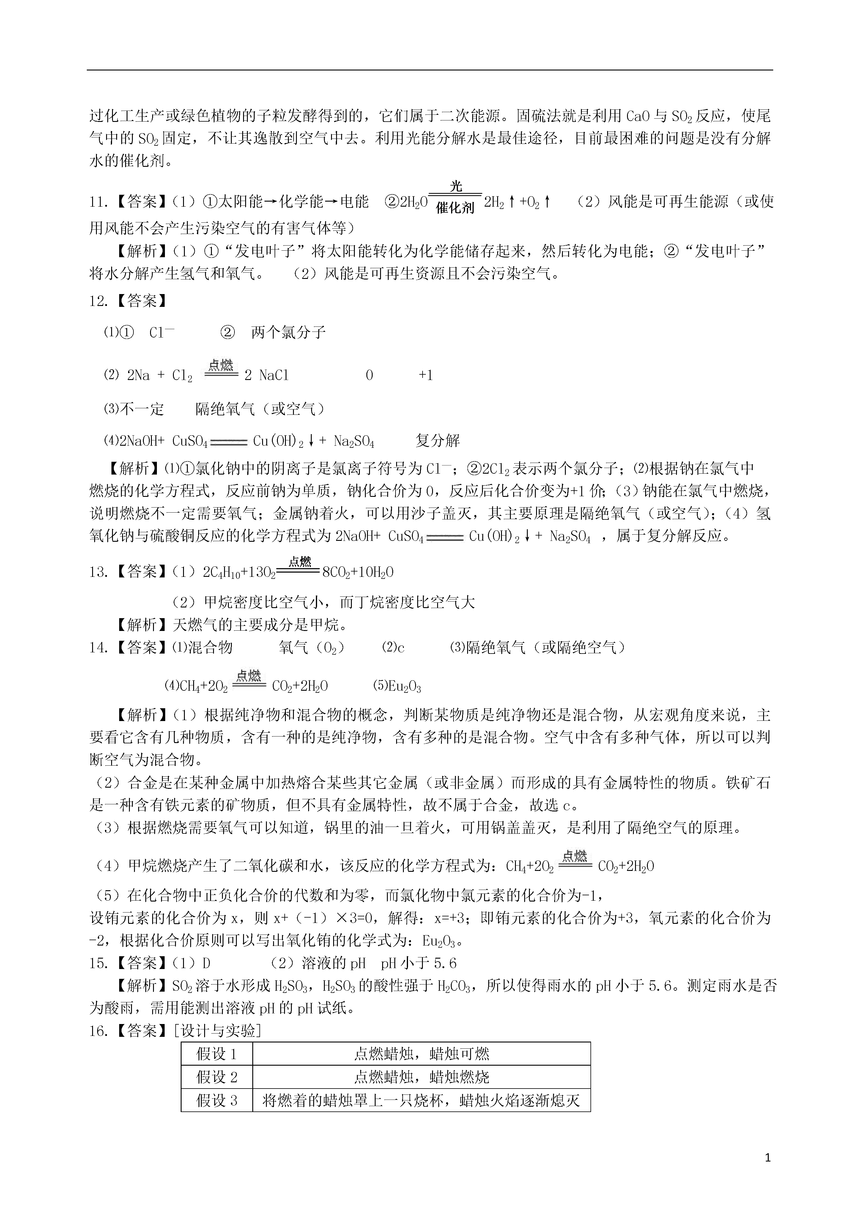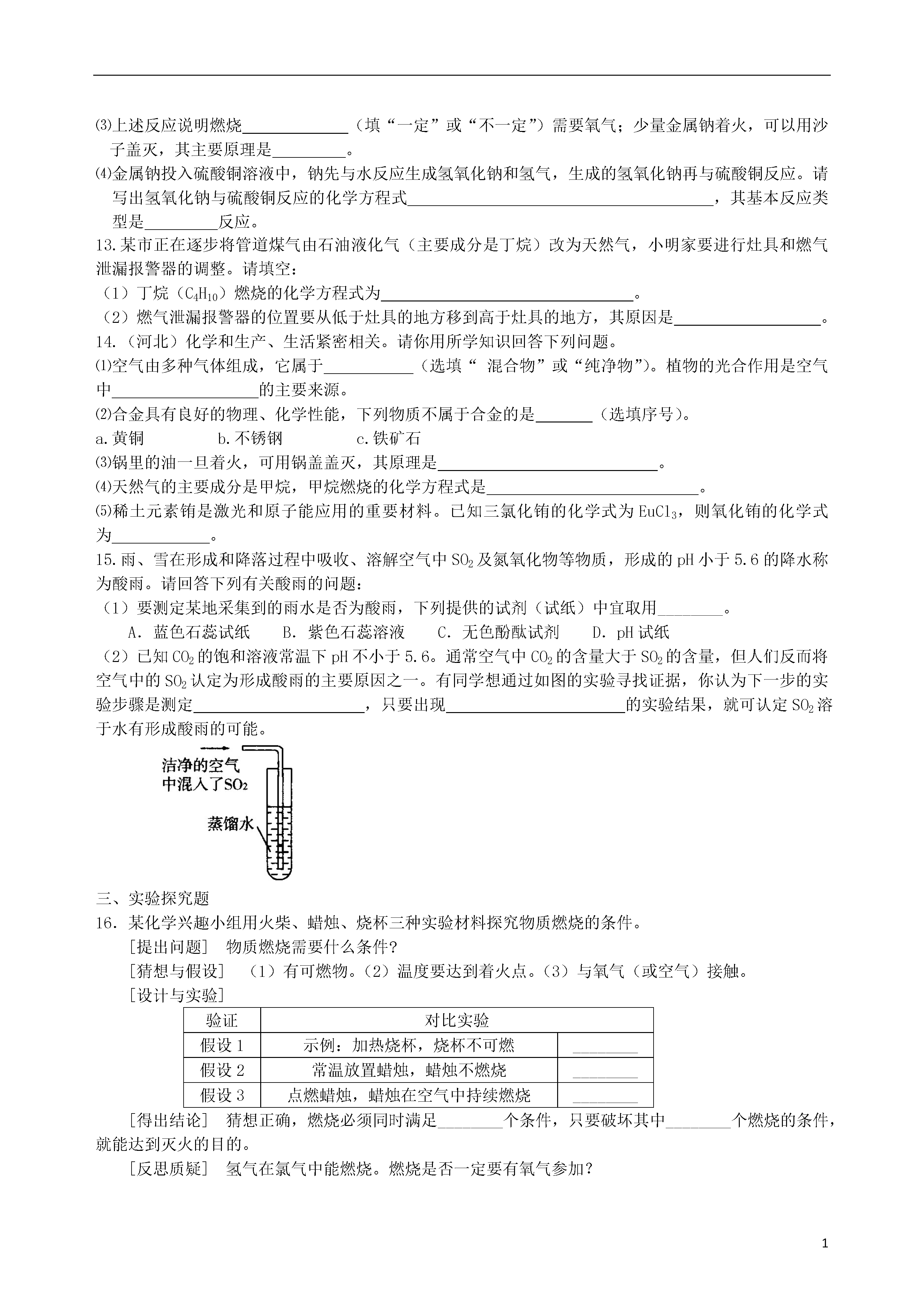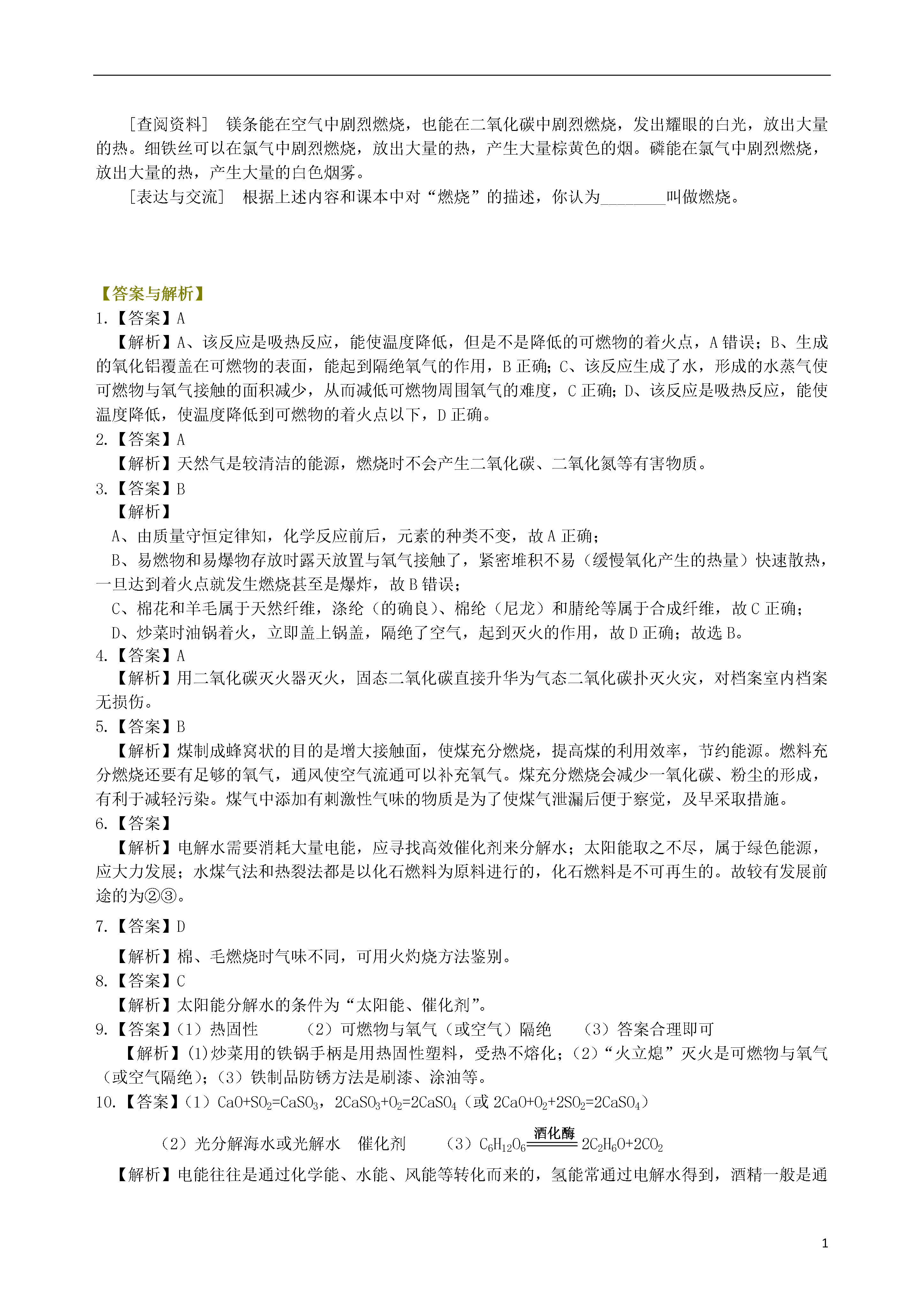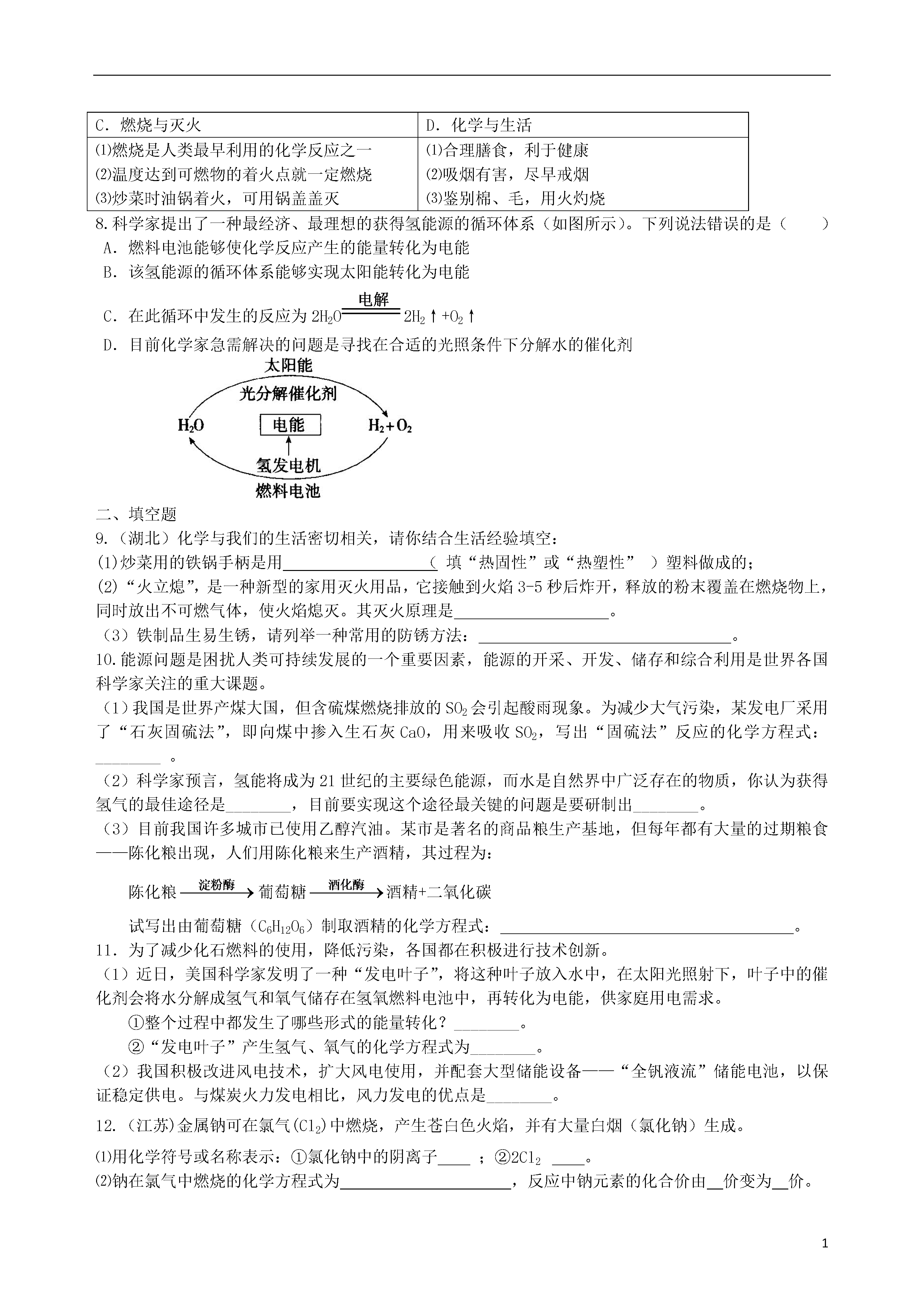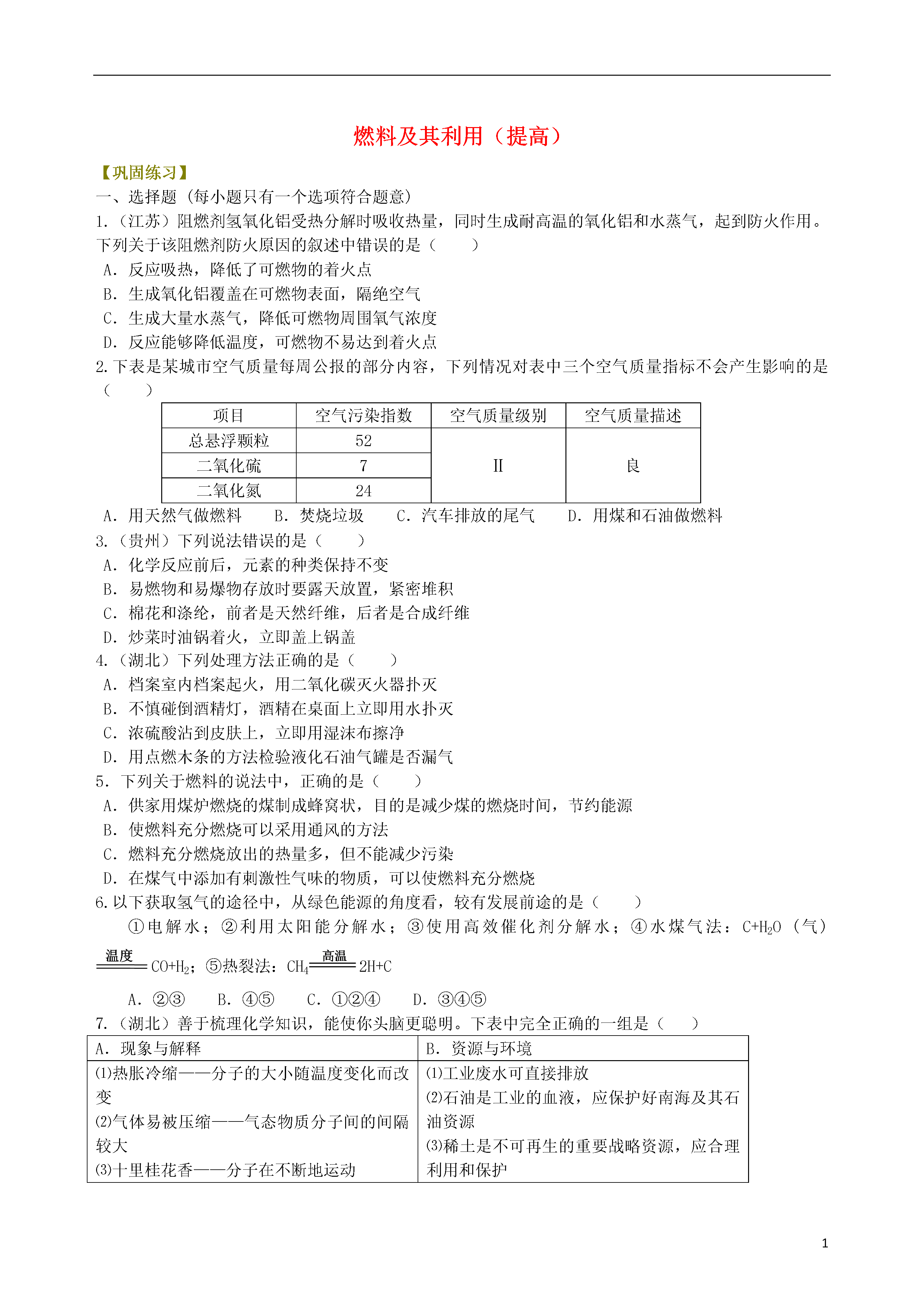 1燃料及其利用(提高)【巩固练习】选择题(每小题只有一个选项符合题意)1.(江苏)阻燃剂氢氧化铝受热分解时吸收热量,同时生成耐高温的氧化铝和水蒸气,起到防火作用。下列关于该阻燃剂防火原因的叙述中错误的是()A.反应吸热,降低了可燃物的着火点B.生成氧化铝覆盖在可燃物表面,隔绝空气C.生成大量水蒸气,降低可燃物周围氧气浓度D.反应能够降低温度,可燃物不易达到着火点2.下表是某城市空气质量每周公报的部分内容,下列情况对表中三个空气质量指标不会产生影响的是()项目空气污染指数空气质量级别空气质量描述总悬浮颗粒52Ⅱ良二氧化硫7二氧化氮24A.用天然气做燃料B.焚烧垃圾C.汽车排放的尾气D.用煤和石油做燃料3.(贵州)下列说法错误的是()A.化学反应前后,元素的种类保持不变B.易燃物和易爆物存放时要露天放置,紧密堆积C.棉花和涤纶,前者是天然纤维,后者是合成纤维D.炒菜时油锅着火,立即盖上锅盖4.(湖北)下列处理方法正确的是()A.档案室内档案起火,用二氧化碳灭火器扑灭B.不慎碰倒酒精灯,酒精在桌面上立即用水扑灭C.浓硫酸沾到皮肤上,立即用湿沫布擦净D.用点燃木条的方法检验液化石油气罐是否漏气5.下列关于燃料的说法中,正确的是()A.供家用煤炉燃烧的煤制成蜂窝状,目的是减少煤的燃烧时间,节约能源B.使燃料充分燃烧可以采用通风的方法C.燃料充分燃烧放出的热量多,但不能减少污染D.在煤气中添加有刺激性气味的物质,可以使燃料充分燃烧6.以下获取氢气的途径中,从绿色能源的角度看,较有发展前途的是()①电解水;②利用太阳能分解水;③使用高效催化剂分解水;④水煤气法:C+H2O(气)CO+H2;⑤热裂法:CH42H+CA.②③B.④⑤C.①②④D.③④⑤7.(湖北)善于梳理化学知识,能使你头脑更聪明。下表中完全正确的一组是()A.现象与解释B.资源与环境⑴热胀冷缩——分子的大小随温度变化而改变⑵气体易被压缩——气态物质分子间的间隔较大⑶十里桂花香——分子在不断地运动⑴工业废水可直接排放⑵石油是工业的血液,应保护好南海及其石油资源⑶稀土是不可再生的重要战略资源,应合理利用和保护C.燃烧与灭火D.化学与生活⑴燃烧是人类最早利用的化学反应之一⑵温度达到可燃物的着火点就一定燃烧⑶炒菜时油锅着火,可用锅盖盖灭⑴合理膳食,利于健康⑵吸烟有害,尽早戒烟⑶鉴别棉、毛,用火灼烧8.科学家提出了一种最经济、最理想的获得氢能源的循环体系(如图所示)。下列说法错误的是()A.燃料电池能够使化学反应产生的能量转化为电能B.该氢能源的循环体系能够实现太阳能转化为电能C.在此循环中发生的反应为2H2O2H2↑+O2↑D.目前化学家急需解决的问题是寻找在合适的光照条件下分解水的催化剂二、填空题9.(湖北)化学与我们的生活密切相关,请你结合生活经验填空:(1)炒菜用的铁锅手柄是用(填“热固性”或“热塑性”)塑料做成的;(2)“火立熄”,是一种新型的家用灭火用品,它接触到火焰3-5秒后炸开,释放的粉末覆盖在燃烧物上,同时放出不可燃气体,使火焰熄灭。其灭火原理是。(3)铁制品生易生锈,请列举一种常用的防锈方法:。10.能源问题是困扰人类可持续发展的一个重要因素,能源的开采、开发、储存和综合利用是世界各国科学家关注的重大课题。(1)我国是世界产煤大国,但含硫煤燃烧排放的SO2会引起酸雨现象。为减少大气污染,某发电厂采用了“石灰固硫法”,即向煤中掺入生石灰CaO,用来吸收SO2,写出“固硫法”反应的化学方程式:________。(2)科学家预言,氢能将成为21世纪的主要绿色能源,而水是自然界中广泛存在的物质,你认为获得氢气的最佳途径是________,目前要实现这个途径最关键的问题是要研制出________。(3)目前我国许多城市已使用乙醇汽油。某市是著名的商品粮生产基地,但每年都有大量的过期粮食——陈化粮出现,人们用陈化粮来生产酒精,其过程为:陈化粮葡萄糖酒精+二氧化碳试写出由葡萄糖(C6H12O6)制取酒精的化学方程式:。11.为了减少化石燃料的使用,降低污染,各国都在积极进行技术创新。(1)近日,美国科学家发明了一种“发电叶子”,将这种叶子放入水中,在太阳光照射下,叶子中的催化剂会将水分解成氢气和氧气储存在氢氧燃料电池中,再转化为电能,供家庭用电需求。①整个过程中都发生了哪些形式的能量转化?________。②“发电叶子”产生氢气、氧气的化学方程式为________。(2)我国积极改进风电技术,扩大风电使用,并配套大型储能设备——“全钒液流”储能电池,以保证稳定供电。与煤炭火力发电相比,风力发电的优点是________。12.(江苏)金属钠可在氯气(