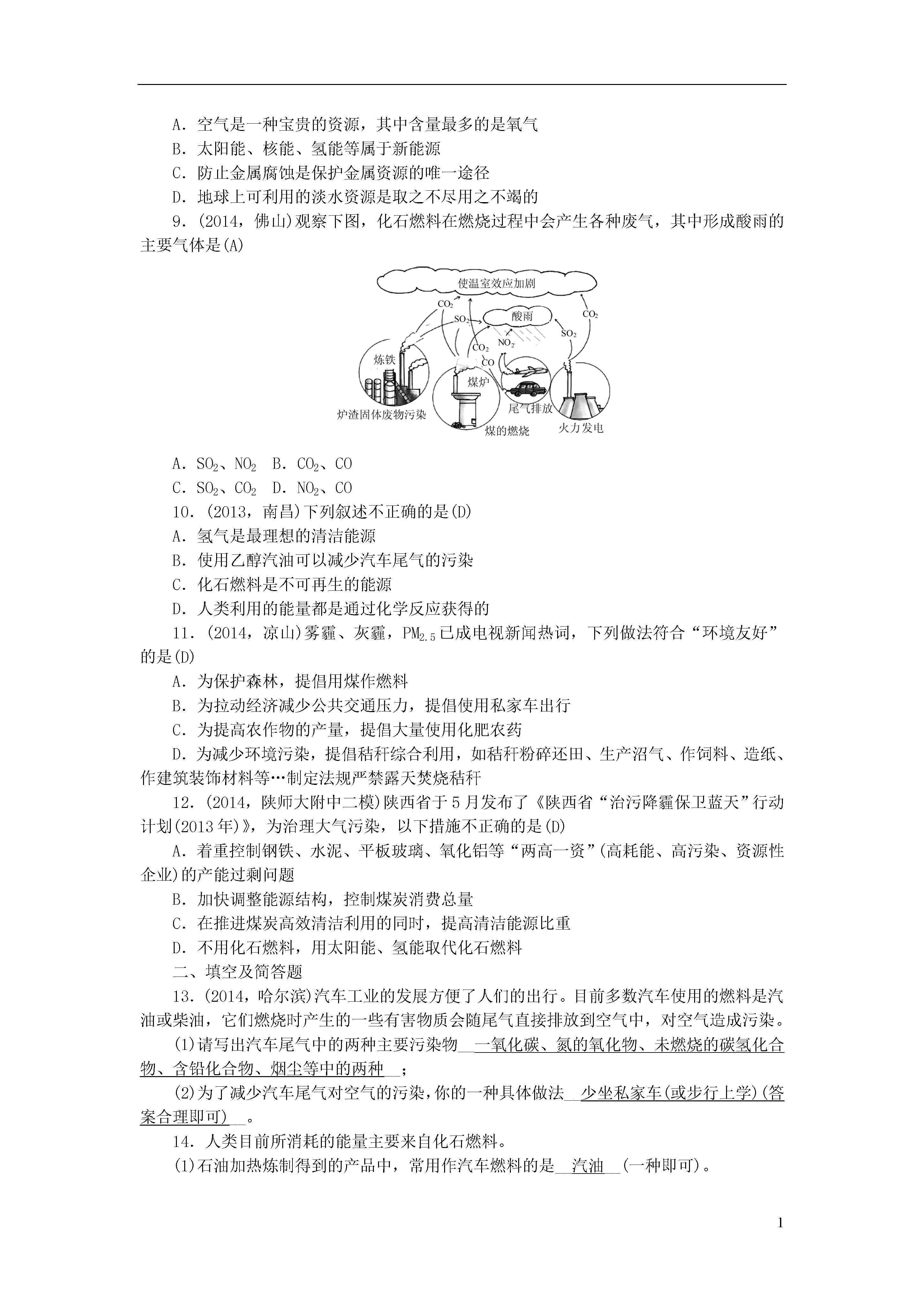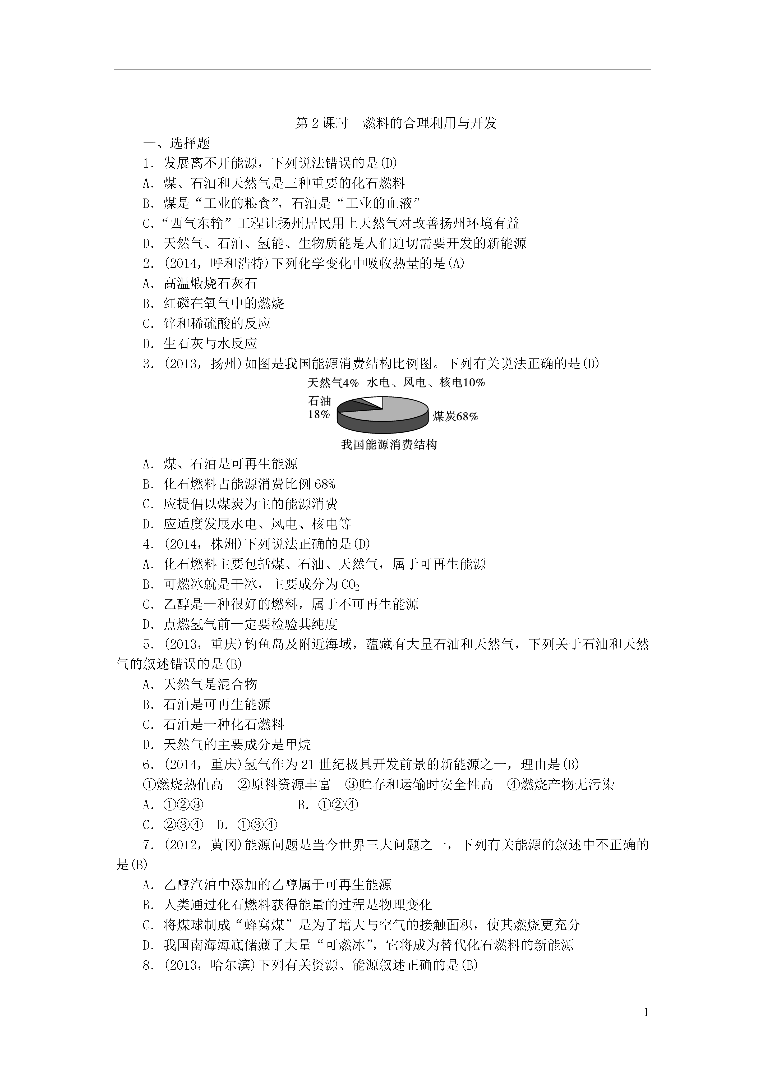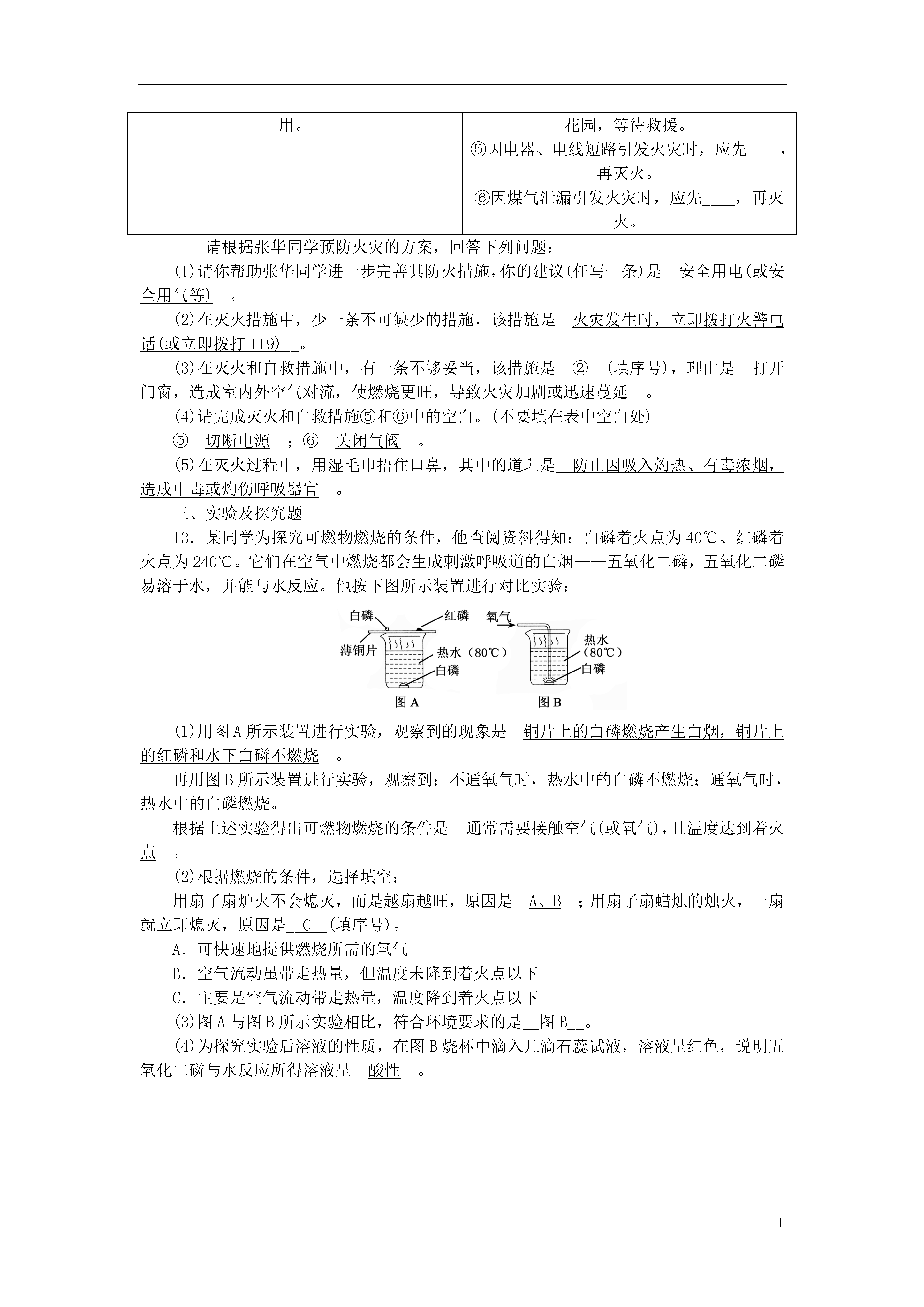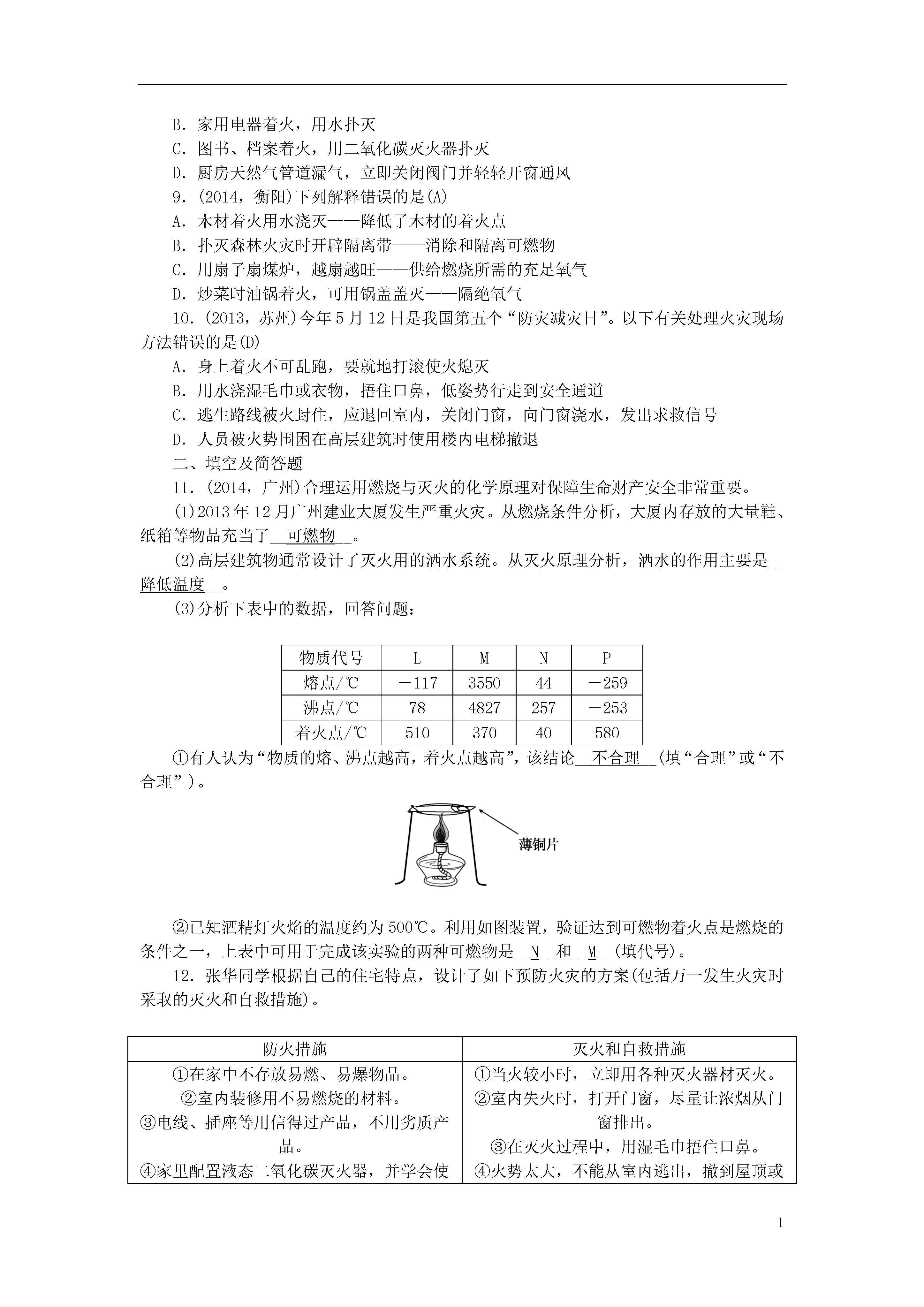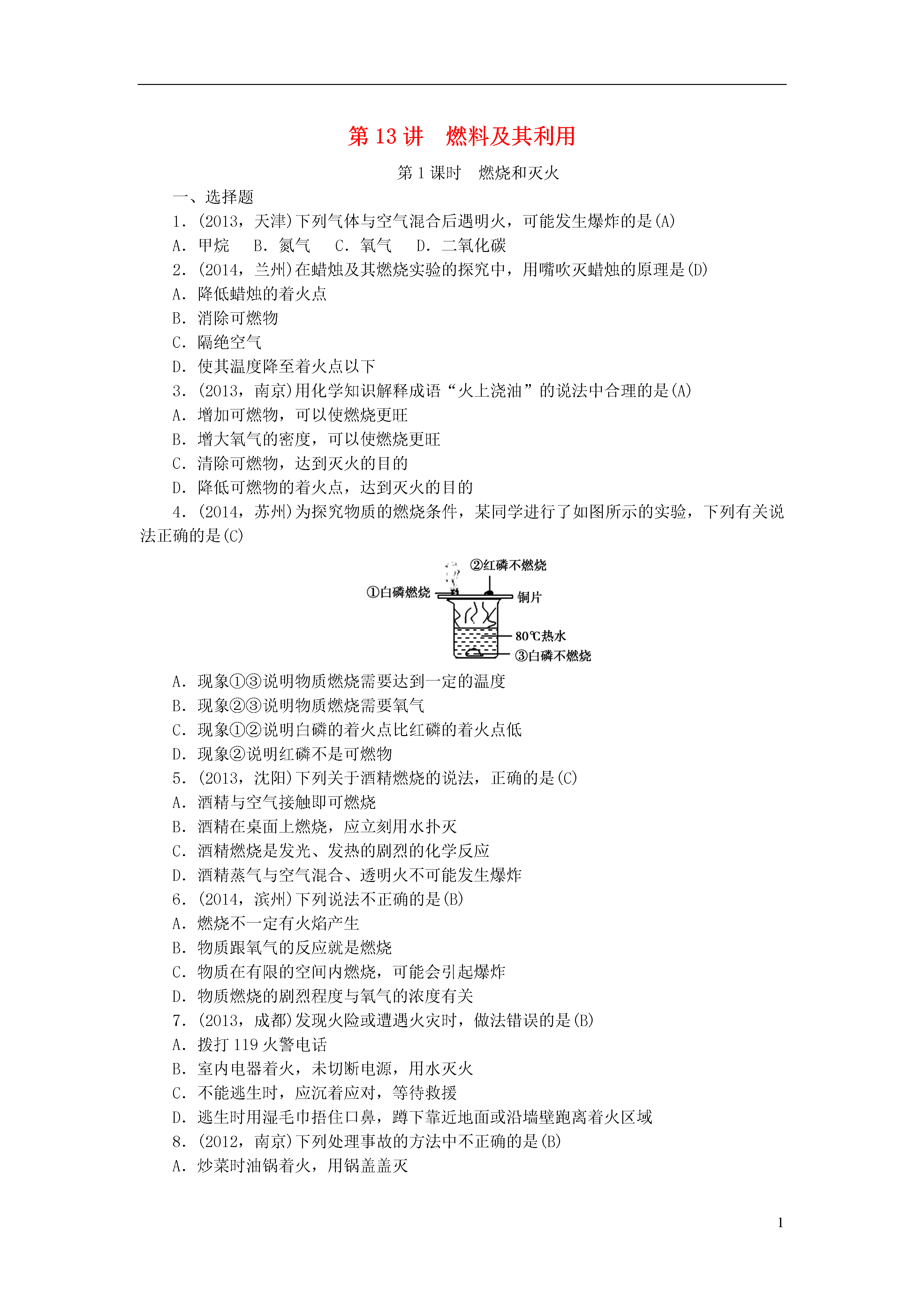 1第13讲燃料及其利用第1课时燃烧和灭火一、选择题1.(2013,天津)下列气体与空气混合后遇明火,可能发生爆炸的是(A)A.甲烷B.氮气C.氧气D.二氧化碳2.(2014,兰州)在蜡烛及其燃烧实验的探究中,用嘴吹灭蜡烛的原理是(D)A.降低蜡烛的着火点B.消除可燃物C.隔绝空气D.使其温度降至着火点以下3.(2013,南京)用化学知识解释成语“火上浇油”的说法中合理的是(A)A.增加可燃物,可以使燃烧更旺B.增大氧气的密度,可以使燃烧更旺C.清除可燃物,达到灭火的目的D.降低可燃物的着火点,达到灭火的目的4.(2014,苏州)为探究物质的燃烧条件,某同学进行了如图所示的实验,下列有关说法正确的是(C)A.现象①③说明物质燃烧需要达到一定的温度B.现象②③说明物质燃烧需要氧气C.现象①②说明白磷的着火点比红磷的着火点低D.现象②说明红磷不是可燃物5.(2013,沈阳)下列关于酒精燃烧的说法,正确的是(C)A.酒精与空气接触即可燃烧B.酒精在桌面上燃烧,应立刻用水扑灭C.酒精燃烧是发光、发热的剧烈的化学反应D.酒精蒸气与空气混合、透明火不可能发生爆炸6.(2014,滨州)下列说法不正确的是(B)A.燃烧不一定有火焰产生B.物质跟氧气的反应就是燃烧C.物质在有限的空间内燃烧,可能会引起爆炸D.物质燃烧的剧烈程度与氧气的浓度有关7.(2013,成都)发现火险或遭遇火灾时,做法错误的是(B)A.拨打119火警电话B.室内电器着火,未切断电源,用水灭火C.不能逃生时,应沉着应对,等待救援D.逃生时用湿毛巾捂住口鼻,蹲下靠近地面或沿墙壁跑离着火区域8.(2012,南京)下列处理事故的方法中不正确的是(B)A.炒菜时油锅着火,用锅盖盖灭B.家用电器着火,用水扑灭C.图书、档案着火,用二氧化碳灭火器扑灭D.厨房天然气管道漏气,立即关闭阀门并轻轻开窗通风9.(2014,衡阳)下列解释错误的是(A)A.木材着火用水浇灭——降低了木材的着火点B.扑灭森林火灾时开辟隔离带——消除和隔离可燃物C.用扇子扇煤炉,越扇越旺——供给燃烧所需的充足氧气D.炒菜时油锅着火,可用锅盖盖灭——隔绝氧气10.(2013,苏州)今年5月12日是我国第五个“防灾减灾日”。以下有关处理火灾现场方法错误的是(D)A.身上着火不可乱跑,要就地打滚使火熄灭B.用水浇湿毛巾或衣物,捂住口鼻,低姿势行走到安全通道C.逃生路线被火封住,应退回室内,关闭门窗,向门窗浇水,发出求救信号D.人员被火势围困在高层建筑时使用楼内电梯撤退二、填空及简答题11.(2014,广州)合理运用燃烧与灭火的化学原理对保障生命财产安全非常重要。(1)2013年12月广州建业大厦发生严重火灾。从燃烧条件分析,大厦内存放的大量鞋、纸箱等物品充当了__可燃物__。(2)高层建筑物通常设计了灭火用的洒水系统。从灭火原理分析,洒水的作用主要是__降低温度__。(3)分析下表中的数据,回答问题:物质代号LMNP熔点/℃-117355044-259沸点/℃784827257-253着火点/℃51037040580①有人认为“物质的熔、沸点越高,着火点越高”,该结论__不合理__(填“合理”或“不合理”)。②已知酒精灯火焰的温度约为500℃。利用如图装置,验证达到可燃物着火点是燃烧的条件之一,上表中可用于完成该实验的两种可燃物是__N__和__M__(填代号)。12.张华同学根据自己的住宅特点,设计了如下预防火灾的方案(包括万一发生火灾时采取的灭火和自救措施)。防火措施灭火和自救措施①在家中不存放易燃、易爆物品。②室内装修用不易燃烧的材料。③电线、插座等用信得过产品,不用劣质产品。④家里配置液态二氧化碳灭火器,并学会使用。①当火较小时,立即用各种灭火器材灭火。②室内失火时,打开门窗,尽量让浓烟从门窗排出。③在灭火过程中,用湿毛巾捂住口鼻。④火势太大,不能从室内逃出,撤到屋顶或花园,等待救援。⑤因电器、电线短路引发火灾时,应先____,再灭火。⑥因煤气泄漏引发火灾时,应先____,再灭火。请根据张华同学预防火灾的方案,回答下列问题:(1)请你帮助张华同学进一步完善其防火措施,你的建议(任写一条)是__安全用电(或安全用气等)__。(2)在灭火措施中,少一条不可缺少的措施,该措施是__火灾发生时,立即拨打火警电话(或立即拨打119)__。(3)在灭火和自救措施中,有一条不够妥当,该措施是__②__(填序号),理由是__打开门窗,造成室内外空气对流,使燃烧更旺,导致火灾加剧或迅速蔓延__。(4)请完成灭火和自救措施⑤和⑥中的空白。(不要填在表中空白处)⑤__切断电源