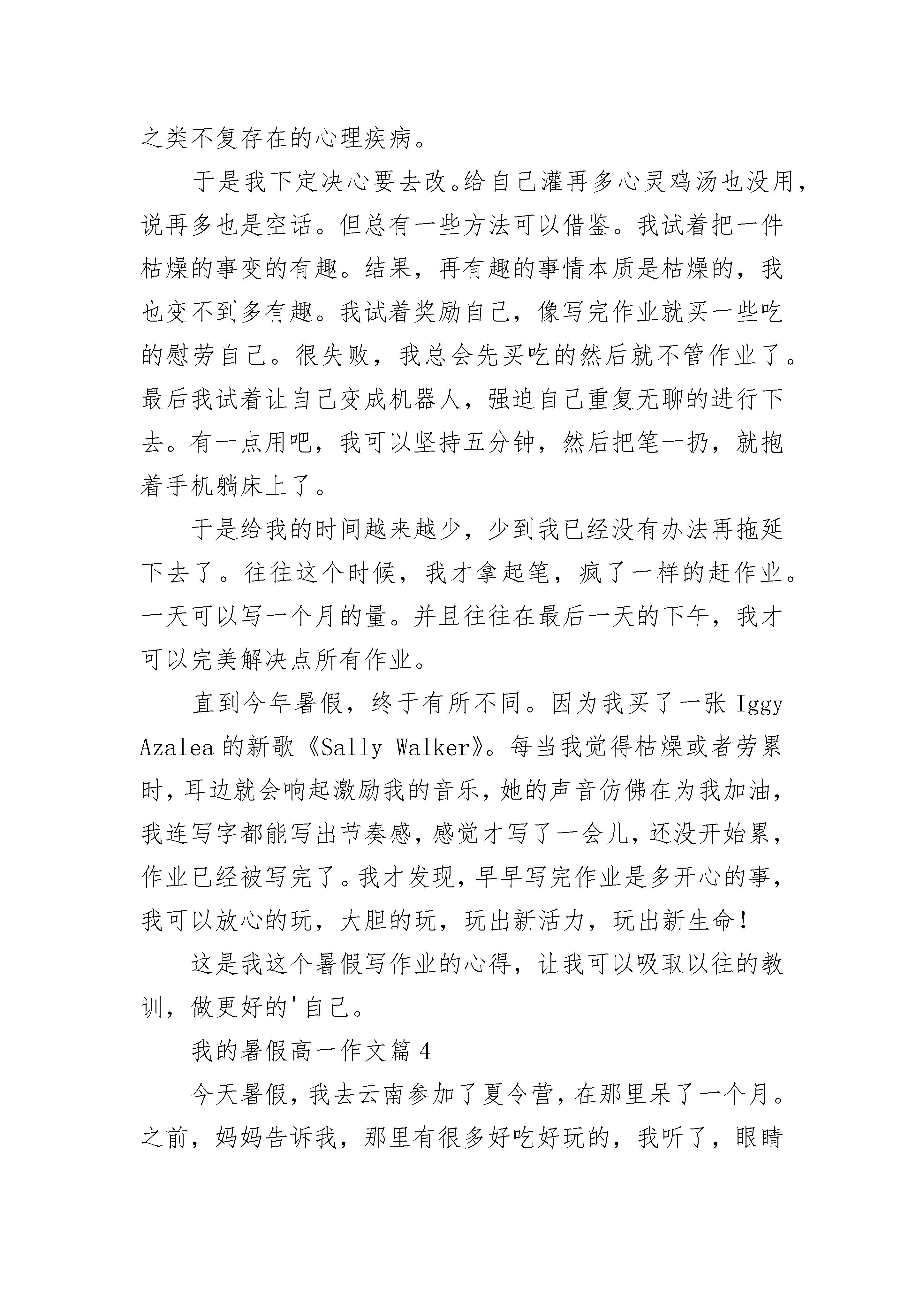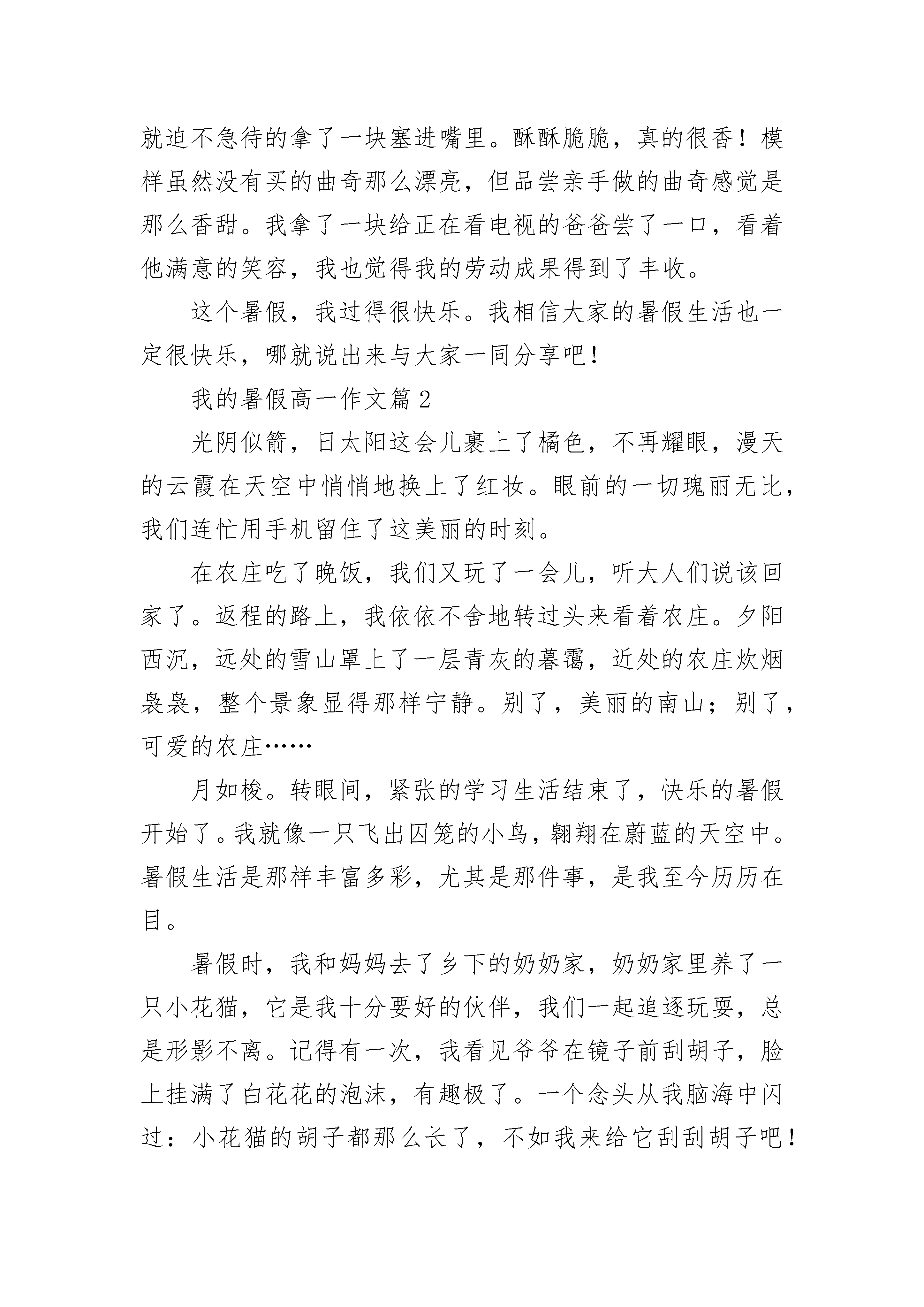 我的暑假高一作文范文10篇我的暑假生活是五彩缤纷的,也是充实快乐的,每一件事都像珍珠一样在闪耀。暑假里,我做了许多喜欢做的事,最开心的就是做曲奇饼干了。在所有的饼干里面,我最喜欢吃曲奇饼干,它模样精巧、奶香浓郁、入口酥脆。想必大家和我一样也爱吃曲奇饼干,但是你们做过曲奇饼干吗?这不,这个暑假我跟着妈妈在家制作曲奇饼干,体验了亲手制作曲奇饼干的无限乐趣。我们准备好低筋面粉、黄油、糖粉、鸡蛋等材料后,就开始动手做了。首先让黄油融化成软软的;把鸡蛋的蛋清和蛋黄分离,把蛋黄液用小碗装好。再把黄油放在不锈钢盆中,用打蛋器把黄油分几次打发,打发后有些变白;我用手指沾了点尝尝,很香很甜。再把面粉透过筛子洒入盆中后,用打蛋器混合。用塑料铲和面团,并把他们装到一个装有金属嘴的裱花袋里,金属嘴上有六条细槽。妈妈握着我的手,让我使劲把面团通过金属嘴挤出,放在烤盘里。我试着一会儿挤出一朵花,一会儿挤出一个S,一会儿挤出一个C,每个形状上都有细细的纹路。面胚做好后,把盘子放入烤箱,温度设定180度,15分钟后大功告成,只是在烤的过程中,满屋子的香气让我口水没少流。大约十五分钟后,香喷喷的饼干出炉了!我还没等它凉就迫不急待的拿了一块塞进嘴里。酥酥脆脆,真的很香!模样虽然没有买的曲奇那么漂亮,但品尝亲手做的曲奇感觉是那么香甜。我拿了一块给正在看电视的爸爸尝了一口,看着他满意的笑容,我也觉得我的劳动成果得到了丰收。这个暑假,我过得很快乐。我相信大家的暑假生活也一定很快乐,哪就说出来与大家一同分享吧!我的暑假高一作文篇2光阴似箭,日太阳这会儿裹上了橘色,不再耀眼,漫天的云霞在天空中悄悄地换上了红妆。眼前的一切瑰丽无比,我们连忙用手机留住了这美丽的时刻。在农庄吃了晚饭,我们又玩了一会儿,听大人们说该回家了。返程的路上,我依依不舍地转过头来看着农庄。夕阳西沉,远处的雪山罩上了一层青灰的暮霭,近处的农庄炊烟袅袅,整个景象显得那样宁静。别了,美丽的南山;别了,可爱的农庄……月如梭。转眼间,紧张的学习生活结束了,快乐的暑假开始了。我就像一只飞出囚笼的小鸟,翱翔在蔚蓝的天空中。暑假生活是那样丰富多彩,尤其是那件事,是我至今历历在目。暑假时,我和妈妈去了乡下的奶奶家,奶奶家里养了一只小花猫,它是我十分要好的伙伴,我们一起追逐玩耍,总是形影不离。记得有一次,我看见爷爷在镜子前刮胡子,脸上挂满了白花花的泡沫,有趣极了。一个念头从我脑海中闪过:小花猫的胡子都那么长了,不如我来给它刮刮胡子吧!于是,我趁全家人都不在时,抱起小花猫准备给它刮胡子。开始它还挺听话,可是到了后来却又叫又嚷,拼死挣扎。我生气的对它说:“你这个大懒虫,胡子都那么长了,也不知道刮刮,真是懒死了!”我费了九牛二虎之力,终于帮它刮好了胡子,我得意极了。而小花猫却跑到角落里异常平静。爸爸回到家后,我得意地将小花猫的事告诉了它,本以为爸爸会表扬我一番,没想到爸爸却训斥了我一顿:“你这个小傻瓜!猫的胡子可是帮它捉老鼠的,你把它的胡子剃掉了,它就再也抓不到老鼠了!”我望着角落里的小花猫,惭愧的地下了头。现在回想起来,这件事真是既好笑又可气。暑假生活真有趣!我的暑假高一作文篇3我无法静下心来写作业。这是每一个假期的常态,在手机的诱惑下我是放不下手机来写作业的。事实上,我坚持不下来的不仅是写作业,我坚持不了弹吉他,在弹到六级,刚刚开始入门准备进阶时我就放弃了。我坚持不下去每天的晨跑,一开始还鼓励着自己跑了快一个小时,结果就坚持了两天,觉得还是在床上睡觉比较舒服。总的来说,我没有任何事情是从小坚持到大的,无论我在这件事情上多有天赋,当我的新鲜感过去,或者说我进入了疲劳期,我会立刻放弃,不会想后果,只觉得:至少现在很舒服。当然,并不是只有我一个人有这样的问题。但是大家总是更会找借口一些,比如说自己得了“拖延症”之类不复存在的心理疾病。于是我下定决心要去改。给自己灌再多心灵鸡汤也没用,说再多也是空话。但总有一些方法可以借鉴。我试着把一件枯燥的事变的有趣。结果,再有趣的事情本质是枯燥的,我也变不到多有趣。我试着奖励自己,像写完作业就买一些吃的慰劳自己。很失败,我总会先买吃的然后就不管作业了。最后我试着让自己变成机器人,强迫自己重复无聊的进行下去。有一点用吧,我可以坚持五分钟,然后把笔一扔,就抱着手机躺床上了。于是给我的时间越来越少,少到我已经没有办法再拖延下去了。往往这个时候,我才拿起笔,疯了一样的赶作业。一天可以写一个月的量。并且往往在最后一天的下午,我才可以完美解决点所有作业。直到今年暑假,终于有所不同。因为我买了一张IggyAzalea的新歌《SallyWalker》。每当我觉得枯燥或者劳累时,耳边就会响起激励我的音乐,她的声音仿佛在为我加油,我连写字都能写出节奏感,感觉才写了一会儿,还没开始累,作业已经被写完了。我才发现,