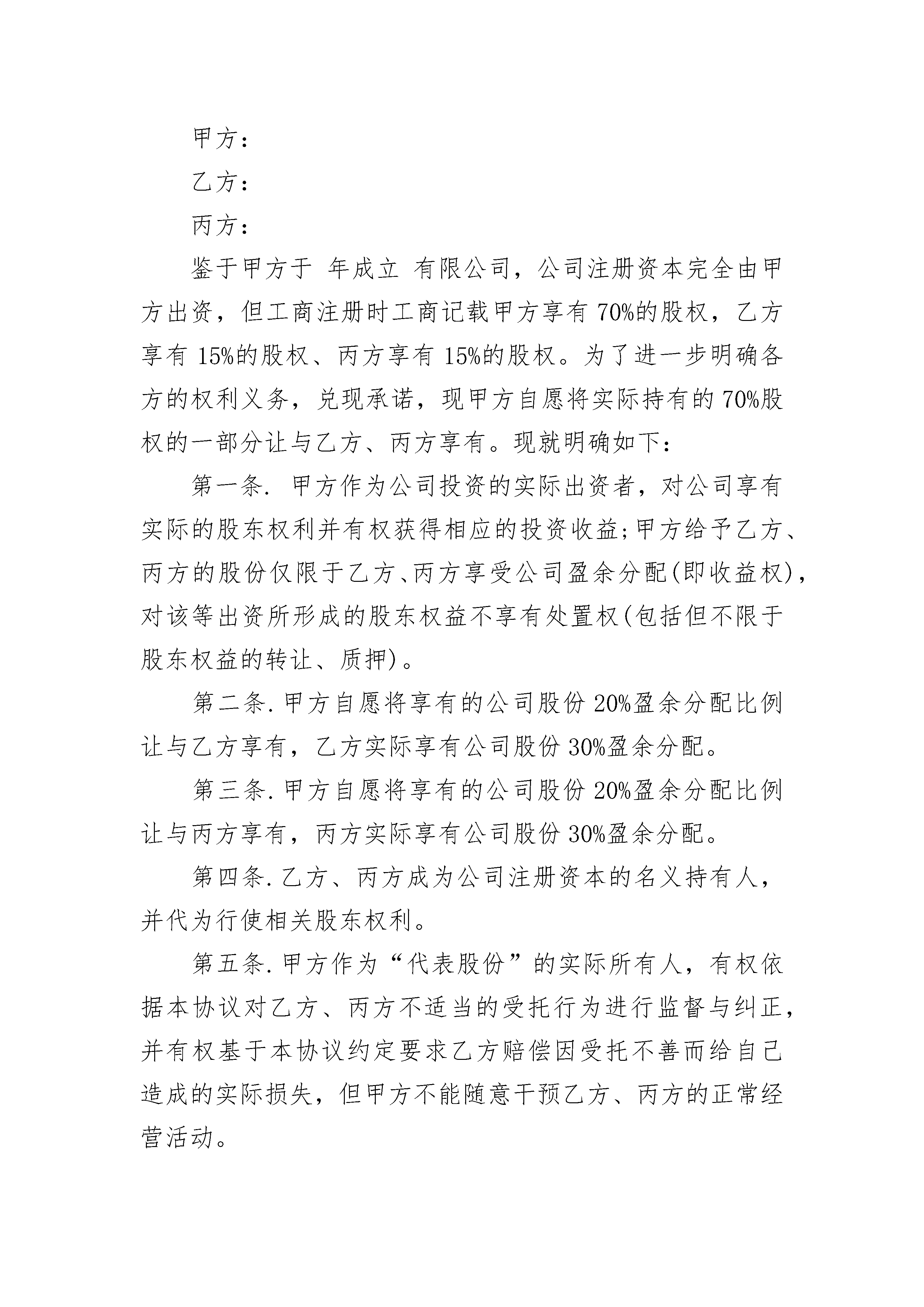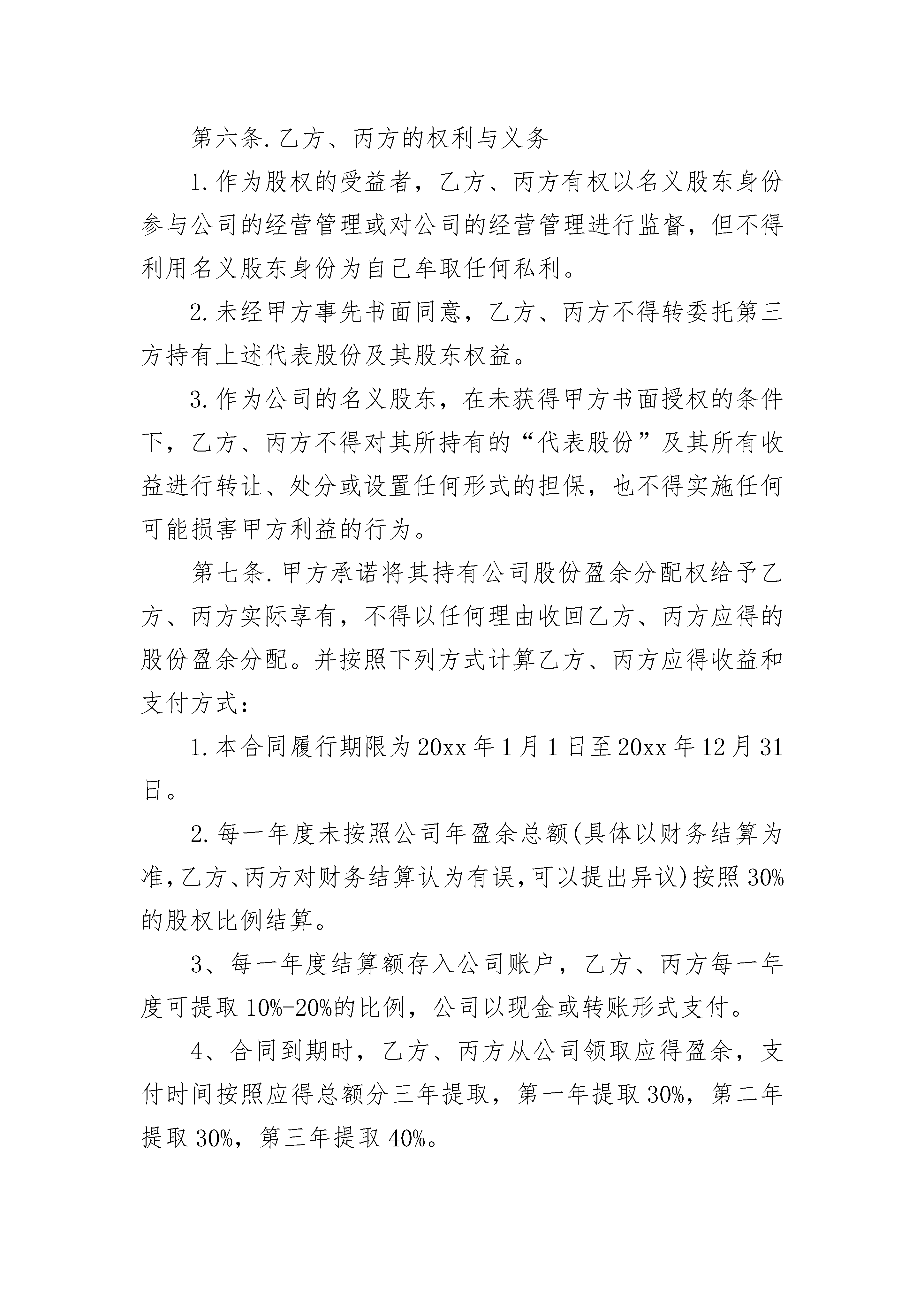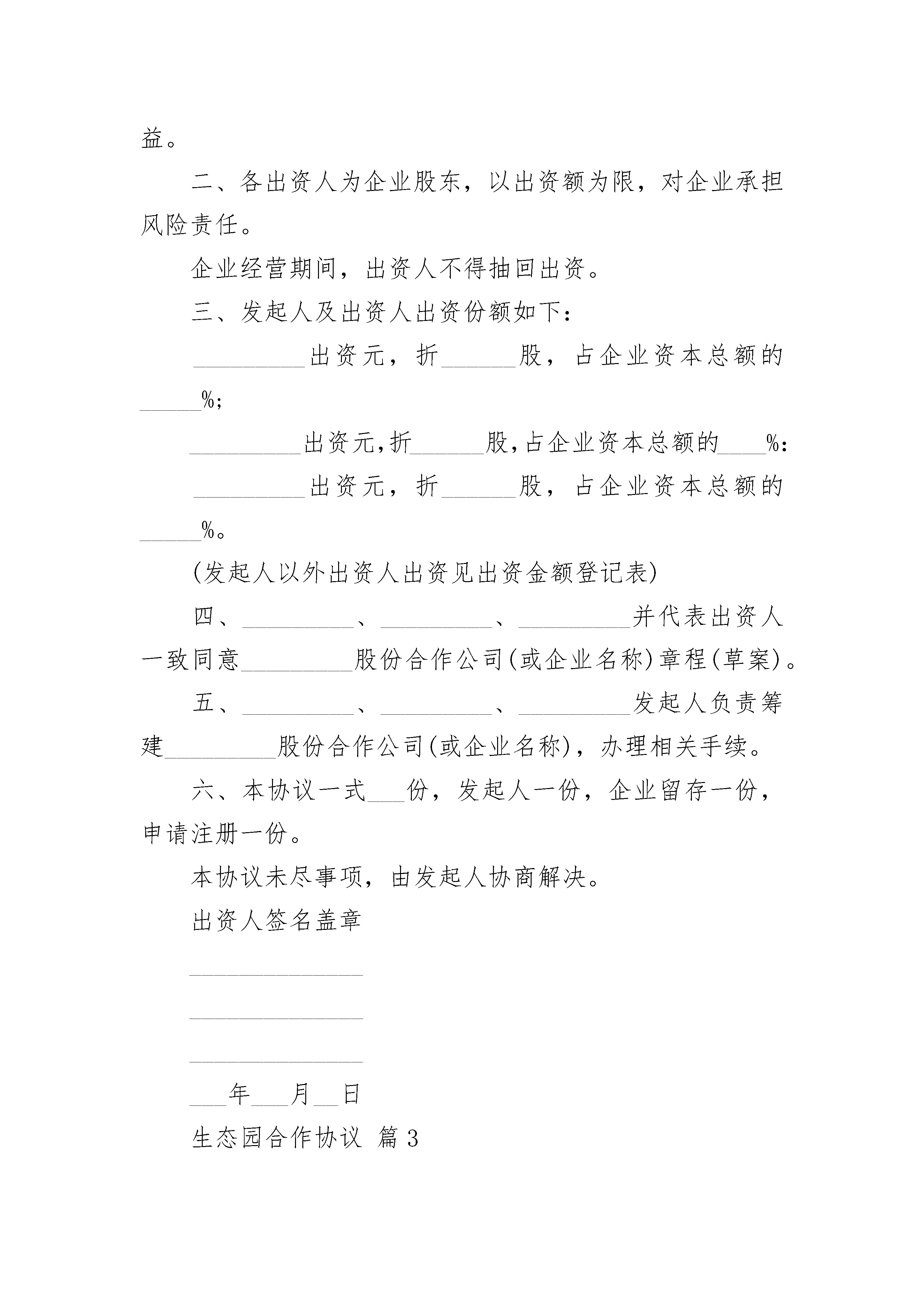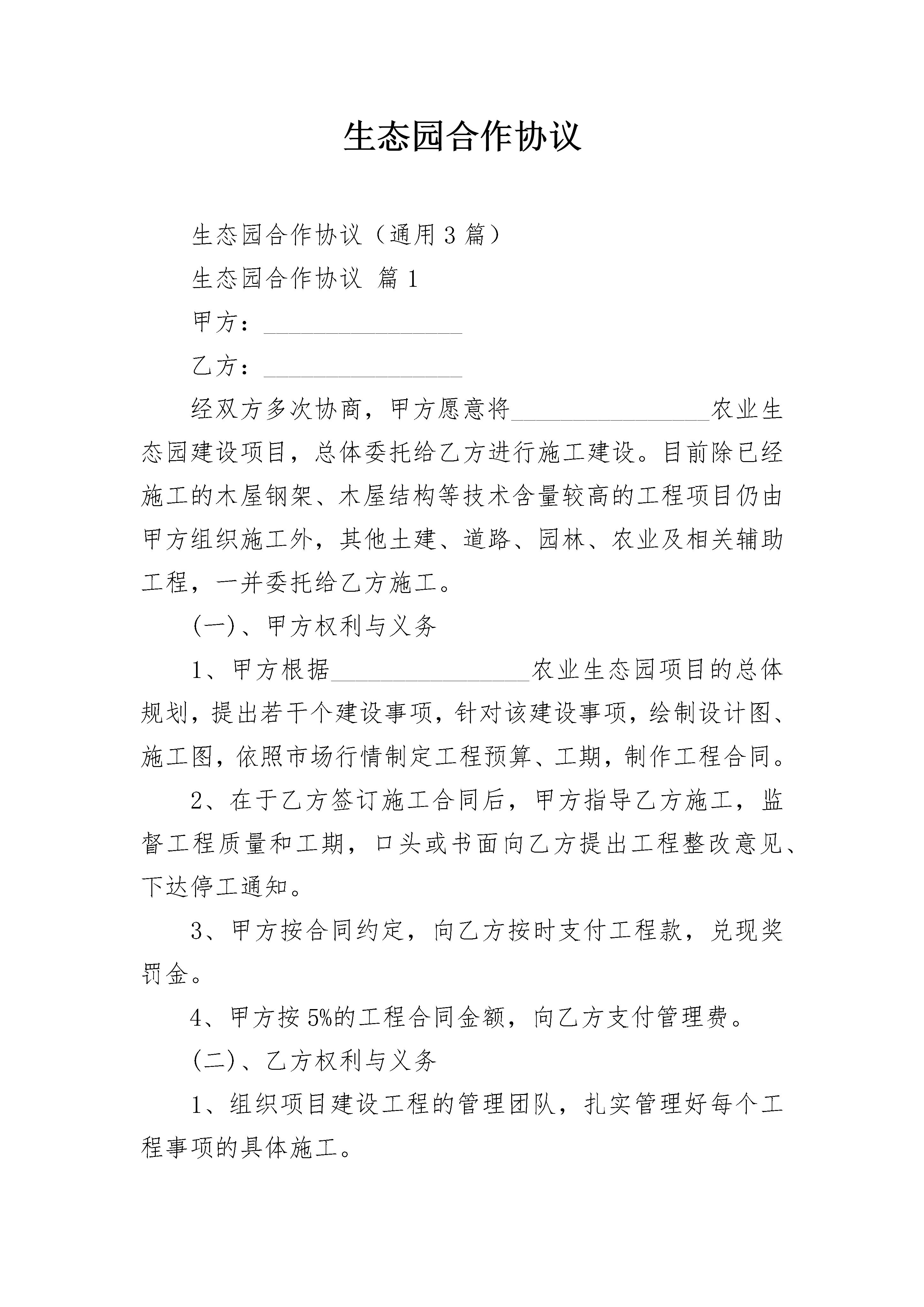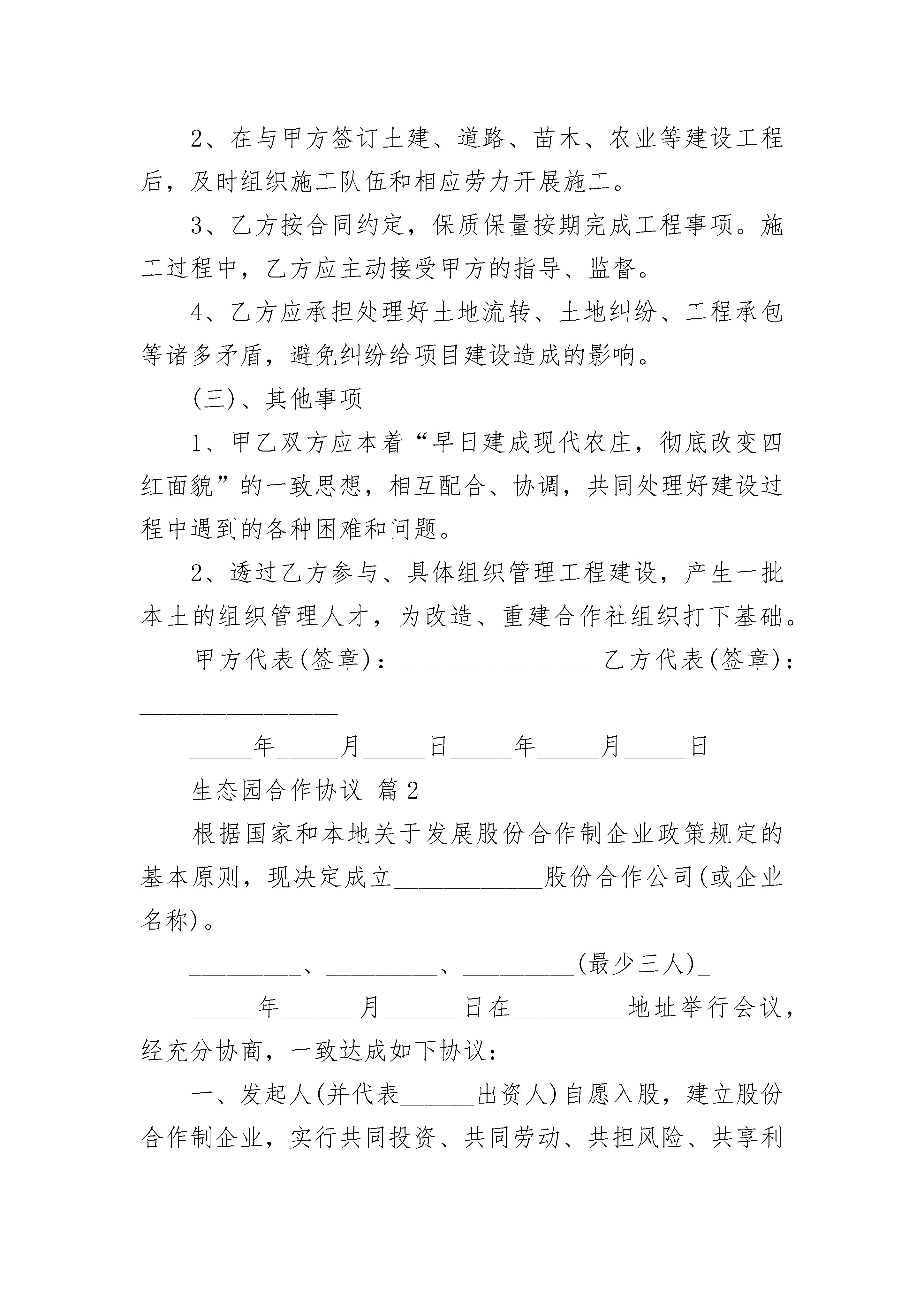 生态园合作协议生态园合作协议(通用3篇)生态园合作协议篇1甲方:________________乙方:________________经双方多次协商,甲方愿意将________________农业生态园建设项目,总体委托给乙方进行施工建设。目前除已经施工的木屋钢架、木屋结构等技术含量较高的工程项目仍由甲方组织施工外,其他土建、道路、园林、农业及相关辅助工程,一并委托给乙方施工。(一)、甲方权利与义务1、甲方根据________________农业生态园项目的总体规划,提出若干个建设事项,针对该建设事项,绘制设计图、施工图,依照市场行情制定工程预算、工期,制作工程合同。2、在于乙方签订施工合同后,甲方指导乙方施工,监督工程质量和工期,口头或书面向乙方提出工程整改意见、下达停工通知。3、甲方按合同约定,向乙方按时支付工程款,兑现奖罚金。4、甲方按5%的工程合同金额,向乙方支付管理费。(二)、乙方权利与义务1、组织项目建设工程的管理团队,扎实管理好每个工程事项的具体施工。2、在与甲方签订土建、道路、苗木、农业等建设工程后,及时组织施工队伍和相应劳力开展施工。3、乙方按合同约定,保质保量按期完成工程事项。施工过程中,乙方应主动接受甲方的指导、监督。4、乙方应承担处理好土地流转、土地纠纷、工程承包等诸多矛盾,避免纠纷给项目建设造成的影响。(三)、其他事项1、甲乙双方应本着“早日建成现代农庄,彻底改变四红面貌”的一致思想,相互配合、协调,共同处理好建设过程中遇到的各种困难和问题。2、透过乙方参与、具体组织管理工程建设,产生一批本土的组织管理人才,为改造、重建合作社组织打下基础。甲方代表(签章):________________乙方代表(签章):_____________________年_____月_____日_____年_____月_____日生态园合作协议篇2根据国家和本地关于发展股份合作制企业政策规定的基本原则,现决定成立____________股份合作公司(或企业名称)。_________、_________、_________(最少三人)______年______月______日在_________地址举行会议,经充分协商,一致达成如下协议:一、发起人(并代表______出资人)自愿入股,建立股份合作制企业,实行共同投资、共同劳动、共担风险、共享利益。二、各出资人为企业股东,以出资额为限,对企业承担风险责任。企业经营期间,出资人不得抽回出资。三、发起人及出资人出资份额如下:_________出资元,折______股,占企业资本总额的_____%;_________出资元,折______股,占企业资本总额的____%:_________出资元,折______股,占企业资本总额的_____%。(发起人以外出资人出资见出资金额登记表)四、_________、_________、_________并代表出资人一致同意_________股份合作公司(或企业名称)章程(草案)。五、_________、_________、_________发起人负责筹建_________股份合作公司(或企业名称),办理相关手续。六、本协议一式___份,发起人一份,企业留存一份,申请注册一份。本协议未尽事项,由发起人协商解决。出资人签名盖章_____________________________________________年___月__日生态园合作协议篇3甲方:乙方:丙方:鉴于甲方于年成立有限公司,公司注册资本完全由甲方出资,但工商注册时工商记载甲方享有70%的股权,乙方享有15%的股权、丙方享有15%的股权。为了进一步明确各方的权利义务,兑现承诺,现甲方自愿将实际持有的70%股权的一部分让与乙方、丙方享有。现就明确如下:第一条.甲方作为公司投资的实际出资者,对公司享有实际的股东权利并有权获得相应的投资收益;甲方给予乙方、丙方的股份仅限于乙方、丙方享受公司盈余分配(即收益权),对该等出资所形成的股东权益不享有处置权(包括但不限于股东权益的转让、质押)。第二条.甲方自愿将享有的公司股份20%盈余分配比例让与乙方享有,乙方实际享有公司股份30%盈余分配。第三条.甲方自愿将享有的公司股份20%盈余分配比例让与丙方享有,丙方实际享有公司股份30%盈余分配。第四条.乙方、丙方成为公司注册资本的名义持有人,并代为行使相关股东权利。第五条.甲方作为“代表股份”的实际所有人,有权依据本协议对乙方、丙方不适当的受托行为进行监督与纠正,并有权基于本协议约定要求乙方赔偿因受托不善而给自己造成的实际损失,但甲方不能随意干预乙方、丙方的正常经营活动。第六条.乙方、丙方的权利与义务1.作为股权的受益者,乙方、丙方有权以名义股东身份参与公司的经营管理或对公司的经营管理进行监督,但