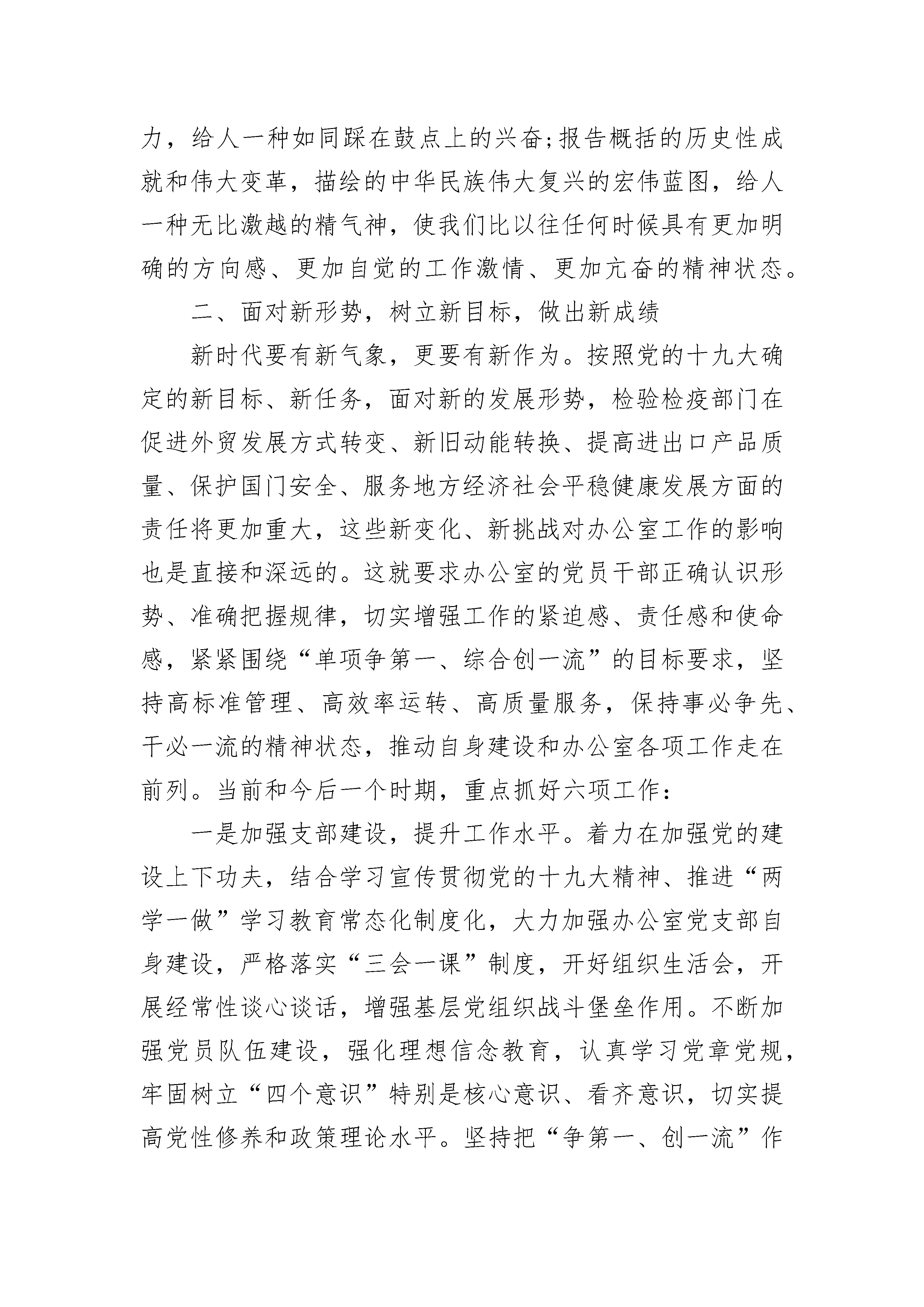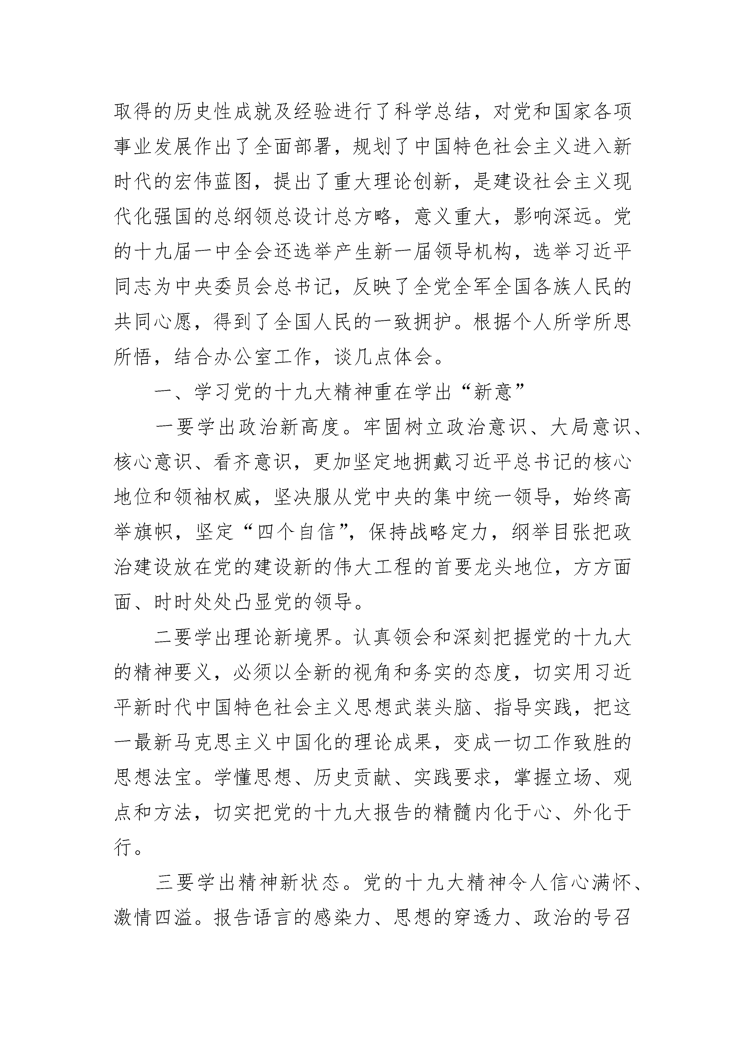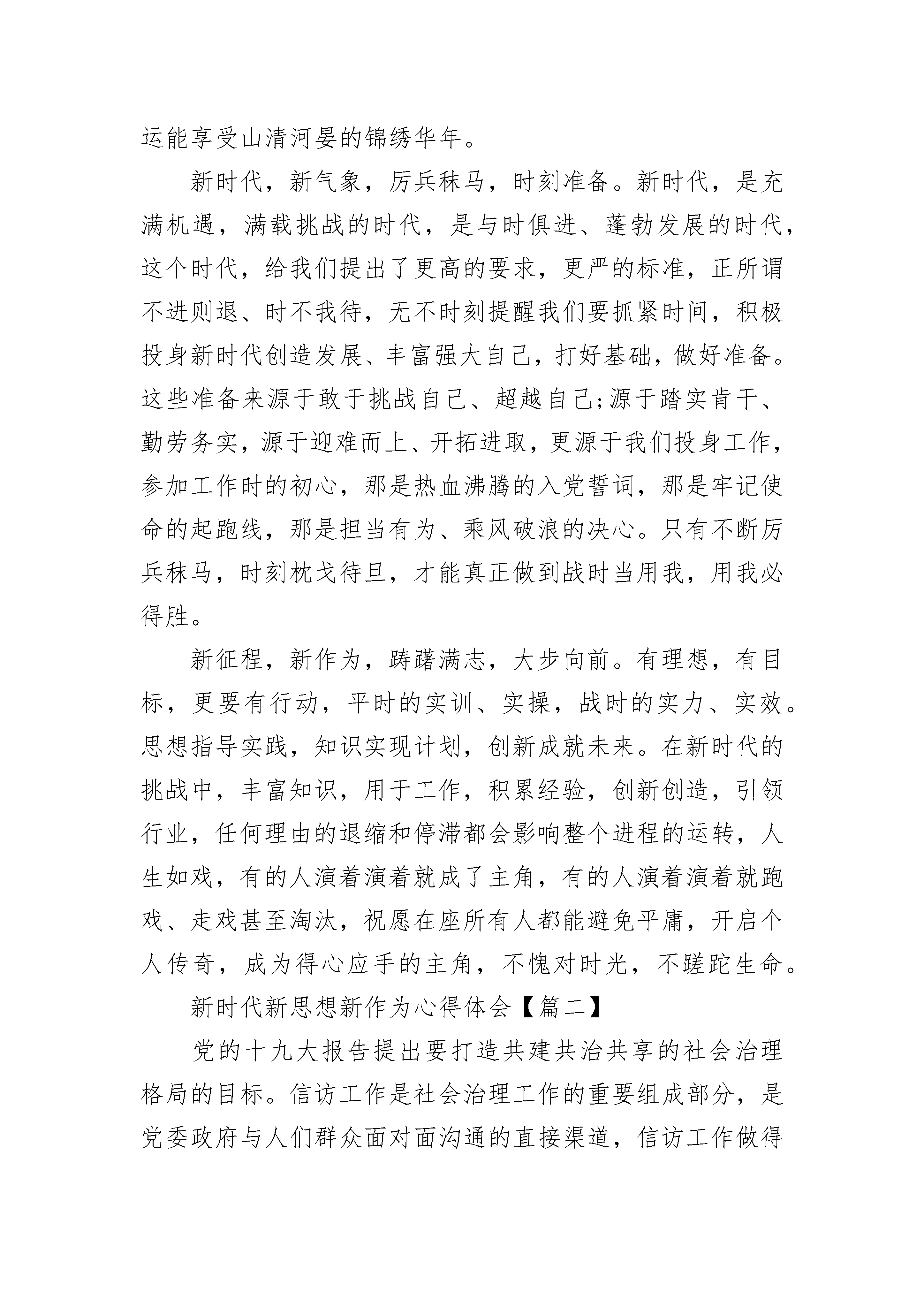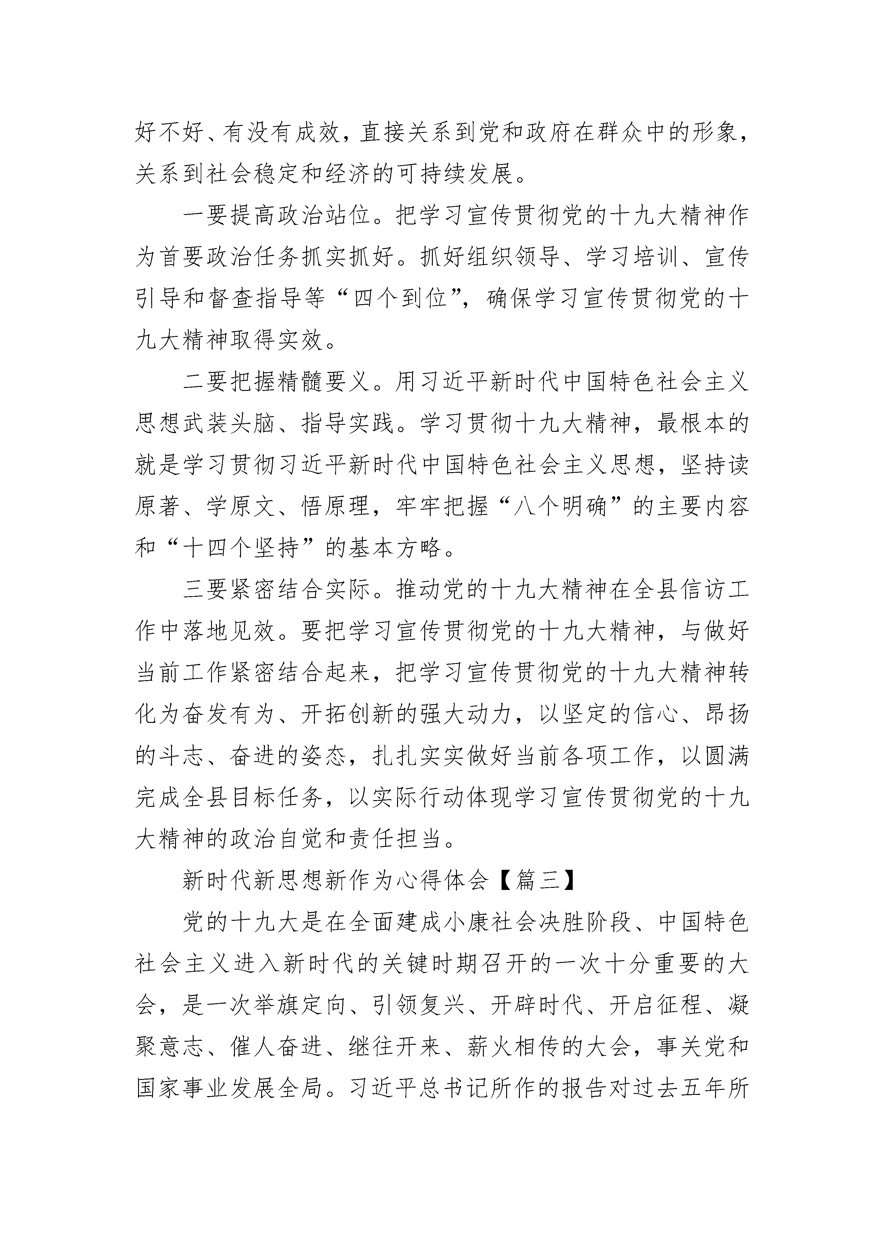 新时代新思想新作为心得体会9篇党的十九大吹响了新时代推进中国特色社会主义伟大事业的嘹亮号角。“新时代要有新气象,更要有新作为”“中国共产党立志于中华民族千秋伟业,百年恰是风华正茂”“不要人夸颜色好,只留清气满乾坤”……习近平同志发自肺腑的讲话传递出坚定的决心和意志,向世界展示新时代的中国自信。新时代社会主义思想如一道宏光,让梦想和希望在每个人面前展开,举国上下,士农工商兵,东南西北中迅速掀起学习贯彻十九大精神高潮,在全面建设社会主义现代化强国的征程上奋勇向前。新时代,新气象,山清河晏,锦绣华年。十九大报告中,“新时代”一词出现频率极高,共3xx次,其中出现在小标题中3次。中国特色社会主义进入了新时代,这一政治论断,建立在十八大以来取得的历史性成就、发生的历史性变革基础之上,清晰地指出了党和国家事业所处的时代坐标,为明确下一阶段的历史任务、坚持和发展中国特色社会主义提供了基本遵循。我们作为沧海一粟,也真切的感受着祖国的变化。18大以来的xx年,重典治乱,“打虎”“拍蝇”“猎狐”,正能量不断上升,作为中国人的腰杆越来越直,获得感、幸福感、安全感越来越强了。山青了,水绿了,医疗方便了,教育资源丰富了,在各政府部门办事方便快捷了,各行各业人们的笑容变多了,投诉无门无助无依的事情变少了……我们很幸运赶上了这样蓬勃活力、激扬奋进的时代,我们更幸运能享受山清河晏的锦绣华年。新时代,新气象,厉兵秣马,时刻准备。新时代,是充满机遇,满载挑战的时代,是与时俱进、蓬勃发展的时代,这个时代,给我们提出了更高的要求,更严的标准,正所谓不进则退、时不我待,无不时刻提醒我们要抓紧时间,积极投身新时代创造发展、丰富强大自己,打好基础,做好准备。这些准备来源于敢于挑战自己、超越自己;源于踏实肯干、勤劳务实,源于迎难而上、开拓进取,更源于我们投身工作,参加工作时的初心,那是热血沸腾的入党誓词,那是牢记使命的起跑线,那是担当有为、乘风破浪的决心。只有不断厉兵秣马,时刻枕戈待旦,才能真正做到战时当用我,用我必得胜。新征程,新作为,踌躇满志,大步向前。有理想,有目标,更要有行动,平时的实训、实操,战时的实力、实效。思想指导实践,知识实现计划,创新成就未来。在新时代的挑战中,丰富知识,用于工作,积累经验,创新创造,引领行业,任何理由的退缩和停滞都会影响整个进程的运转,人生如戏,有的人演着演着就成了主角,有的人演着演着就跑戏、走戏甚至淘汰,祝愿在座所有人都能避免平庸,开启个人传奇,成为得心应手的主角,不愧对时光,不蹉跎生命。新时代新思想新作为心得体会【篇二】党的十九大报告提出要打造共建共治共享的社会治理格局的目标。信访工作是社会治理工作的重要组成部分,是党委政府与人们群众面对面沟通的直接渠道,信访工作做得好不好、有没有成效,直接关系到党和政府在群众中的形象,关系到社会稳定和经济的可持续发展。一要提高政治站位。把学习宣传贯彻党的十九大精神作为首要政治任务抓实抓好。抓好组织领导、学习培训、宣传引导和督查指导等“四个到位”,确保学习宣传贯彻党的十九大精神取得实效。二要把握精髓要义。用习近平新时代中国特色社会主义思想武装头脑、指导实践。学习贯彻十九大精神,最根本的就是学习贯彻习近平新时代中国特色社会主义思想,坚持读原著、学原文、悟原理,牢牢把握“八个明确”的主要内容和“十四个坚持”的基本方略。三要紧密结合实际。推动党的十九大精神在全县信访工作中落地见效。要把学习宣传贯彻党的十九大精神,与做好当前工作紧密结合起来,把学习宣传贯彻党的十九大精神转化为奋发有为、开拓创新的强大动力,以坚定的信心、昂扬的斗志、奋进的姿态,扎扎实实做好当前各项工作,以圆满完成全县目标任务,以实际行动体现学习宣传贯彻党的十九大精神的政治自觉和责任担当。新时代新思想新作为心得体会【篇三】党的十九大是在全面建成小康社会决胜阶段、中国特色社会主义进入新时代的关键时期召开的一次十分重要的大会,是一次举旗定向、引领复兴、开辟时代、开启征程、凝聚意志、催人奋进、继往开来、薪火相传的大会,事关党和国家事业发展全局。习近平总书记所作的报告对过去五年所取得的历史性成就及经验进行了科学总结,对党和国家各项事业发展作出了全面部署,规划了中国特色社会主义进入新时代的宏伟蓝图,提出了重大理论创新,是建设社会主义现代化强国的总纲领总设计总方略,意义重大,影响深远。党的十九届一中全会还选举产生新一届领导机构,选举习近平同志为中央委员会总书记,反映了全党全军全国各族人民的共同心愿,得到了全国人民的一致拥护。根据个人所学所思所悟,结合办公室工作,谈几点体会。一、学习党的十九大精神重在学出“新意”一要学出政治新高度。牢固树立政治意识、大局意识、核心意识、看齐意识,更加坚定地拥戴习近平总书记的核心地位和领袖权威,坚决服从党中央的集中统一领导,