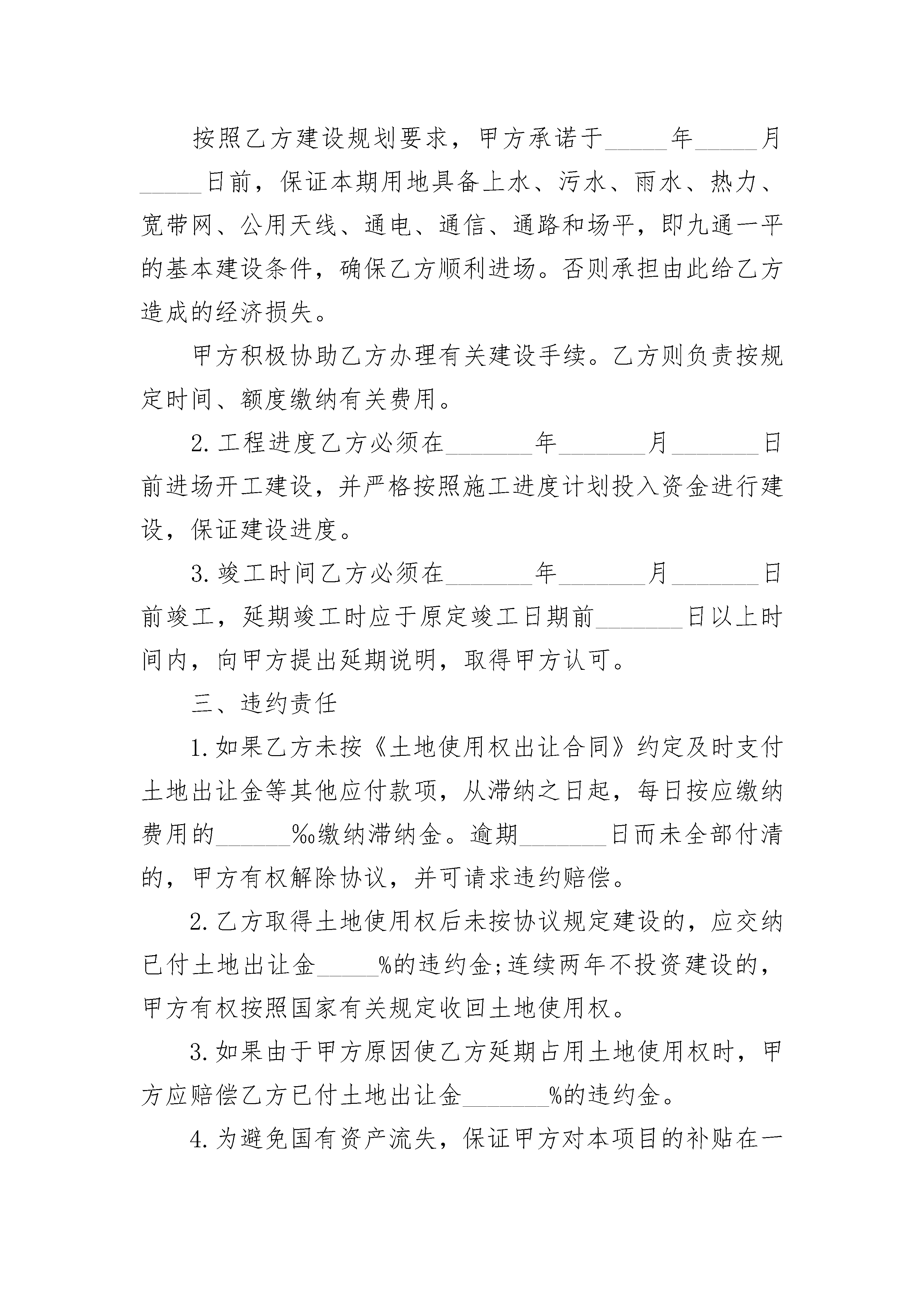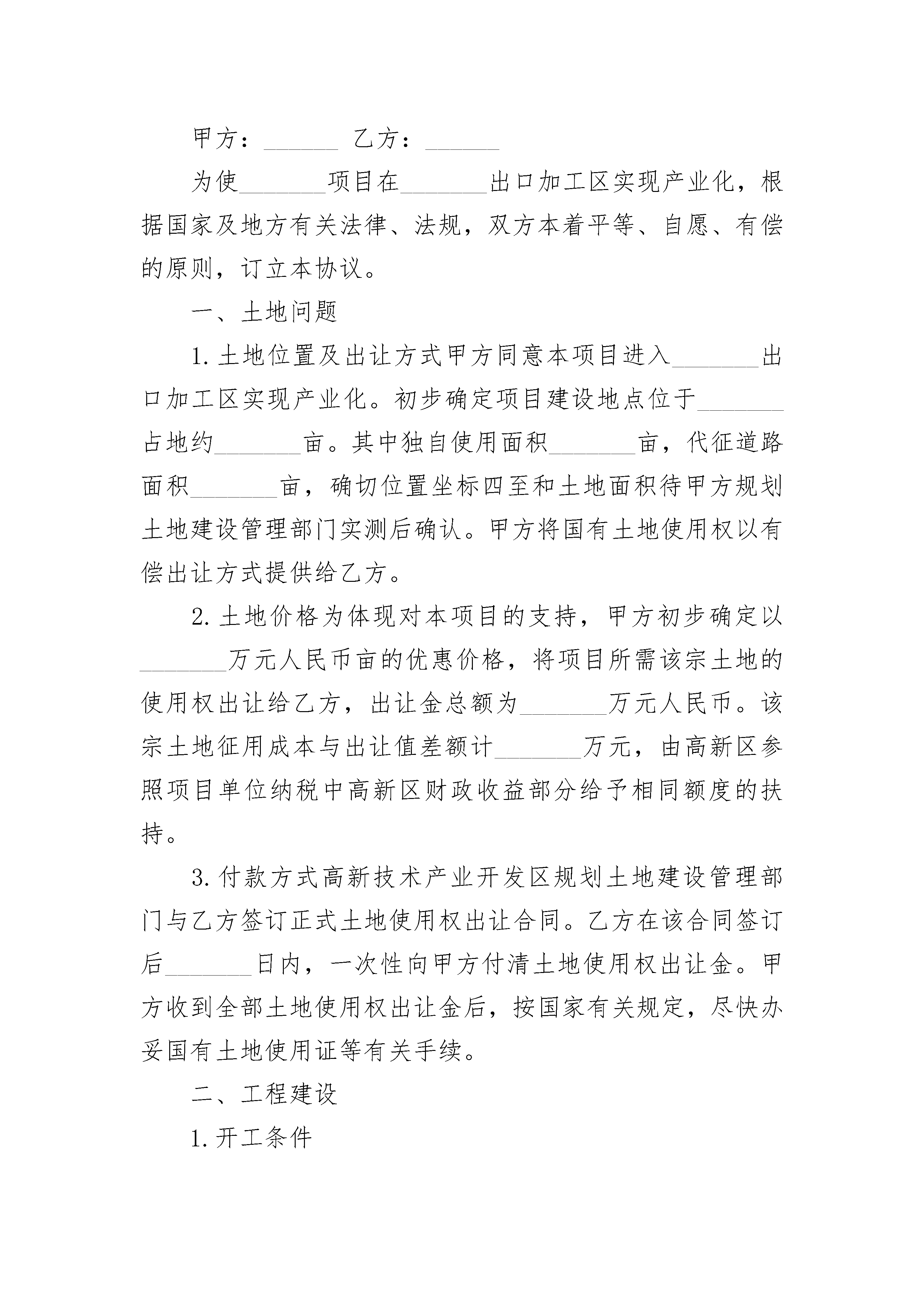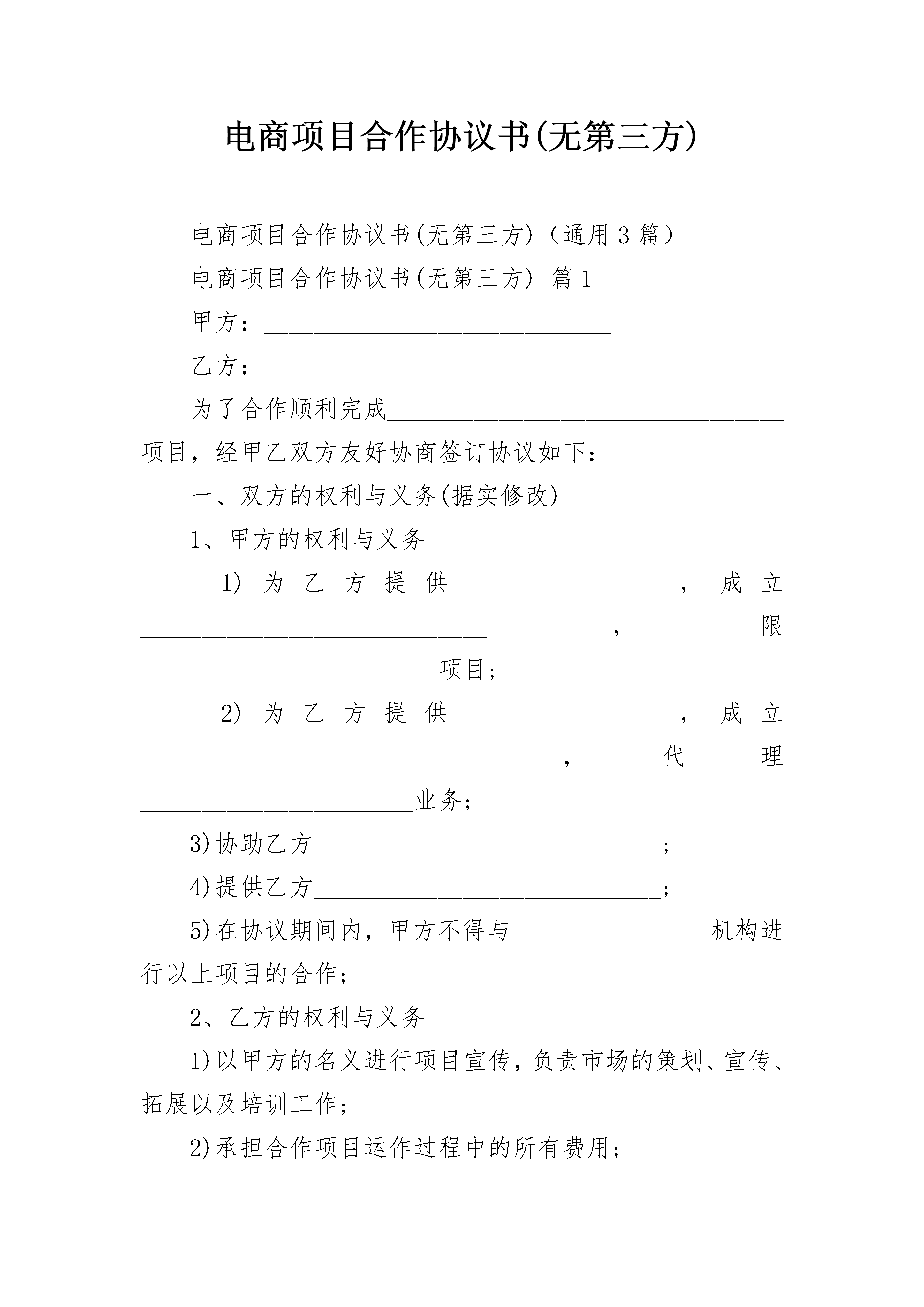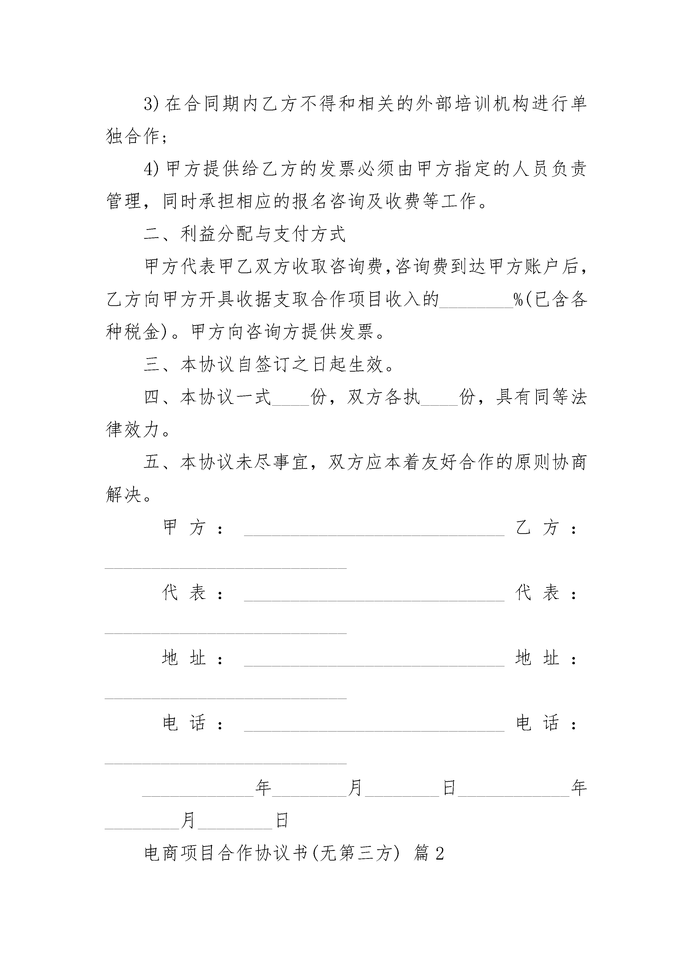 电商项目合作协议书(无第三方)电商项目合作协议书(无第三方)(通用3篇)电商项目合作协议书(无第三方)篇1甲方:____________________________乙方:____________________________为了合作顺利完成________________________________项目,经甲乙双方友好协商签订协议如下:一、双方的权利与义务(据实修改)1、甲方的权利与义务1)为乙方提供________________,成立____________________________,限________________________项目;2)为乙方提供________________,成立____________________________,代理______________________业务;3)协助乙方____________________________;4)提供乙方____________________________;5)在协议期间内,甲方不得与________________机构进行以上项目的合作;2、乙方的权利与义务1)以甲方的名义进行项目宣传,负责市场的策划、宣传、拓展以及培训工作;2)承担合作项目运作过程中的所有费用;3)在合同期内乙方不得和相关的外部培训机构进行单独合作;4)甲方提供给乙方的发票必须由甲方指定的人员负责管理,同时承担相应的报名咨询及收费等工作。二、利益分配与支付方式甲方代表甲乙双方收取咨询费,咨询费到达甲方账户后,乙方向甲方开具收据支取合作项目收入的________%(已含各种税金)。甲方向咨询方提供发票。三、本协议自签订之日起生效。四、本协议一式____份,双方各执____份,具有同等法律效力。五、本协议未尽事宜,双方应本着友好合作的原则协商解决。甲方:____________________________乙方:__________________________代表:____________________________代表:__________________________地址:____________________________地址:__________________________电话:____________________________电话:______________________________________年________月________日____________年________月________日电商项目合作协议书(无第三方)篇2甲方:______乙方:______为使_______项目在_______出口加工区实现产业化,根据国家及地方有关法律、法规,双方本着平等、自愿、有偿的原则,订立本协议。一、土地问题1.土地位置及出让方式甲方同意本项目进入_______出口加工区实现产业化。初步确定项目建设地点位于_______占地约_______亩。其中独自使用面积_______亩,代征道路面积_______亩,确切位置坐标四至和土地面积待甲方规划土地建设管理部门实测后确认。甲方将国有土地使用权以有偿出让方式提供给乙方。2.土地价格为体现对本项目的支持,甲方初步确定以_______万元人民币亩的优惠价格,将项目所需该宗土地的使用权出让给乙方,出让金总额为_______万元人民币。该宗土地征用成本与出让值差额计_______万元,由高新区参照项目单位纳税中高新区财政收益部分给予相同额度的扶持。3.付款方式高新技术产业开发区规划土地建设管理部门与乙方签订正式土地使用权出让合同。乙方在该合同签订后_______日内,一次性向甲方付清土地使用权出让金。甲方收到全部土地使用权出让金后,按国家有关规定,尽快办妥国有土地使用证等有关手续。二、工程建设1.开工条件按照乙方建设规划要求,甲方承诺于_____年_____月_____日前,保证本期用地具备上水、污水、雨水、热力、宽带网、公用天线、通电、通信、通路和场平,即九通一平的基本建设条件,确保乙方顺利进场。否则承担由此给乙方造成的经济损失。甲方积极协助乙方办理有关建设手续。乙方则负责按规定时间、额度缴纳有关费用。2.工程进度乙方必须在_______年_______月_______日前进场开工建设,并严格按照施工进度计划投入资金进行建设,保证建设进度。3.竣工时间乙方必须在_______年_______月_______日前竣工,延期竣工时应于原定竣工日期前_______日以上时间内,向甲方提出延期说明,取得甲方认可。三、违约责任1.如果乙方未按《土地使用权出让合同》约定及时支付土地出让金等其他应付款项,从滞纳之日起,每日按应缴纳费用的______‰缴纳滞纳金。逾期_______日而未全