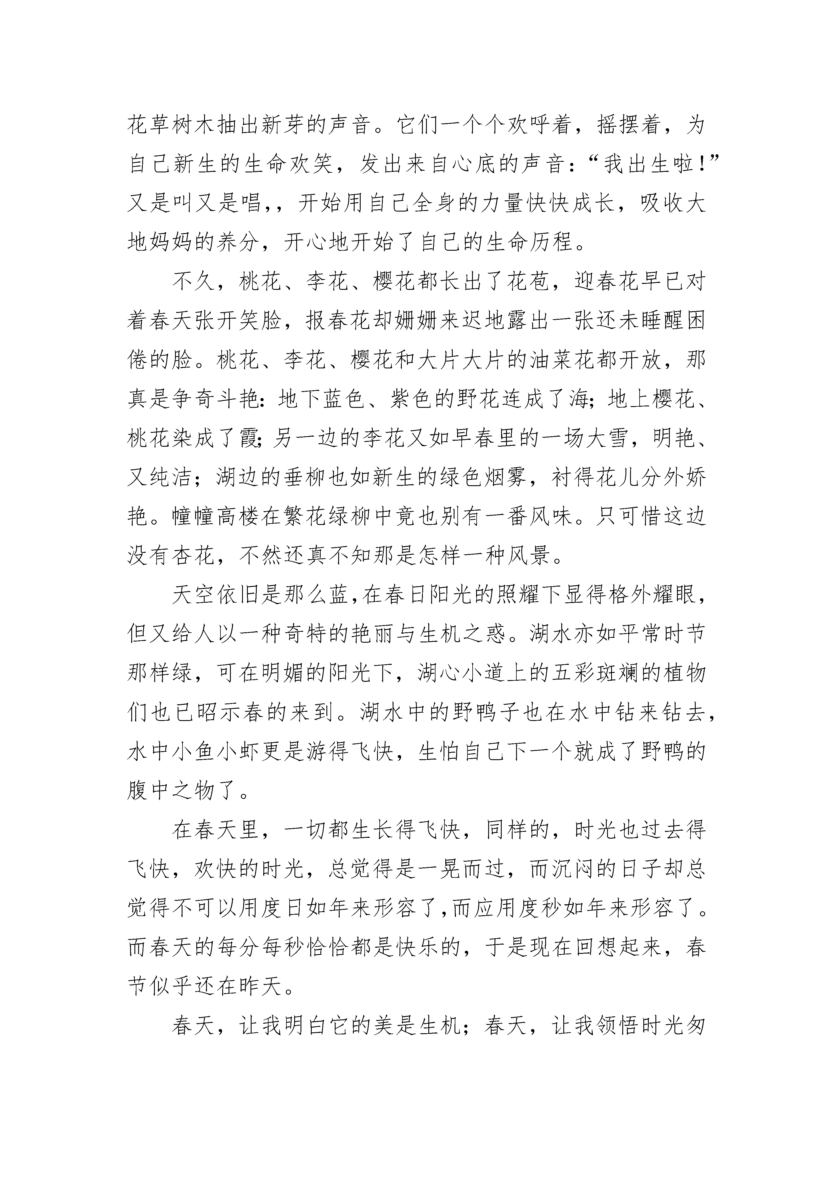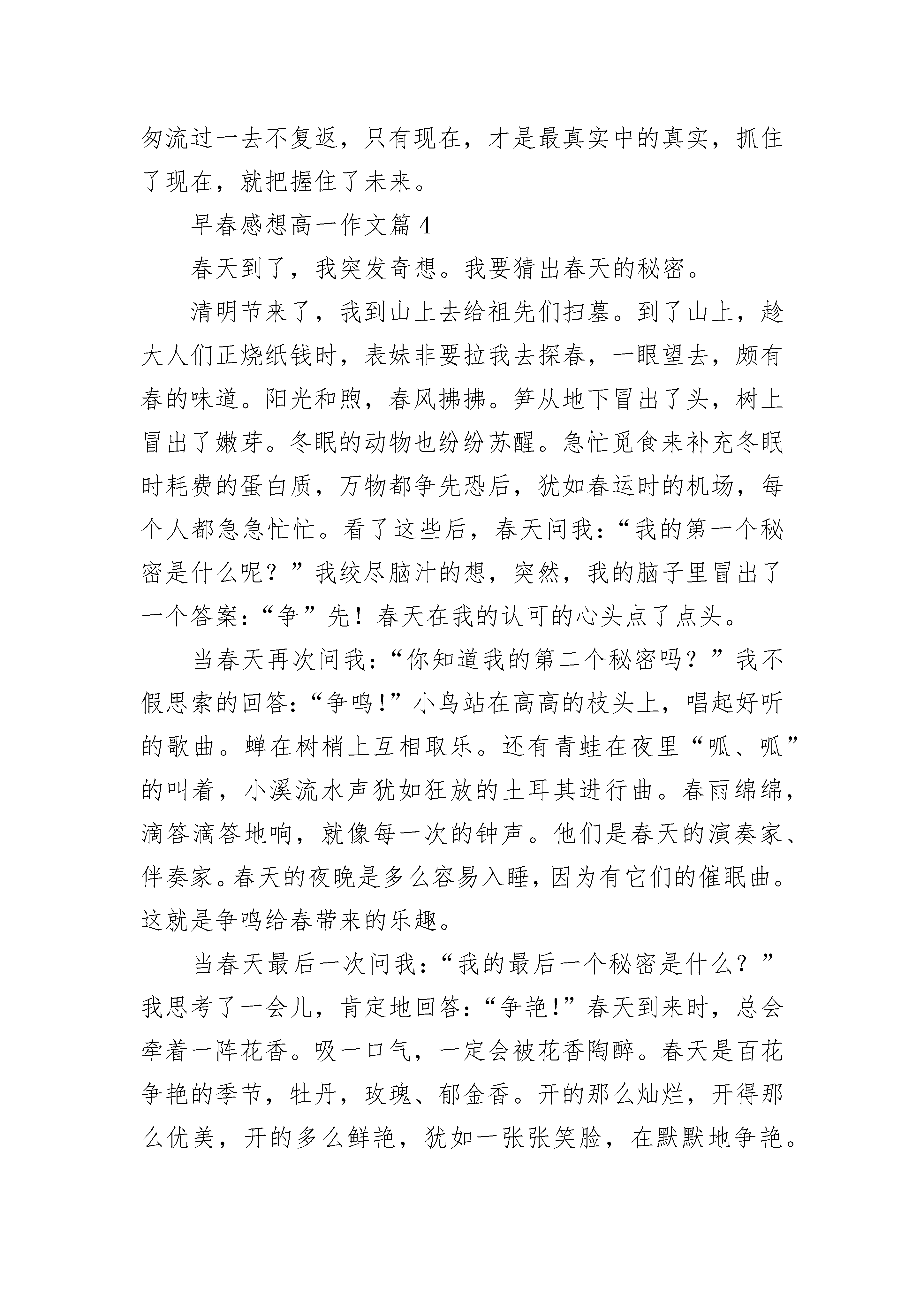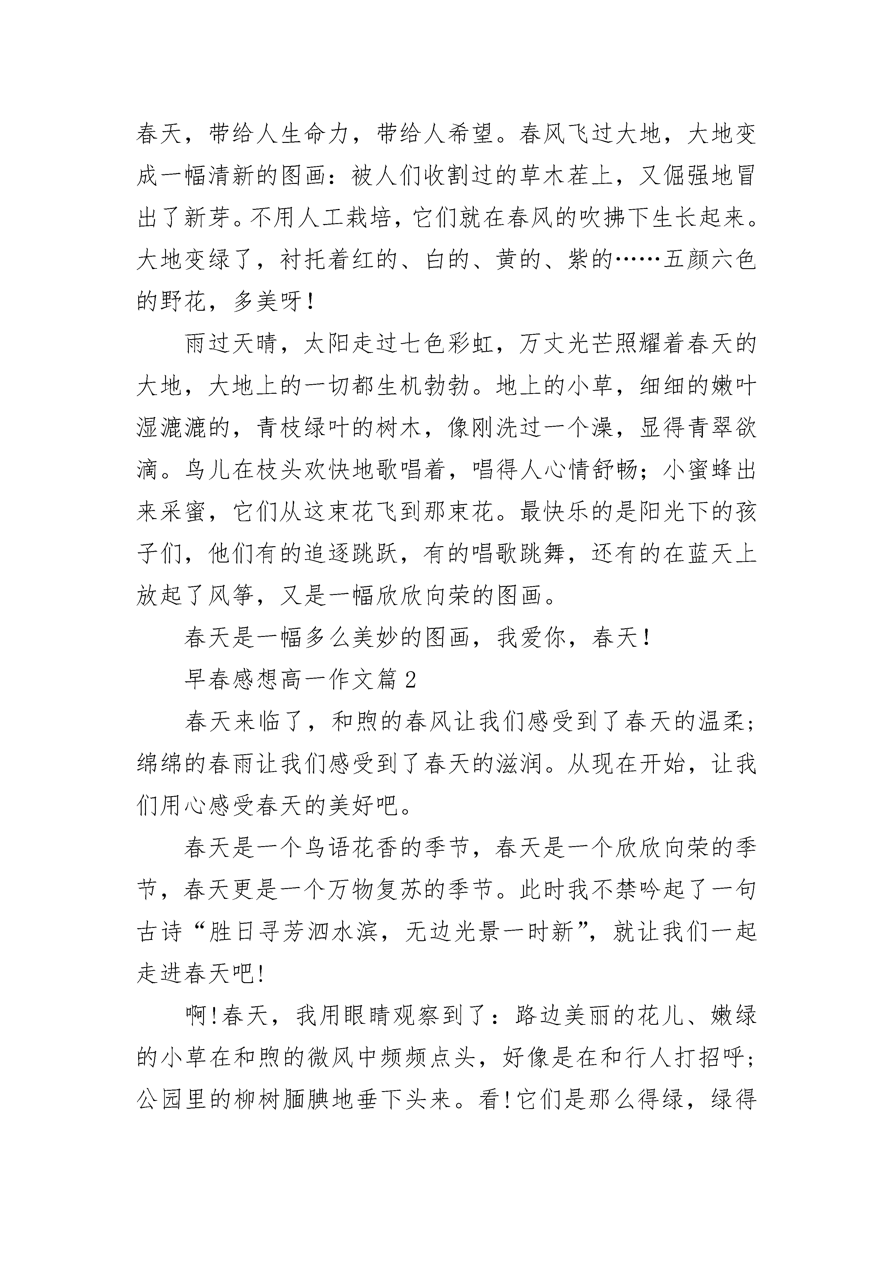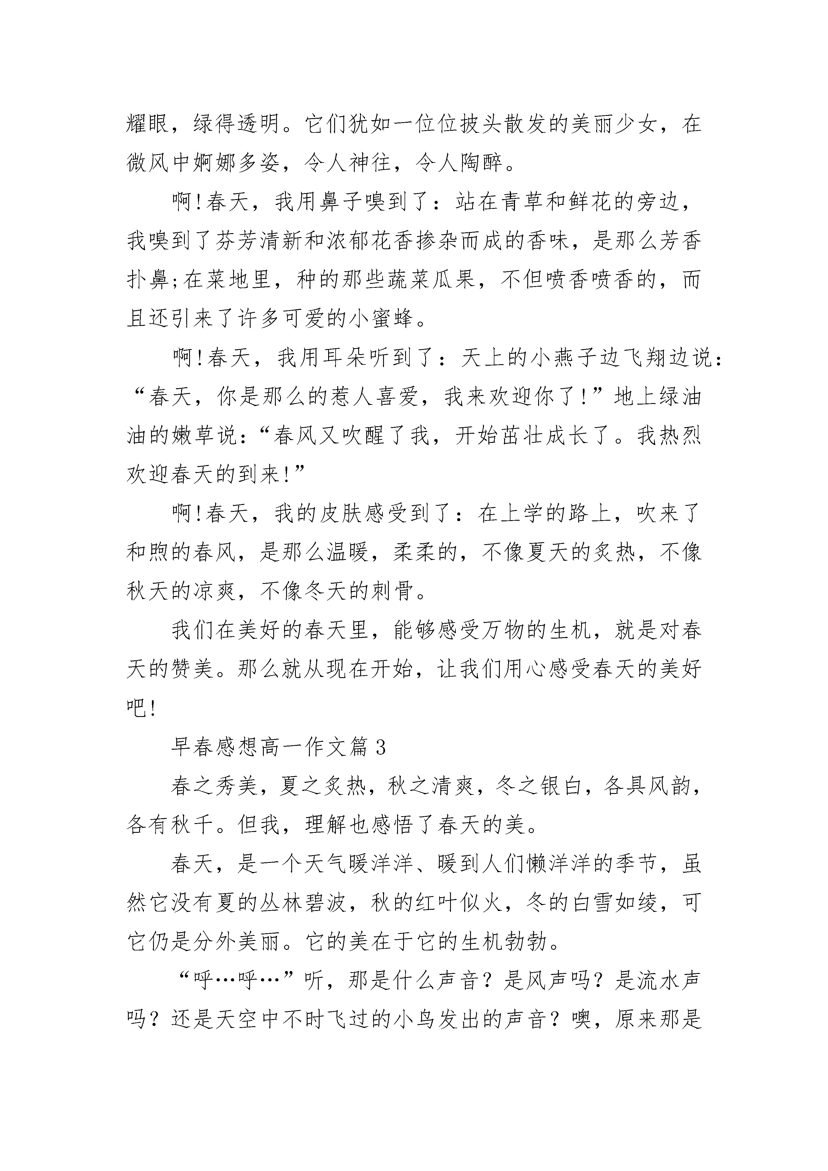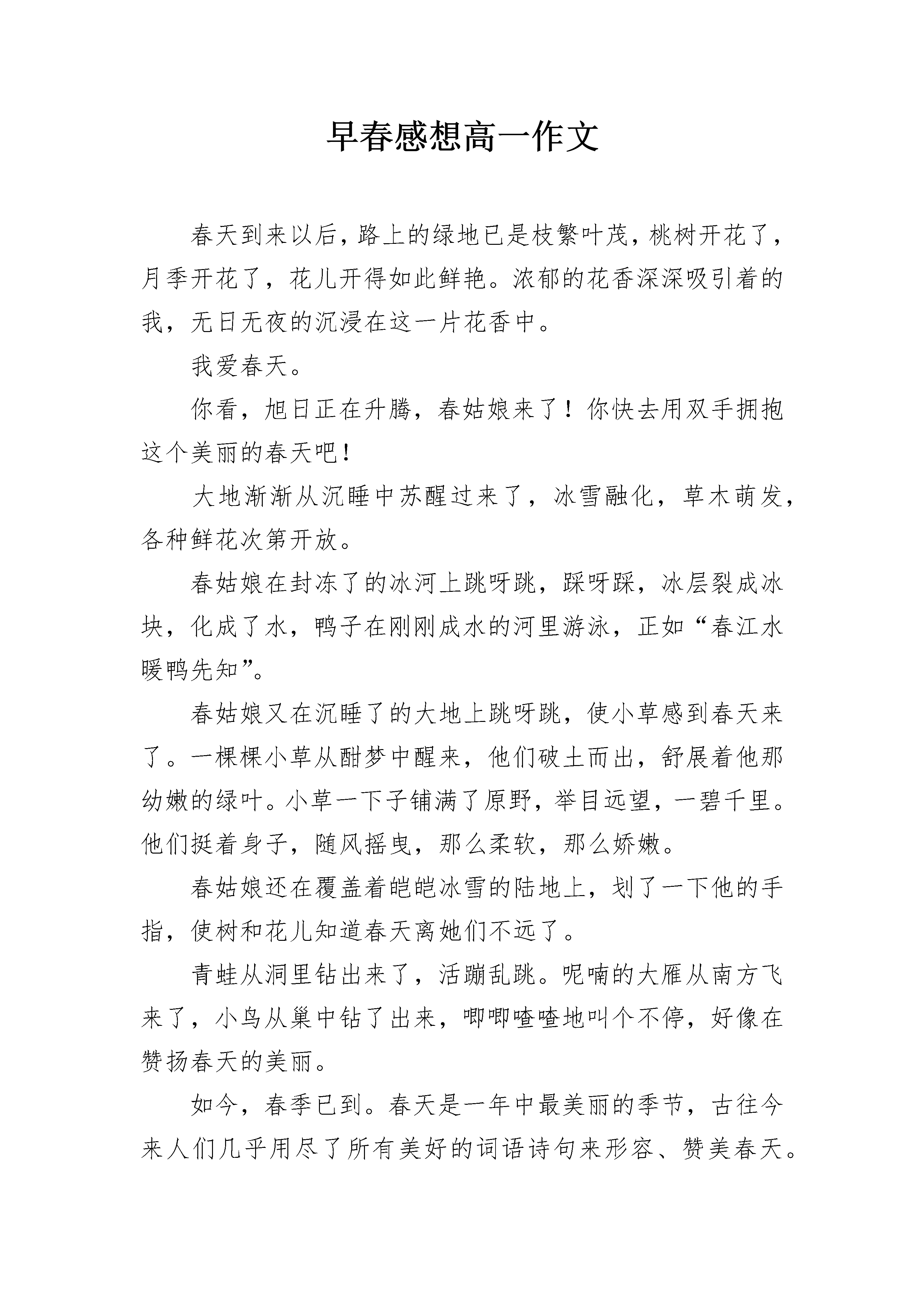 早春感想高一作文春天到来以后,路上的绿地已是枝繁叶茂,桃树开花了,月季开花了,花儿开得如此鲜艳。浓郁的花香深深吸引着的我,无日无夜的沉浸在这一片花香中。我爱春天。你看,旭日正在升腾,春姑娘来了!你快去用双手拥抱这个美丽的春天吧!大地渐渐从沉睡中苏醒过来了,冰雪融化,草木萌发,各种鲜花次第开放。春姑娘在封冻了的冰河上跳呀跳,踩呀踩,冰层裂成冰块,化成了水,鸭子在刚刚成水的河里游泳,正如“春江水暖鸭先知”。春姑娘又在沉睡了的大地上跳呀跳,使小草感到春天来了。一棵棵小草从酣梦中醒来,他们破土而出,舒展着他那幼嫩的绿叶。小草一下子铺满了原野,举目远望,一碧千里。他们挺着身子,随风摇曳,那么柔软,那么娇嫩。春姑娘还在覆盖着皑皑冰雪的陆地上,划了一下他的手指,使树和花儿知道春天离她们不远了。青蛙从洞里钻出来了,活蹦乱跳。呢喃的大雁从南方飞来了,小鸟从巢中钻了出来,唧唧喳喳地叫个不停,好像在赞扬春天的美丽。如今,春季已到。春天是一年中最美丽的季节,古往今来人们几乎用尽了所有美好的词语诗句来形容、赞美春天。春天,带给人生命力,带给人希望。春风飞过大地,大地变成一幅清新的图画:被人们收割过的草木茬上,又倔强地冒出了新芽。不用人工栽培,它们就在春风的吹拂下生长起来。大地变绿了,衬托着红的、白的、黄的、紫的……五颜六色的野花,多美呀!雨过天晴,太阳走过七色彩虹,万丈光芒照耀着春天的大地,大地上的一切都生机勃勃。地上的小草,细细的嫩叶湿漉漉的,青枝绿叶的树木,像刚洗过一个澡,显得青翠欲滴。鸟儿在枝头欢快地歌唱着,唱得人心情舒畅;小蜜蜂出来采蜜,它们从这束花飞到那束花。最快乐的是阳光下的孩子们,他们有的追逐跳跃,有的唱歌跳舞,还有的在蓝天上放起了风筝,又是一幅欣欣向荣的图画。春天是一幅多么美妙的图画,我爱你,春天!早春感想高一作文篇2春天来临了,和煦的春风让我们感受到了春天的温柔;绵绵的春雨让我们感受到了春天的滋润。从现在开始,让我们用心感受春天的美好吧。春天是一个鸟语花香的季节,春天是一个欣欣向荣的季节,春天更是一个万物复苏的季节。此时我不禁吟起了一句古诗“胜日寻芳泗水滨,无边光景一时新”,就让我们一起走进春天吧!啊!春天,我用眼睛观察到了:路边美丽的花儿、嫩绿的小草在和煦的微风中频频点头,好像是在和行人打招呼;公园里的柳树腼腆地垂下头来。看!它们是那么得绿,绿得耀眼,绿得透明。它们犹如一位位披头散发的美丽少女,在微风中婀娜多姿,令人神往,令人陶醉。啊!春天,我用鼻子嗅到了:站在青草和鲜花的旁边,我嗅到了芬芳清新和浓郁花香掺杂而成的香味,是那么芳香扑鼻;在菜地里,种的那些蔬菜瓜果,不但喷香喷香的,而且还引来了许多可爱的小蜜蜂。啊!春天,我用耳朵听到了:天上的小燕子边飞翔边说:“春天,你是那么的惹人喜爱,我来欢迎你了!”地上绿油油的嫩草说:“春风又吹醒了我,开始茁壮成长了。我热烈欢迎春天的到来!”啊!春天,我的皮肤感受到了:在上学的路上,吹来了和煦的春风,是那么温暖,柔柔的,不像夏天的炙热,不像秋天的凉爽,不像冬天的刺骨。我们在美好的春天里,能够感受万物的生机,就是对春天的赞美。那么就从现在开始,让我们用心感受春天的美好吧!早春感想高一作文篇3春之秀美,夏之炙热,秋之清爽,冬之银白,各具风韵,各有秋千。但我,理解也感悟了春天的美。春天,是一个天气暖洋洋、暖到人们懒洋洋的季节,虽然它没有夏的丛林碧波,秋的红叶似火,冬的白雪如绫,可它仍是分外美丽。它的美在于它的生机勃勃。“呼…呼…”听,那是什么声音?是风声吗?是流水声吗?还是天空中不时飞过的小鸟发出的声音?噢,原来那是花草树木抽出新芽的声音。它们一个个欢呼着,摇摆着,为自己新生的生命欢笑,发出来自心底的声音:“我出生啦!”又是叫又是唱,,开始用自己全身的力量快快成长,吸收大地妈妈的养分,开心地开始了自己的生命历程。不久,桃花、李花、樱花都长出了花苞,迎春花早已对着春天张开笑脸,报春花却姗姗来迟地露出一张还未睡醒困倦的脸。桃花、李花、樱花和大片大片的油菜花都开放,那真是争奇斗艳:地下蓝色、紫色的野花连成了海;地上樱花、桃花染成了霞;另一边的李花又如早春里的一场大雪,明艳、又纯洁;湖边的垂柳也如新生的绿色烟雾,衬得花儿分外娇艳。幢幢高楼在繁花绿柳中竟也别有一番风味。只可惜这边没有杏花,不然还真不知那是怎样一种风景。天空依旧是那么蓝,在春日阳光的照耀下显得格外耀眼,但又给人以一种奇特的艳丽与生机之惑。湖水亦如平常时节那样绿,可在明媚的阳光下,湖心小道上的五彩斑斓的植物们也已昭示春的来到。湖水中的野鸭子也在水中钻来钻去,水中小鱼小虾更是游得飞快,生怕自己下一个就成了野鸭的腹中之物了。在春天里,一切都生长得飞快,同样的,时光也过去得飞快,欢快的时光,总觉得是一晃而过,而沉闷的日子却总觉得不可以用度日如年来形容了