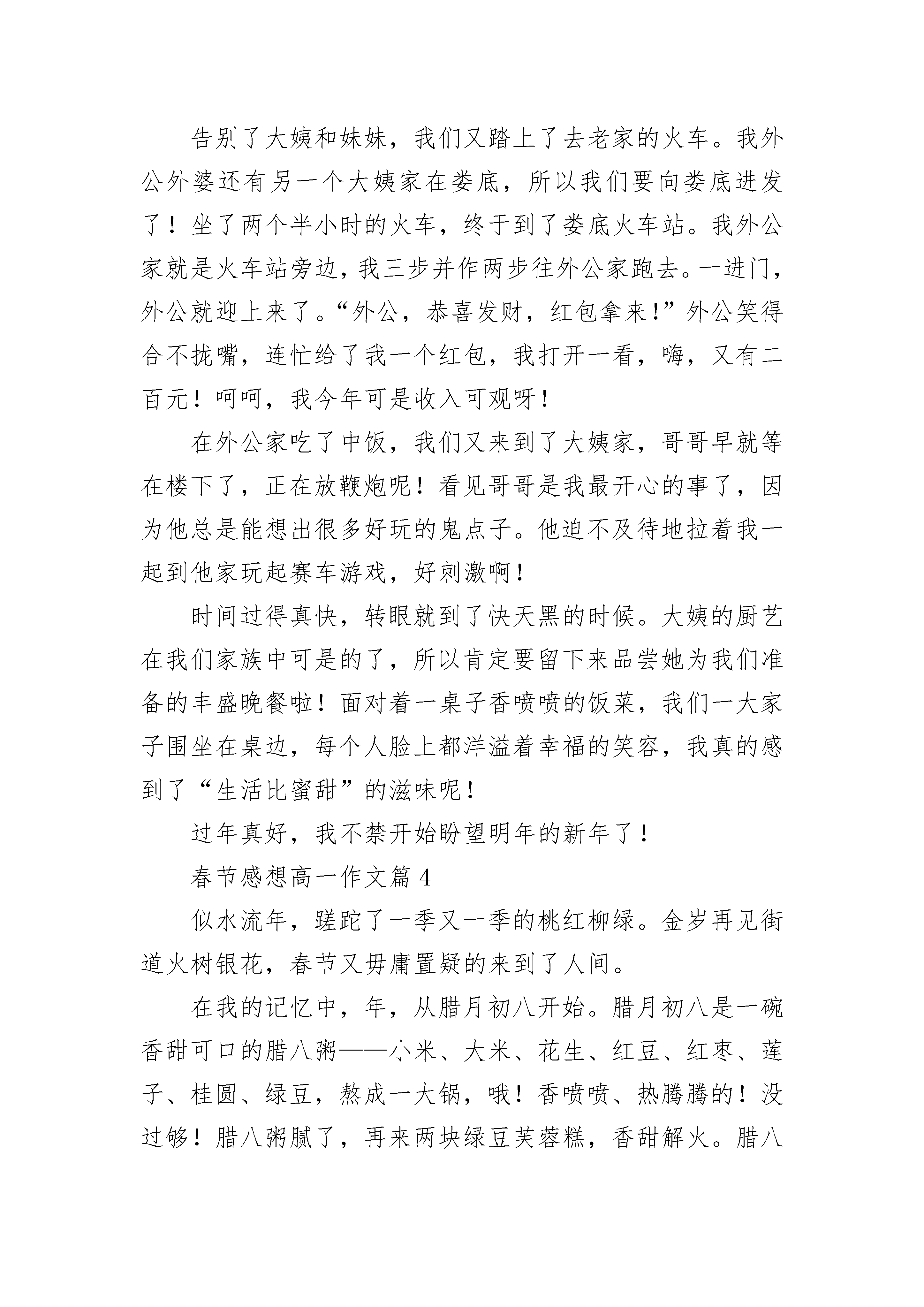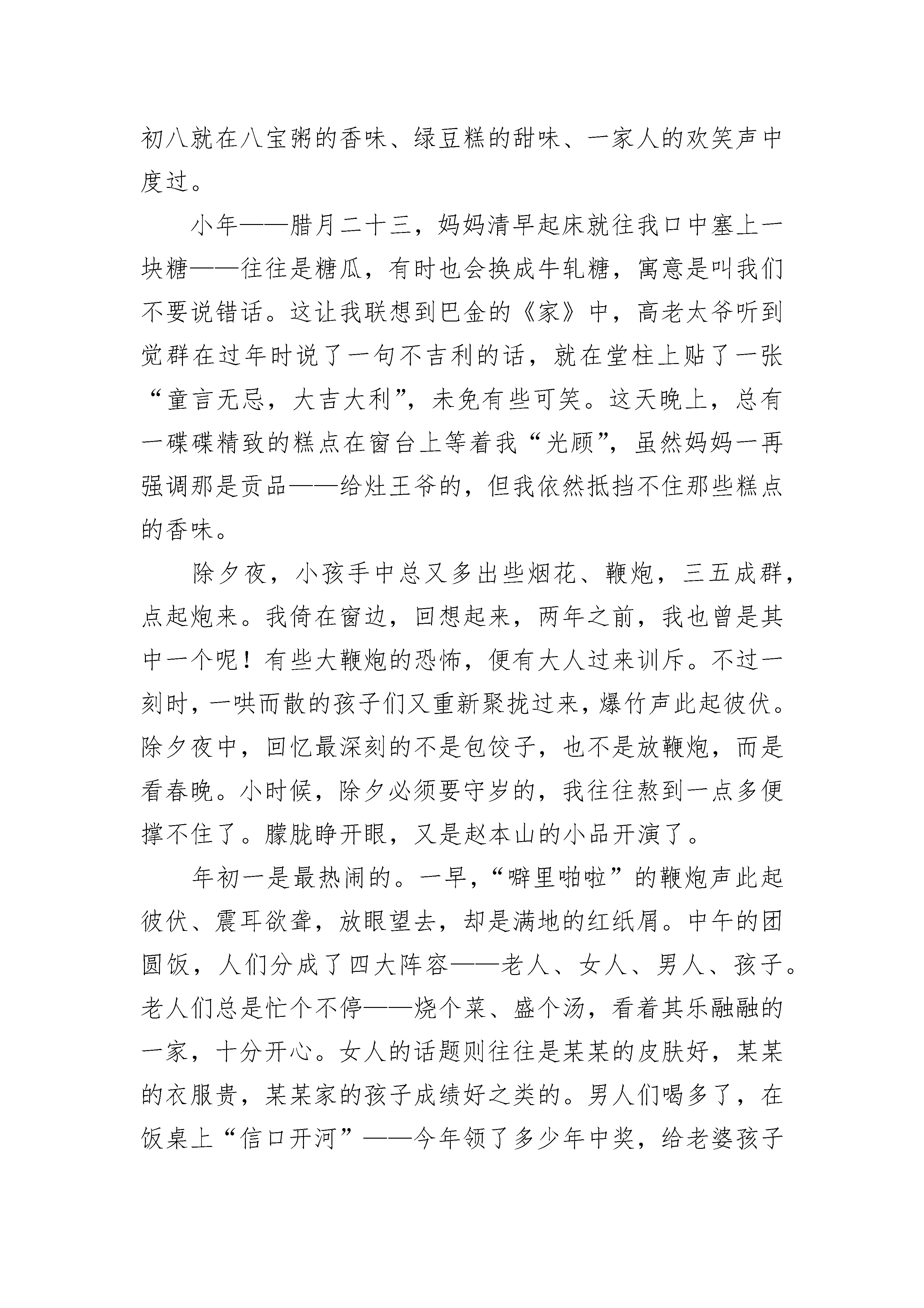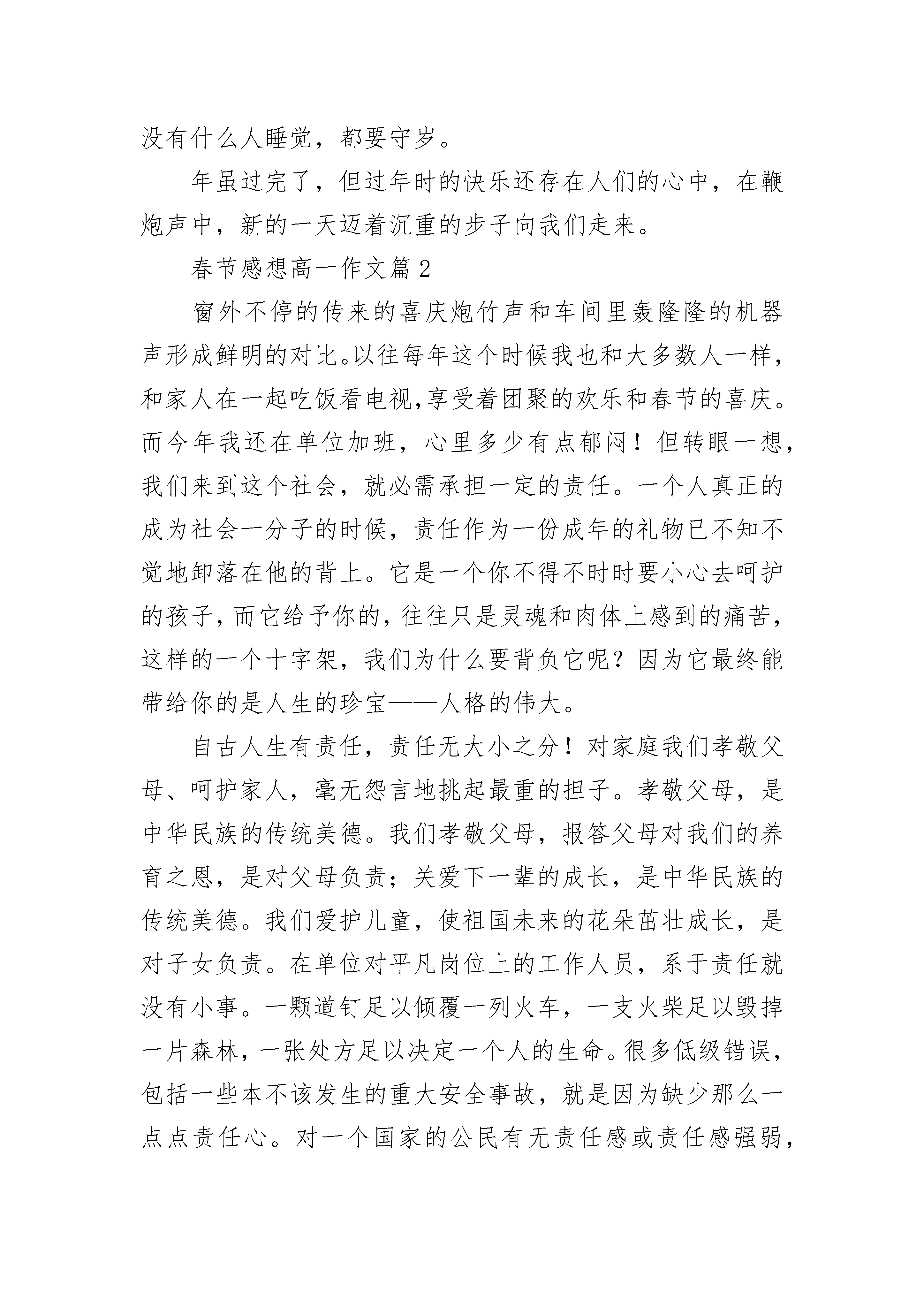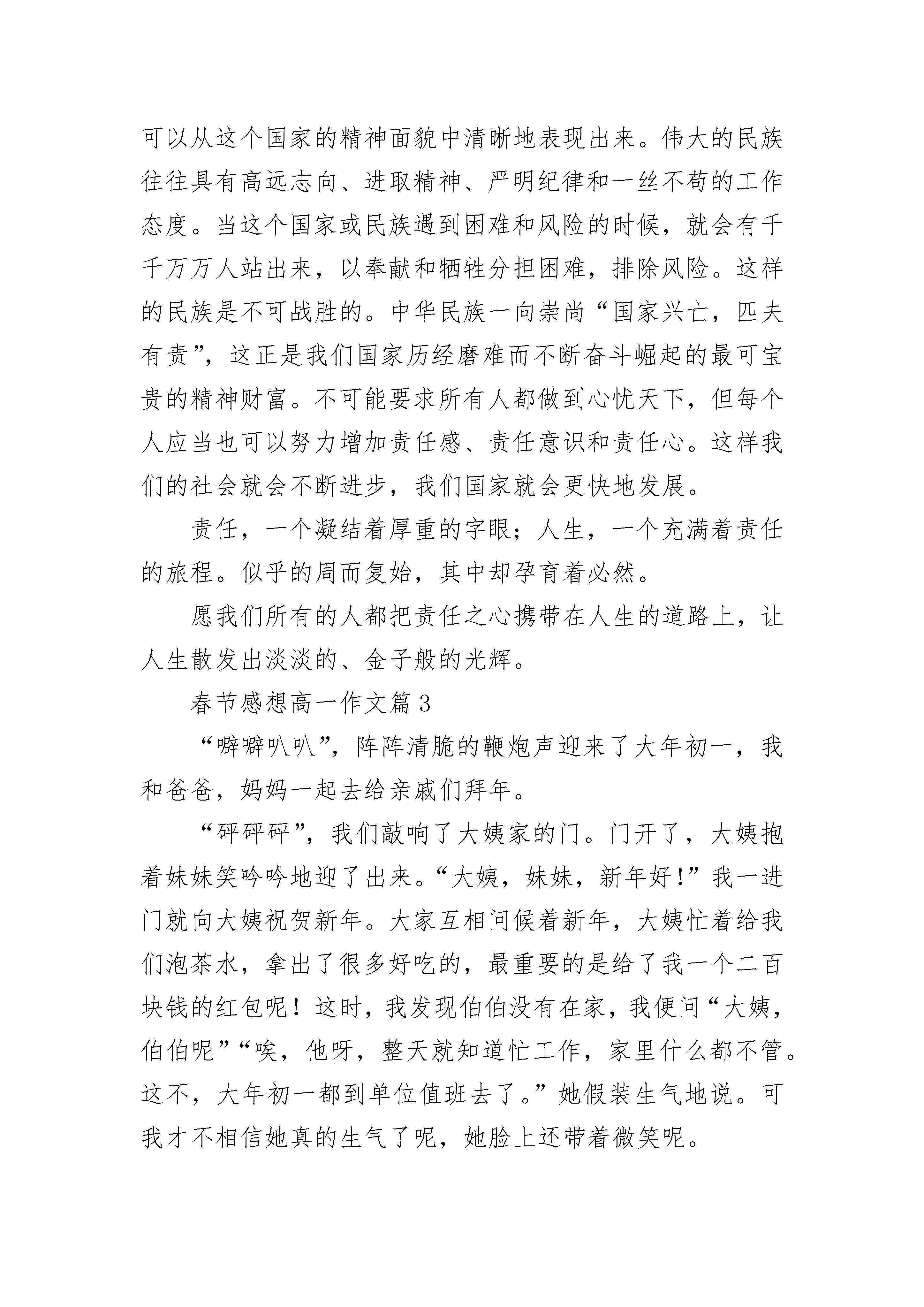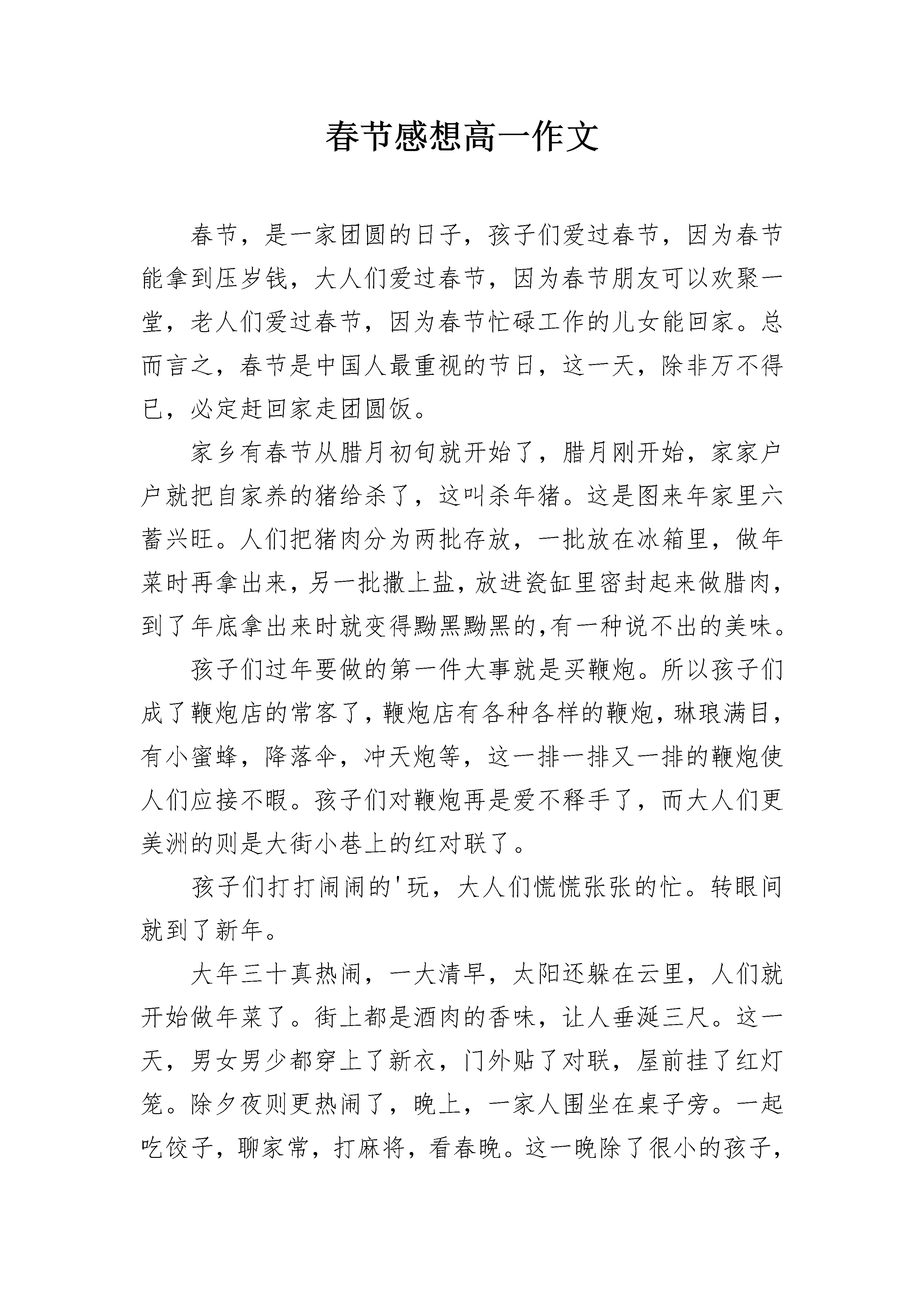 春节感想高一作文春节,是一家团圆的日子,孩子们爱过春节,因为春节能拿到压岁钱,大人们爱过春节,因为春节朋友可以欢聚一堂,老人们爱过春节,因为春节忙碌工作的儿女能回家。总而言之,春节是中国人最重视的节日,这一天,除非万不得已,必定赶回家走团圆饭。家乡有春节从腊月初旬就开始了,腊月刚开始,家家户户就把自家养的猪给杀了,这叫杀年猪。这是图来年家里六蓄兴旺。人们把猪肉分为两批存放,一批放在冰箱里,做年菜时再拿出来,另一批撒上盐,放进瓷缸里密封起来做腊肉,到了年底拿出来时就变得黝黑黝黑的,有一种说不出的美味。孩子们过年要做的第一件大事就是买鞭炮。所以孩子们成了鞭炮店的常客了,鞭炮店有各种各样的鞭炮,琳琅满目,有小蜜蜂,降落伞,冲天炮等,这一排一排又一排的鞭炮使人们应接不暇。孩子们对鞭炮再是爱不释手了,而大人们更美洲的则是大街小巷上的红对联了。孩子们打打闹闹的'玩,大人们慌慌张张的忙。转眼间就到了新年。大年三十真热闹,一大清早,太阳还躲在云里,人们就开始做年菜了。街上都是酒肉的香味,让人垂涎三尺。这一天,男女男少都穿上了新衣,门外贴了对联,屋前挂了红灯笼。除夕夜则更热闹了,晚上,一家人围坐在桌子旁。一起吃饺子,聊家常,打麻将,看春晚。这一晚除了很小的孩子,没有什么人睡觉,都要守岁。年虽过完了,但过年时的快乐还存在人们的心中,在鞭炮声中,新的一天迈着沉重的步子向我们走来。春节感想高一作文篇2窗外不停的传来的喜庆炮竹声和车间里轰隆隆的机器声形成鲜明的对比。以往每年这个时候我也和大多数人一样,和家人在一起吃饭看电视,享受着团聚的欢乐和春节的喜庆。而今年我还在单位加班,心里多少有点郁闷!但转眼一想,我们来到这个社会,就必需承担一定的责任。一个人真正的成为社会一分子的时候,责任作为一份成年的礼物已不知不觉地卸落在他的背上。它是一个你不得不时时要小心去呵护的孩子,而它给予你的,往往只是灵魂和肉体上感到的痛苦,这样的一个十字架,我们为什么要背负它呢?因为它最终能带给你的是人生的珍宝——人格的伟大。自古人生有责任,责任无大小之分!对家庭我们孝敬父母、呵护家人,毫无怨言地挑起最重的担子。孝敬父母,是中华民族的传统美德。我们孝敬父母,报答父母对我们的养育之恩,是对父母负责;关爱下一辈的成长,是中华民族的传统美德。我们爱护儿童,使祖国未来的花朵茁壮成长,是对子女负责。在单位对平凡岗位上的工作人员,系于责任就没有小事。一颗道钉足以倾覆一列火车,一支火柴足以毁掉一片森林,一张处方足以决定一个人的生命。很多低级错误,包括一些本不该发生的重大安全事故,就是因为缺少那么一点点责任心。对一个国家的公民有无责任感或责任感强弱,可以从这个国家的精神面貌中清晰地表现出来。伟大的民族往往具有高远志向、进取精神、严明纪律和一丝不苟的工作态度。当这个国家或民族遇到困难和风险的时候,就会有千千万万人站出来,以奉献和牺牲分担困难,排除风险。这样的民族是不可战胜的。中华民族一向崇尚“国家兴亡,匹夫有责”,这正是我们国家历经磨难而不断奋斗崛起的最可宝贵的精神财富。不可能要求所有人都做到心忧天下,但每个人应当也可以努力增加责任感、责任意识和责任心。这样我们的社会就会不断进步,我们国家就会更快地发展。责任,一个凝结着厚重的字眼;人生,一个充满着责任的旅程。似乎的周而复始,其中却孕育着必然。愿我们所有的人都把责任之心携带在人生的道路上,让人生散发出淡淡的、金子般的光辉。春节感想高一作文篇3“噼噼叭叭”,阵阵清脆的鞭炮声迎来了大年初一,我和爸爸,妈妈一起去给亲戚们拜年。“砰砰砰”,我们敲响了大姨家的门。门开了,大姨抱着妹妹笑吟吟地迎了出来。“大姨,妹妹,新年好!”我一进门就向大姨祝贺新年。大家互相问候着新年,大姨忙着给我们泡茶水,拿出了很多好吃的,最重要的是给了我一个二百块钱的红包呢!这时,我发现伯伯没有在家,我便问“大姨,伯伯呢”“唉,他呀,整天就知道忙工作,家里什么都不管。这不,大年初一都到单位值班去了。”她假装生气地说。可我才不相信她真的生气了呢,她脸上还带着微笑呢。告别了大姨和妹妹,我们又踏上了去老家的火车。我外公外婆还有另一个大姨家在娄底,所以我们要向娄底进发了!坐了两个半小时的火车,终于到了娄底火车站。我外公家就是火车站旁边,我三步并作两步往外公家跑去。一进门,外公就迎上来了。“外公,恭喜发财,红包拿来!”外公笑得合不拢嘴,连忙给了我一个红包,我打开一看,嗨,又有二百元!呵呵,我今年可是收入可观呀!在外公家吃了中饭,我们又来到了大姨家,哥哥早就等在楼下了,正在放鞭炮呢!看见哥哥是我最开心的事了,因为他总是能想出很多好玩的鬼点子。他迫不及待地拉着我一起到他家玩起赛车游戏,好刺激啊!时间过得真快,转眼就到了快天黑的时候。大姨的厨艺在我们家族中可是的了,所以肯定要留下来品尝她为我们准备的丰