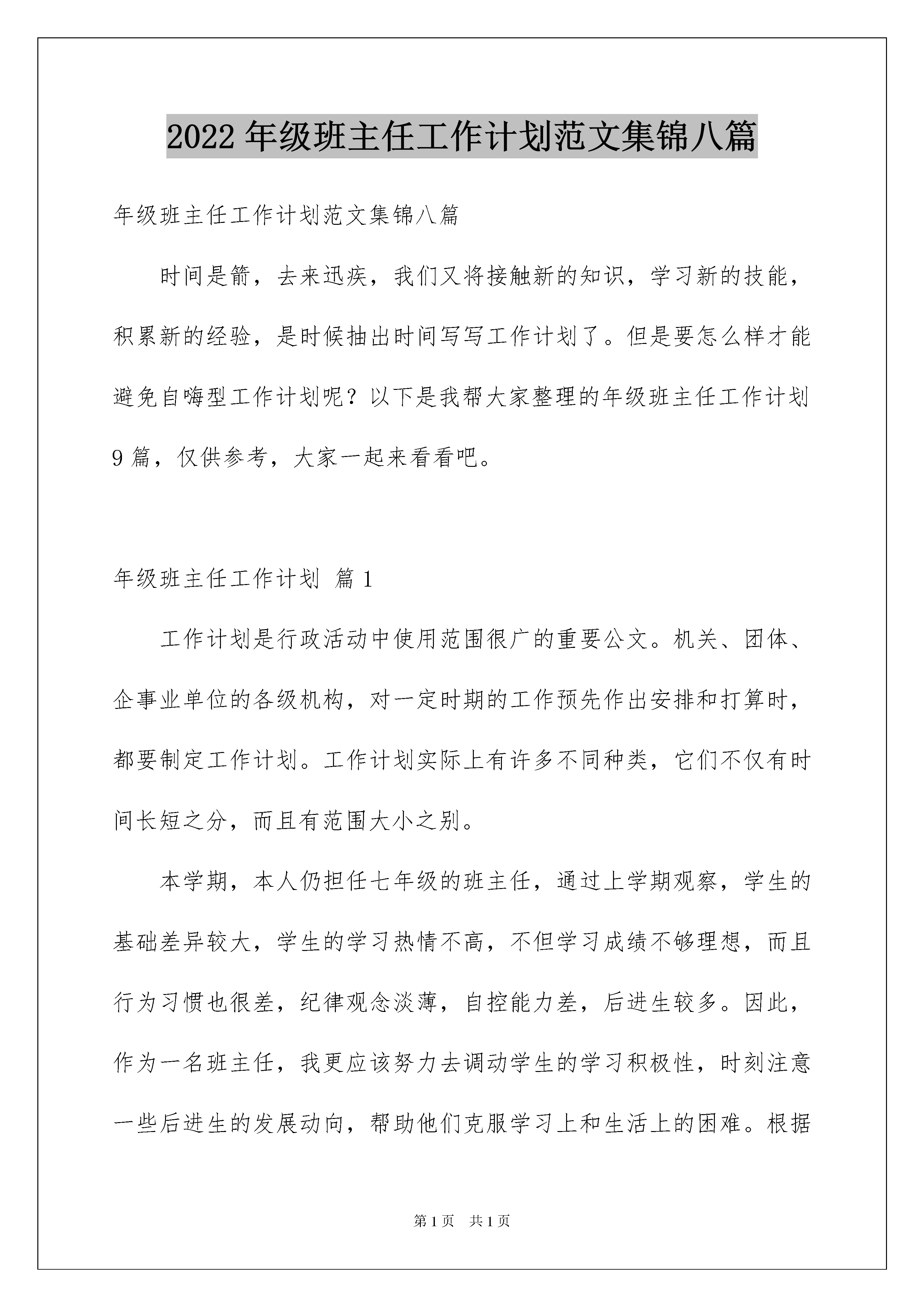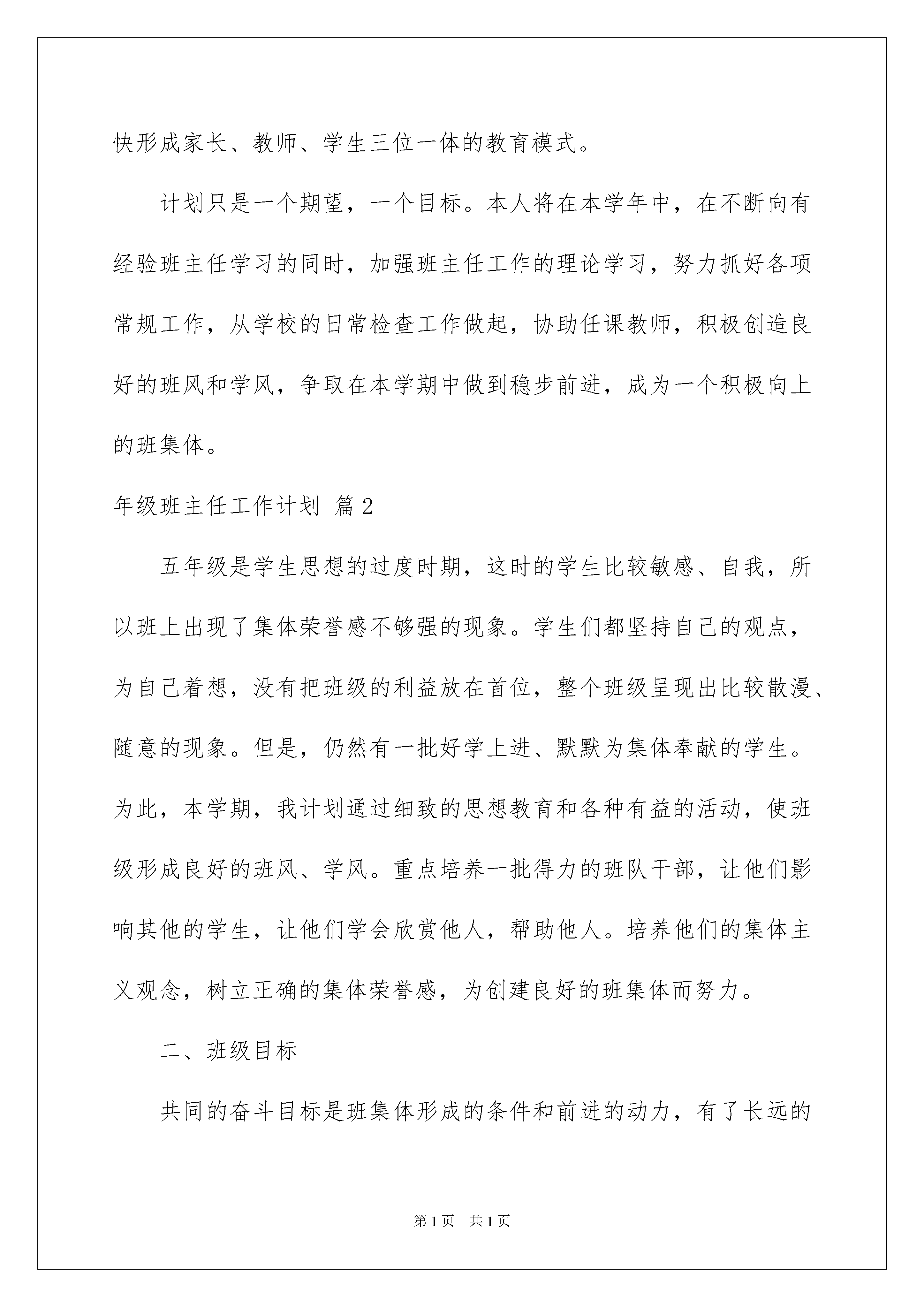 2022年级班主任工作计划范文集锦八篇年级班主任工作计划范文集锦八篇时间是箭,去来迅疾,我们又将接触新的知识,学习新的技能,积累新的经验,是时候抽出时间写写工作计划了。但是要怎么样才能避免自嗨型工作计划呢?以下是我帮大家整理的年级班主任工作计划9篇,仅供参考,大家一起来看看吧。年级班主任工作计划篇1工作计划是行政活动中使用范围很广的重要公文。机关、团体、企事业单位的各级机构,对一定时期的工作预先作出安排和打算时,都要制定工作计划。工作计划实际上有许多不同种类,它们不仅有时间长短之分,而且有范围大小之别。本学期,本人仍担任七年级的班主任,通过上学期观察,学生的基础差异较大,学生的学习热情不高,不但学习成绩不够理想,而且行为习惯也很差,纪律观念淡薄,自控能力差,后进生较多。因此,作为一名班主任,我更应该努力去调动学生的学习积极性,时刻注意一些后进生的发展动向,帮助他们克服学习上和生活上的困难。根据班级的情况,本学期我的工作计划如下:一、培养良好的班风强化班级的总体奋斗目标,以班训为指针,使同学们振奋精神,共同为班级的未来努力奋斗,形成“班荣我荣,班耻我耻”的观念,增强班集体的凝聚力。培养学生的“主人翁”意识,人人争做班级的小主人。抓好班级一日常规,抓好自习课纪律,提高课堂效率。利用班会等课余时间,对学生进行行为习惯的养成教育。作为班主任,本人要做到早上早到教室、平时多去教室,及时纠正学生的不良习惯,尽快养成良好的行为规范,逐步形成守纪、进取、勤奋的班风。二、加强班级管理,培养提高班干部的管理能力首先,鼓励并要求大家严格遵守《中学生日常行为规范》、《班级制度》,重点从提高学生树立文明意识做起,从小事做起,建立更加良好的行为习惯和心理习惯。要求学生力争做到不迟到、不早退、不旷课,积极参加学校组织的各项活动,为班争光。养成良好的生活习惯,保持周围环境的整洁卫生,也保持个人的卫生和服饰整洁。开学初,及时召开班会,明确本学期的目标,要求学生树立强烈的责任感,要在学习及做人中都体现出积极性和先进性。其次,严格要求班干部在知识、能力上取得更大进步,在纪律上以身作则,力求从各方面给全班起到模范带头作用。三、做好个别学生的教育工作。面向全体学生,分类施教。加强对后进生的辅导,要从关心、爱护每个学生的角度出发,全面了解、关心学生。及时了解学生的心理变化,掌握他们成长道路上的发展情况。在组织学生开展集体活动的同时,注意对学生进行个别教育工作。对于班级里一些较特殊的学生,他们或是智力有问题,或是学习差,或是性格孤僻,或是顽皮捣蛋爱拿别人的东西。做好这些特殊学生的教育工作。具体做法如下:对于个别学生的教育,保持正确的态度,做到思想上不歧视,感情上不厌恶,态度上不粗暴。对后进生要一分为二,善于发现后进生身上的积极因素,特别是要注意培养后进生的自尊心和自信心,做到动之以情,晓之以理。教育个别生首先要找出个别生特殊在什么地方,有的学生学习成绩不理想,有很强的自卑感,造成性格孤僻,不和群。有的是精力过剩,人很聪明,而班级生活对他来说很不满足,在缺乏正确引导的情况下就会搞出“恶作剧”。总之,对个别学生要区别对待,对症下药,因材施教。定期与学生谈心交流,了解学生的思想动态,及时疏导解决学生的问题。四、及时了解学情:经常与科任教师取得联系,准确把握各学科学生对知识的掌握情况。因材施教,重点在抓基础知识上下功夫,以促进全班成绩的平稳、扎实地上升五、对学生进行法制安全教育对学生的法制安全教育要做到:时时处处都得讲、时时处处都得做。如果发现问题及时处理,及时上报,想尽办法把问题隐患控制在萌芽状态,把影响和损失降到最低点。尤其是学生校外安全和校内休息时间的安全,必须做好,确保安全工作万无一失。六、学校教育与家庭教育相结合平时,把学生在校的各方面的表现反馈给家长,及时与家长沟通,使家长对孩子在校情况作到心中有数,请家长协助鼓励或帮助学生,作好学生的思想工作,同时,向家长了解学生在家的表现,及时找到问题所在,对症下药。结合学生的表现,开好家长会,针对学生的现状,与家长共同探讨解决问题的方法,并对下一步工作做好安排,尽快形成家长、教师、学生三位一体的教育模式。计划只是一个期望,一个目标。本人将在本学年中,在不断向有经验班主任学习的同时,加强班主任工作的理论学习,努力抓好各项常规工作,从学校的日常检查工作做起,协助任课教师,积极创造良好的班风和学风,争取在本学期中做到稳步前进,成为一个积极向上的班集体。年级班主任工作计划篇2五年级是学生思想的过度时期,这时的学生比较敏感、自我,所以班上出现了集体荣誉感不够强的现象。学生们都坚持自己