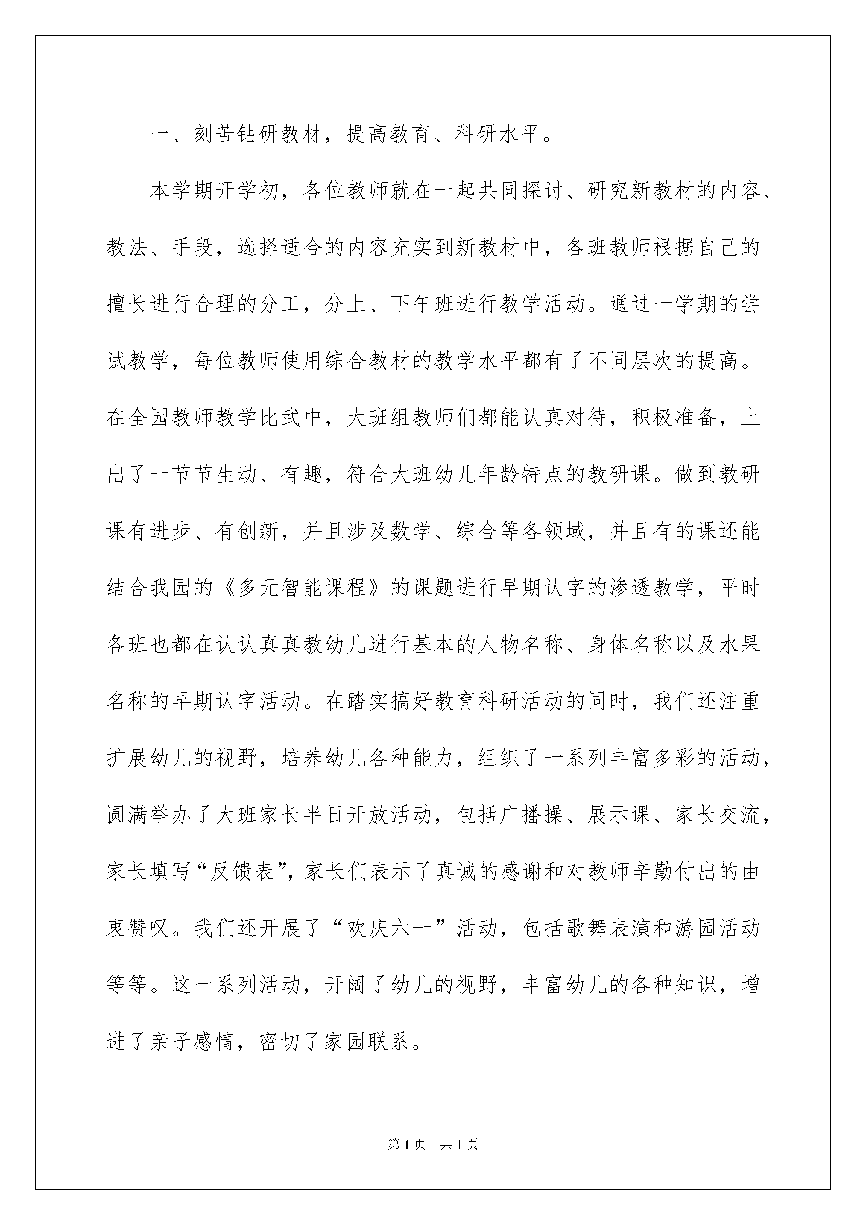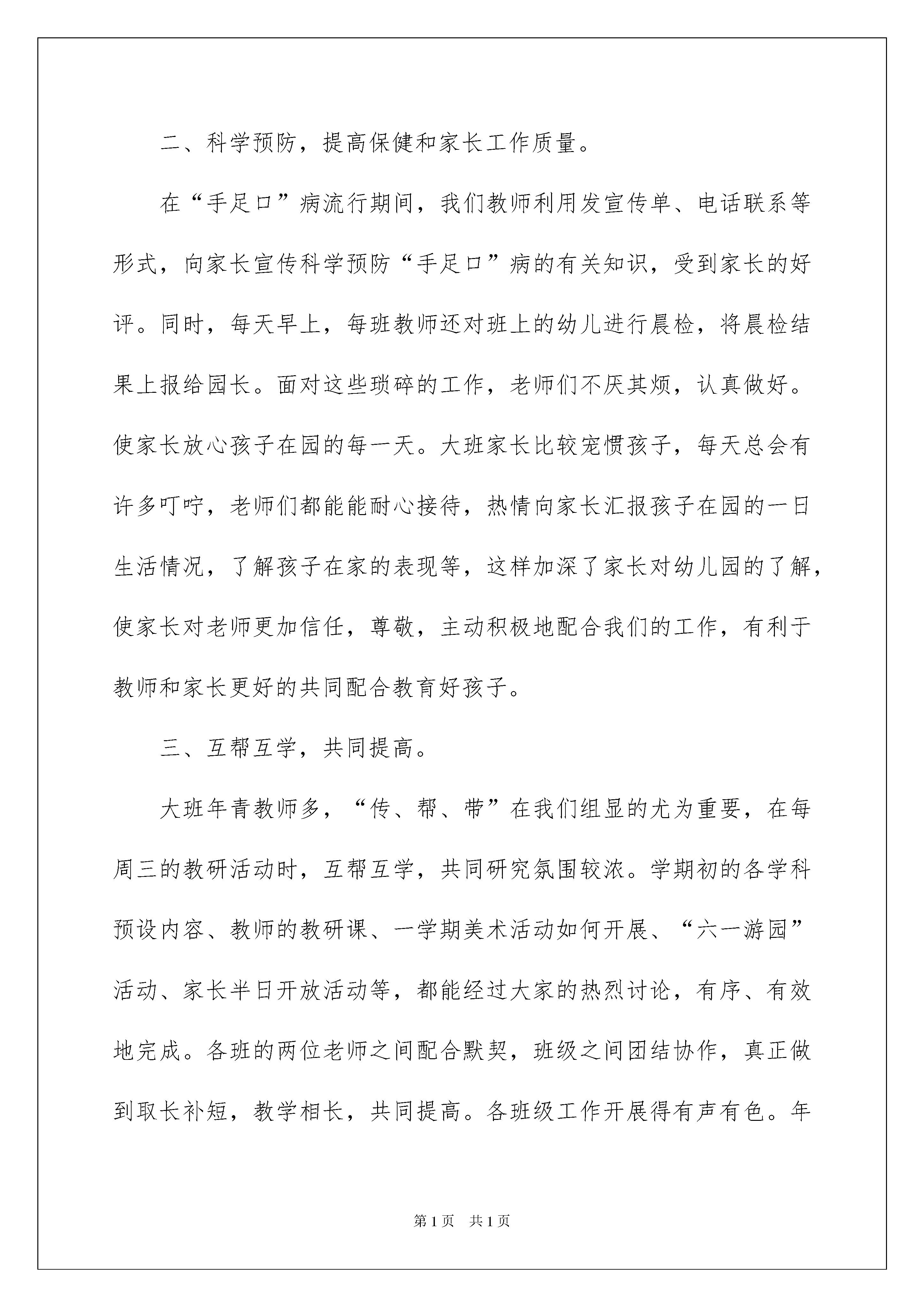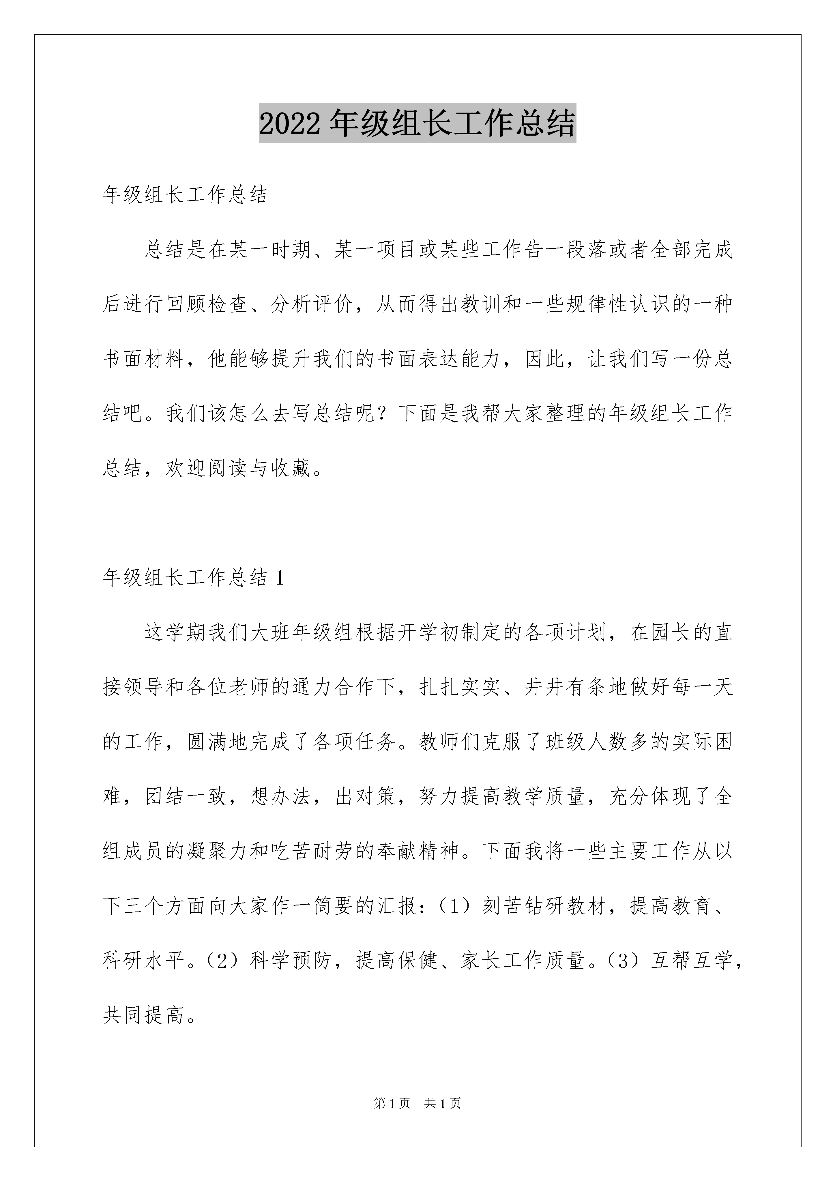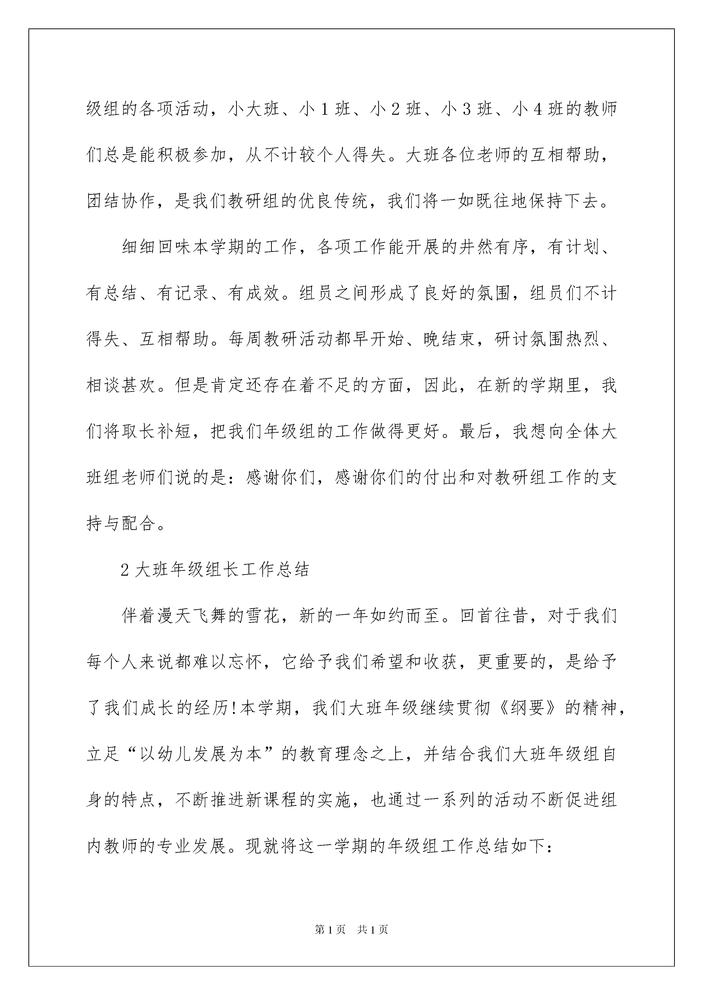 2022年级组长工作总结年级组长工作总结总结是在某一时期、某一项目或某些工作告一段落或者全部完成后进行回顾检查、分析评价,从而得出教训和一些规律性认识的一种书面材料,他能够提升我们的书面表达能力,因此,让我们写一份总结吧。我们该怎么去写总结呢?下面是我帮大家整理的年级组长工作总结,欢迎阅读与收藏。年级组长工作总结1这学期我们大班年级组根据开学初制定的各项计划,在园长的直接领导和各位老师的通力合作下,扎扎实实、井井有条地做好每一天的工作,圆满地完成了各项任务。教师们克服了班级人数多的实际困难,团结一致,想办法,出对策,努力提高教学质量,充分体现了全组成员的凝聚力和吃苦耐劳的奉献精神。下面我将一些主要工作从以下三个方面向大家作一简要的汇报:(1)刻苦钻研教材,提高教育、科研水平。(2)科学预防,提高保健、家长工作质量。(3)互帮互学,共同提高。一、刻苦钻研教材,提高教育、科研水平。本学期开学初,各位教师就在一起共同探讨、研究新教材的内容、教法、手段,选择适合的内容充实到新教材中,各班教师根据自己的擅长进行合理的分工,分上、下午班进行教学活动。通过一学期的尝试教学,每位教师使用综合教材的教学水平都有了不同层次的提高。在全园教师教学比武中,大班组教师们都能认真对待,积极准备,上出了一节节生动、有趣,符合大班幼儿年龄特点的教研课。做到教研课有进步、有创新,并且涉及数学、综合等各领域,并且有的课还能结合我园的《多元智能课程》的课题进行早期认字的渗透教学,平时各班也都在认认真真教幼儿进行基本的人物名称、身体名称以及水果名称的早期认字活动。在踏实搞好教育科研活动的同时,我们还注重扩展幼儿的视野,培养幼儿各种能力,组织了一系列丰富多彩的活动,圆满举办了大班家长半日开放活动,包括广播操、展示课、家长交流,家长填写“反馈表”,家长们表示了真诚的感谢和对教师辛勤付出的由衷赞叹。我们还开展了“欢庆六一”活动,包括歌舞表演和游园活动等等。这一系列活动,开阔了幼儿的视野,丰富幼儿的各种知识,增进了亲子感情,密切了家园联系。二、科学预防,提高保健和家长工作质量。在“手足口”病流行期间,我们教师利用发宣传单、电话联系等形式,向家长宣传科学预防“手足口”病的有关知识,受到家长的好评。同时,每天早上,每班教师还对班上的幼儿进行晨检,将晨检结果上报给园长。面对这些琐碎的工作,老师们不厌其烦,认真做好。使家长放心孩子在园的每一天。大班家长比较宠惯孩子,每天总会有许多叮咛,老师们都能能耐心接待,热情向家长汇报孩子在园的一日生活情况,了解孩子在家的表现等,这样加深了家长对幼儿园的了解,使家长对老师更加信任,尊敬,主动积极地配合我们的工作,有利于教师和家长更好的共同配合教育好孩子。三、互帮互学,共同提高。大班年青教师多,“传、帮、带”在我们组显的尤为重要,在每周三的教研活动时,互帮互学,共同研究氛围较浓。学期初的各学科预设内容、教师的教研课、一学期美术活动如何开展、“六一游园”活动、家长半日开放活动等,都能经过大家的热烈讨论,有序、有效地完成。各班的两位老师之间配合默契,班级之间团结协作,真正做到取长补短,教学相长,共同提高。各班级工作开展得有声有色。年级组的各项活动,小大班、小1班、小2班、小3班、小4班的教师们总是能积极参加,从不计较个人得失。大班各位老师的互相帮助,团结协作,是我们教研组的优良传统,我们将一如既往地保持下去。细细回味本学期的工作,各项工作能开展的井然有序,有计划、有总结、有记录、有成效。组员之间形成了良好的氛围,组员们不计得失、互相帮助。每周教研活动都早开始、晚结束,研讨氛围热烈、相谈甚欢。但是肯定还存在着不足的方面,因此,在新的学期里,我们将取长补短,把我们年级组的工作做得更好。最后,我想向全体大班组老师们说的是:感谢你们,感谢你们的付出和对教研组工作的支持与配合。2大班年级组长工作总结伴着漫天飞舞的雪花,新的一年如约而至。回首往昔,对于我们每个人来说都难以忘怀,它给予我们希望和收获,更重要的,是给予了我们成长的经历!本学期,我们大班年级继续贯彻《纲要》的精神,立足“以幼儿发展为本”的教育理念之上,并结合我们大班年级组自身的特点,不断推进新课程的实施,也通过一系列的活动不断促进组内教师的专业发展。现就将这一学期的年级组工作总结如下:一、“二期课改”新课程的大背景下,完善园本课程和新课程的有效整合。本学期,我们大班组继续组织教师认真学期“二期课改”的内容,并将新的理念不断的进行消化,用理论进行武装,不断的指导实践。二期课改的大背景下,我们继续不断的推广着新课程,继续以主题的形式呈现我们在日常活动中