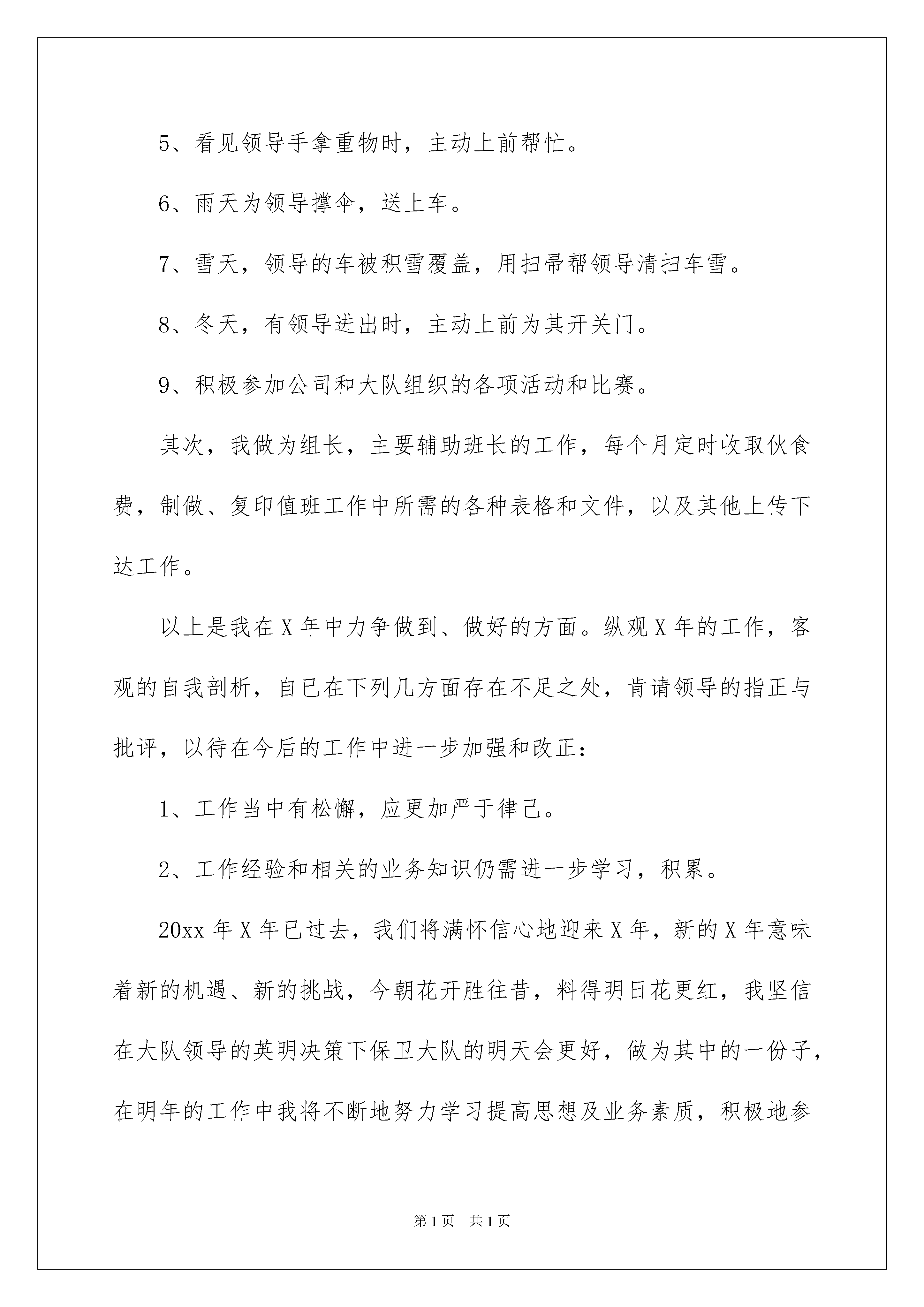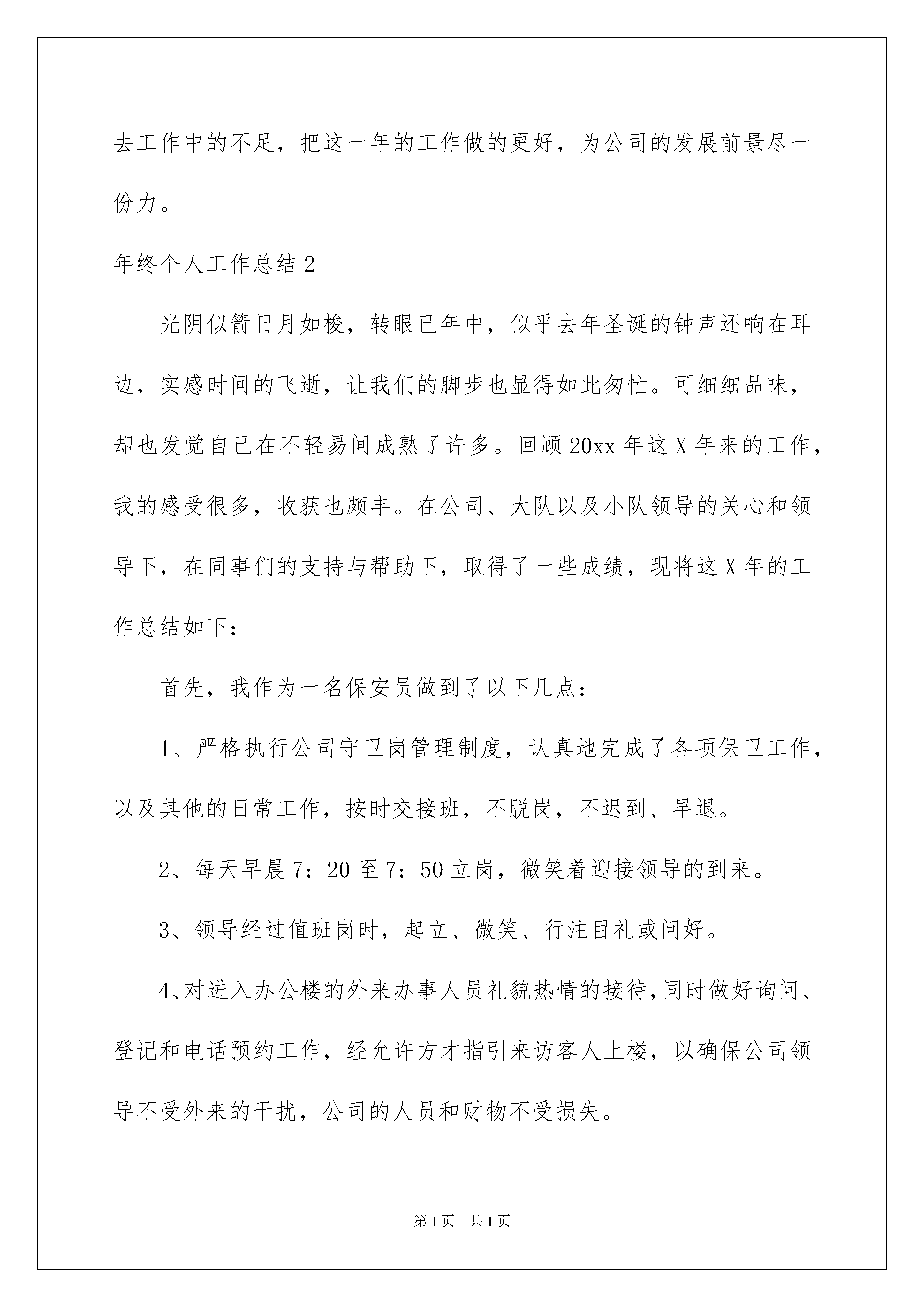 2022年终个人工作总结15篇年终个人工作总结15篇总结是指对某一阶段的工作、学习或思想中的经验或情况进行分析研究,做出带有规律性结论的书面材料,它可以帮助我们总结以往思想,发扬成绩,为此要我们写一份总结。如何把总结做到重点突出呢?下面是我收集整理的年终个人工作总结,希望对大家有所帮助。年终个人工作总结120xx年不知不觉在指尖慢慢逝去,20xx年迎面而来。回想过去,面对眼前,展望未来!有进步的喜悦,亦有工作中失误的愧疚。回望过去的20xx年是我们xx区全体人员齐心协力,奋力开拓的一年,更是每个仓管员接受挑战,逐步成长的一年。因为在这一年里我们一下缺少了差不多四个人,但我们还是把所有的工作扛了下来,我们在今年的工作中总结出了在工作当中的利弊、得失。从教训中得出经验,这为以后的工作做好更充分的计划准备。下面就由我对20xx年我的工作做个简单的工作总结:一、工作回顾及感想本人于20xx年xx月xx号进入_这个大家庭,一回头即将是两年的时光,内心不禁感慨万千。在过去的20xx年里我就只能用一个字来形容,那个字就是“累“。说实话那真是累得我们都想放弃拉。造成这样的原因是因为人员缺乏,可人员为何一下子如此缺乏这是我们身为一线员工所不知的,可我们好象看到了什么,我们看到什么?其实我们也说不清,因为模糊。在过去的这一年里我们是一个人做两个人的工作,可我们还是齐心协力的扛下来了。这让我看到了一个团队的力量,我们的这个团队在赵锦杰带领下就散发这这样的力量,所以一个团队在任何困难面前只要紧紧的抱成团,那么不管它有多难它也将被迎刃而解。二、工作当中的不足之处1、工作效力还没达到自己的要求。2、工作的质量也同样没有做到自己的要求。3、在加班时间特别长的时候总会发脾气。4、在有些时候不明白领导的用心及苦心。三、此月对自己的要求1、尽力把工作效力达到公司要求,甚至更高。2、尽量把工作质量提高,把差错扼杀在万分之五甚至是三以内,这样才算是尽到我们仓管员应该尽到的责任——帐、物一致。3、加强对自己责任区的管理,同时要多多帮助上个月来的四个新员工,让他们早点熟悉,早点容入到我们这个大家庭里面。4、每天对于工作当中遇到的难题加以不断的完善,以及与周围同事的沟通,相互学习才能使工作的开展更进一步。5、自己责任区所有货架标识清晰,明确,同时发货一定要做到按批号发货(先进先出先产先发)。6、注重形象,多参加一些公司组织的企业活动,每天保持朝气蓬勃的精神面貌面对工作。总之,仓库能在现实情况中不断的改善是离不开各位领导的悉心关怀和指导及各位同事的大力支持和配合,在挥手昨天的时刻,我们将迎来新的一年,对过去取得的成绩,将不骄不躁,脚踏实地一步一个脚印走下去,对过去的不足,将不懈的努力争取做到,我们将会用行动来证明我们的努力,我们更加清楚获取不是靠辉煌的方式,而是靠不断的努力。为了公司发展得更加壮大,并跻身于国内先进企业行列,让我们携手合作,创造出辉煌的明天!20_年年我们将努力改正过去工作中的不足,把这一年的工作做的更好,为公司的发展前景尽一份力。年终个人工作总结2光阴似箭日月如梭,转眼已年中,似乎去年圣诞的钟声还响在耳边,实感时间的飞逝,让我们的脚步也显得如此匆忙。可细细品味,却也发觉自己在不轻易间成熟了许多。回顾20xx年这X年来的工作,我的感受很多,收获也颇丰。在公司、大队以及小队领导的关心和领导下,在同事们的支持与帮助下,取得了一些成绩,现将这X年的工作总结如下:首先,我作为一名保安员做到了以下几点:1、严格执行公司守卫岗管理制度,认真地完成了各项保卫工作,以及其他的日常工作,按时交接班,不脱岗,不迟到、早退。2、每天早晨7:20至7:50立岗,微笑着迎接领导的到来。3、领导经过值班岗时,起立、微笑、行注目礼或问好。4、对进入办公楼的外来办事人员礼貌热情的接待,同时做好询问、登记和电话预约工作,经允许方才指引来访客人上楼,以确保公司领导不受外来的干扰,公司的人员和财物不受损失。5、看见领导手拿重物时,主动上前帮忙。6、雨天为领导撑伞,送上车。7、雪天,领导的车被积雪覆盖,用扫帚帮领导清扫车雪。8、冬天,有领导进出时,主动上前为其开关门。9、积极参加公司和大队组织的各项活动和比赛。其次,我做为组长,主要辅助班长的工作,每个月定时收取伙食费,制做、复印值班工作中所需的各种表格和文件,以及其他上传下达工作。以上是我在X年中力争做到、做好的方面。纵观X年的工作,客观的自我剖析,自已在下列几方面存在不足之处,肯请领导的指正与批评,以待在今后的工作中进一步加强和改正:1、工作当中有松懈,应更加严于律己。2、工作经验和相关的