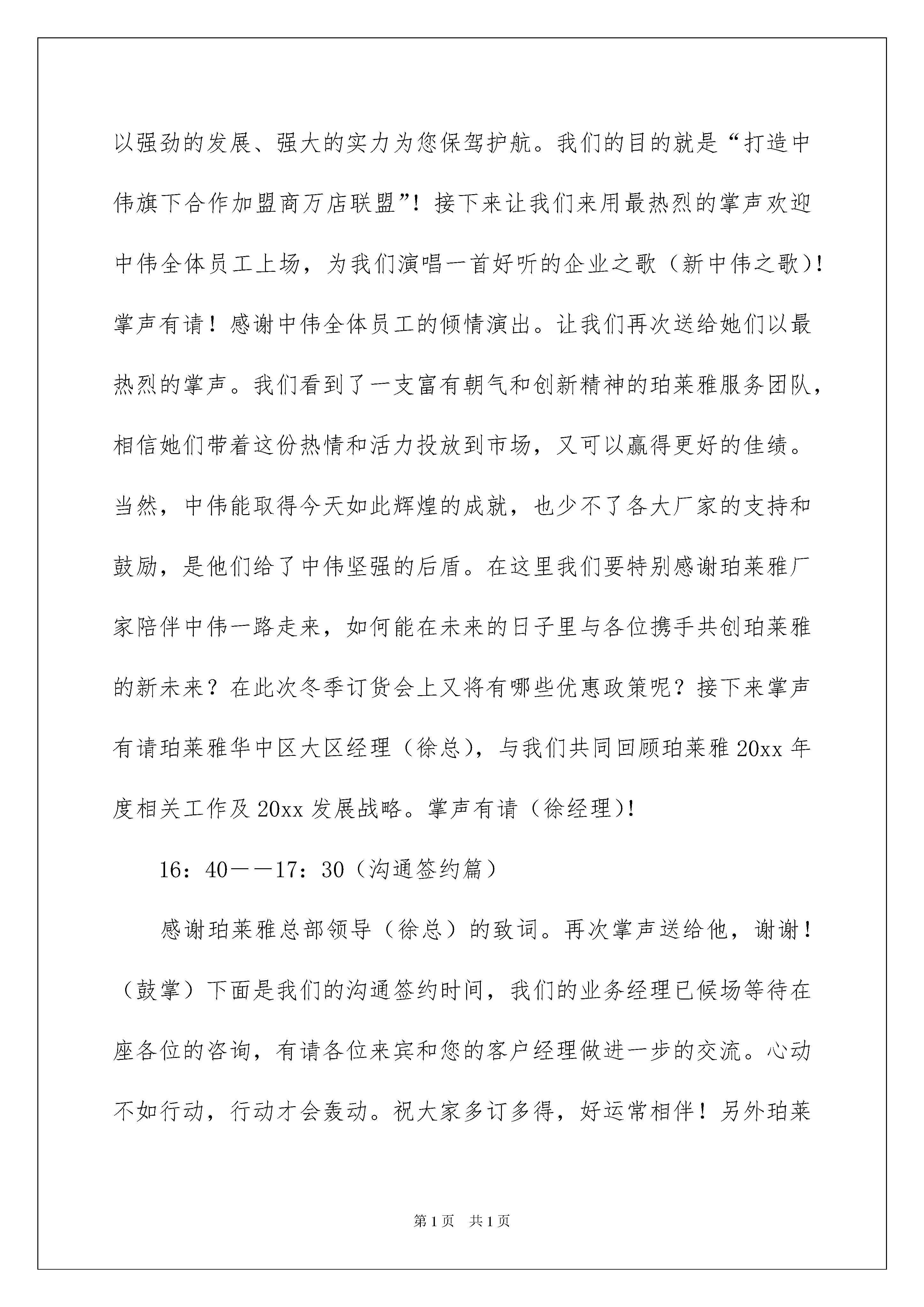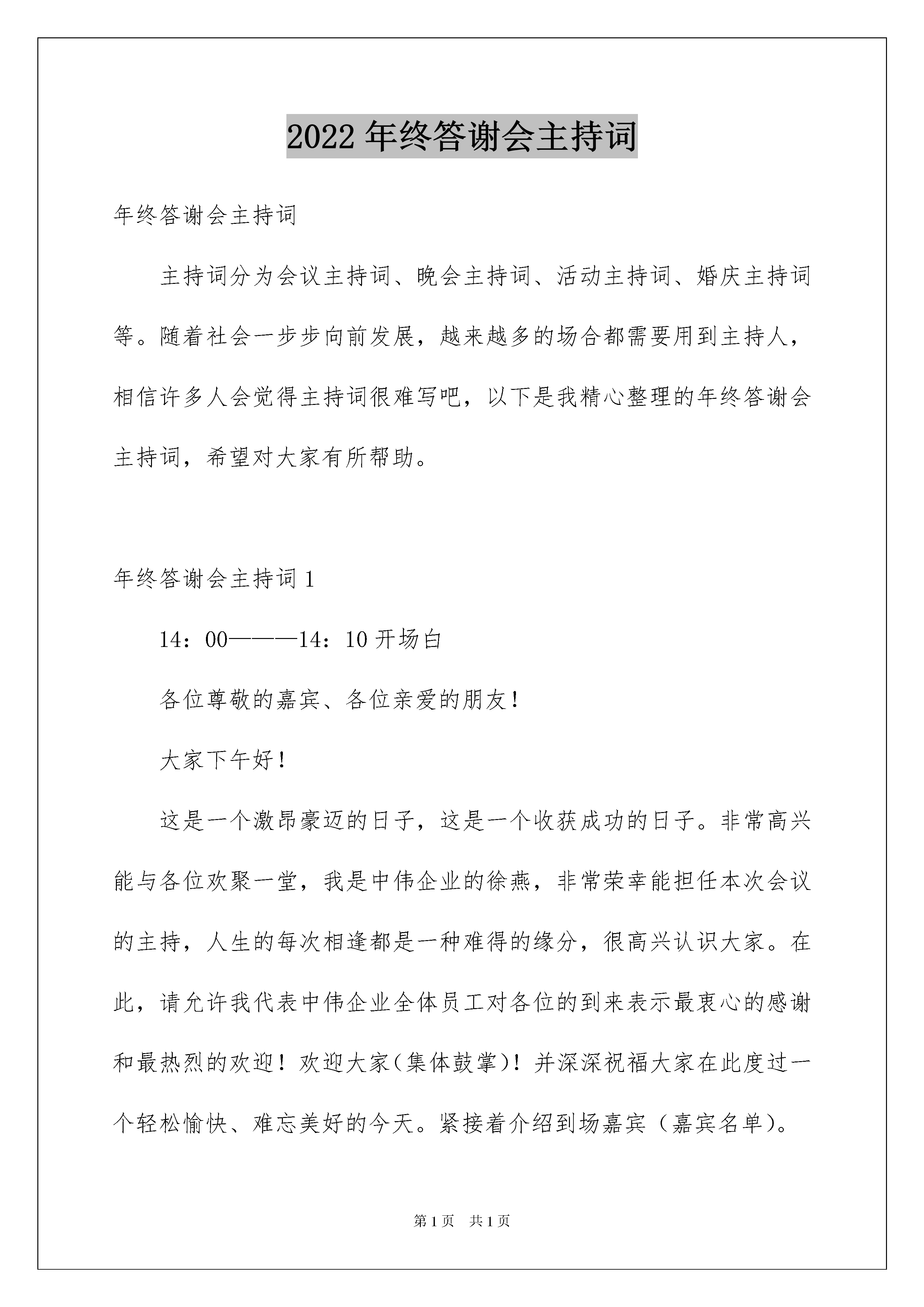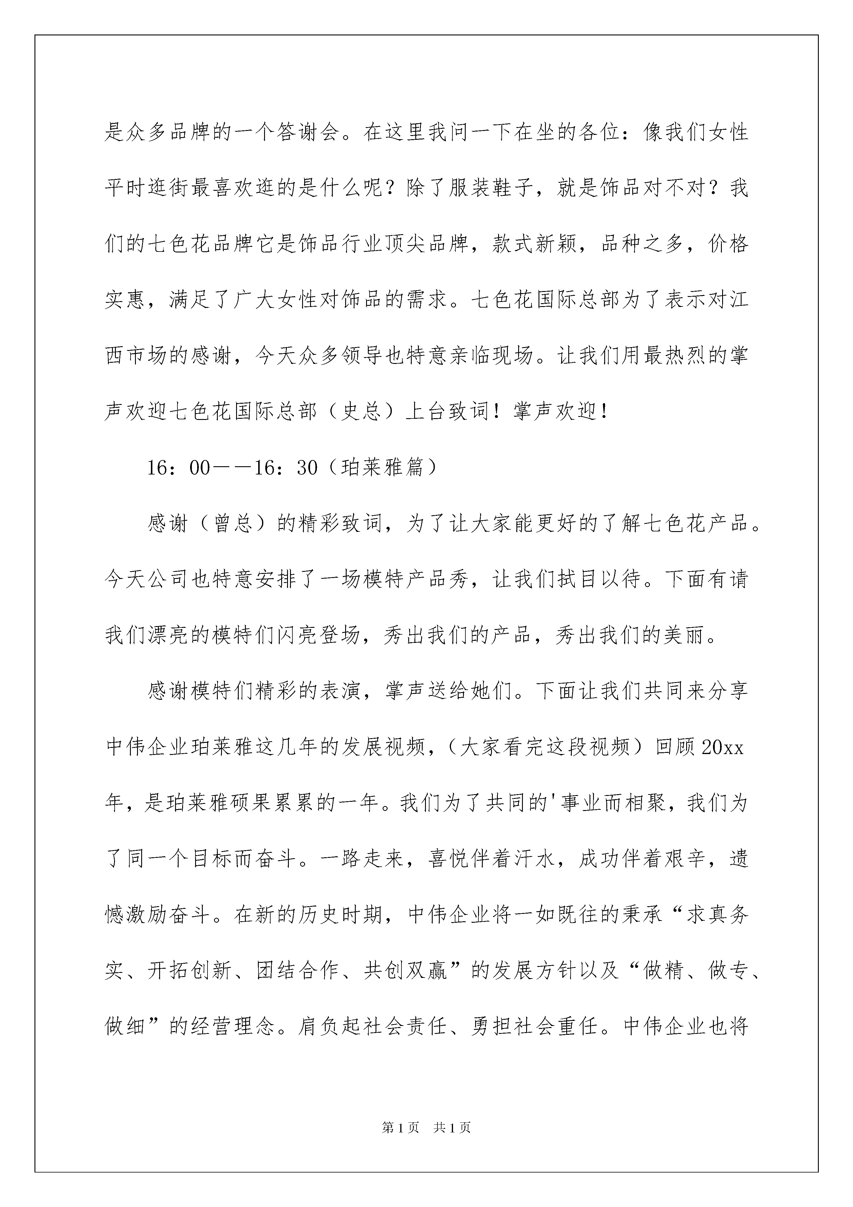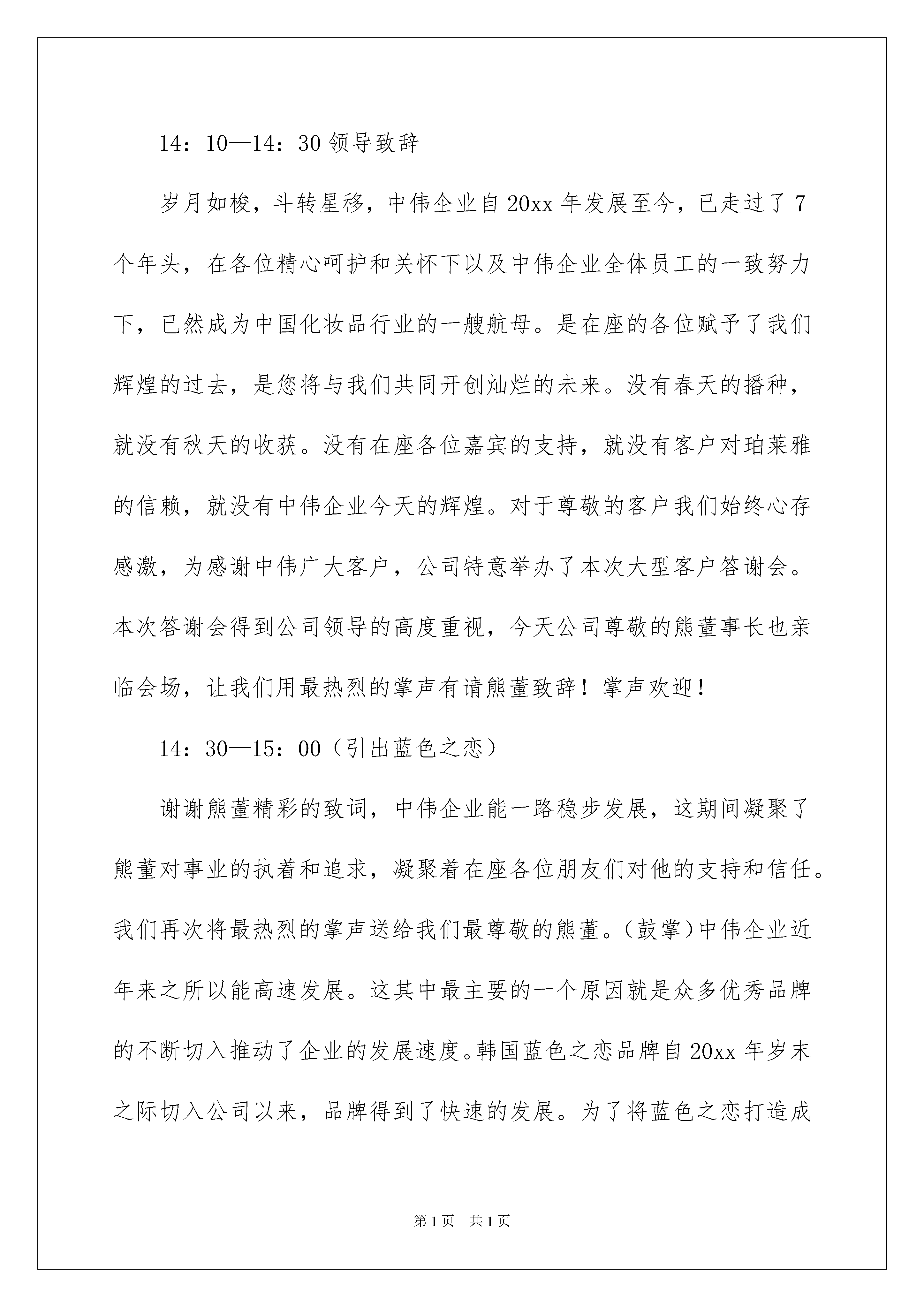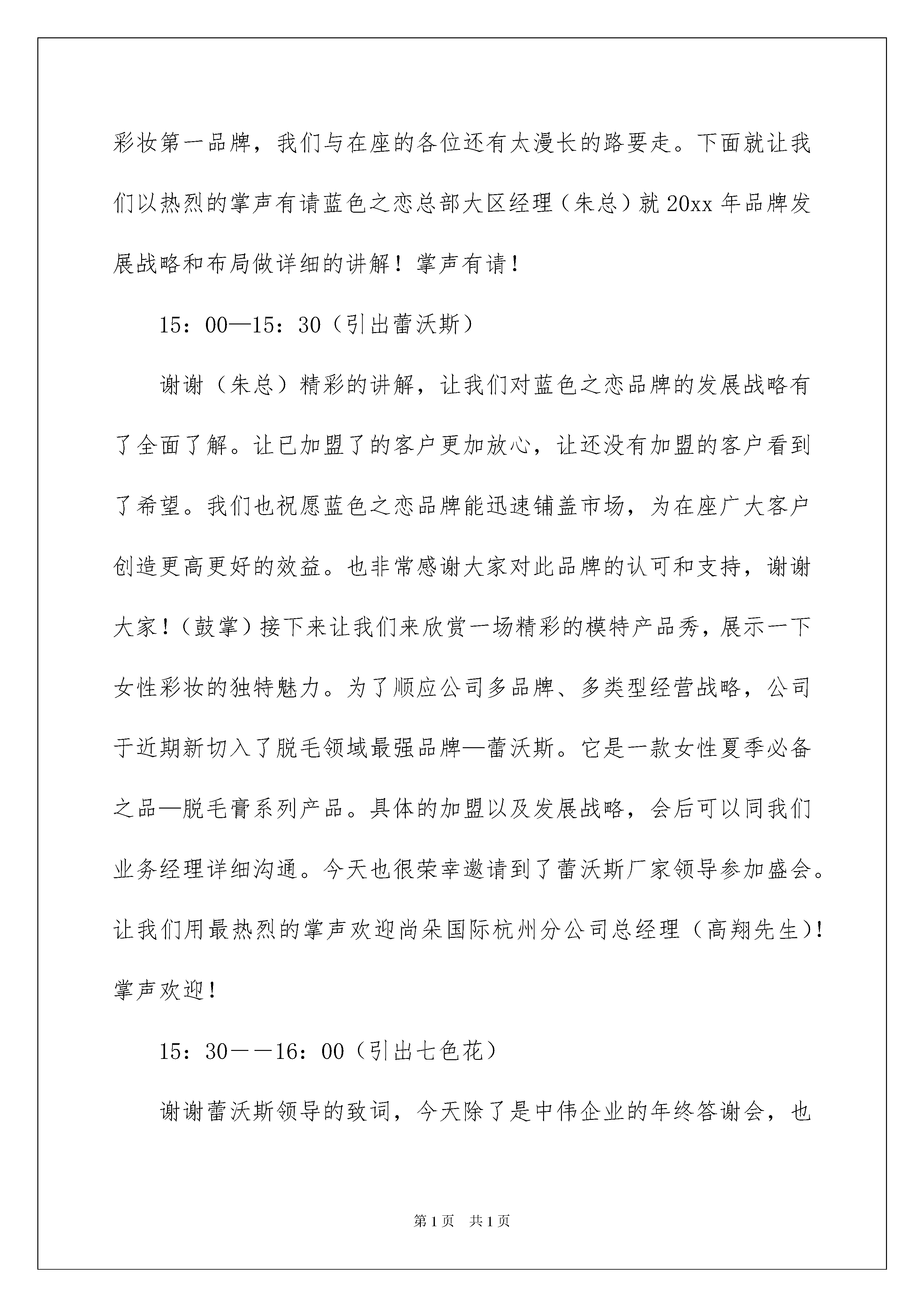 2022年终答谢会主持词年终答谢会主持词主持词分为会议主持词、晚会主持词、活动主持词、婚庆主持词等。随着社会一步步向前发展,越来越多的场合都需要用到主持人,相信许多人会觉得主持词很难写吧,以下是我精心整理的年终答谢会主持词,希望对大家有所帮助。年终答谢会主持词114:00———14:10开场白各位尊敬的嘉宾、各位亲爱的朋友!大家下午好!这是一个激昂豪迈的日子,这是一个收获成功的日子。非常高兴能与各位欢聚一堂,我是中伟企业的徐燕,非常荣幸能担任本次会议的主持,人生的每次相逢都是一种难得的缘分,很高兴认识大家。在此,请允许我代表中伟企业全体员工对各位的到来表示最衷心的感谢和最热烈的欢迎!欢迎大家(集体鼓掌)!并深深祝福大家在此度过一个轻松愉快、难忘美好的今天。紧接着介绍到场嘉宾(嘉宾名单)。14:10—14:30领导致辞岁月如梭,斗转星移,中伟企业自20xx年发展至今,已走过了7个年头,在各位精心呵护和关怀下以及中伟企业全体员工的一致努力下,已然成为中国化妆品行业的一艘航母。是在座的各位赋予了我们辉煌的过去,是您将与我们共同开创灿烂的未来。没有春天的播种,就没有秋天的收获。没有在座各位嘉宾的支持,就没有客户对珀莱雅的信赖,就没有中伟企业今天的辉煌。对于尊敬的客户我们始终心存感激,为感谢中伟广大客户,公司特意举办了本次大型客户答谢会。本次答谢会得到公司领导的高度重视,今天公司尊敬的熊董事长也亲临会场,让我们用最热烈的掌声有请熊董致辞!掌声欢迎!14:30—15:00(引出蓝色之恋)谢谢熊董精彩的致词,中伟企业能一路稳步发展,这期间凝聚了熊董对事业的执着和追求,凝聚着在座各位朋友们对他的支持和信任。我们再次将最热烈的掌声送给我们最尊敬的熊董。(鼓掌)中伟企业近年来之所以能高速发展。这其中最主要的一个原因就是众多优秀品牌的不断切入推动了企业的发展速度。韩国蓝色之恋品牌自20xx年岁末之际切入公司以来,品牌得到了快速的发展。为了将蓝色之恋打造成彩妆第一品牌,我们与在座的各位还有太漫长的路要走。下面就让我们以热烈的掌声有请蓝色之恋总部大区经理(朱总)就20xx年品牌发展战略和布局做详细的讲解!掌声有请!15:00—15:30(引出蕾沃斯)谢谢(朱总)精彩的讲解,让我们对蓝色之恋品牌的发展战略有了全面了解。让已加盟了的客户更加放心,让还没有加盟的客户看到了希望。我们也祝愿蓝色之恋品牌能迅速铺盖市场,为在座广大客户创造更高更好的效益。也非常感谢大家对此品牌的认可和支持,谢谢大家!(鼓掌)接下来让我们来欣赏一场精彩的模特产品秀,展示一下女性彩妆的独特魅力。为了顺应公司多品牌、多类型经营战略,公司于近期新切入了脱毛领域最强品牌—蕾沃斯。它是一款女性夏季必备之品—脱毛膏系列产品。具体的加盟以及发展战略,会后可以同我们业务经理详细沟通。今天也很荣幸邀请到了蕾沃斯厂家领导参加盛会。让我们用最热烈的掌声欢迎尚朵国际杭州分公司总经理(高翔先生)!掌声欢迎!15:30――16:00(引出七色花)谢谢蕾沃斯领导的致词,今天除了是中伟企业的年终答谢会,也是众多品牌的一个答谢会。在这里我问一下在坐的各位:像我们女性平时逛街最喜欢逛的是什么呢?除了服装鞋子,就是饰品对不对?我们的七色花品牌它是饰品行业顶尖品牌,款式新颖,品种之多,价格实惠,满足了广大女性对饰品的需求。七色花国际总部为了表示对江西市场的感谢,今天众多领导也特意亲临现场。让我们用最热烈的掌声欢迎七色花国际总部(史总)上台致词!掌声欢迎!16:00――16:30(珀莱雅篇)感谢(曾总)的精彩致词,为了让大家能更好的了解七色花产品。今天公司也特意安排了一场模特产品秀,让我们拭目以待。下面有请我们漂亮的模特们闪亮登场,秀出我们的产品,秀出我们的美丽。感谢模特们精彩的表演,掌声送给她们。下面让我们共同来分享中伟企业珀莱雅这几年的发展视频,(大家看完这段视频)回顾20xx年,是珀莱雅硕果累累的一年。我们为了共同的'事业而相聚,我们为了同一个目标而奋斗。一路走来,喜悦伴着汗水,成功伴着艰辛,遗憾激励奋斗。在新的历史时期,中伟企业将一如既往的秉承“求真务实、开拓创新、团结合作、共创双赢”的发展方针以及“做精、做专、做细”的经营理念。肩负起社会责任、勇担社会重任。中伟企业也将以强劲的发展、强大的实力为您保驾护航。我们的目的就是“打造中伟旗下合作加盟商万店联盟”!接下来让我们来用最热烈的掌声欢迎中伟全体员工上场,为我们演唱一首好听的企业之歌(新中伟之歌)!掌声有请!感谢中伟全体员工的倾情演出。让我们再次送给她们以最热烈的掌声。我们看到了一支富有朝气和创新精神的珀莱雅服