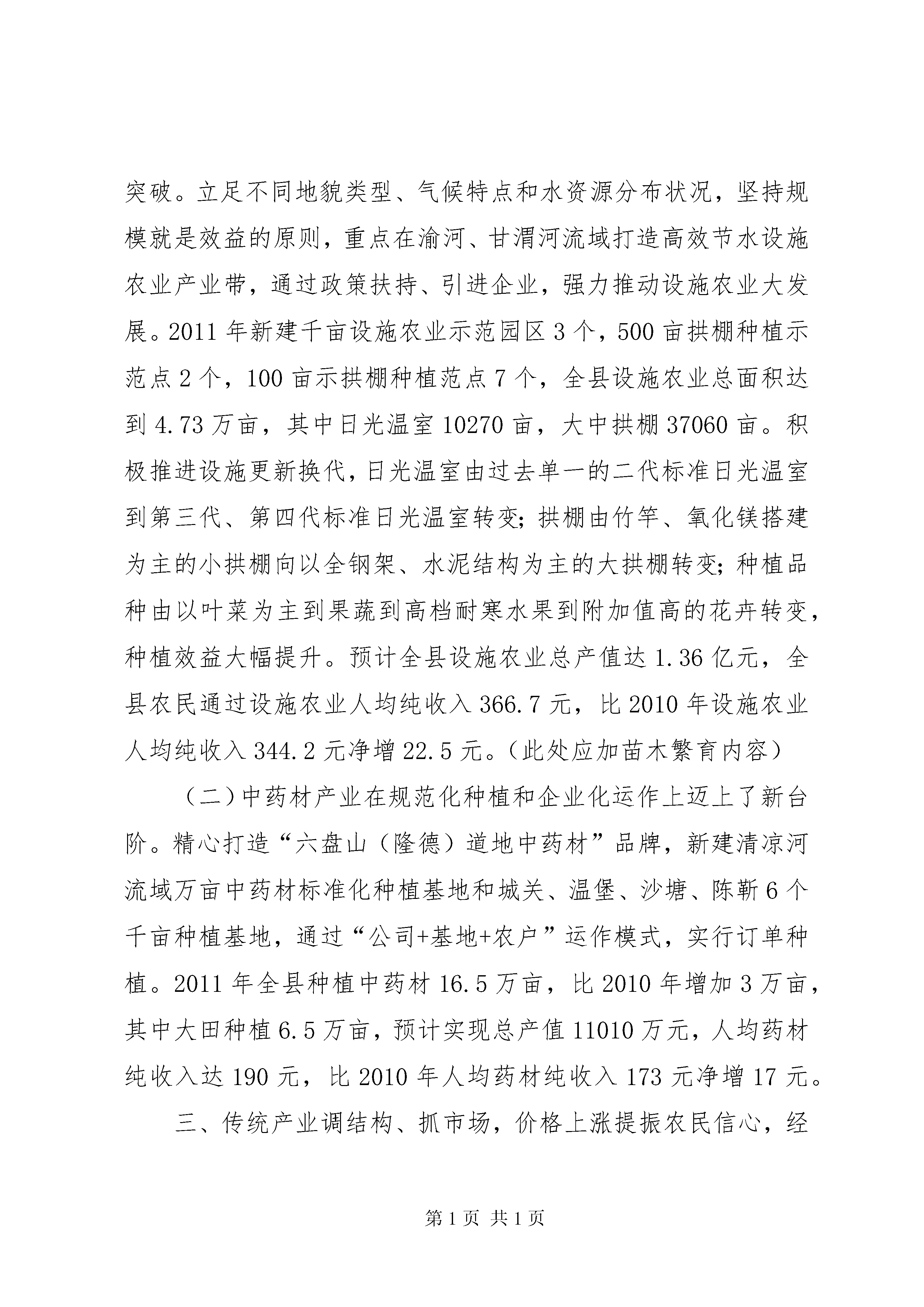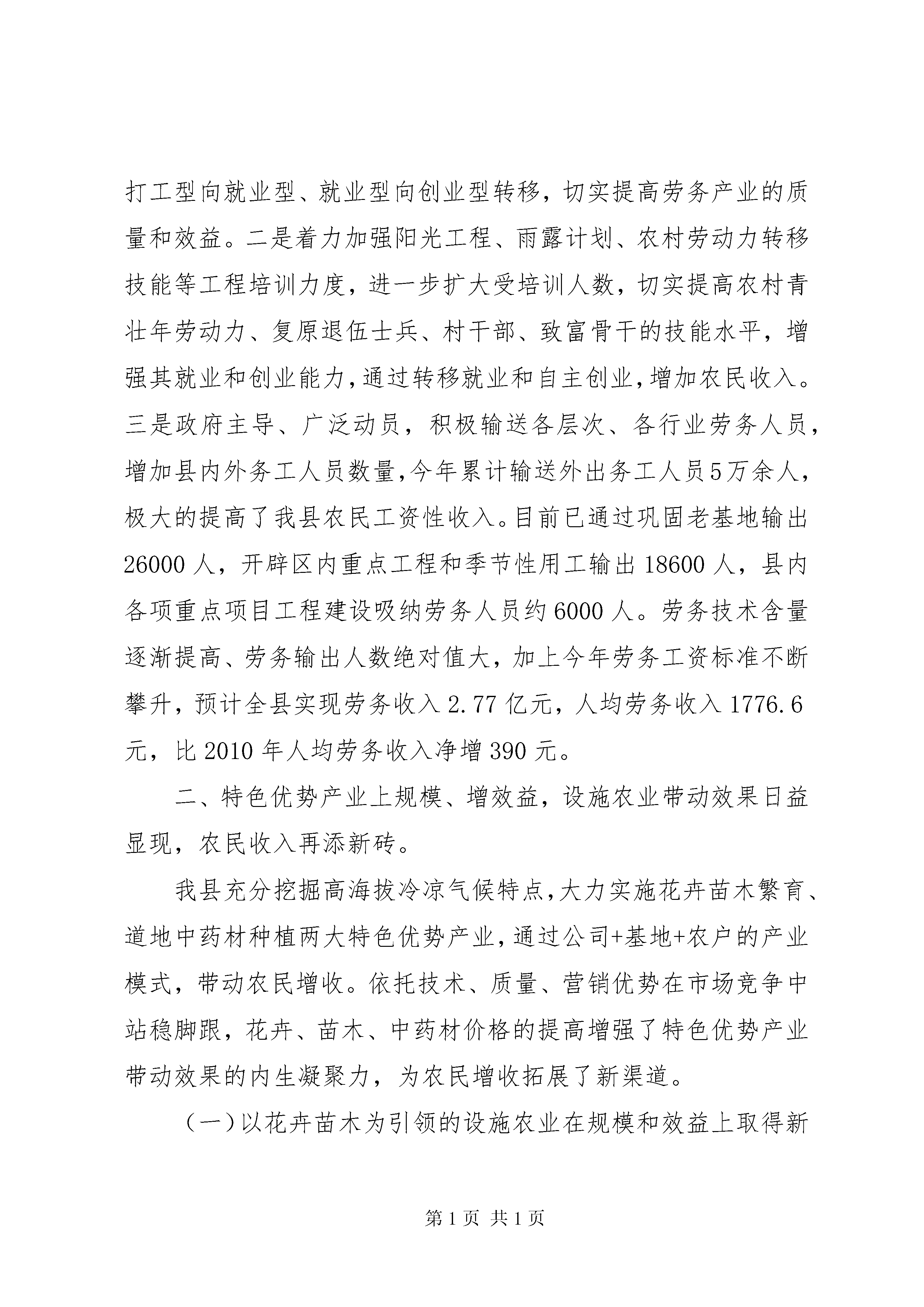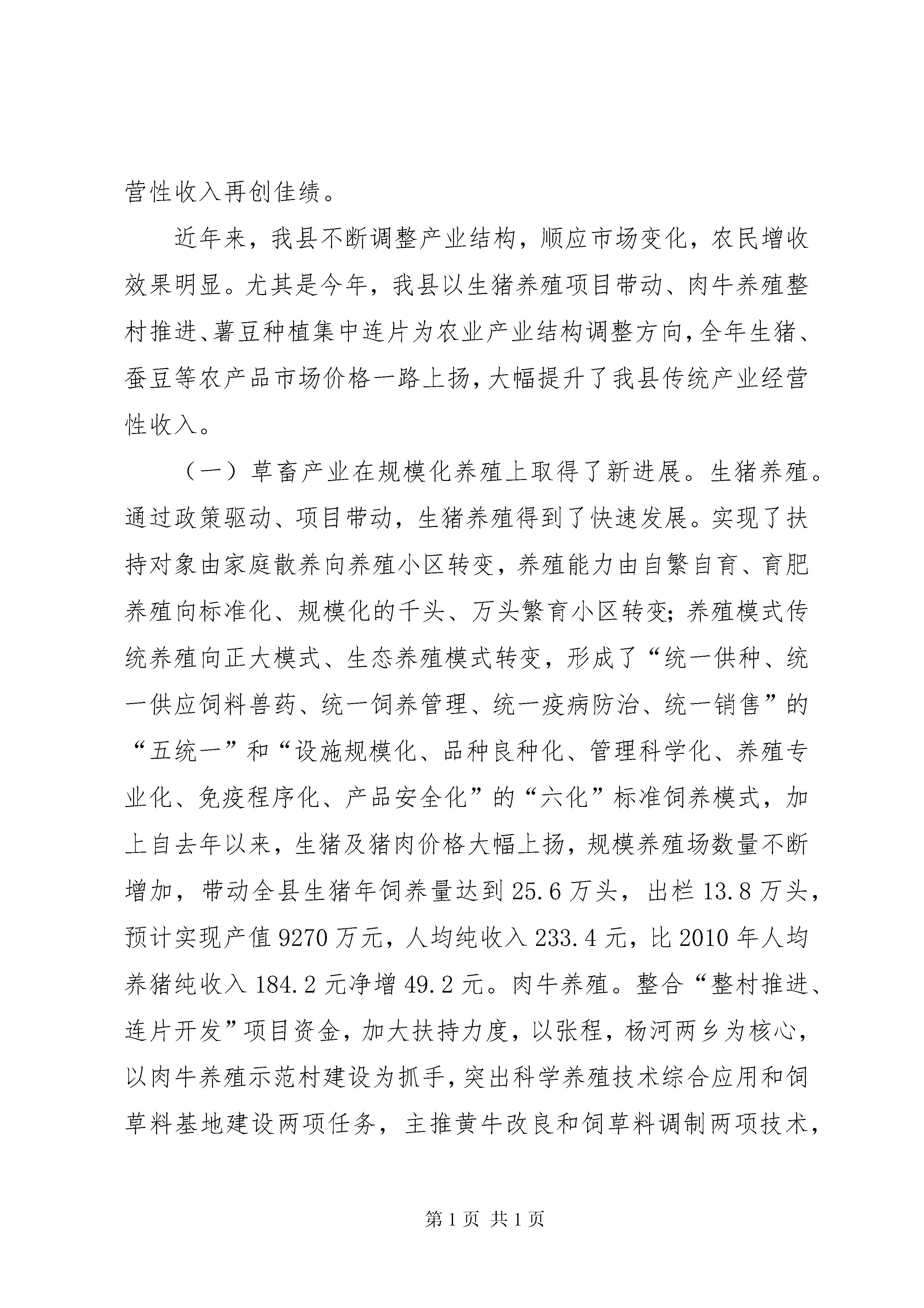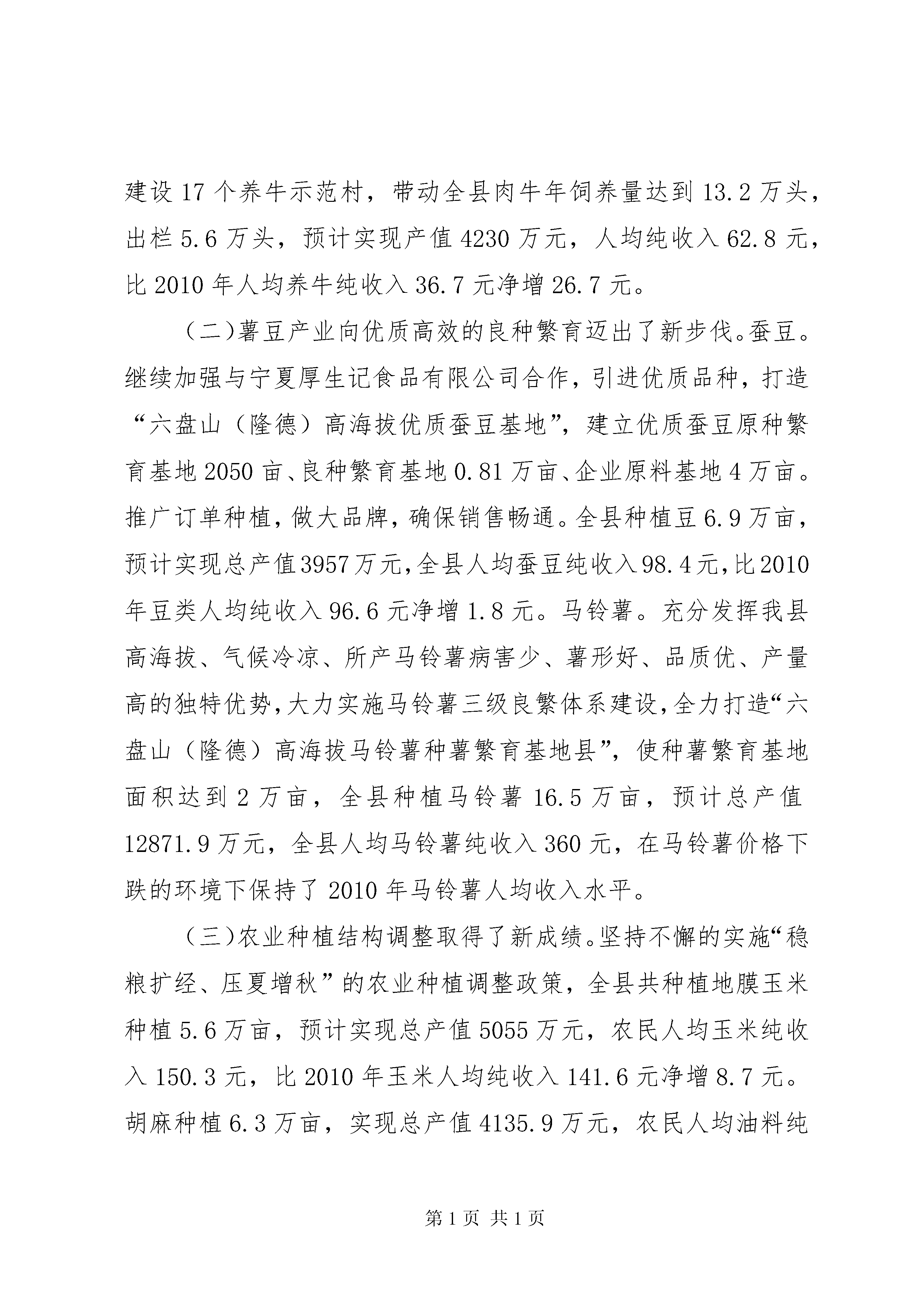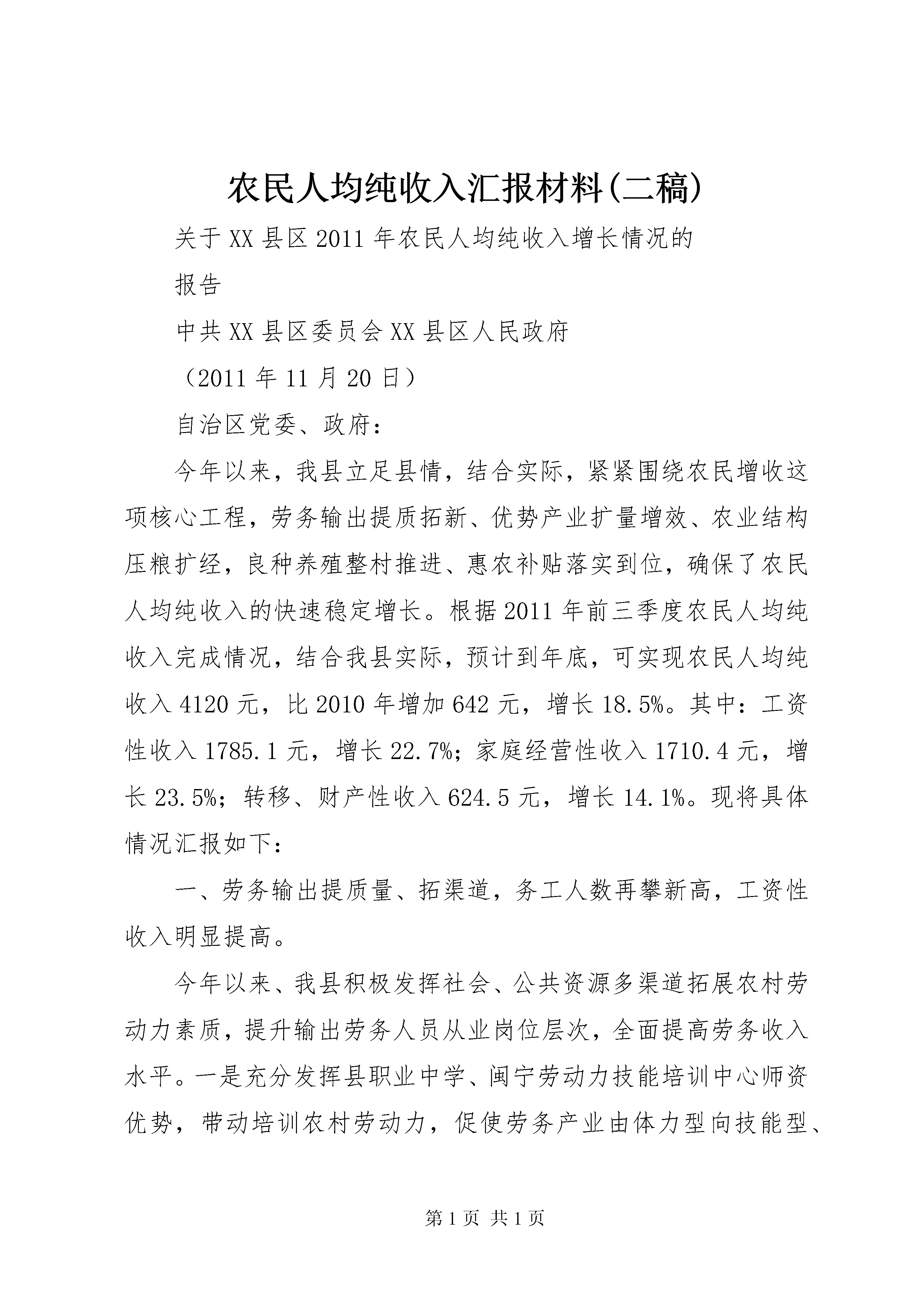 农民人均纯收入汇报材料(二稿)关于XX县区2011年农民人均纯收入增长情况的报告中共XX县区委员会XX县区人民政府(2011年11月20日)自治区党委、政府:今年以来,我县立足县情,结合实际,紧紧围绕农民增收这项核心工程,劳务输出提质拓新、优势产业扩量增效、农业结构压粮扩经,良种养殖整村推进、惠农补贴落实到位,确保了农民人均纯收入的快速稳定增长。根据2011年前三季度农民人均纯收入完成情况,结合我县实际,预计到年底,可实现农民人均纯收入4120元,比2010年增加642元,增长18.5%。其中:工资性收入1785.1元,增长22.7%;家庭经营性收入1710.4元,增长23.5%;转移、财产性收入624.5元,增长14.1%。现将具体情况汇报如下:一、劳务输出提质量、拓渠道,务工人数再攀新高,工资性收入明显提高。今年以来、我县积极发挥社会、公共资源多渠道拓展农村劳动力素质,提升输出劳务人员从业岗位层次,全面提高劳务收入水平。一是充分发挥县职业中学、闽宁劳动力技能培训中心师资优势,带动培训农村劳动力,促使劳务产业由体力型向技能型、打工型向就业型、就业型向创业型转移,切实提高劳务产业的质量和效益。二是着力加强阳光工程、雨露计划、农村劳动力转移技能等工程培训力度,进一步扩大受培训人数,切实提高农村青壮年劳动力、复原退伍士兵、村干部、致富骨干的技能水平,增强其就业和创业能力,通过转移就业和自主创业,增加农民收入。三是政府主导、广泛动员,积极输送各层次、各行业劳务人员,增加县内外务工人员数量,今年累计输送外出务工人员5万余人,极大的提高了我县农民工资性收入。目前已通过巩固老基地输出26000人,开辟区内重点工程和季节性用工输出18600人,县内各项重点项目工程建设吸纳劳务人员约6000人。劳务技术含量逐渐提高、劳务输出人数绝对值大,加上今年劳务工资标准不断攀升,预计全县实现劳务收入2.77亿元,人均劳务收入1776.6元,比2010年人均劳务收入净增390元。二、特色优势产业上规模、增效益,设施农业带动效果日益显现,农民收入再添新砖。我县充分挖掘高海拔冷凉气候特点,大力实施花卉苗木繁育、道地中药材种植两大特色优势产业,通过公司+基地+农户的产业模式,带动农民增收。依托技术、质量、营销优势在市场竞争中站稳脚跟,花卉、苗木、中药材价格的提高增强了特色优势产业带动效果的内生凝聚力,为农民增收拓展了新渠道。(一)以花卉苗木为引领的设施农业在规模和效益上取得新突破。立足不同地貌类型、气候特点和水资源分布状况,坚持规模就是效益的原则,重点在渝河、甘渭河流域打造高效节水设施农业产业带,通过政策扶持、引进企业,强力推动设施农业大发展。2011年新建千亩设施农业示范园区3个,500亩拱棚种植示范点2个,100亩示拱棚种植范点7个,全县设施农业总面积达到4.73万亩,其中日光温室10270亩,大中拱棚37060亩。积极推进设施更新换代,日光温室由过去单一的二代标准日光温室到第三代、第四代标准日光温室转变;拱棚由竹竿、氧化镁搭建为主的小拱棚向以全钢架、水泥结构为主的大拱棚转变;种植品种由以叶菜为主到果蔬到高档耐寒水果到附加值高的花卉转变,种植效益大幅提升。预计全县设施农业总产值达1.36亿元,全县农民通过设施农业人均纯收入366.7元,比2010年设施农业人均纯收入344.2元净增22.5元。(此处应加苗木繁育内容)(二)中药材产业在规范化种植和企业化运作上迈上了新台阶。精心打造“六盘山(隆德)道地中药材”品牌,新建清凉河流域万亩中药材标准化种植基地和城关、温堡、沙塘、陈靳6个千亩种植基地,通过“公司+基地+农户”运作模式,实行订单种植。2011年全县种植中药材16.5万亩,比2010年增加3万亩,其中大田种植6.5万亩,预计实现总产值11010万元,人均药材纯收入达190元,比2010年人均药材纯收入173元净增17元。三、传统产业调结构、抓市场,价格上涨提振农民信心,经营性收入再创佳绩。近年来,我县不断调整产业结构,顺应市场变化,农民增收效果明显。尤其是今年,我县以生猪养殖项目带动、肉牛养殖整村推进、薯豆种植集中连片为农业产业结构调整方向,全年生猪、蚕豆等农产品市场价格一路上扬,大幅提升了我县传统产业经营性收入。(一)草畜产业在规模化养殖上取得了新进展。生猪养殖。通过政策驱动、项目带动,生猪养殖得到了快速发展。实现了扶持对象由家庭散养向养殖小区转变,养殖能力由自繁自育、育肥养殖向标准化、规模化的千头、万头繁育小区转变;养殖模式传统养殖向正大模式、生态养殖模式转变,形成了“统一供种、统一供应饲料兽药、统一饲养管理、统一疫病防治、统一销售”的“五统一”和“设施规模化、品种良种化、管理科学化、养殖专业化、免疫程序化、产品安全化”的“六