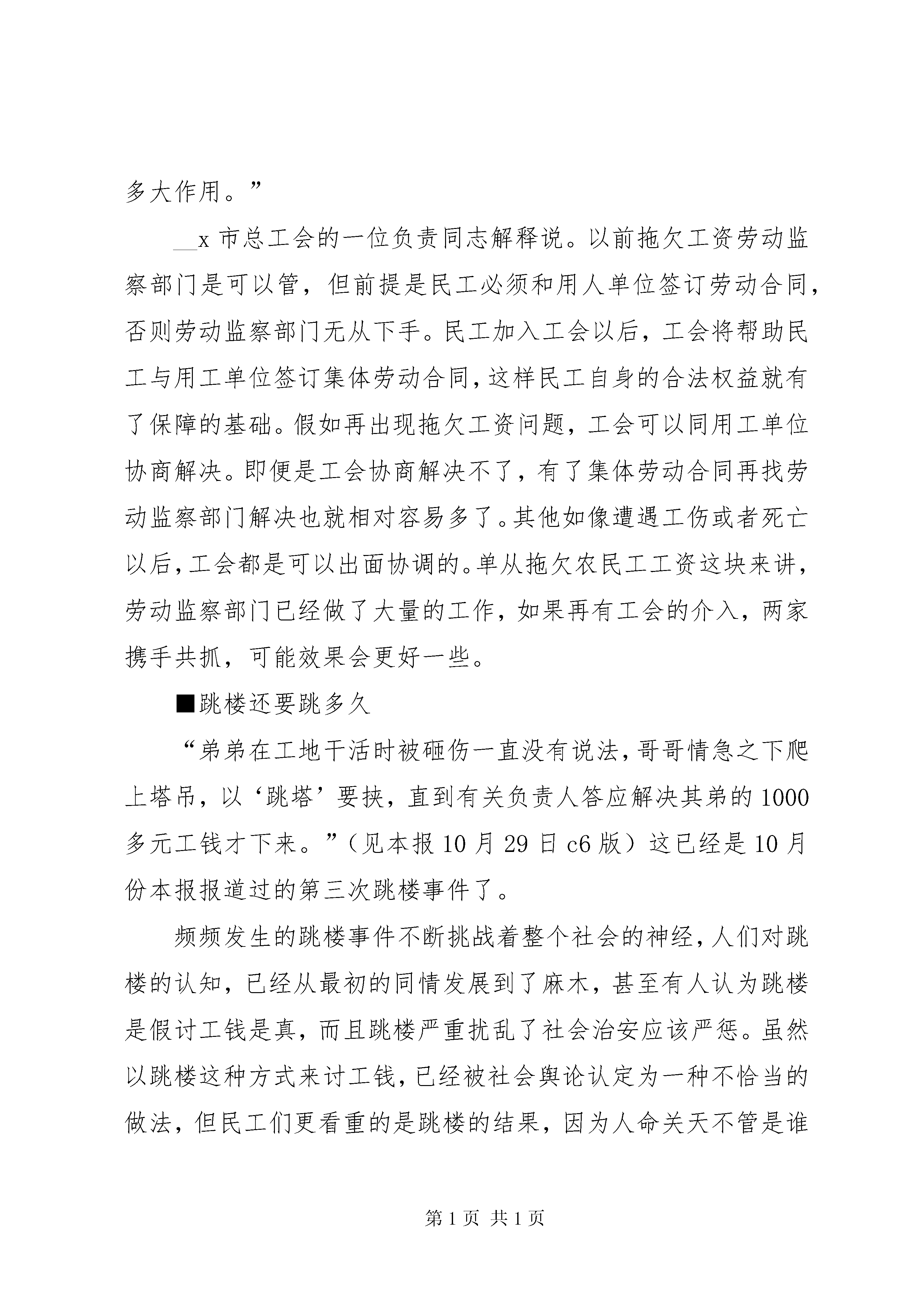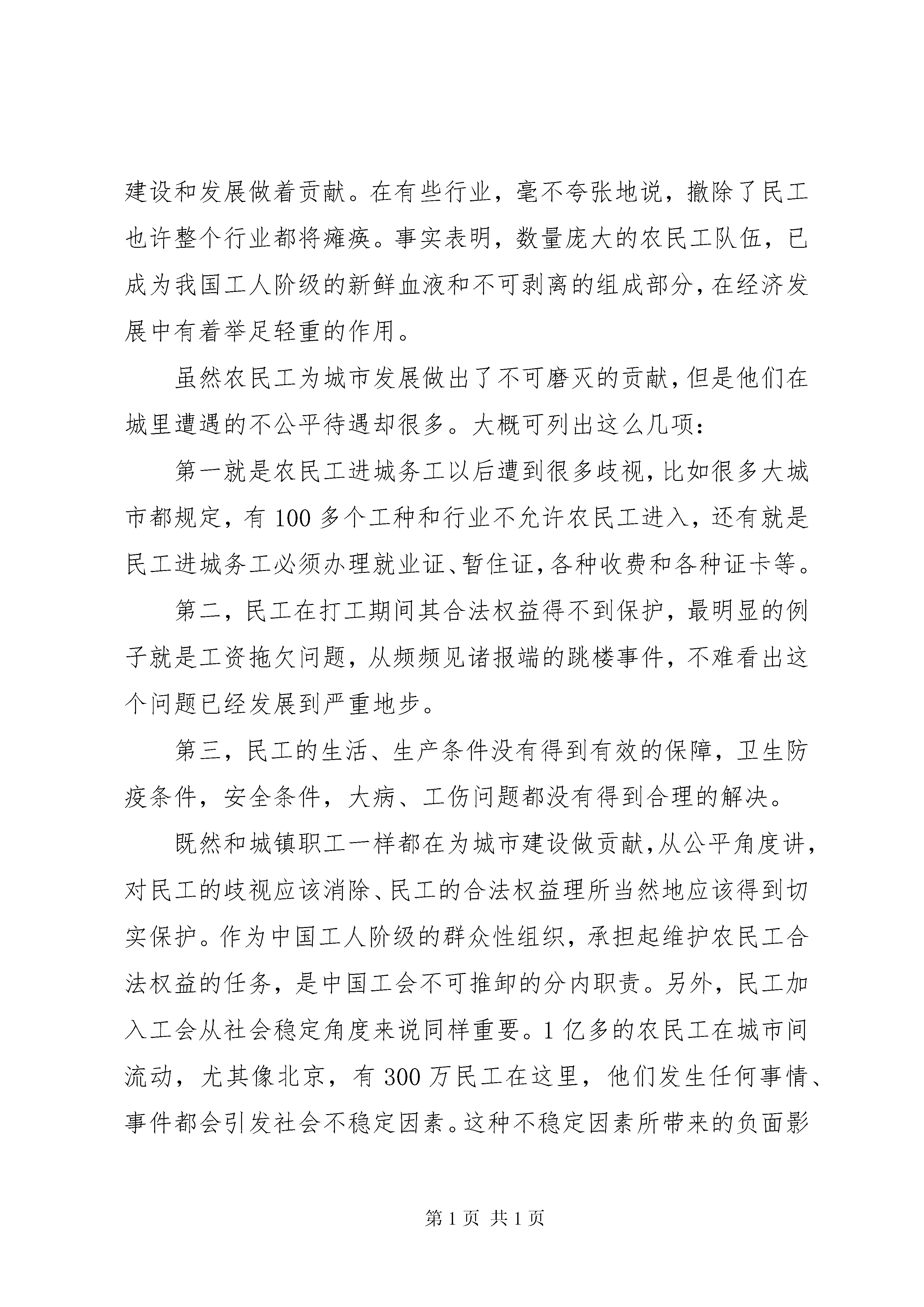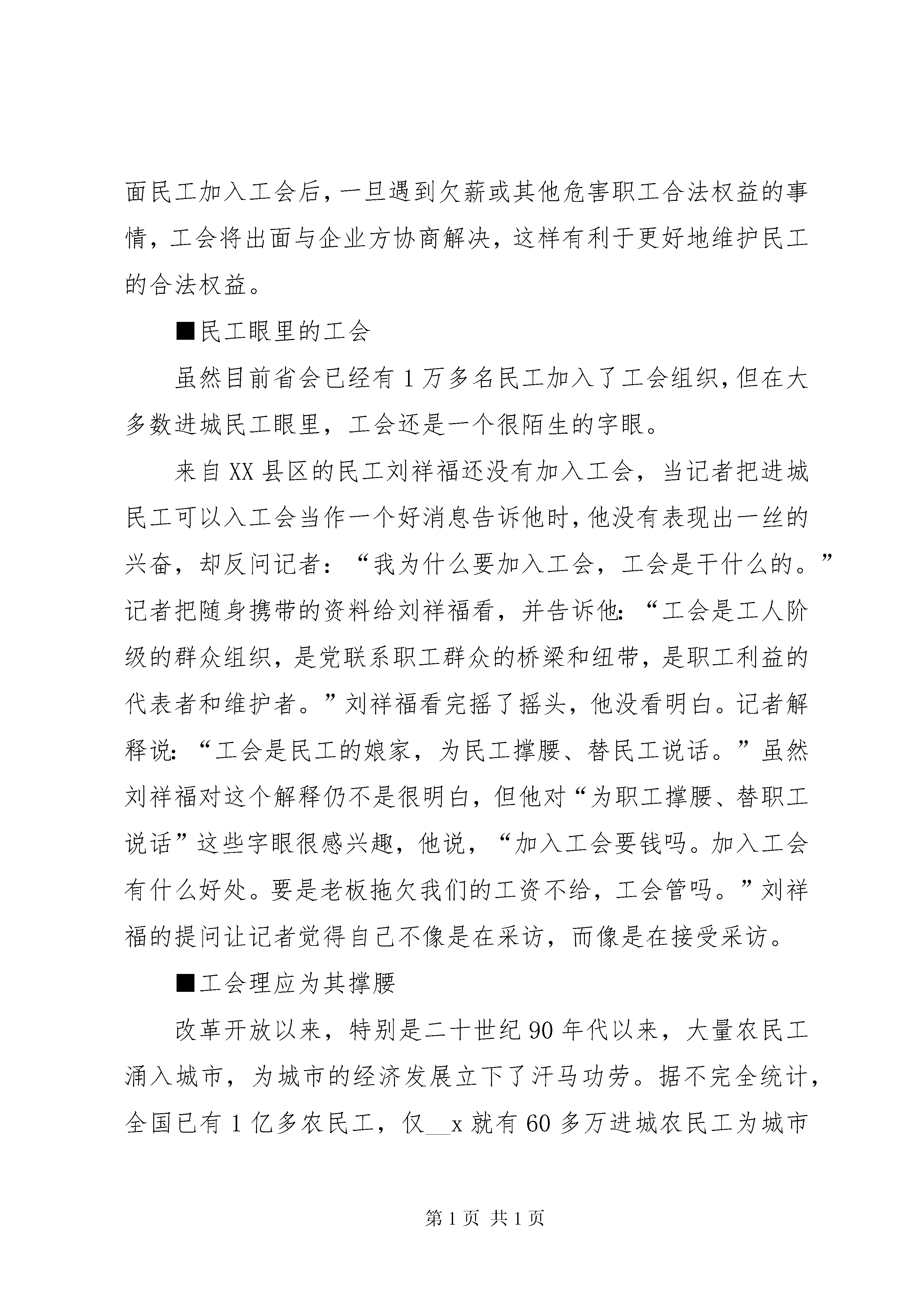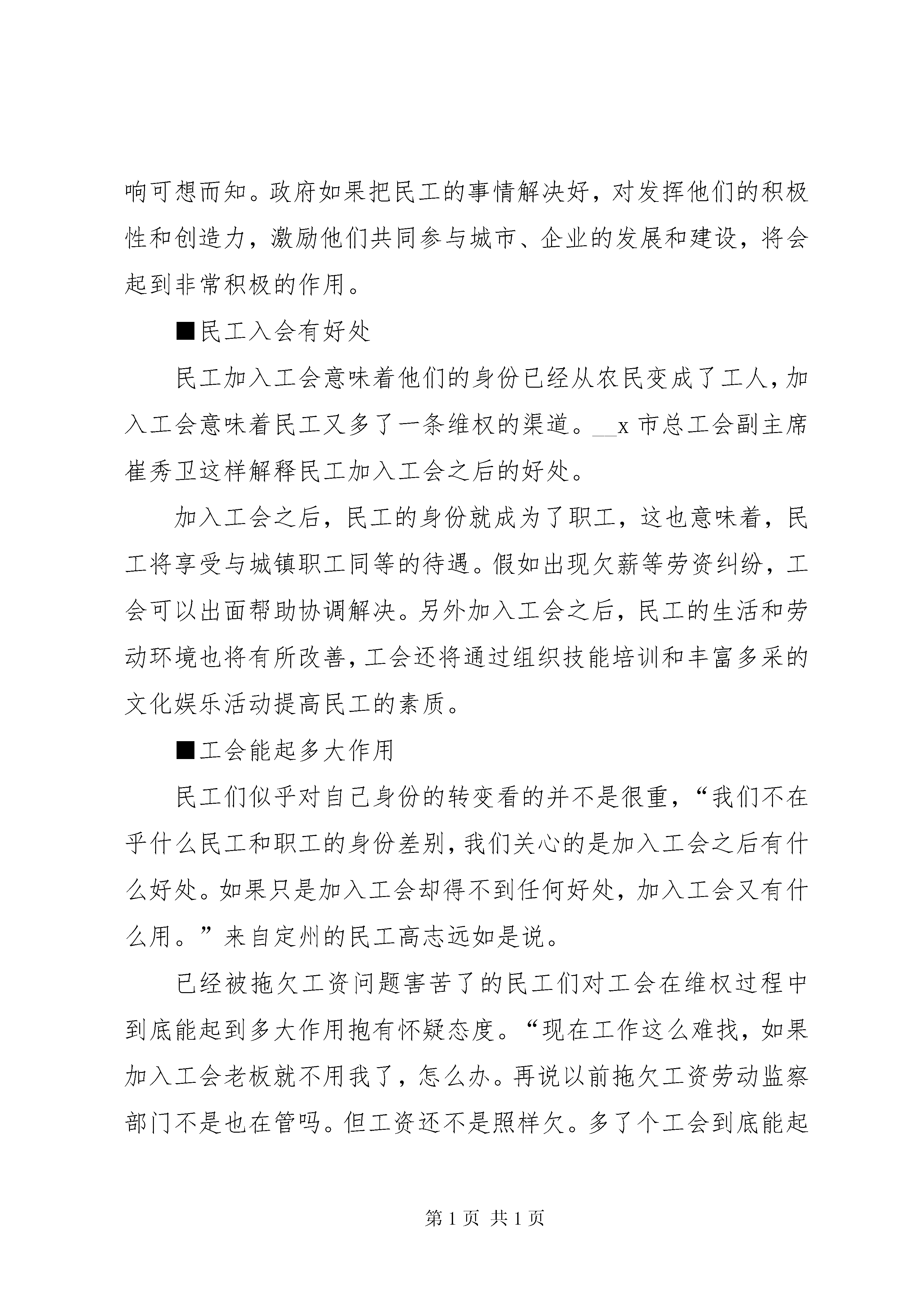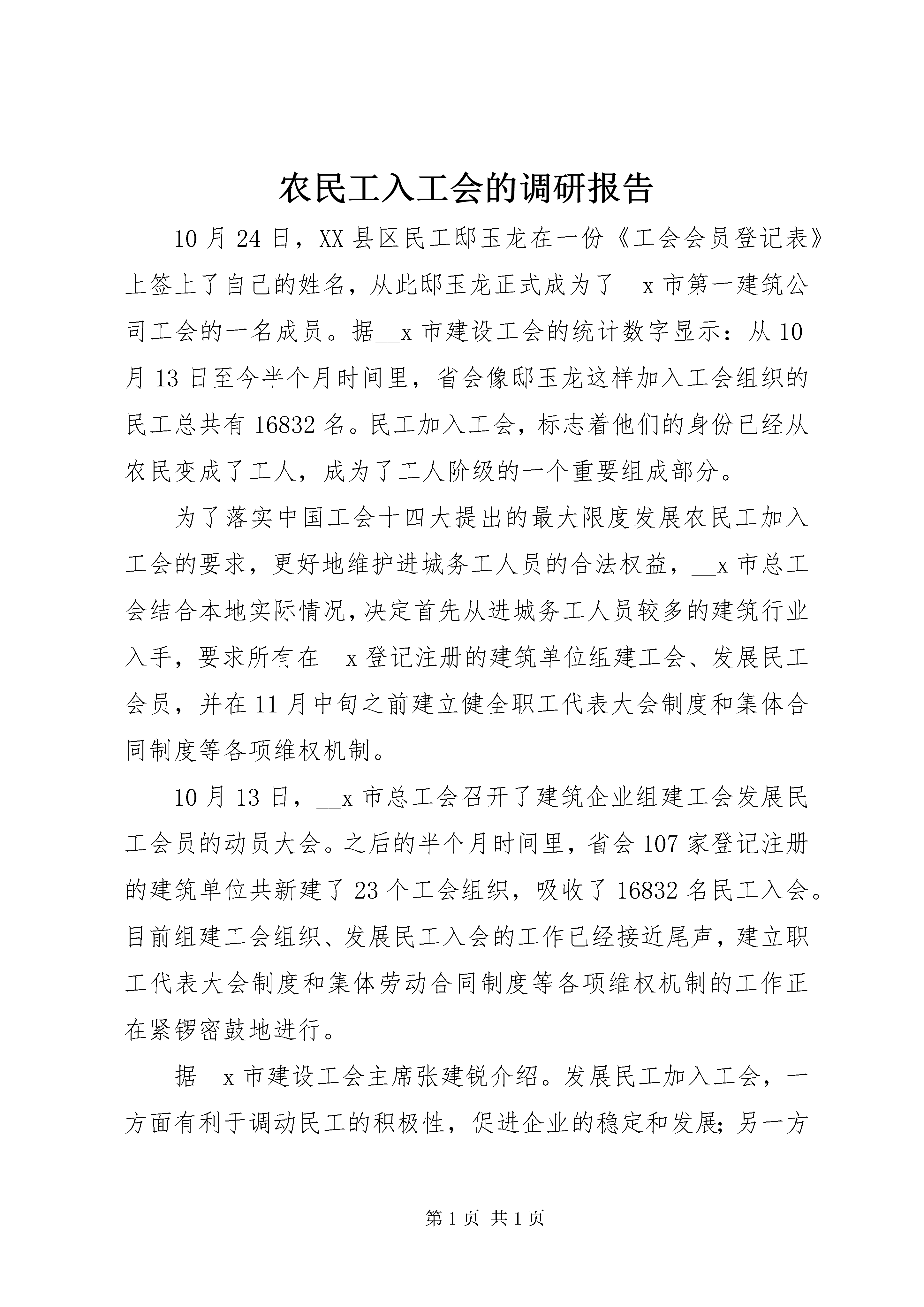 农民工入工会的调研报告10月24日,XX县区民工邸玉龙在一份《工会会员登记表》上签上了自己的姓名,从此邸玉龙正式成为了__x市第一建筑公司工会的一名成员。据__x市建设工会的统计数字显示:从10月13日至今半个月时间里,省会像邸玉龙这样加入工会组织的民工总共有16832名。民工加入工会,标志着他们的身份已经从农民变成了工人,成为了工人阶级的一个重要组成部分。为了落实中国工会十四大提出的最大限度发展农民工加入工会的要求,更好地维护进城务工人员的合法权益,__x市总工会结合本地实际情况,决定首先从进城务工人员较多的建筑行业入手,要求所有在__x登记注册的建筑单位组建工会、发展民工会员,并在11月中旬之前建立健全职工代表大会制度和集体合同制度等各项维权机制。10月13日,__x市总工会召开了建筑企业组建工会发展民工会员的动员大会。之后的半个月时间里,省会107家登记注册的建筑单位共新建了23个工会组织,吸收了16832名民工入会。目前组建工会组织、发展民工入会的工作已经接近尾声,建立职工代表大会制度和集体劳动合同制度等各项维权机制的工作正在紧锣密鼓地进行。据__x市建设工会主席张建锐介绍。发展民工加入工会,一方面有利于调动民工的积极性,促进企业的稳定和发展;另一方面民工加入工会后,一旦遇到欠薪或其他危害职工合法权益的事情,工会将出面与企业方协商解决,这样有利于更好地维护民工的合法权益。■民工眼里的工会虽然目前省会已经有1万多名民工加入了工会组织,但在大多数进城民工眼里,工会还是一个很陌生的字眼。来自XX县区的民工刘祥福还没有加入工会,当记者把进城民工可以入工会当作一个好消息告诉他时,他没有表现出一丝的兴奋,却反问记者:“我为什么要加入工会,工会是干什么的。”记者把随身携带的资料给刘祥福看,并告诉他:“工会是工人阶级的群众组织,是党联系职工群众的桥梁和纽带,是职工利益的代表者和维护者。”刘祥福看完摇了摇头,他没看明白。记者解释说:“工会是民工的娘家,为民工撑腰、替民工说话。”虽然刘祥福对这个解释仍不是很明白,但他对“为职工撑腰、替职工说话”这些字眼很感兴趣,他说,“加入工会要钱吗。加入工会有什么好处。要是老板拖欠我们的工资不给,工会管吗。”刘祥福的提问让记者觉得自己不像是在采访,而像是在接受采访。■工会理应为其撑腰改革开放以来,特别是二十世纪90年代以来,大量农民工涌入城市,为城市的经济发展立下了汗马功劳。据不完全统计,全国已有1亿多农民工,仅__x就有60多万进城农民工为城市建设和发展做着贡献。在有些行业,毫不夸张地说,撤除了民工也许整个行业都将瘫痪。事实表明,数量庞大的农民工队伍,已成为我国工人阶级的新鲜血液和不可剥离的组成部分,在经济发展中有着举足轻重的作用。虽然农民工为城市发展做出了不可磨灭的贡献,但是他们在城里遭遇的不公平待遇却很多。大概可列出这么几项:第一就是农民工进城务工以后遭到很多歧视,比如很多大城市都规定,有100多个工种和行业不允许农民工进入,还有就是民工进城务工必须办理就业证、暂住证,各种收费和各种证卡等。第二,民工在打工期间其合法权益得不到保护,最明显的例子就是工资拖欠问题,从频频见诸报端的跳楼事件,不难看出这个问题已经发展到严重地步。第三,民工的生活、生产条件没有得到有效的保障,卫生防疫条件,安全条件,大病、工伤问题都没有得到合理的解决。既然和城镇职工一样都在为城市建设做贡献,从公平角度讲,对民工的歧视应该消除、民工的合法权益理所当然地应该得到切实保护。作为中国工人阶级的群众性组织,承担起维护农民工合法权益的任务,是中国工会不可推卸的分内职责。另外,民工加入工会从社会稳定角度来说同样重要。1亿多的农民工在城市间流动,尤其像北京,有300万民工在这里,他们发生任何事情、事件都会引发社会不稳定因素。这种不稳定因素所带来的负面影响可想而知。政府如果把民工的事情解决好,对发挥他们的积极性和创造力,激励他们共同参与城市、企业的发展和建设,将会起到非常积极的作用。■民工入会有好处民工加入工会意味着他们的身份已经从农民变成了工人,加入工会意味着民工又多了一条维权的渠道。__x市总工会副主席崔秀卫这样解释民工加入工会之后的好处。加入工会之后,民工的身份就成为了职工,这也意味着,民工将享受与城镇职工同等的待遇。假如出现欠薪等劳资纠纷,工会可以出面帮助协调解决。另外加入工会之后,民工的生活和劳动环境也将有所改善,工会还将通过组织技能培训和丰富多采的文化娱乐活动提高民工的素质。■工会能起多大作用民工们似乎对自己身份的转变看的并不是很重,“我们不在乎什么民工和职工的身份差别,我们关心的是加入工会之后有什么好处。如果只是加入工会却得不到任何好处,加入工会又有什么用。”来自定州的民工高志远如是说。已经被拖欠工资