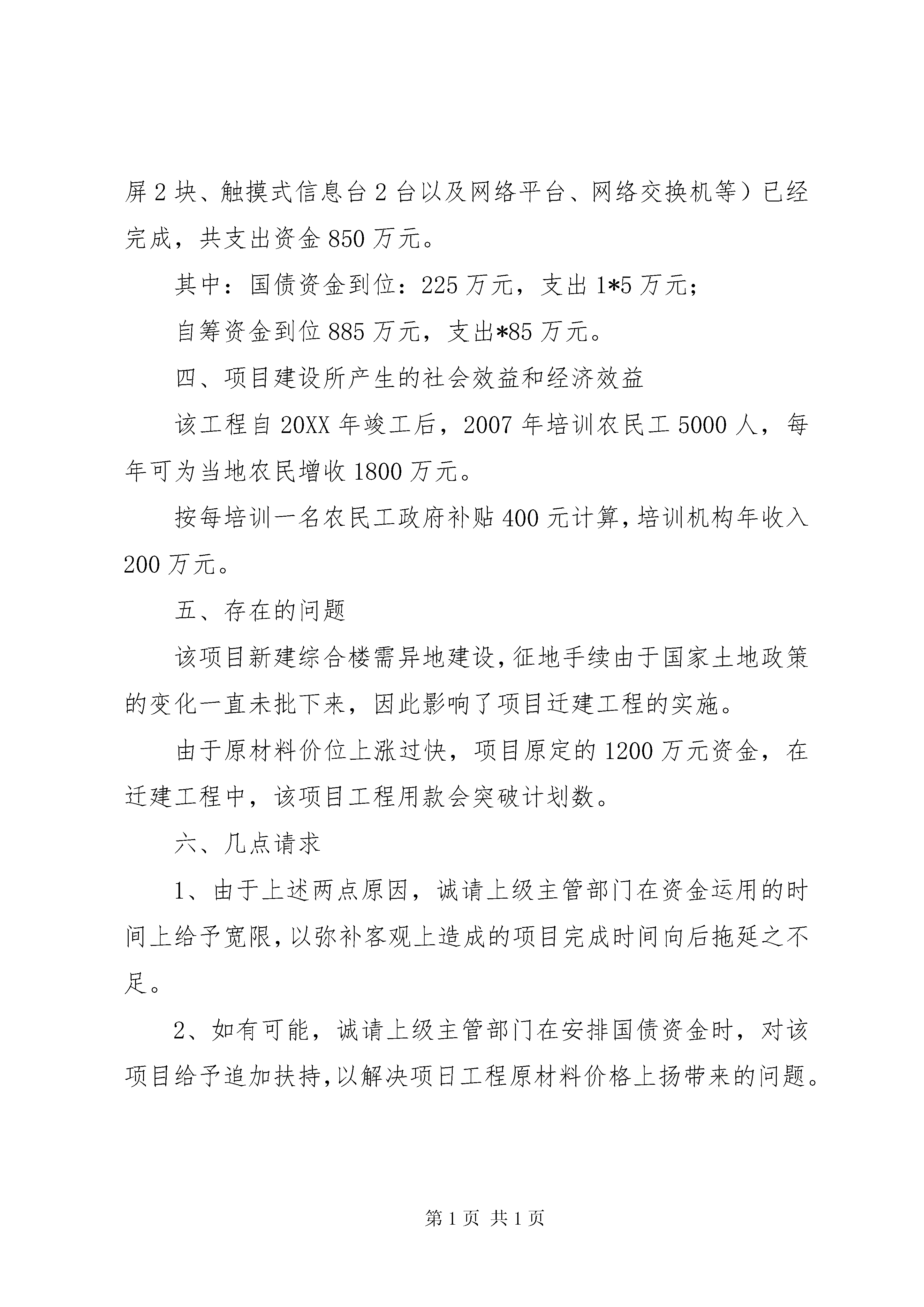 农民工培训基地建设自查报告一、项目概况二、工程的建设及验收情况该项目按照工程施工的有关规定进行了招投标。工程进入施工阶段后,我们根据上级指示精神和《中华人民共和国招投标法》邀请了河南南阳寅兴钢结构公司等三家资质高、信誉好、样板工程多的公司于20*年7月25日进行了邀标,评标单位有区纪委、区发改委、区城建环保局、区财政局、区人事劳动和社会保障局,最后南阳寅兴钢结构公司中标,承揽XX县区农民工培训基地新建的钢结构教学楼壹栋及其它改建、迁建工程。工程自20*年10月份开工建设到20XX年10月份新建教学楼及原楼改造工程已经竣工,经主管部门验收为合格工程。该项目投入使用一年多来社会和经济效益良好,发挥了应有的作用。三、资金的运用情况该项目于20*年立项,计划投资1200万元,其中。综合楼改造710万元,拆迁补偿80万元,新建培训综合楼148万元,道路绿化30万元,信息化配套210万元,14个乡镇信息中心建设22万元。目前已完成的工作有。综合楼改造、拆迁补偿、14个乡镇信息中心建设、部分信息化配套(购微机100台、大屏幕滚动字屏2块、触摸式信息台2台以及网络平台、网络交换机等)已经完成,共支出资金850万元。其中:国债资金到位:225万元,支出1*5万元;自筹资金到位885万元,支出*85万元。四、项目建设所产生的社会效益和经济效益该工程自20XX年竣工后,2007年培训农民工5000人,每年可为当地农民增收1800万元。按每培训一名农民工政府补贴400元计算,培训机构年收入200万元。五、存在的问题该项目新建综合楼需异地建设,征地手续由于国家土地政策的变化一直未批下来,因此影响了项目迁建工程的实施。由于原材料价位上涨过快,项目原定的1200万元资金,在迁建工程中,该项目工程用款会突破计划数。六、几点请求1、由于上述两点原因,诚请上级主管部门在资金运用的时间上给予宽限,以弥补客观上造成的项目完成时间向后拖延之不足。2、如有可能,诚请上级主管部门在安排国债资金时,对该项目给予追加扶持,以解决项日工程原材料价格上扬带来的问题。
